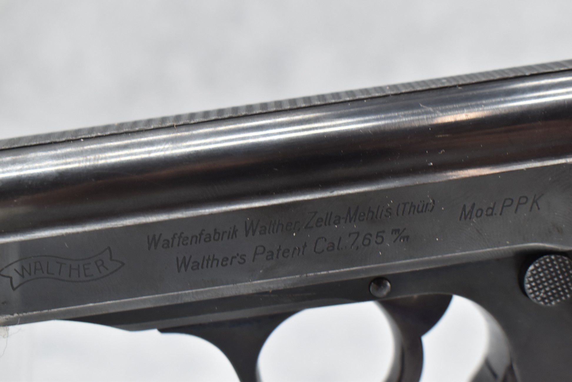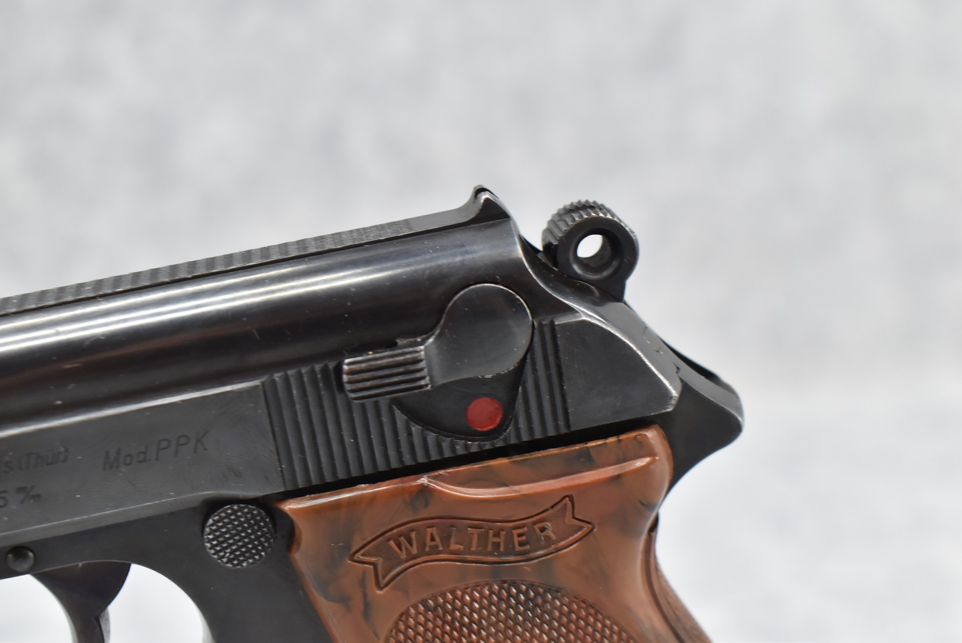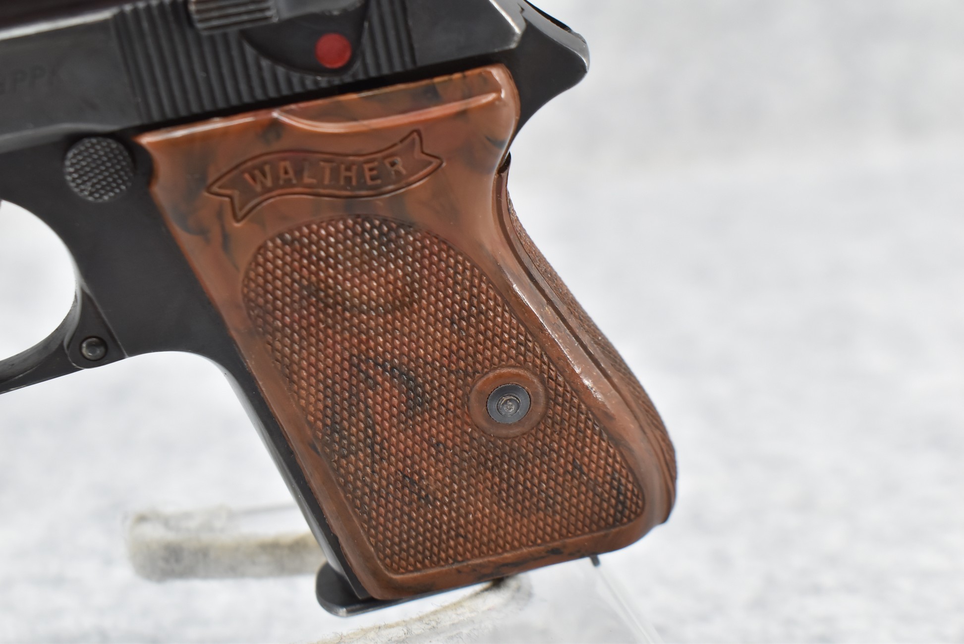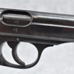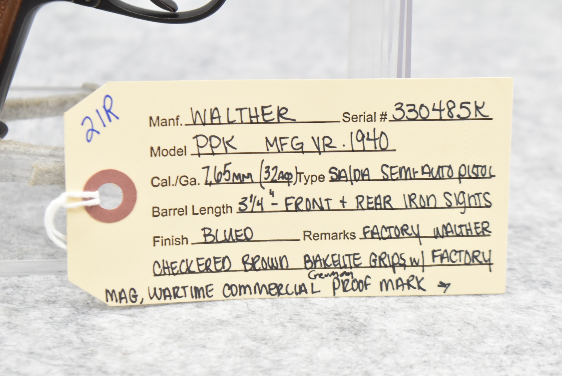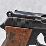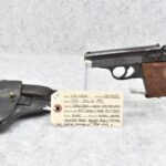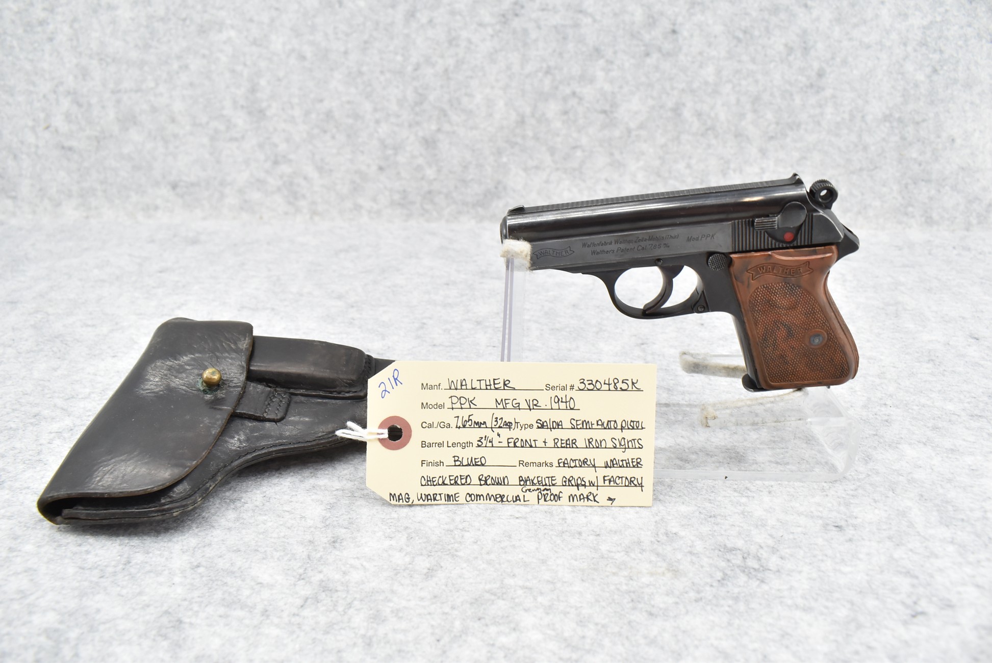 21R. Walther – Mod. PPK – 7.65mm (32 ACP) Cal. Semi-Auto Pistol – w/3 ¼” Barrel w/Front & Rear Iron Sights – Blued Finish – w/Factory Walther Checkered Brown Bakelite Grips – w/Factory Mag – w/Period Leather Holster – w/Wartime Commercial German Proof Mark on Slide & Barrel – Mfg. 1940