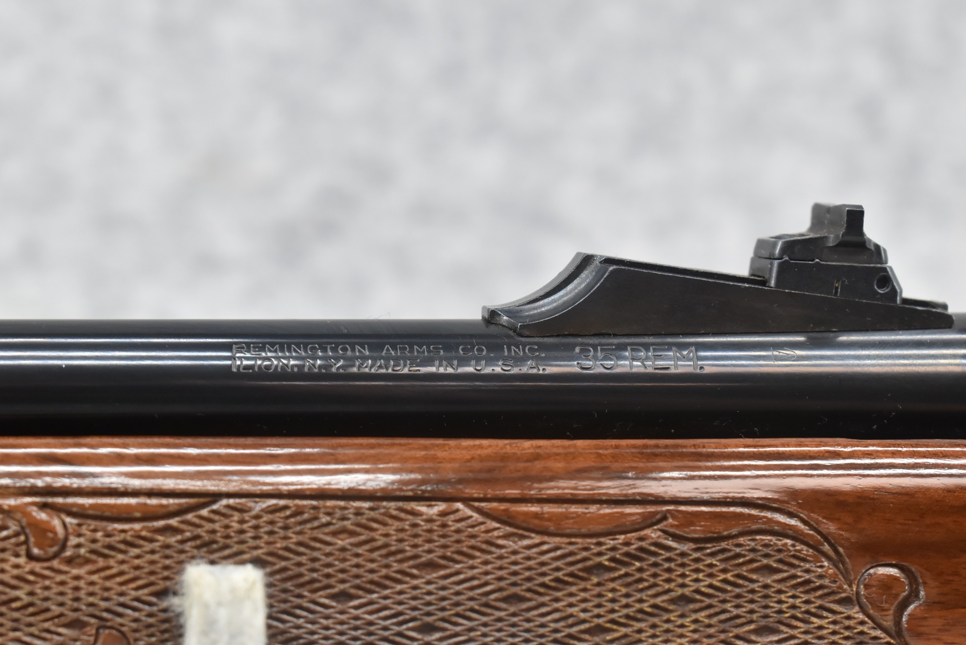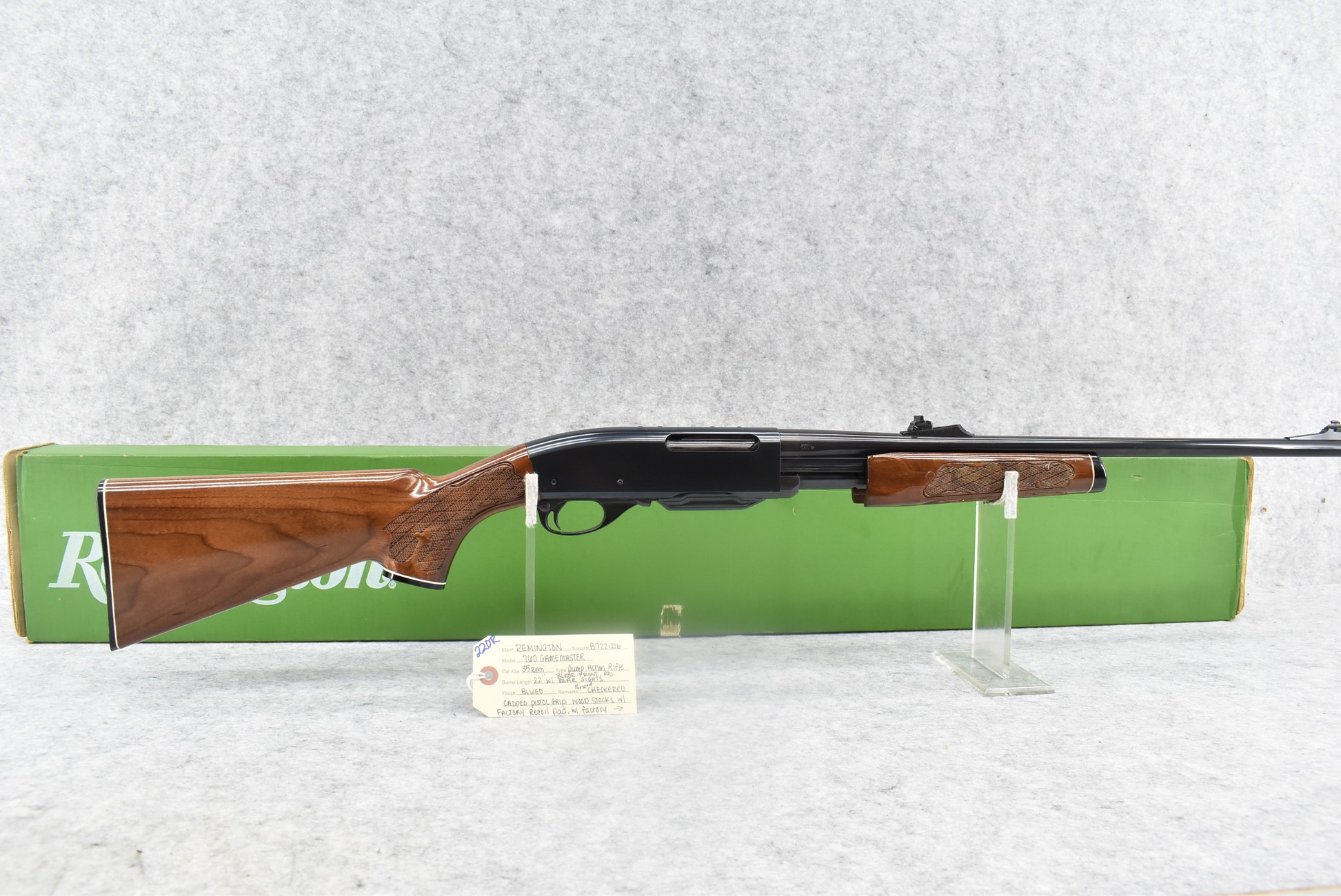 220R. Reminton – Mod. 760 Gamemaster – 35 Rem. Cal. Pump Action Rifle – w/22” Barrel w/Blade Front & Adj. Rear Sights – Blued Finish – w/Pressed Checkered Capped Pistol Grip Wood Stocks w/Factory Recoil Pad – w/Detachable Mag – Unfired w/Non-Matching Serial # Box