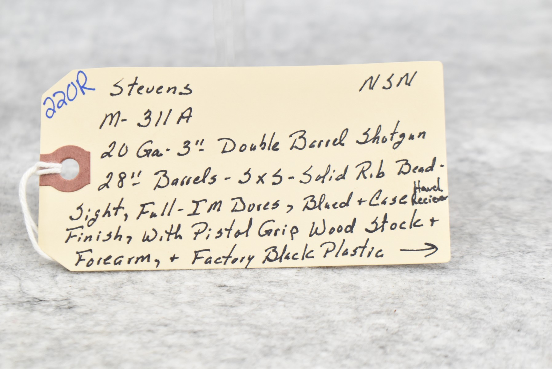 220R. Stevens – Mod. 311A – 20ga. 3” Double Barrel Shotgun – w/28” Full/IM Choked, Solid Rib Barrels w/Bead Sight – Blued Finish w/Case Hardened Receiver – w/Pistol Grip Wood Stocks w/Factory Butt Plate