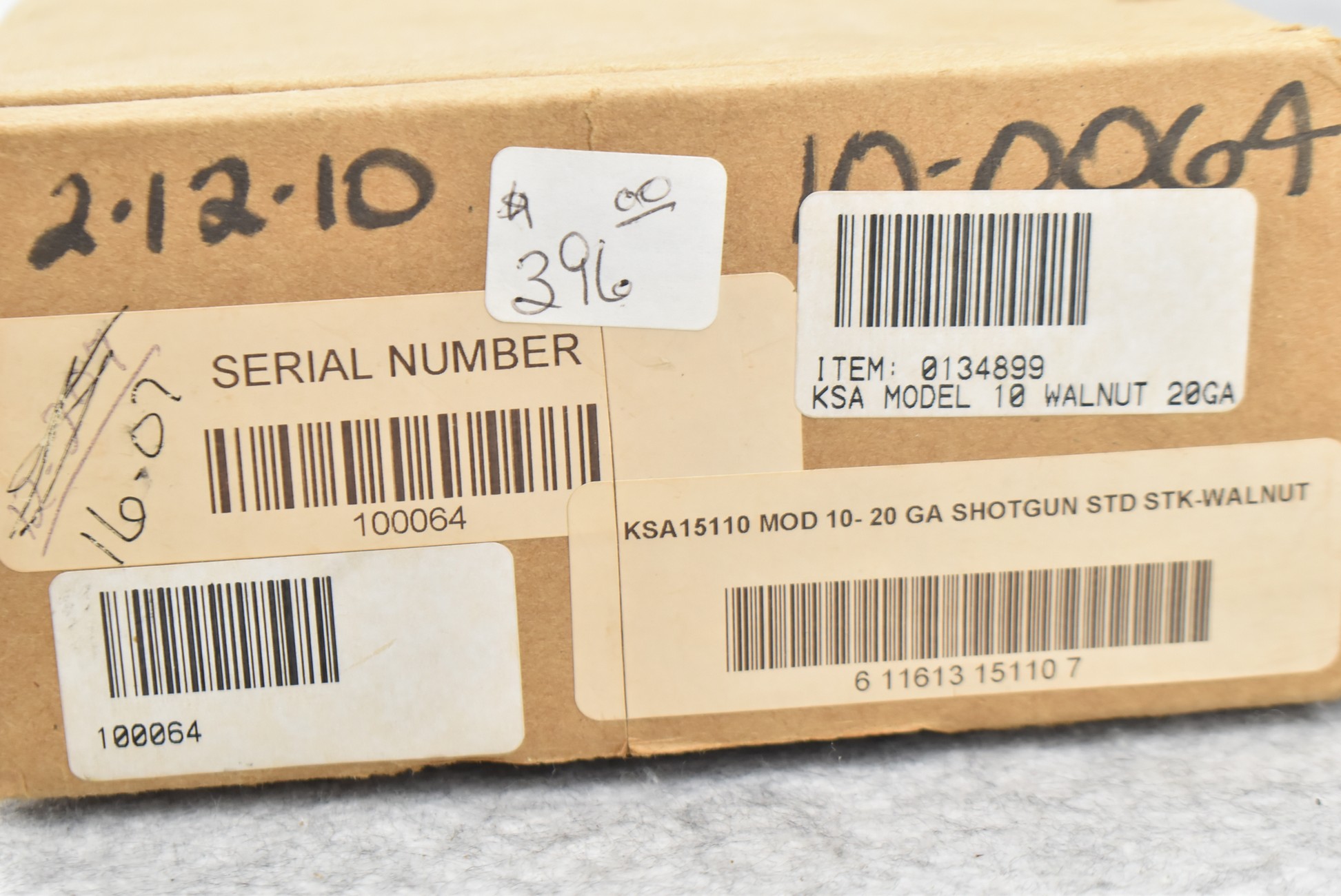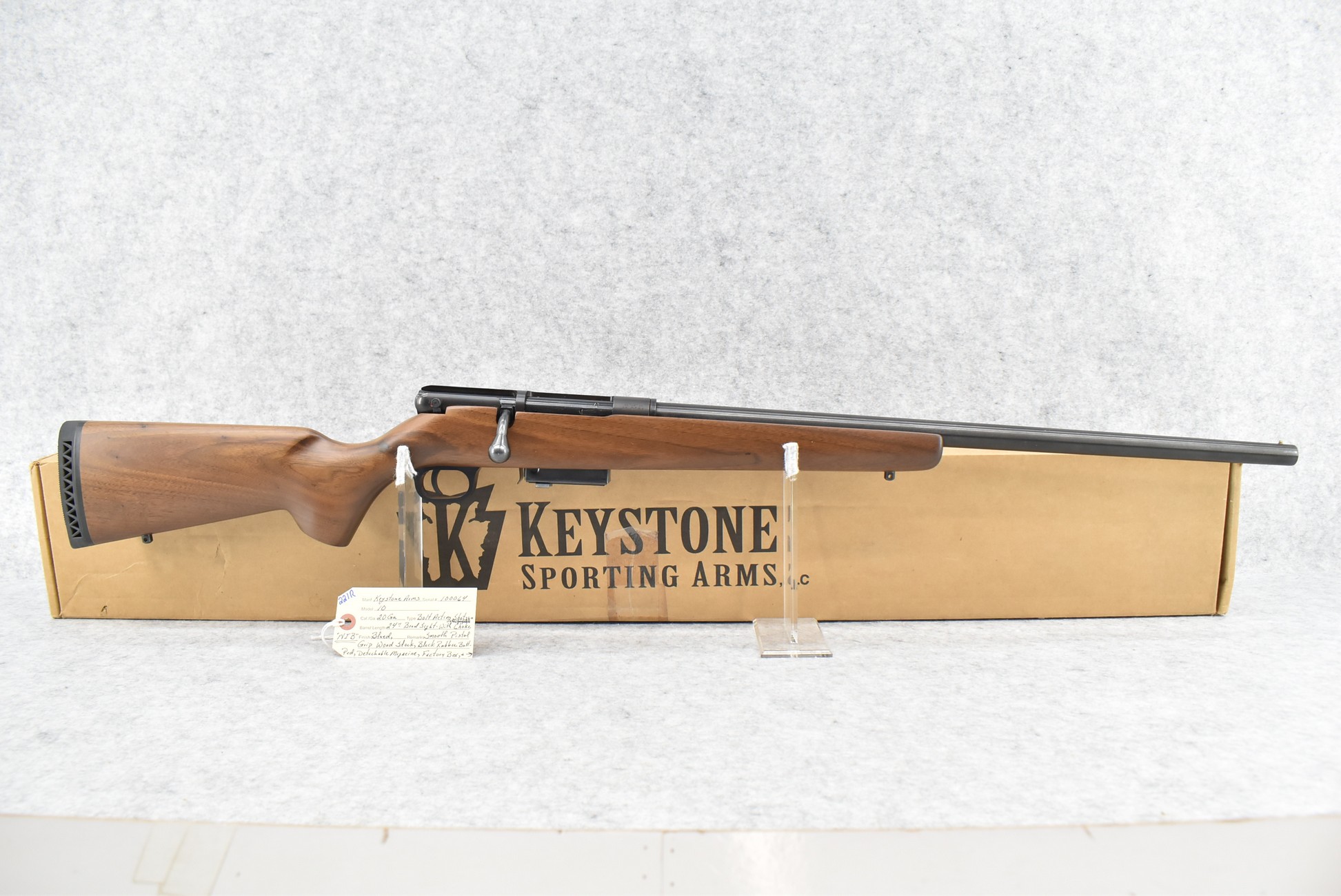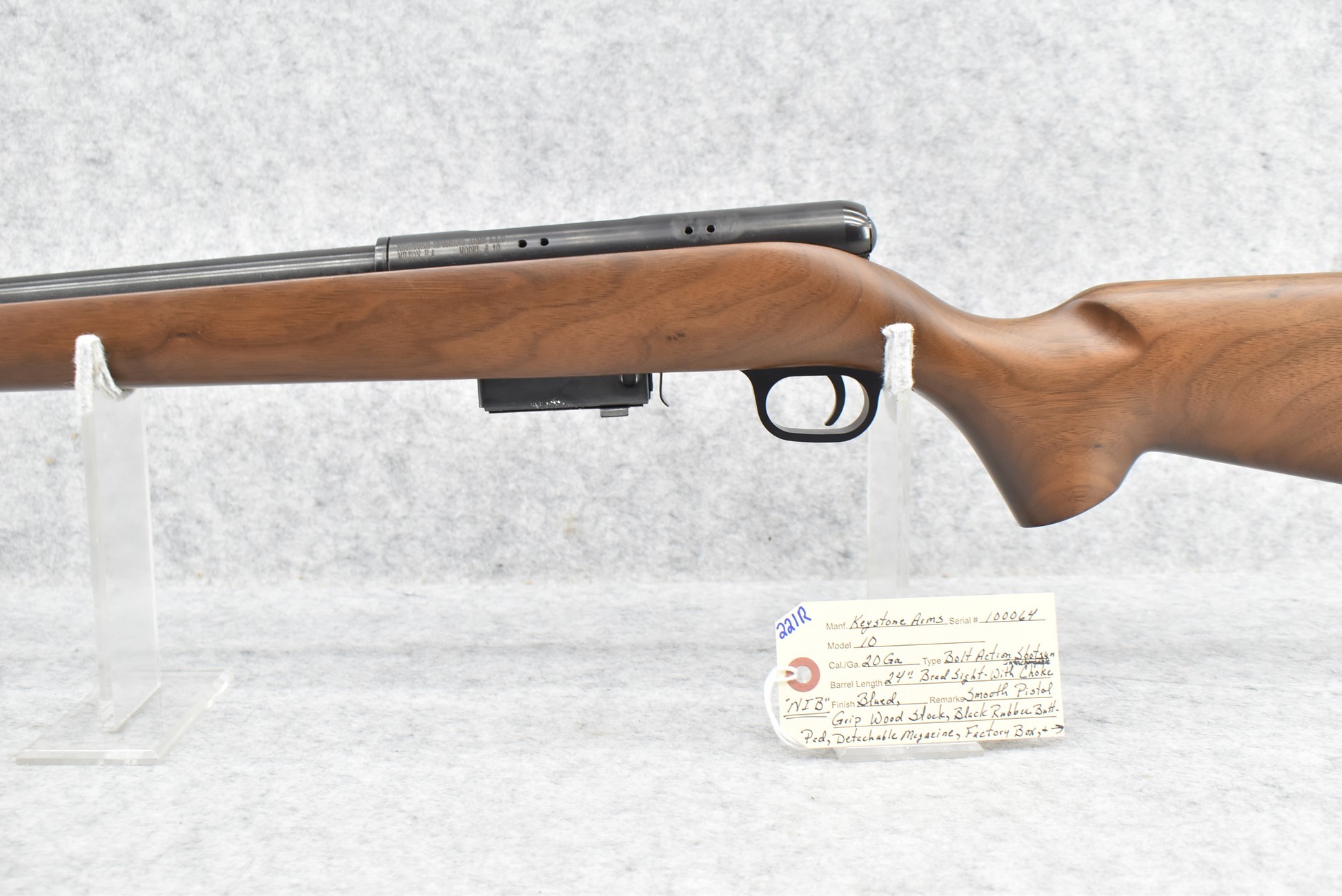 221R. Keystone Arms – Mod. 10 – 20ga. Bolt Action Shotgun – w/24” Interchangeable Choke Barrel w/Bead Sight – Blued Finish – w/Smooth Pistol Grip Wood Stock w/Black Rubber Butt Pad – w/Detachable Magazine – New in Factory Box w/Manual
