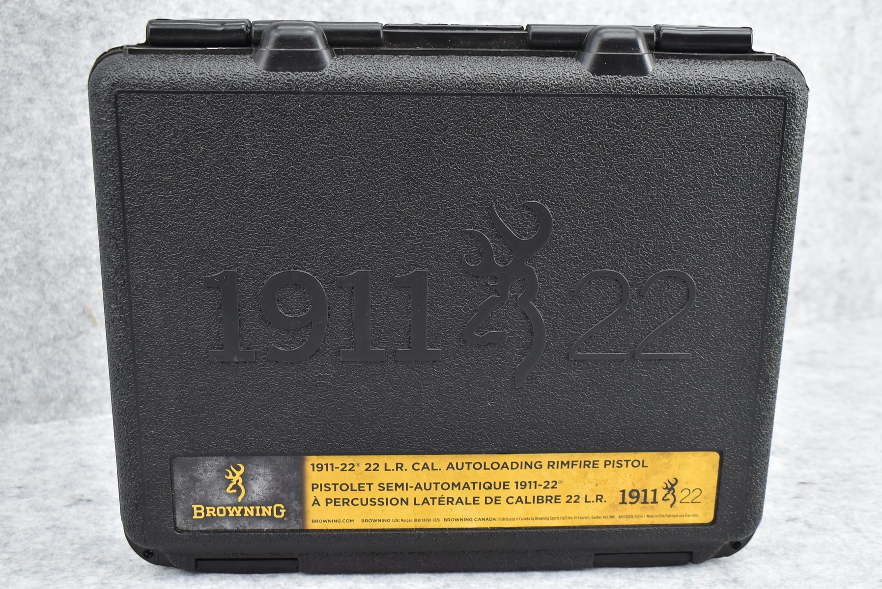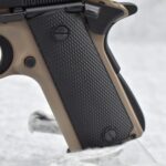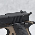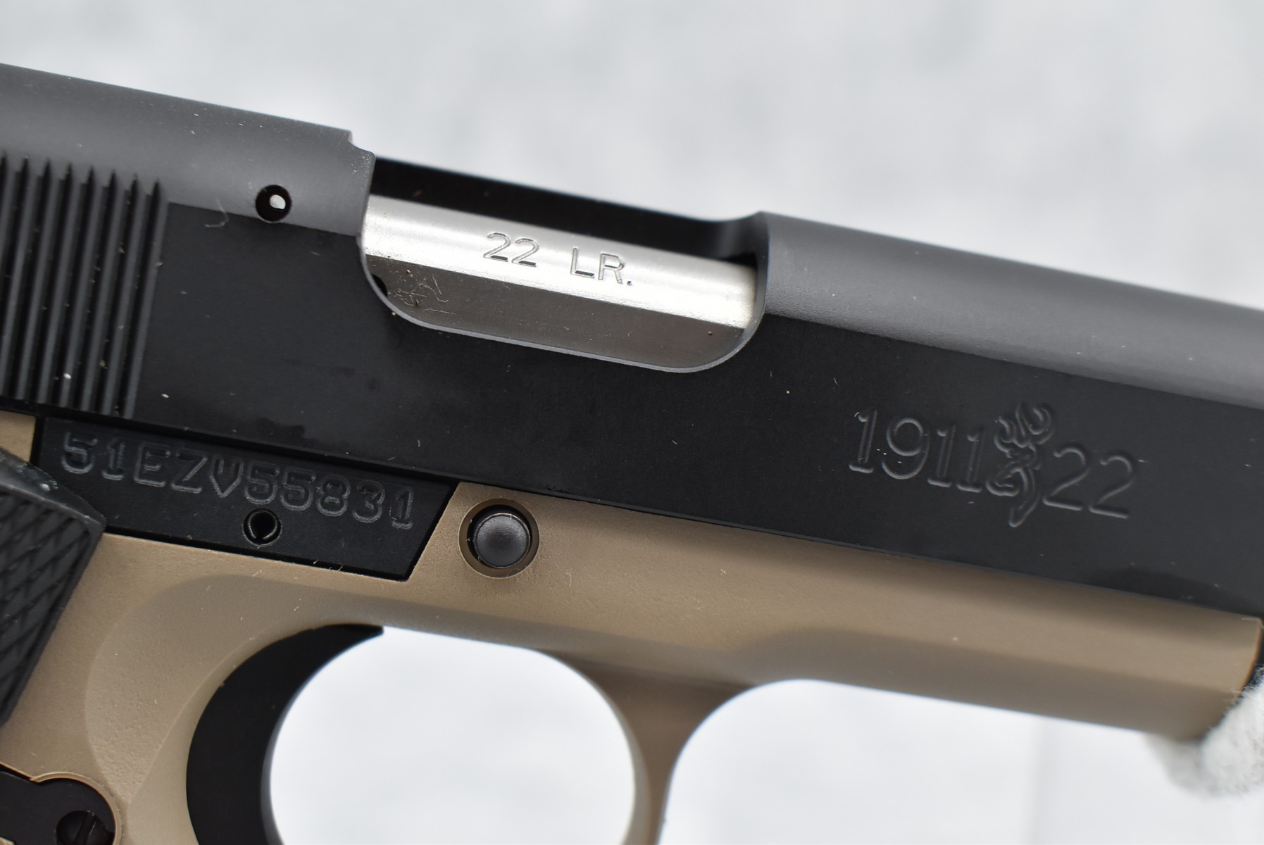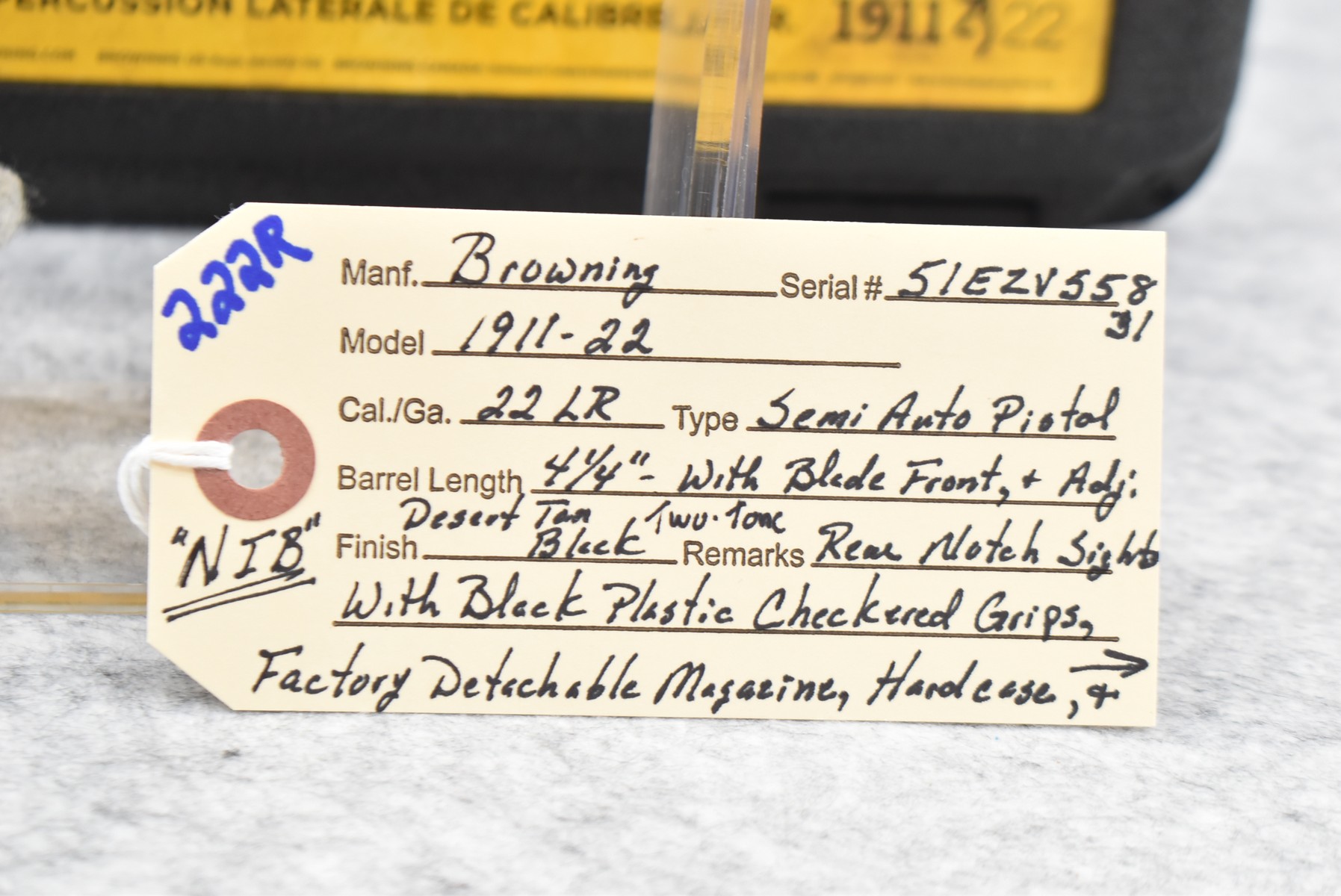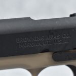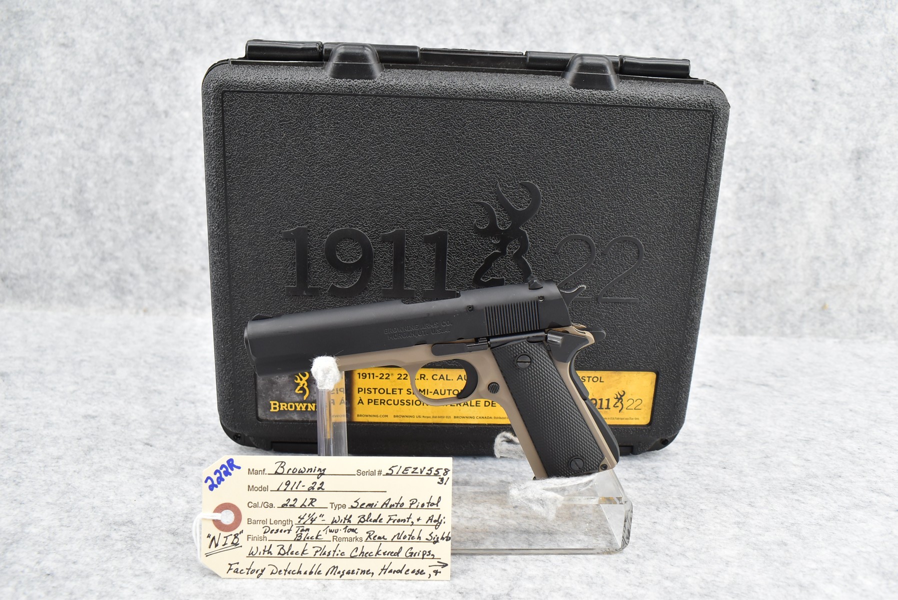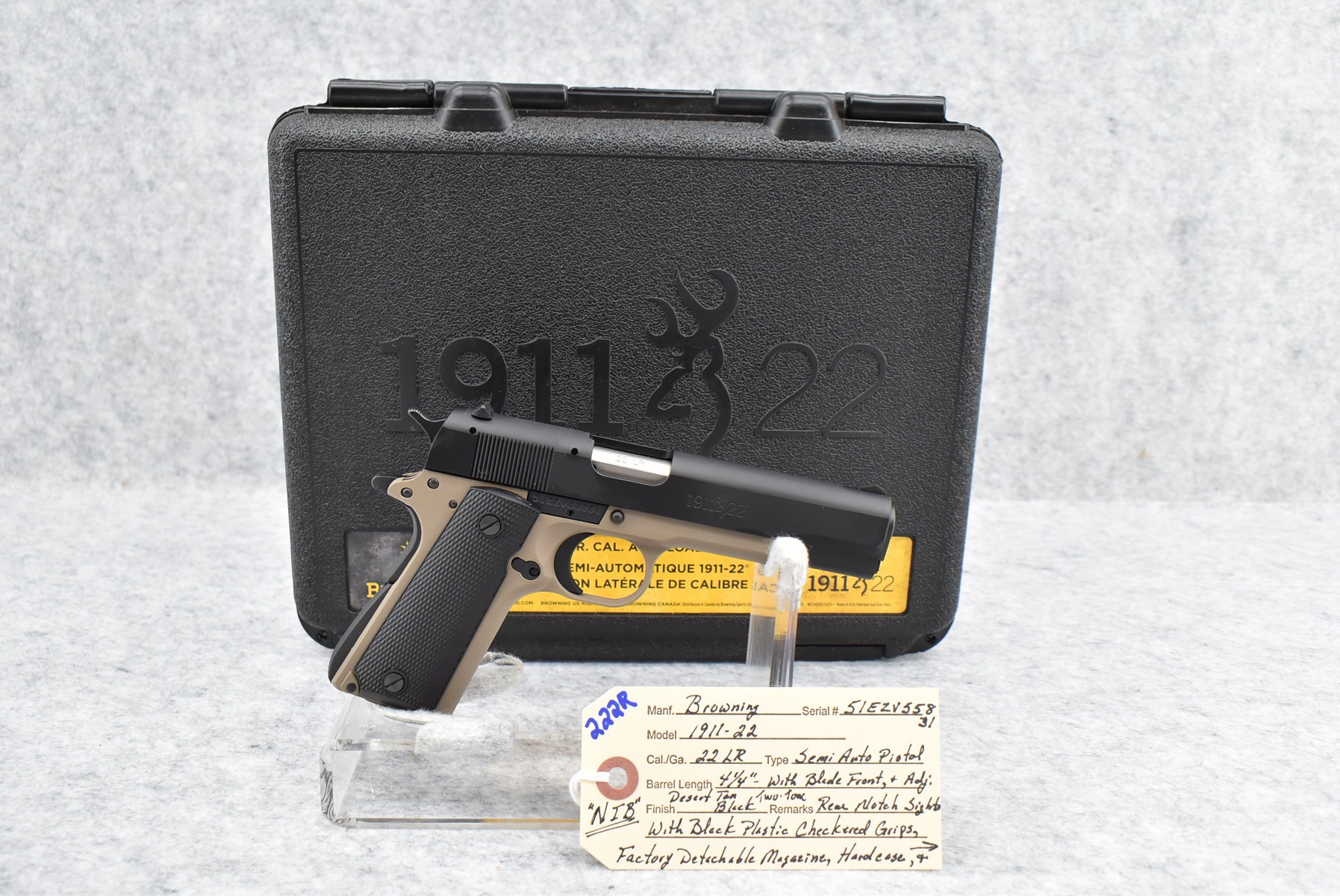 222R.     Browning – Mod. 1911-22 – 22LR Cal. Semi-Auto Pistol – w/4 ¼” Barrel w/Blade Front & Adj. Rear Notch Sights – Desert Tan/Black Two-Tone Finish – w/Black Plastic Checkered Grips – w/Factory Detachable Magazine – New w/Hard Case & Manuals