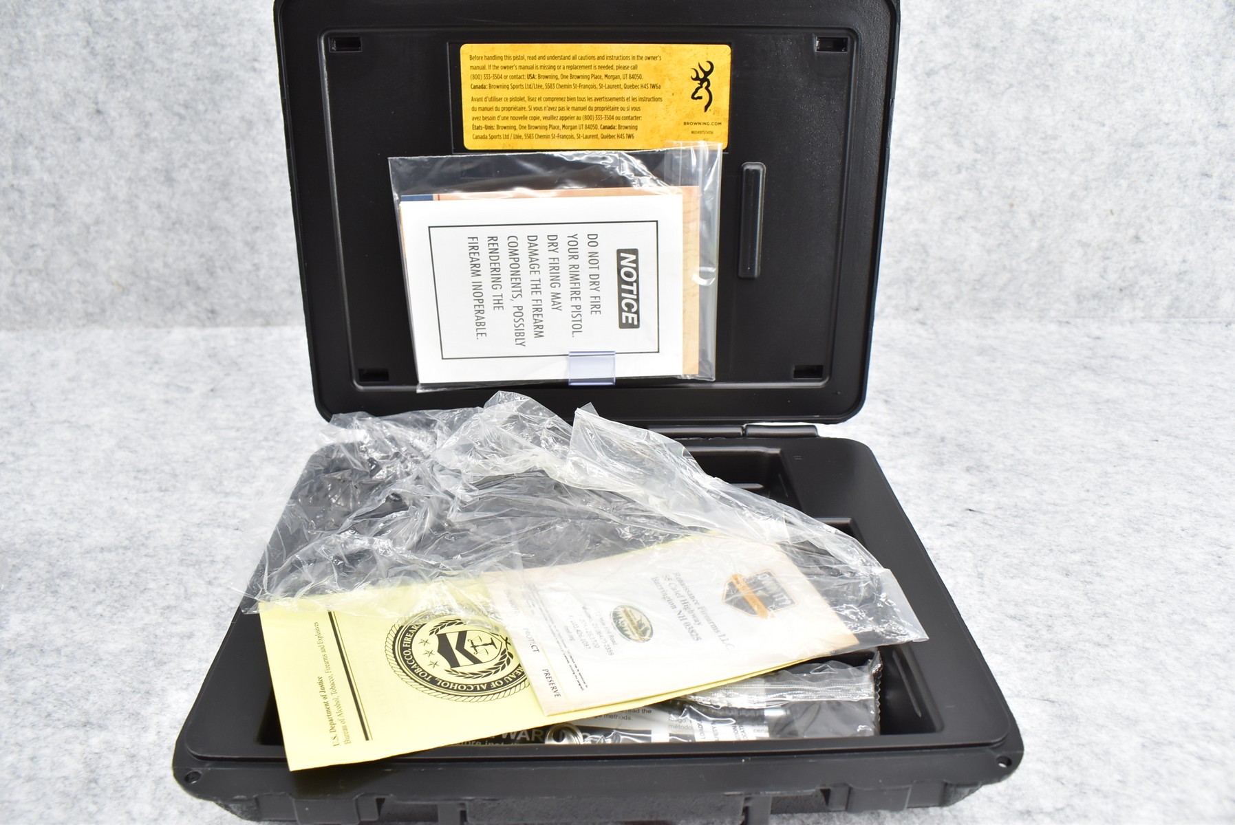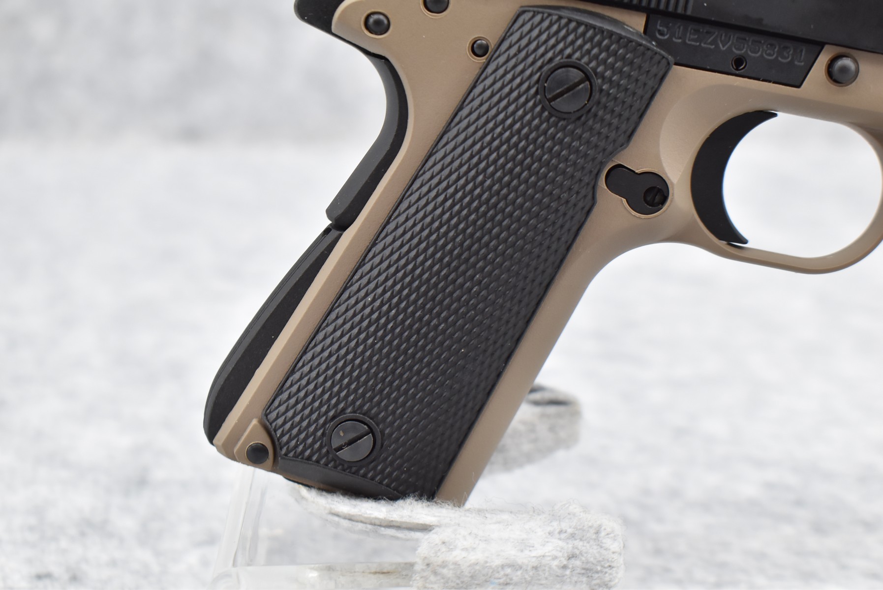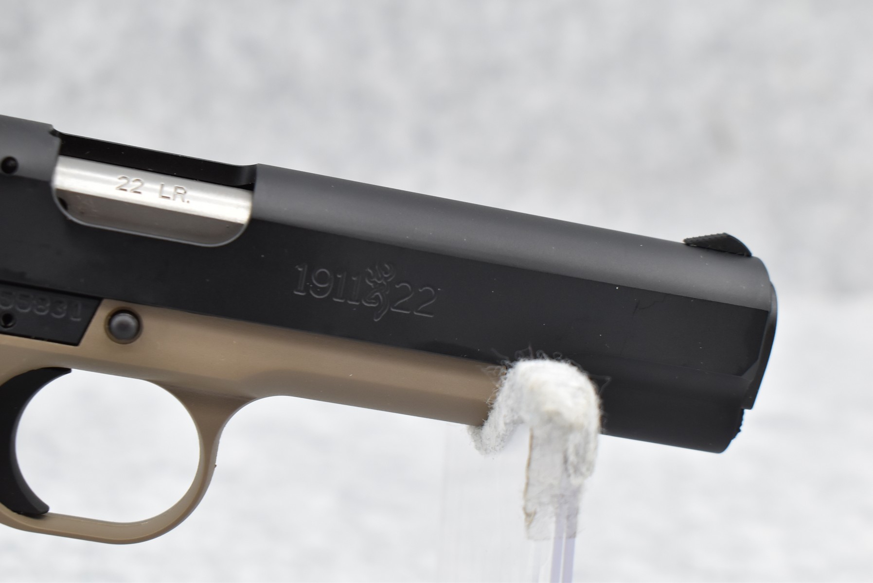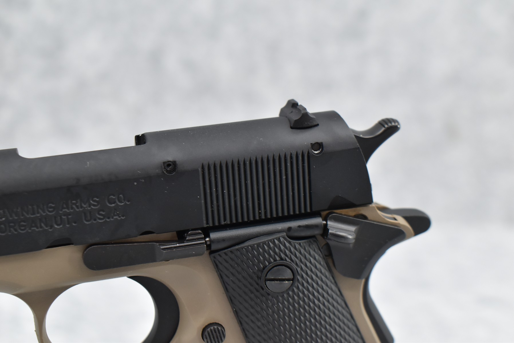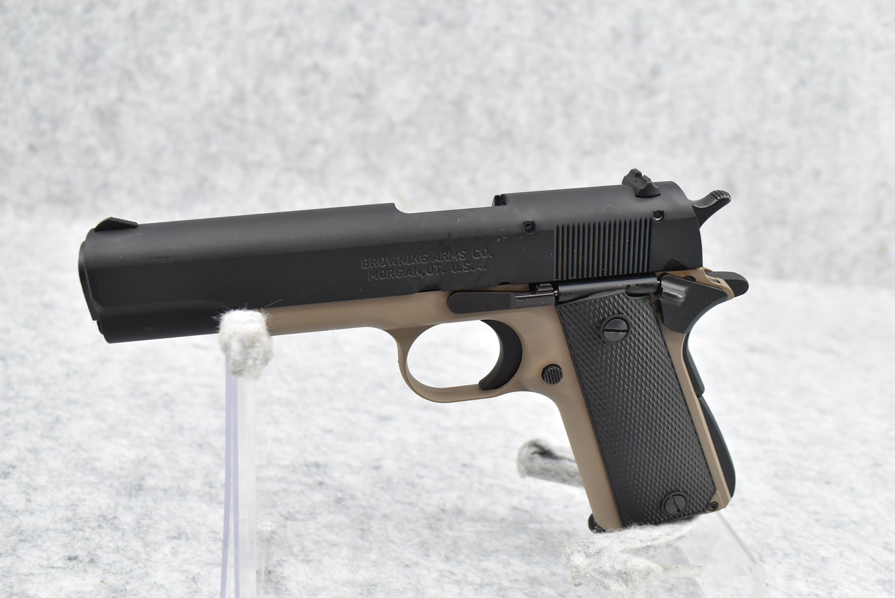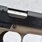 222R.     Browning – Mod. 1911-22 – 22LR Cal. Semi-Auto Pistol – w/4 ¼” Barrel w/Blade Front & Adj. Rear Notch Sights – Desert Tan/Black Two-Tone Finish – w/Black Plastic Checkered Grips – w/Factory Detachable Magazine – New w/Hard Case & Manuals