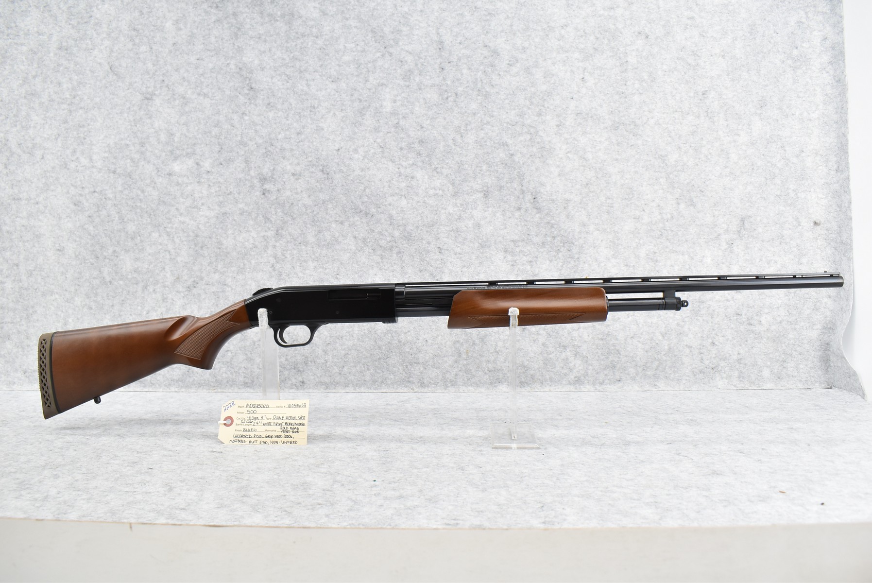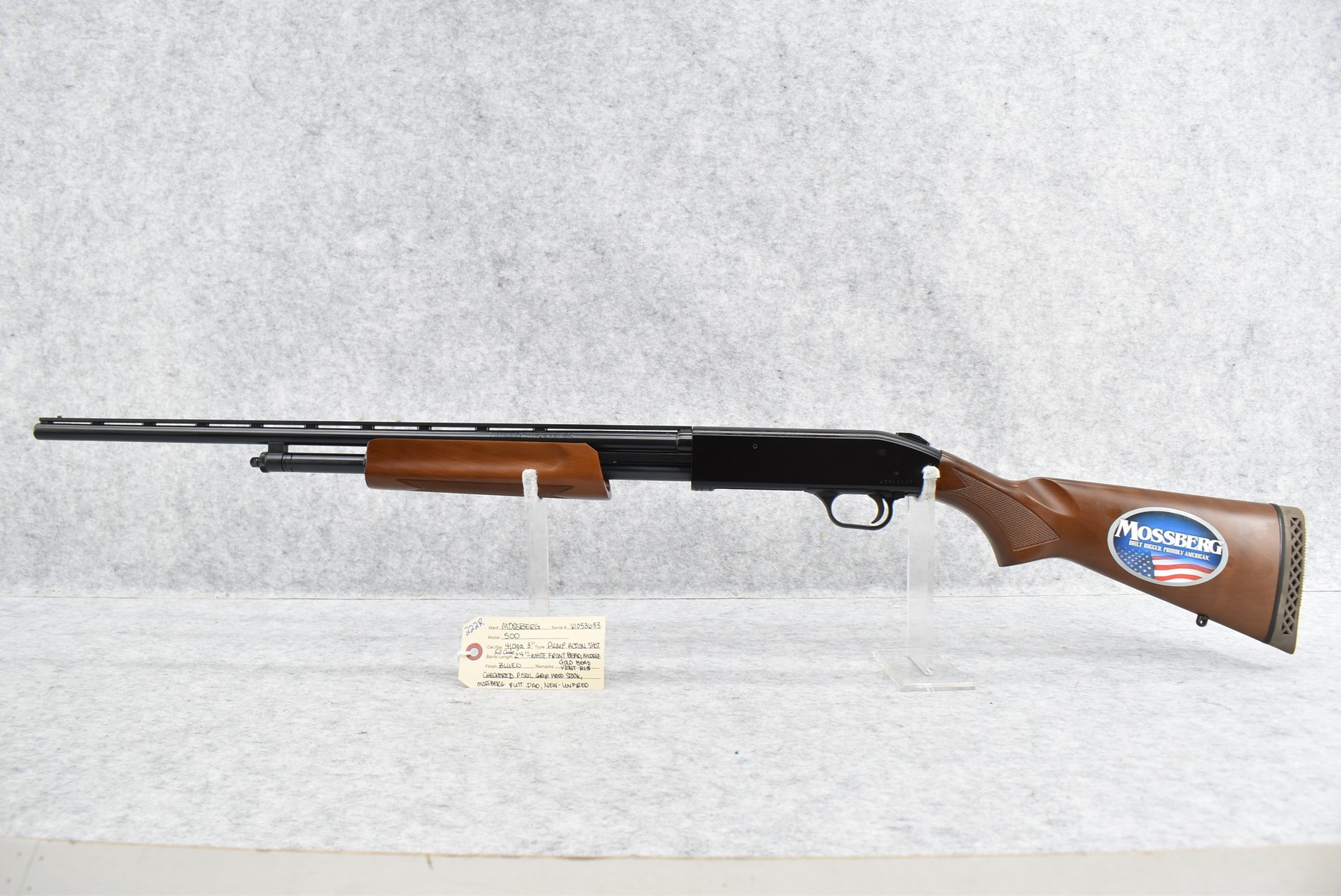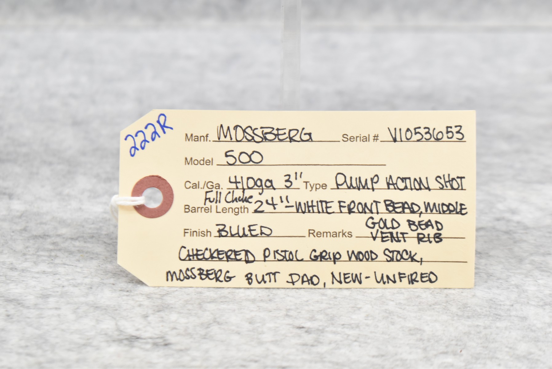 222R. Mossberg – Mod. 500 – 410ga. 3” Pump Action Shotgun – w/24” Full Choke, Vent-Rib Barrel w/White Front Bead & Middle Gold Bead Sights – Blued Finish – w/Checkered Pistol Grip Wood Stock w/Factory Butt Pad – New & Unfired