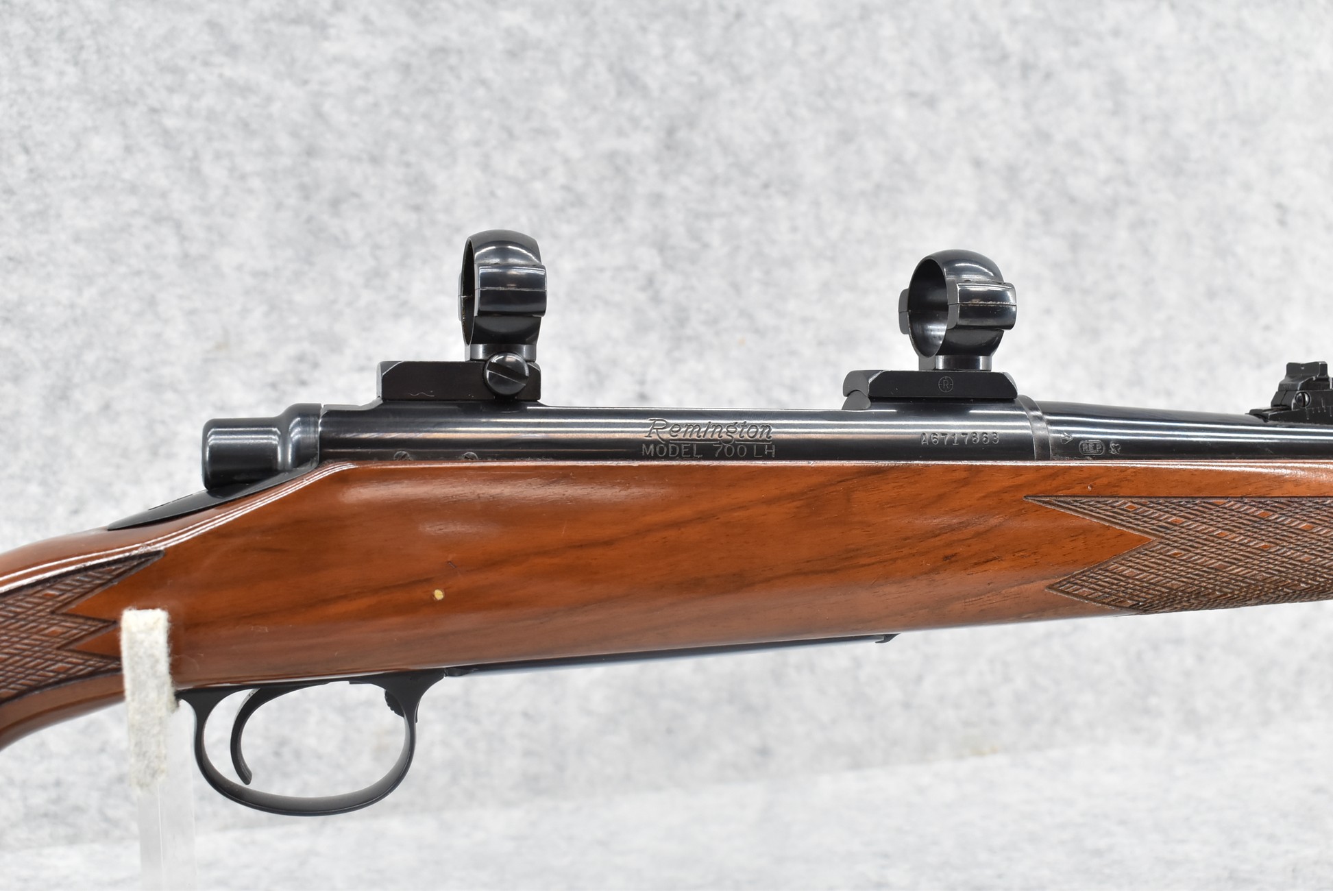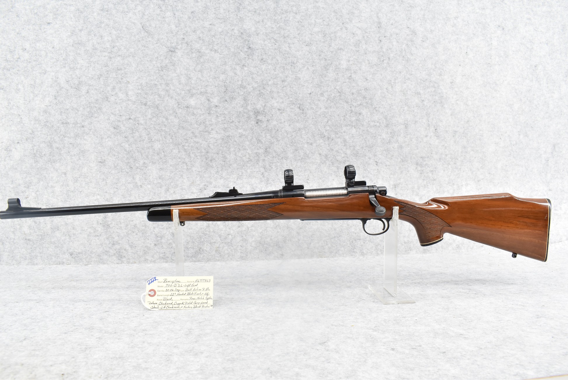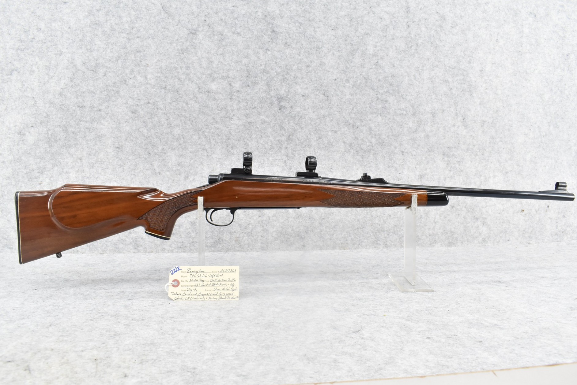 222R. Remington – Mod. 700 BDL (Left Hand) – 30-06 Sprg. Cal. Bolt Action Rifle – w/22” Barrel w/Hooded Blade Front & Adj. Rear Notch Sights – Blued Finish – w/Deluxe Checkered Capped Pistol Grip Wood Stock w/Left Hand Cheek Piece w/Factory Butt Plate – w/Leupold 2pc. Scope Rings & Bases