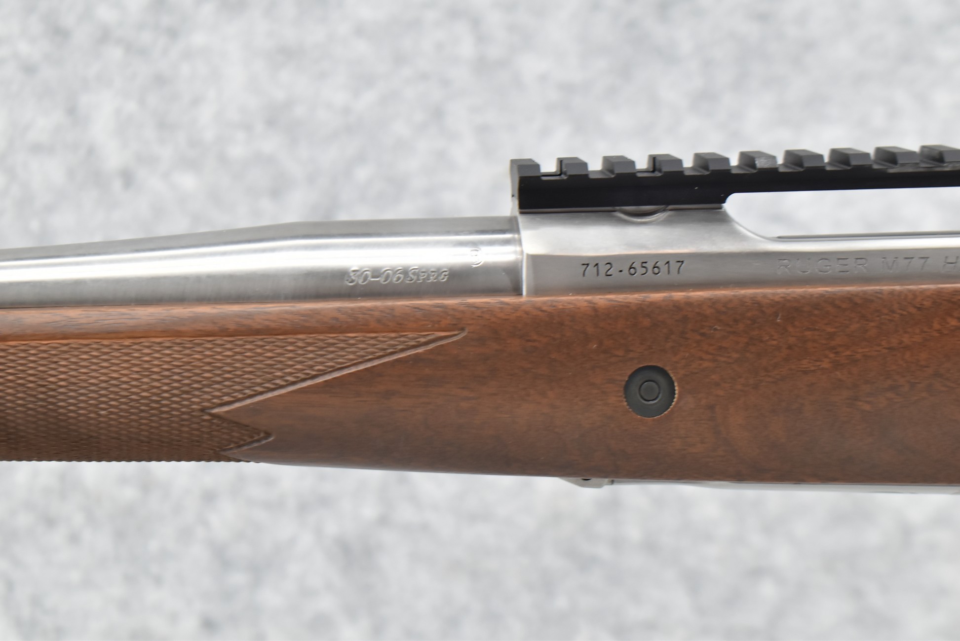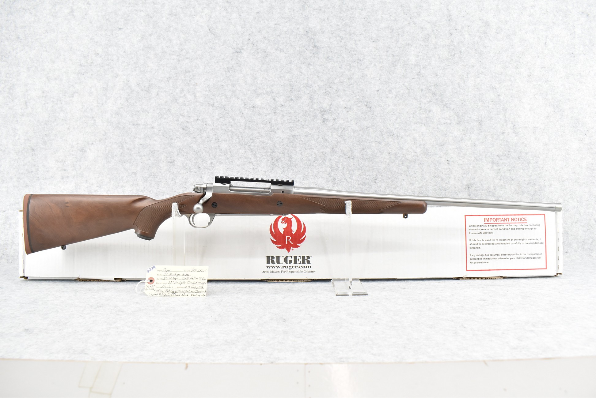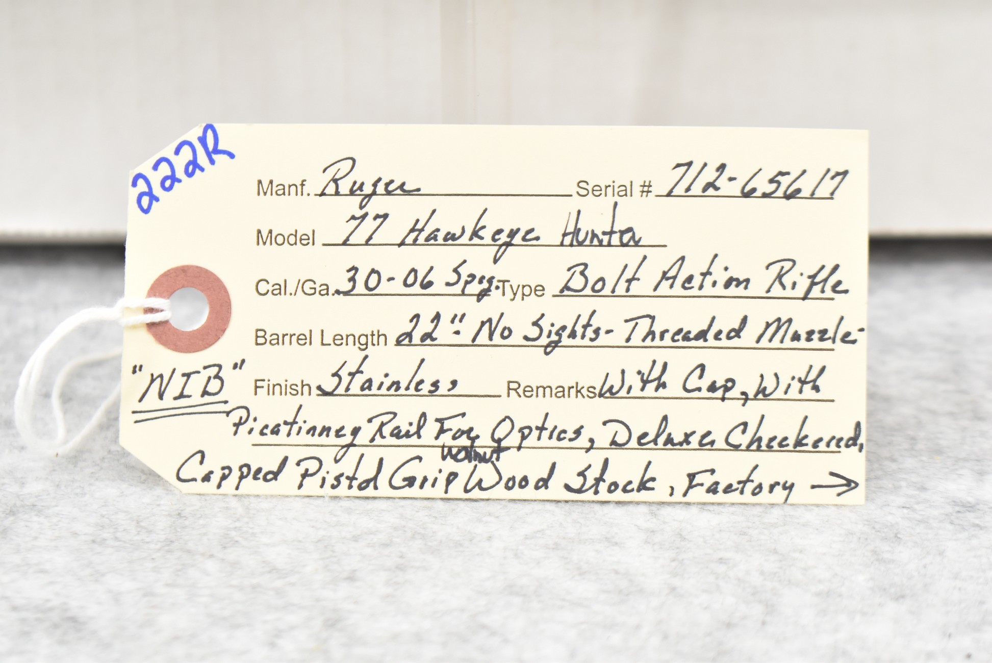 222R.     Ruger – Mod. 77 Hawkeye Hunter – 30-06 Sprg. Cal. Bolt Action Rifle – w/22” Barrel w/Threaded Muzzle w/Cap – Stainless Finish – w/Deluxe Checkered Capped Pistol Grip Walnut Wood Stock w/Factory Butt Pad – w/Picatinny Rail for Mounting Optics – w/Engraved Floor Plate – New in Factory Box w/Manual and Accessories