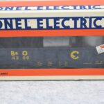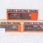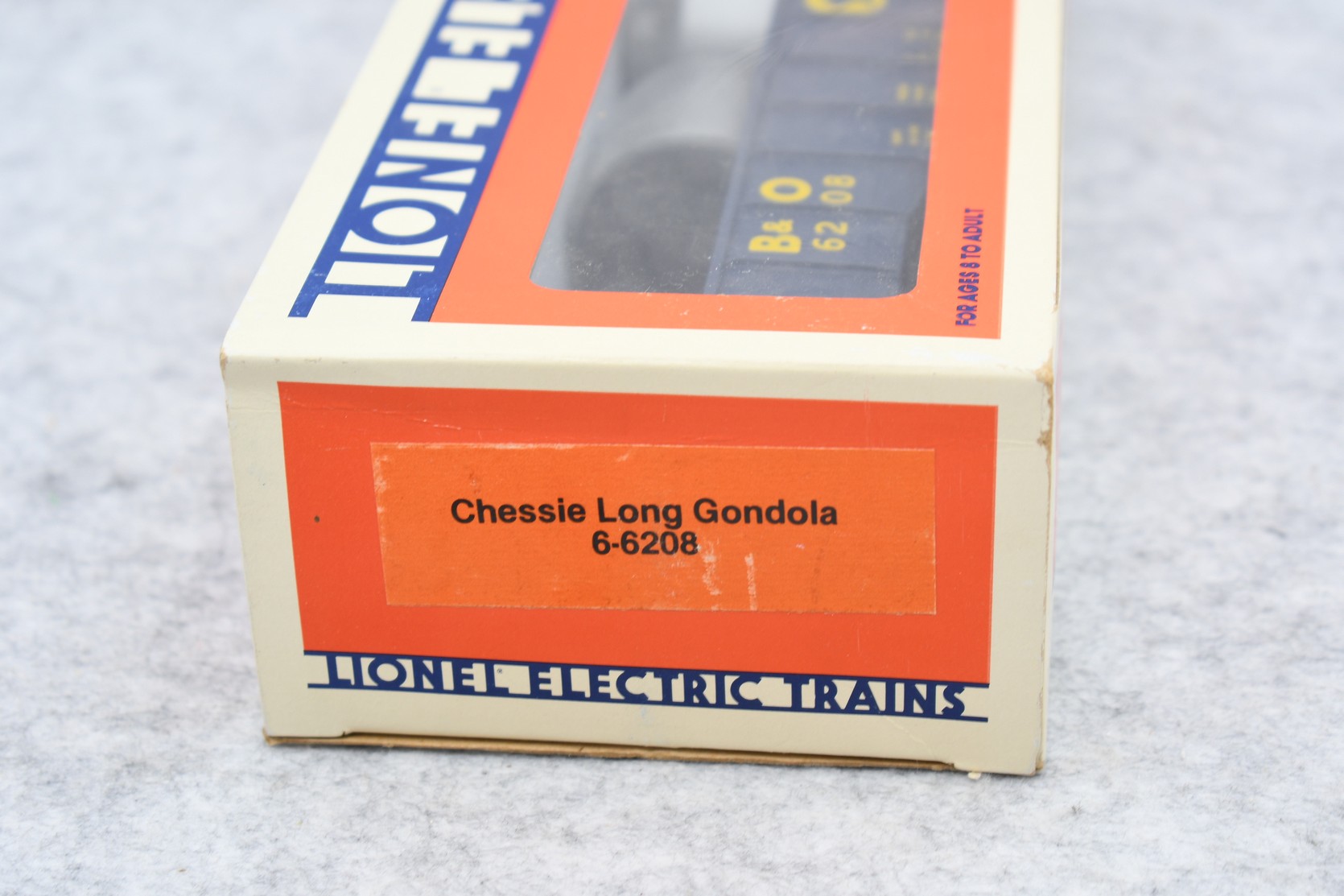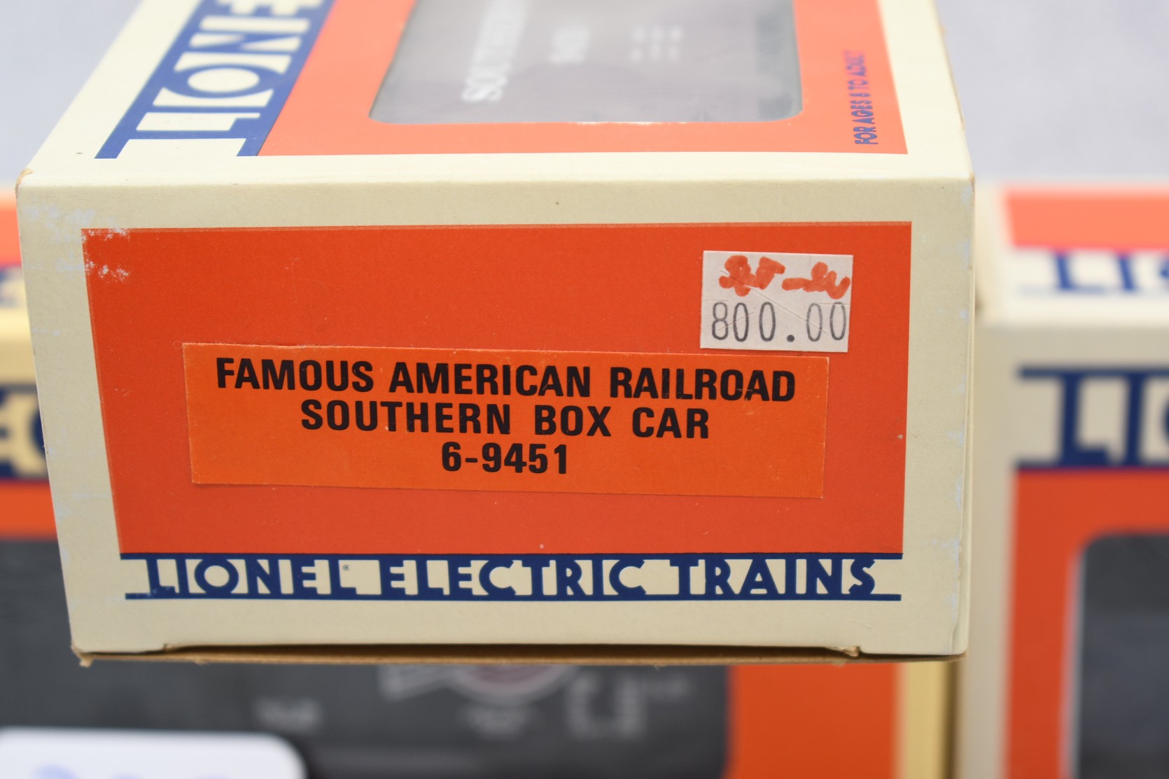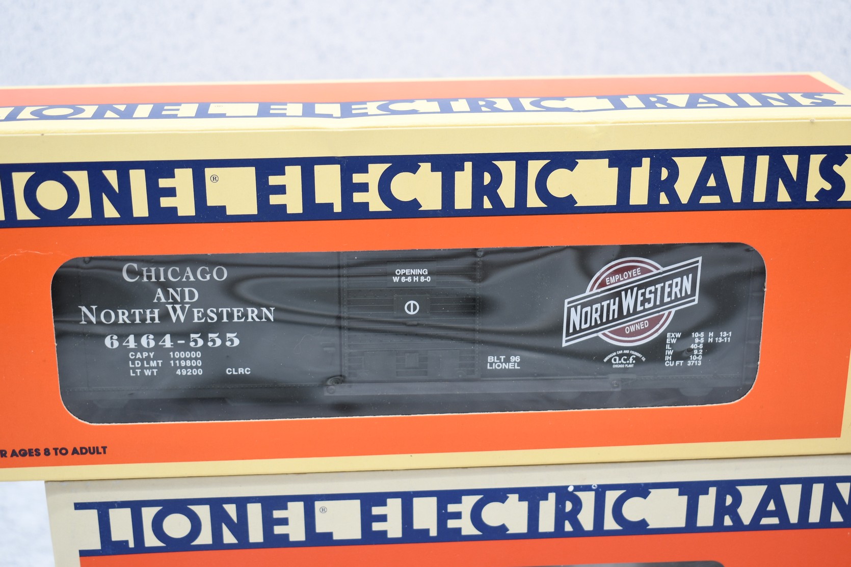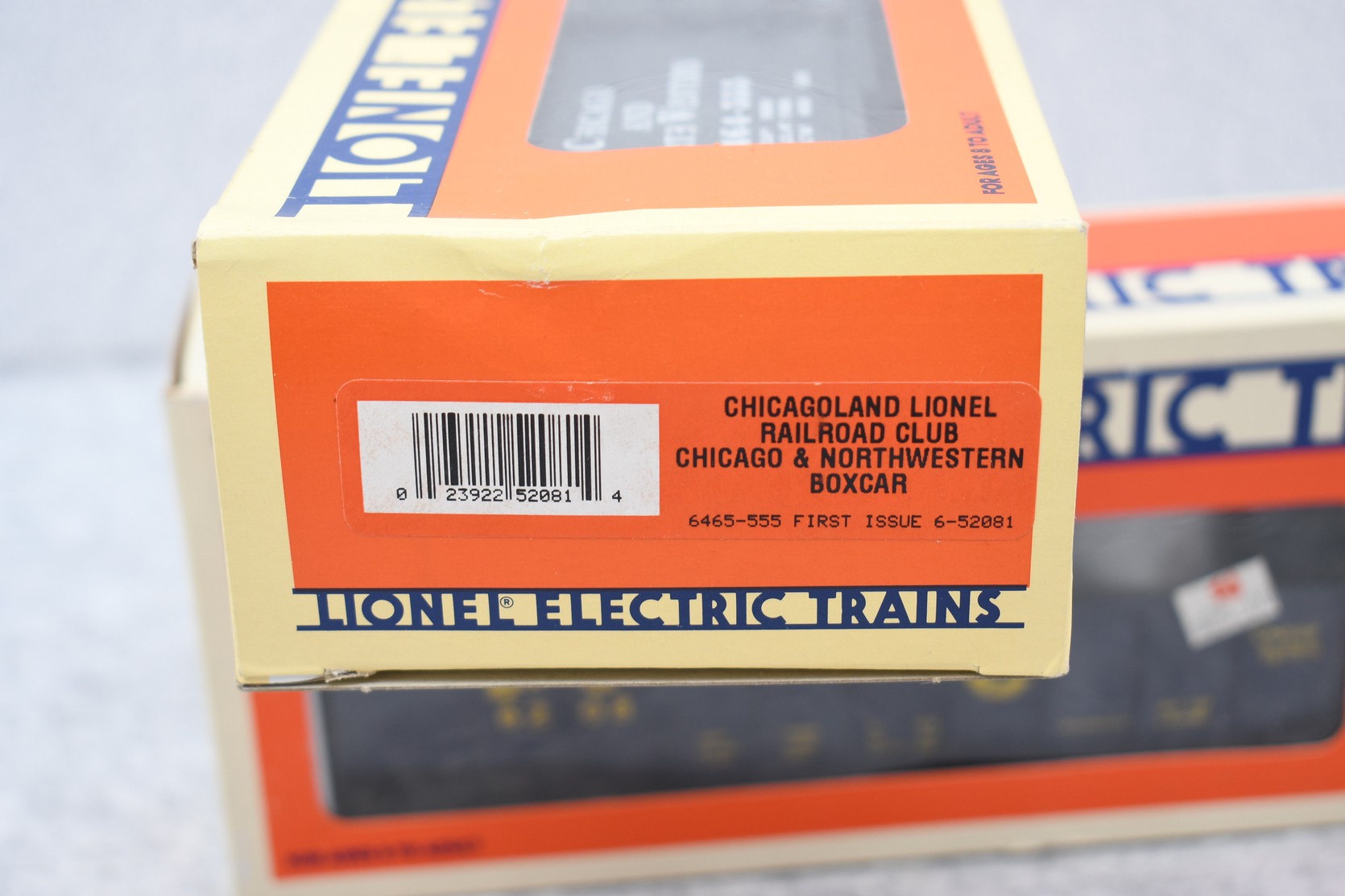 223. Lot of 3 Lionel O gauge train cars including 6-52081 Chicagoland Railroad Club (Chicago Northwestern boxcar), 6-9451 Famous American Railroad Southern boxcar, 6-6208 Chessie Long Gondola, all NIB