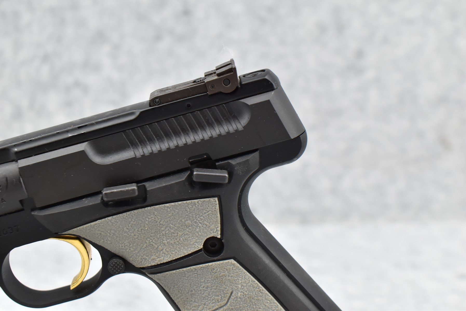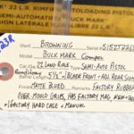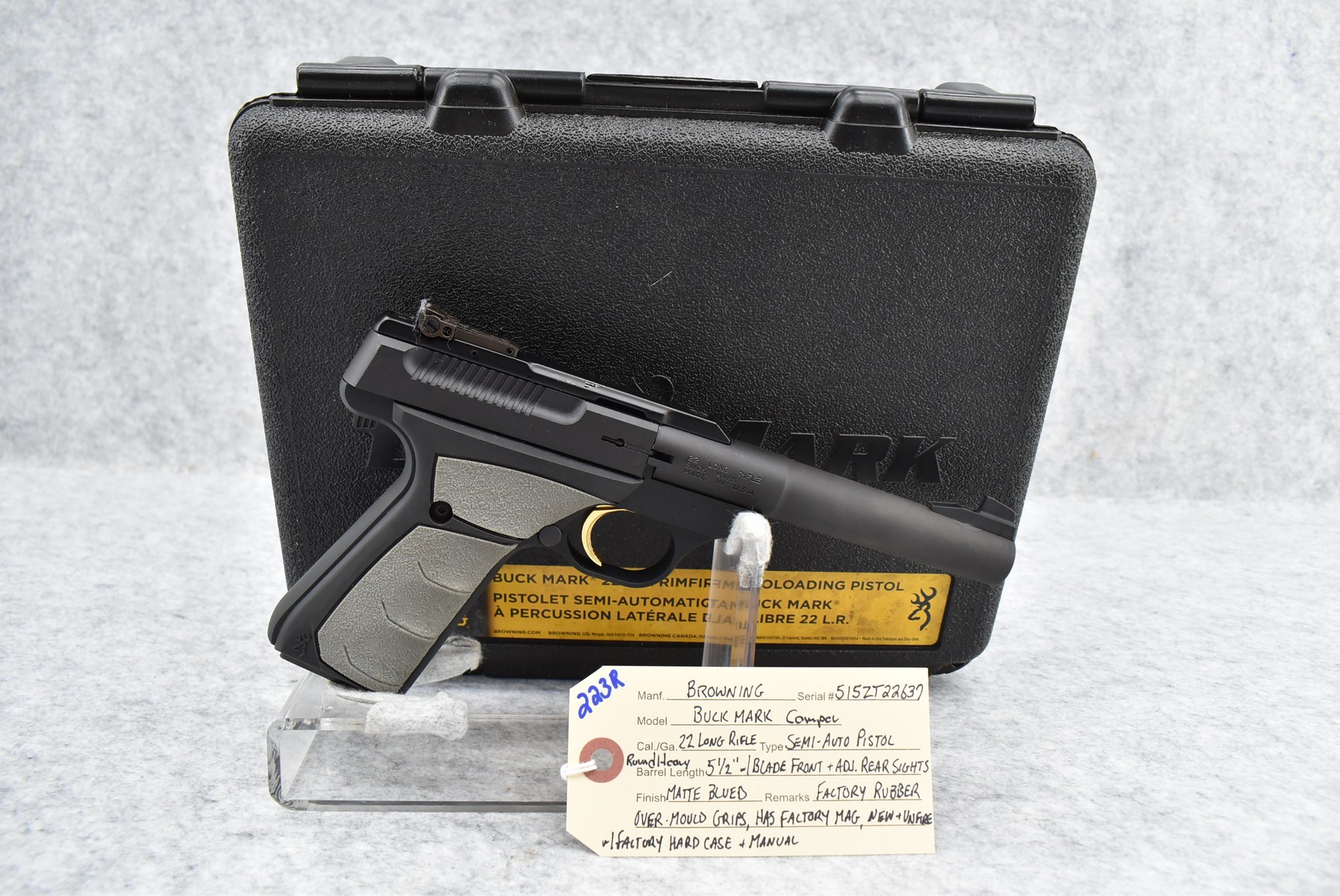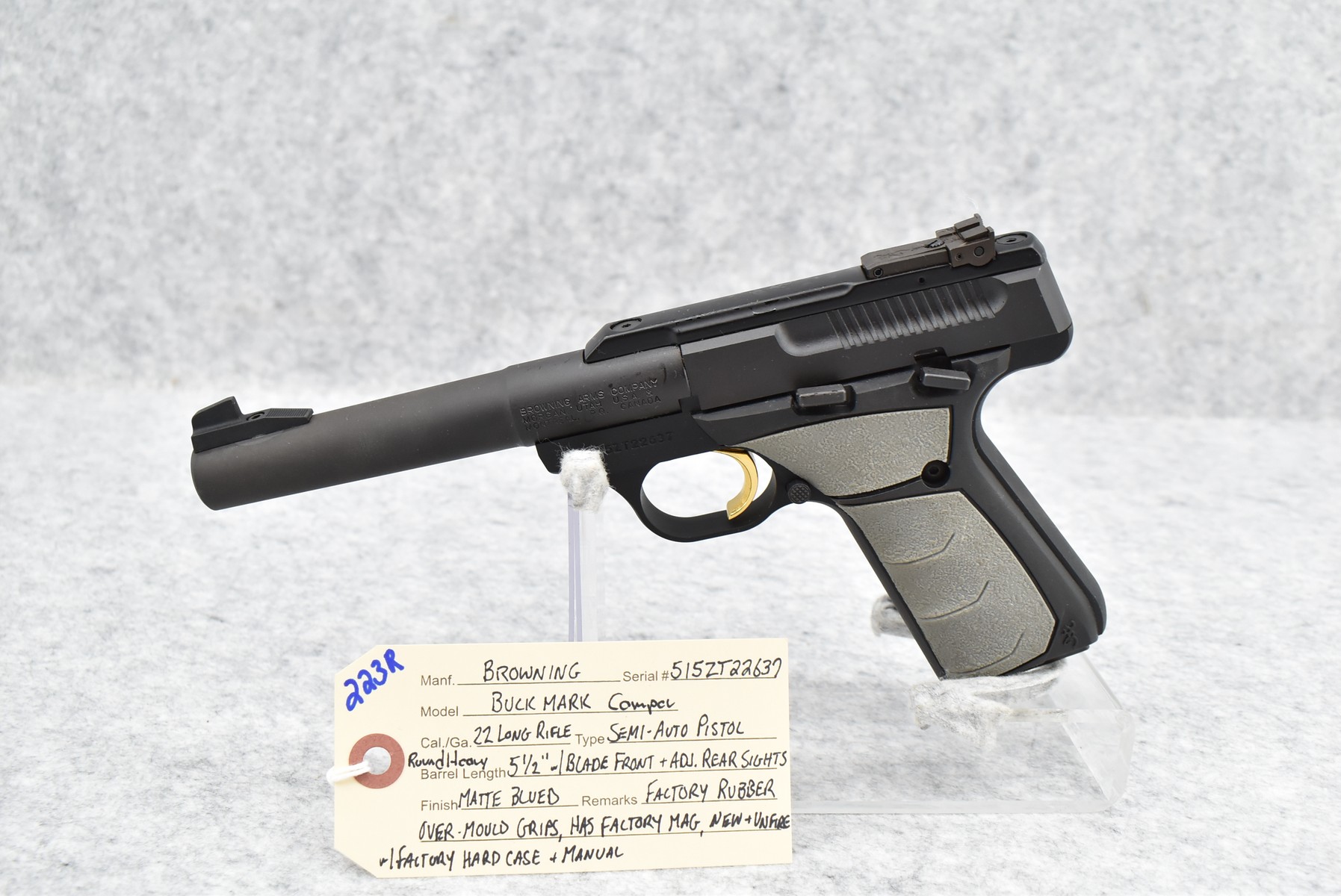 223R. Browning – Mod. Buckmark – Camper – 22 Long Rifle Cal. Semi-Auto Pistol – w/5 ½” Round Heavy Barrel w/Blade Front & Adj. Rear Sights – Matte Blued Finish – w/Factory Rubber Over-Mold Grips – w/Factory Mag – New & Unfired w/Factory Hard Case & Manua