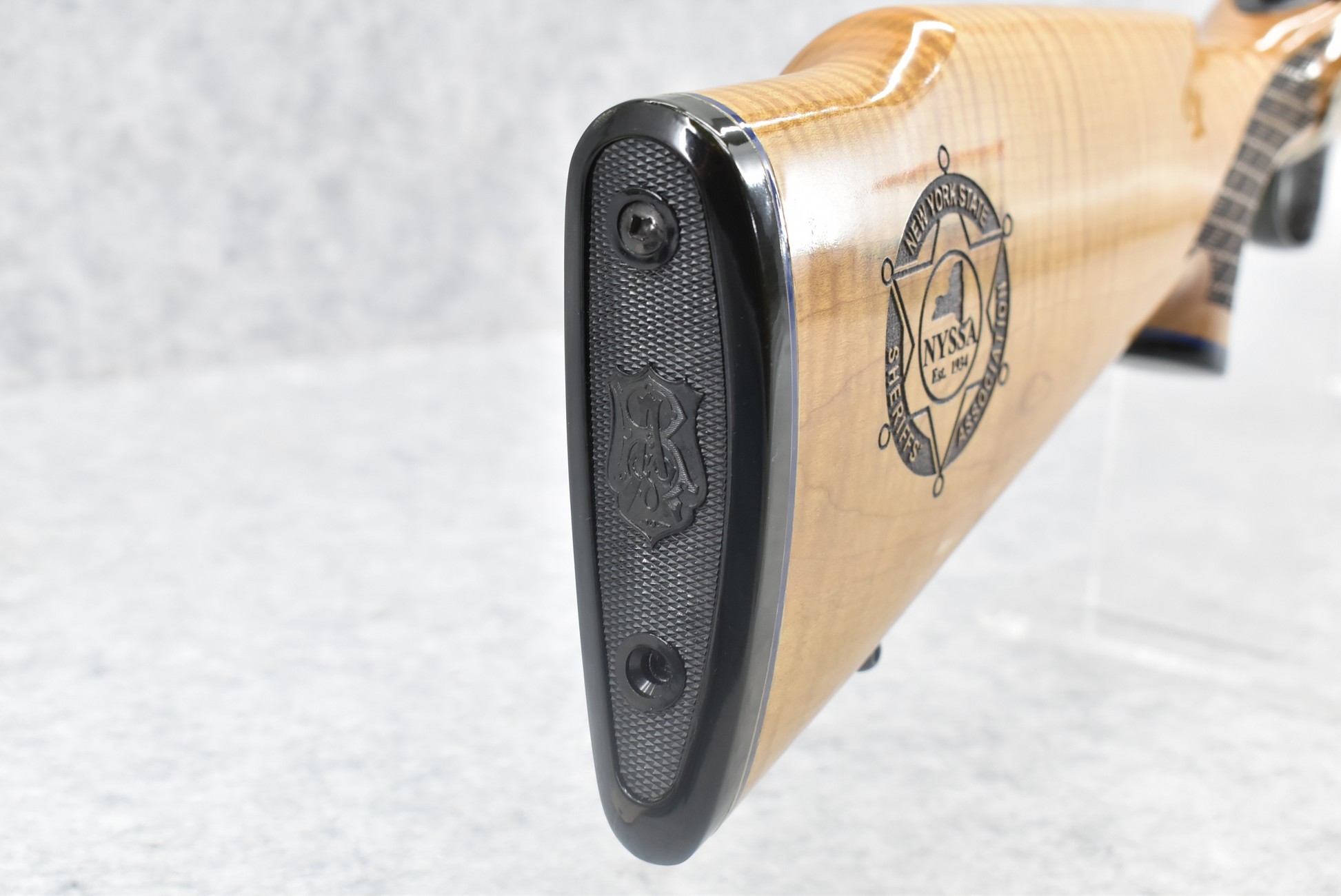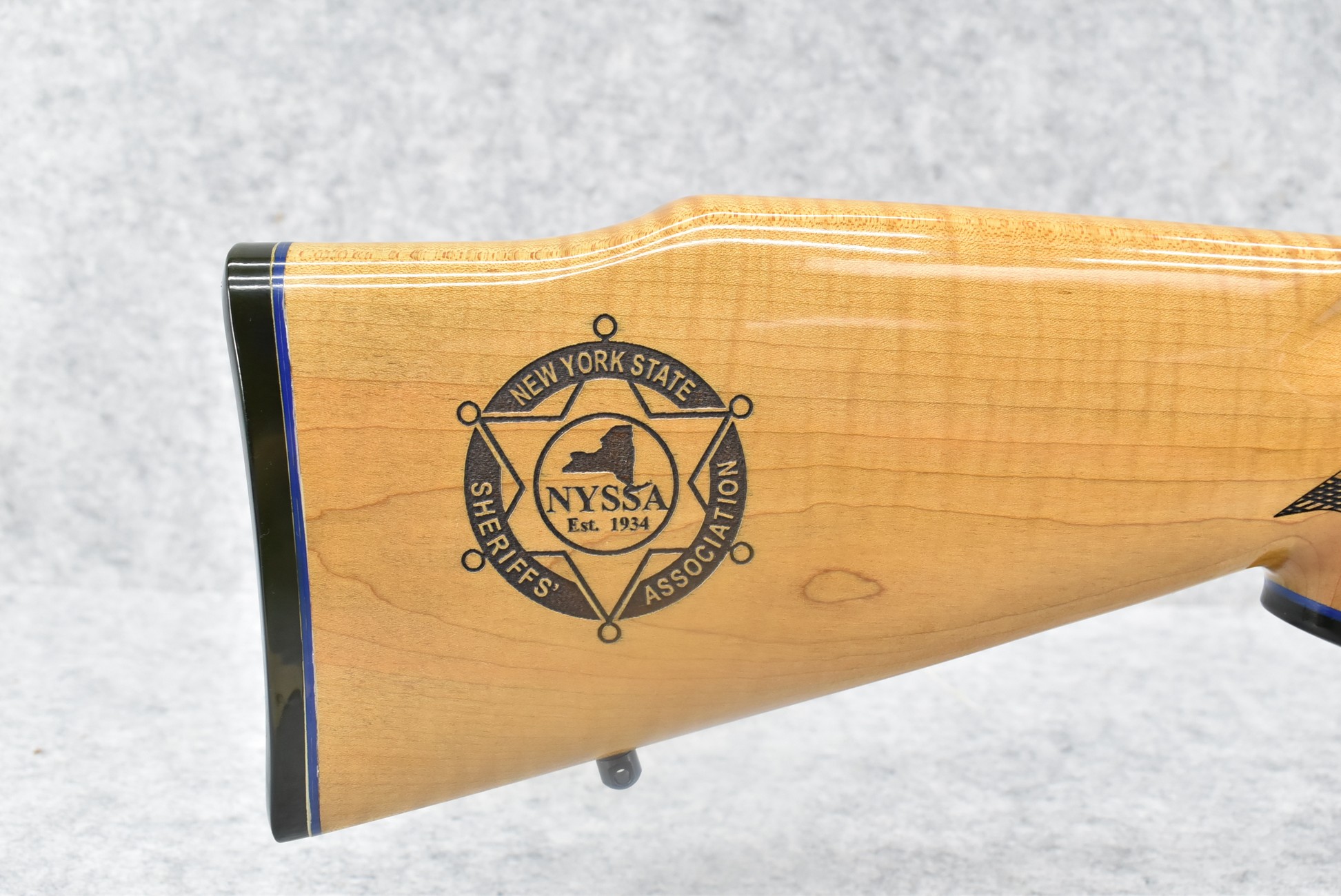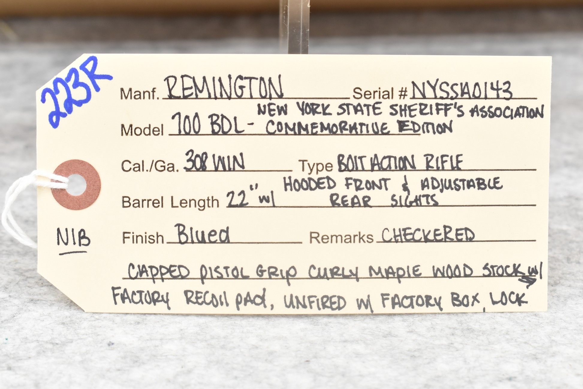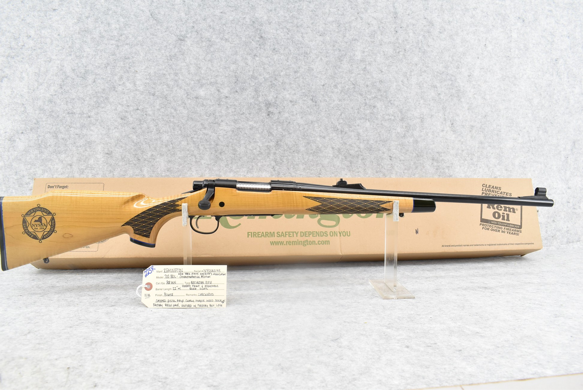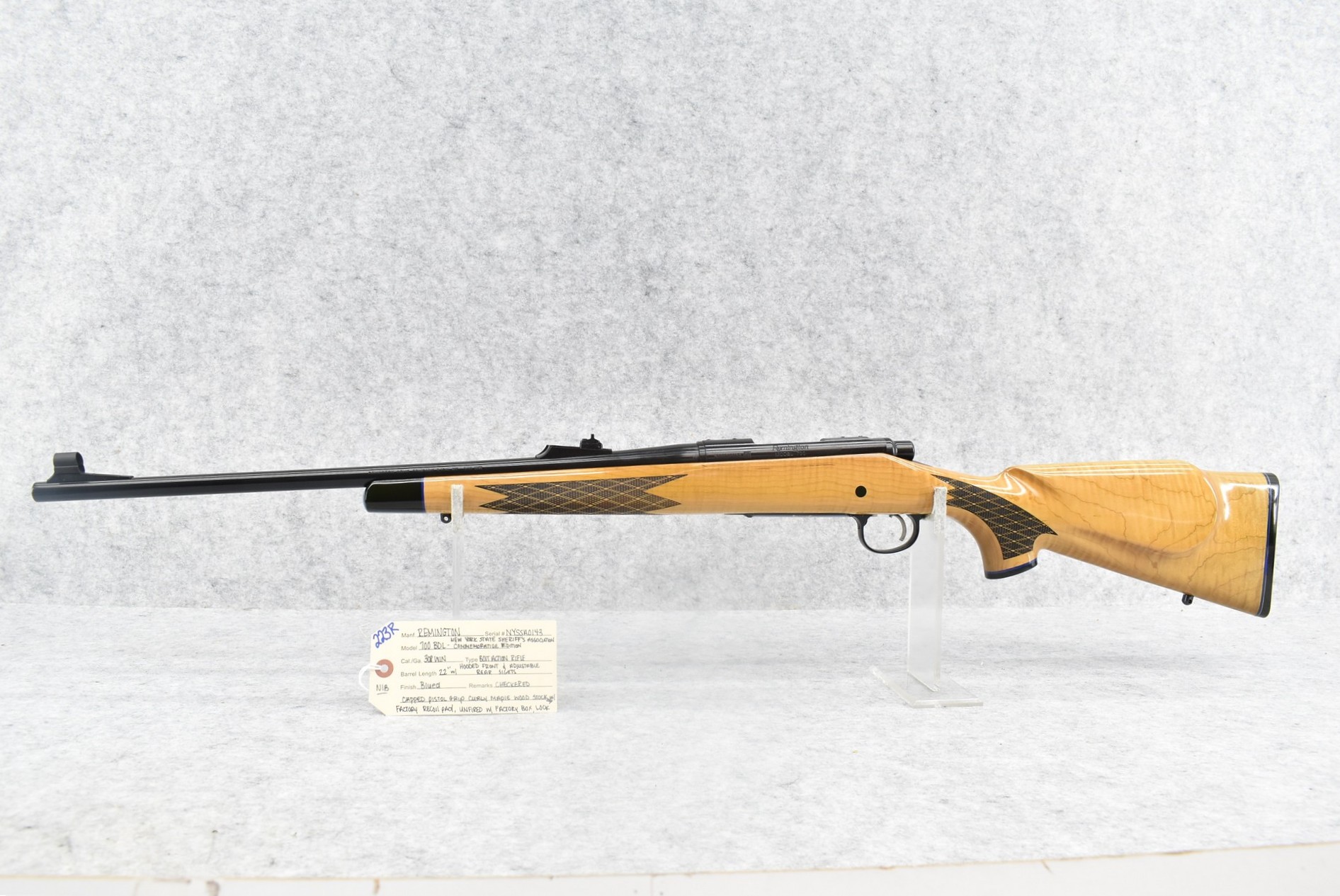 223R.     Remington – Mod. 700 BDL – New York State Sheriff’s Association Commemorative Edition – 308 Win. Cal. Bolt Action Rifle – w/22” Barrel w/Hooded Front & Adj. Rear Sights – Blued Finish – w/Checkered Capped Pistol Grip Curly Maple Wood Stock w/Factory Recoil Pad – Unfired w/Factory Box & Manual – Mfg. 2019 – Mfg. in Limited Quantities & Even More Rare w/Curly Maple Stock!