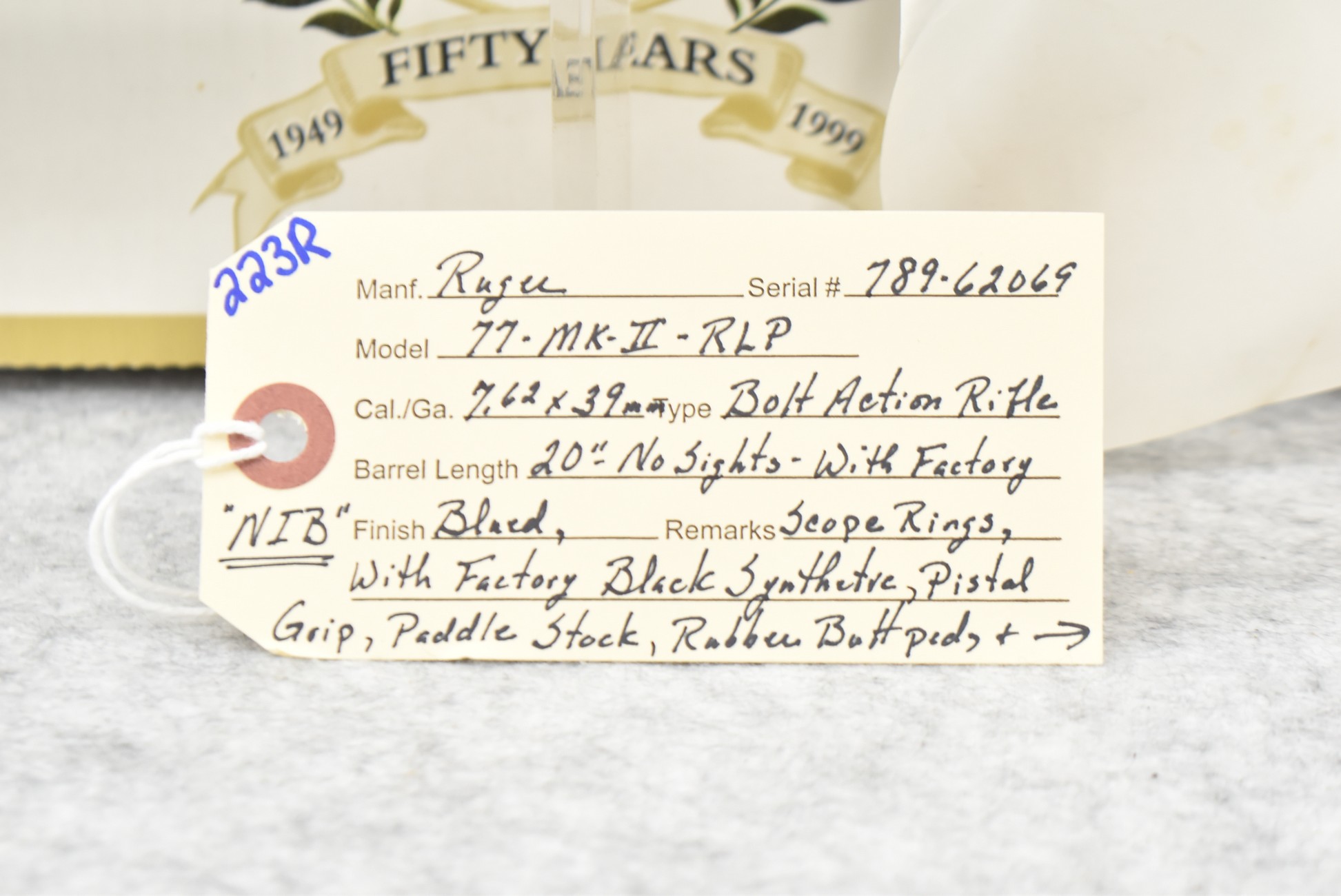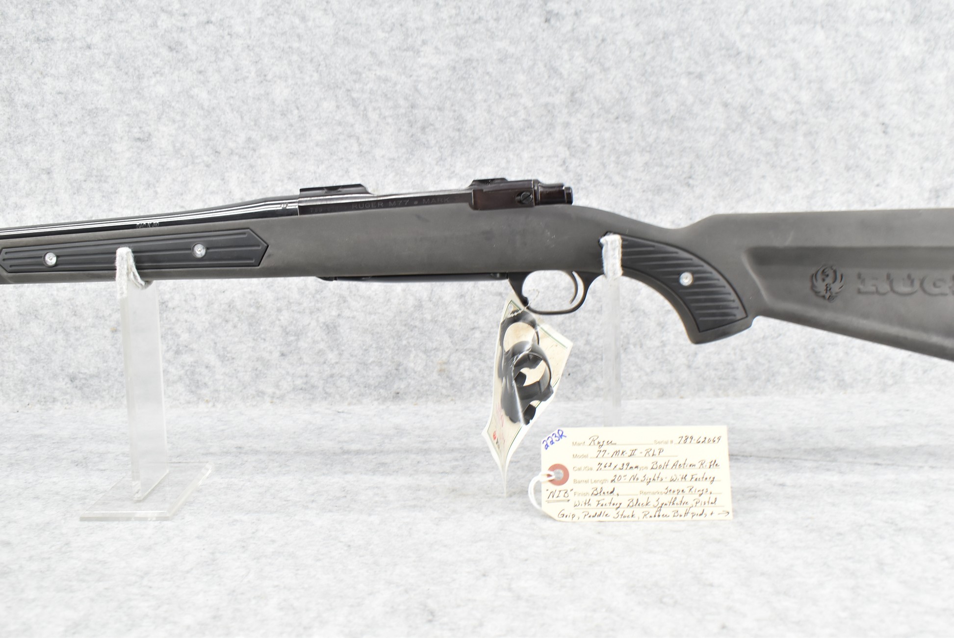 223R. Ruger – Mod. 77 MKII RLP – 7.62x39mm Cal. Bolt Action Rifle – w/20” Barrel – Blued Finish – w/Factory Black Synthetic Pistol Grip Paddle Stock w/Rubber Butt Pad and Black Plastic Grip Panels – w/Factory Scope Rings – New in Factory Box w/Accessories