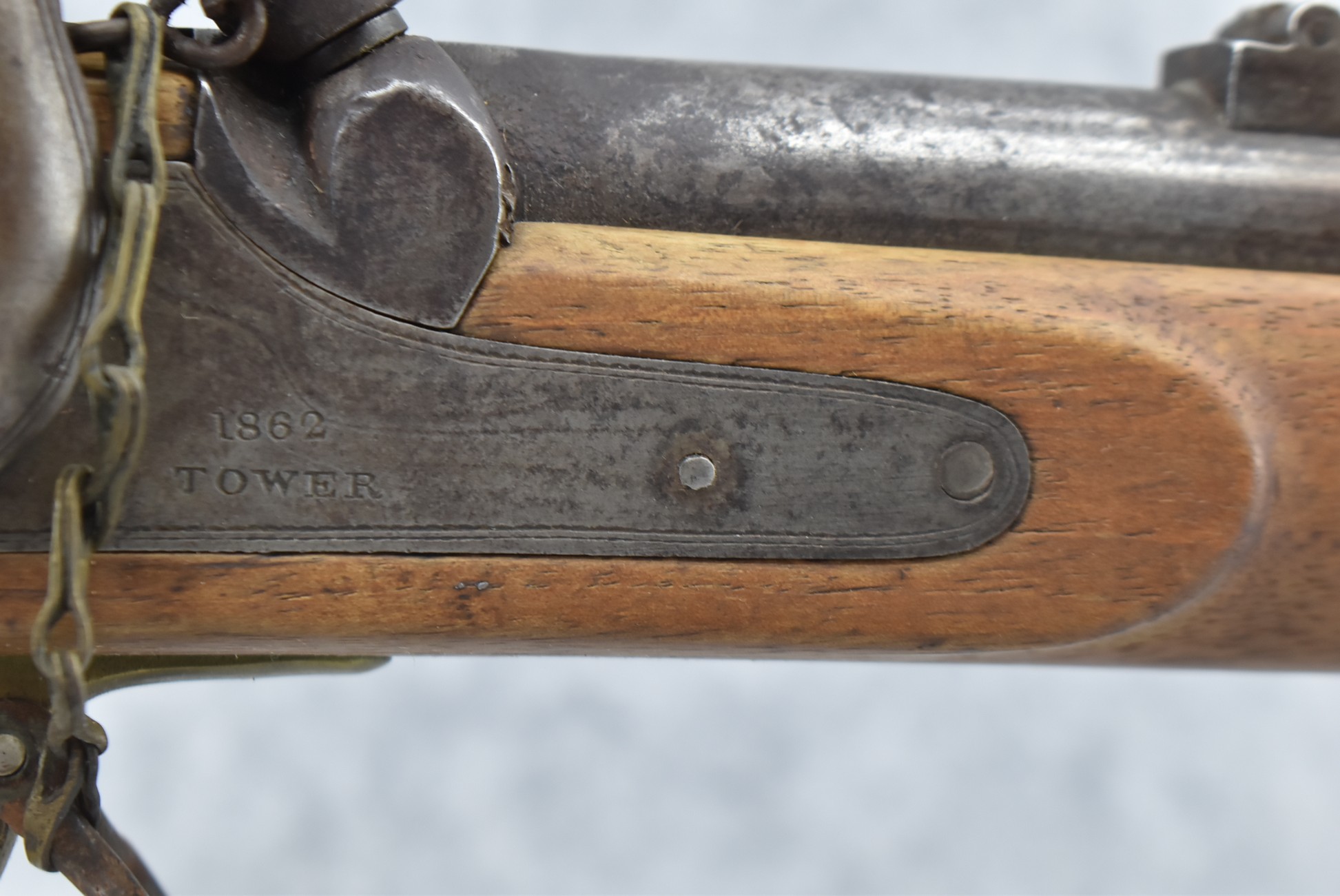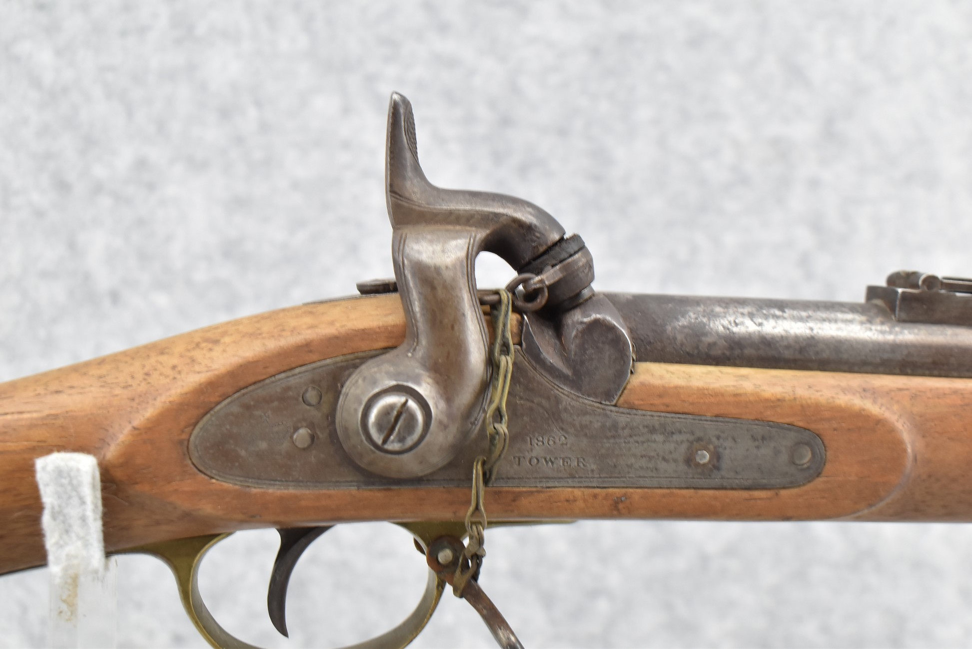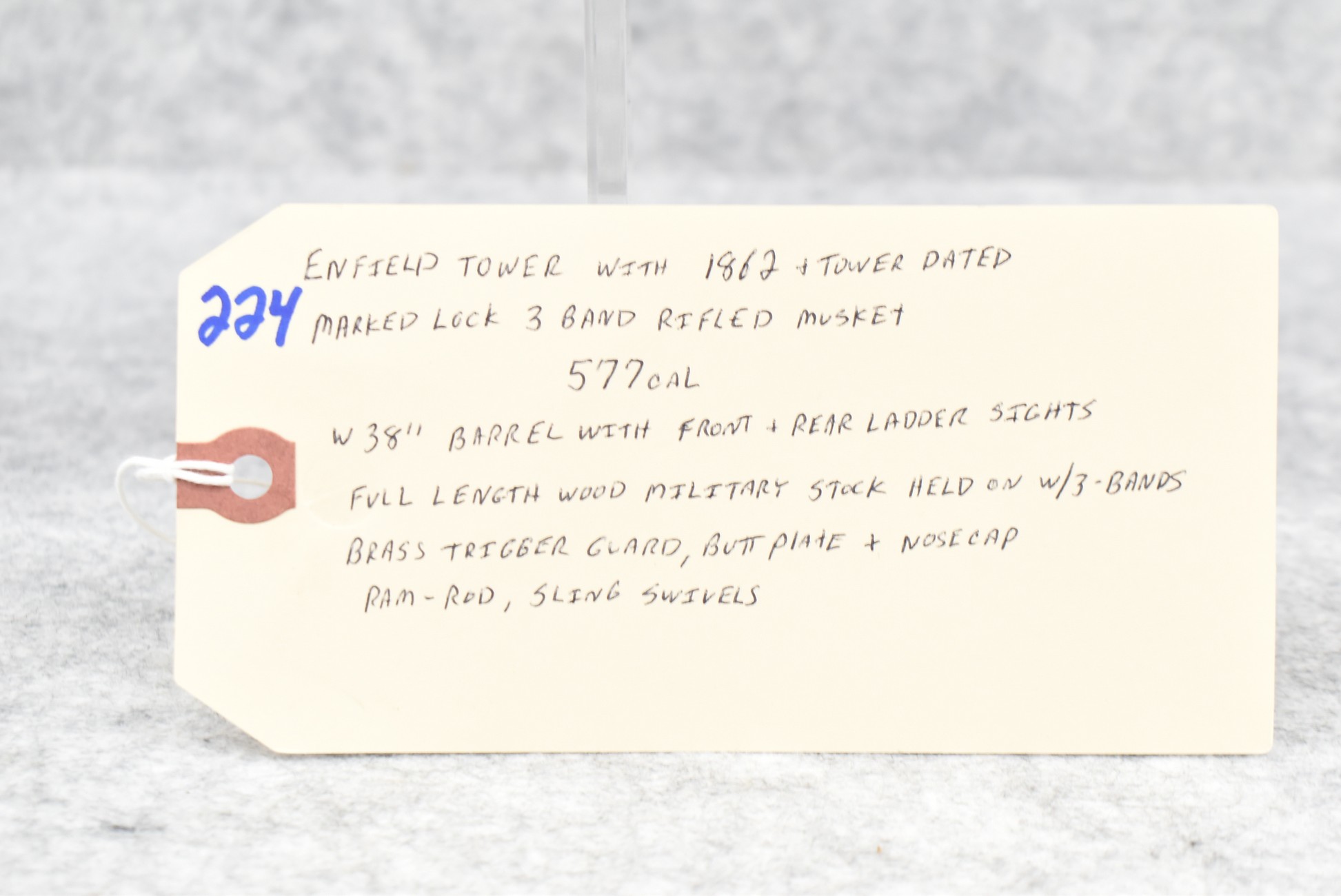 224. Enfield Tower w/1862 & Tower Dated & Marked Lock, 3 Band Rifled Musket – 577 Cal. – w/38” Barrel w/Front & Rear Ladder Sights – w/Full Length Wood Military Stock Held on by 3 Barrel Bands w/Brass Trigger Guard, Butt Plate & Nose Cap – w/Sling Swivels – w/Ram Rod