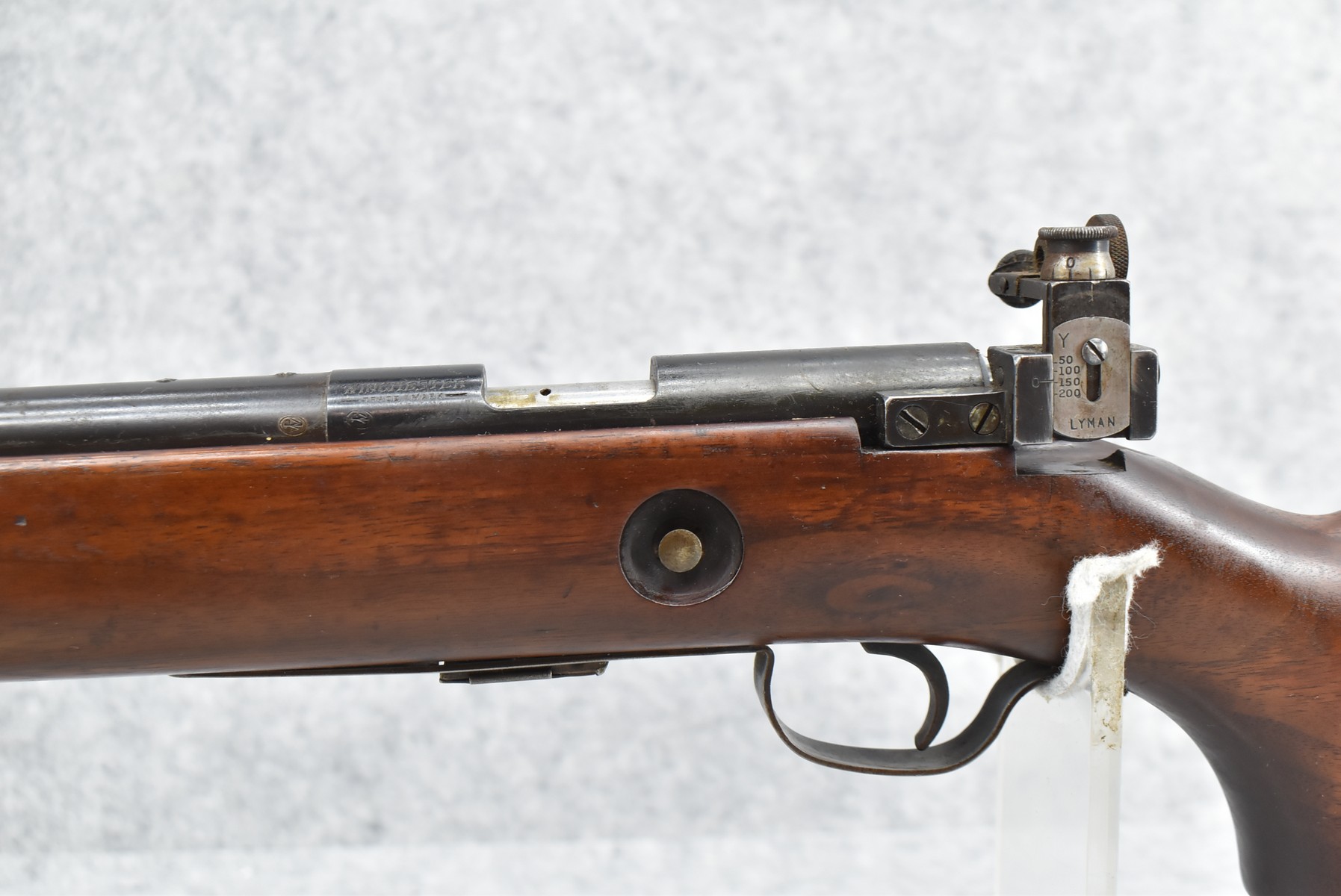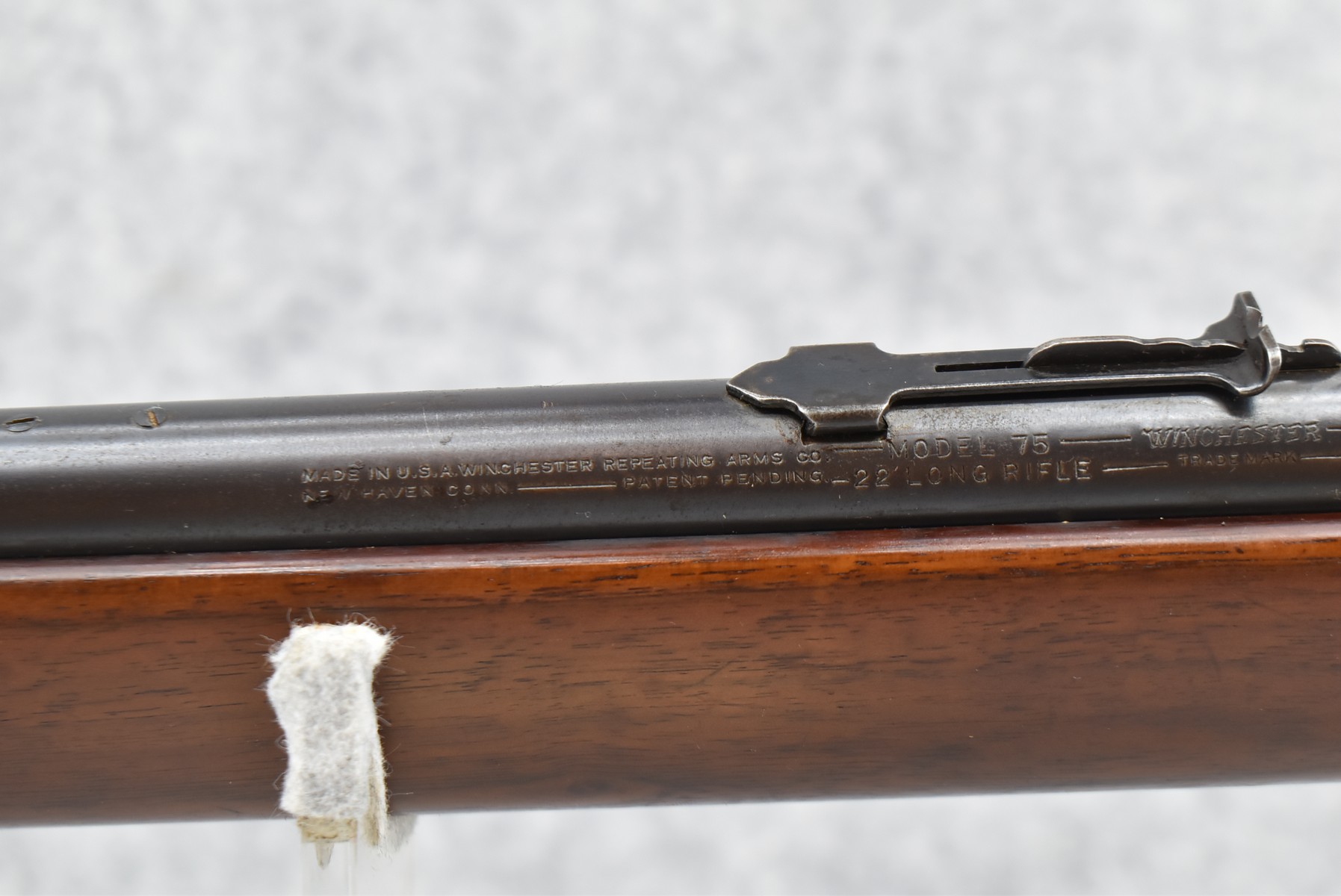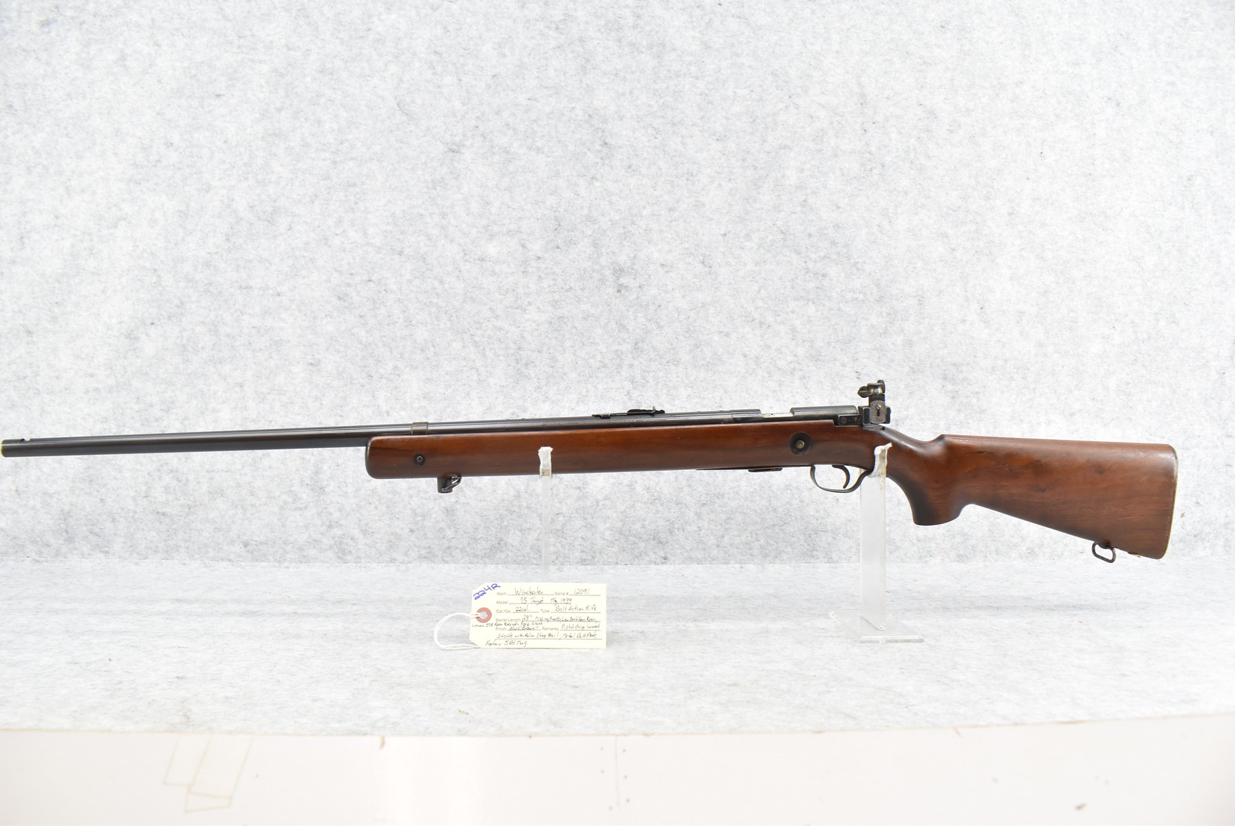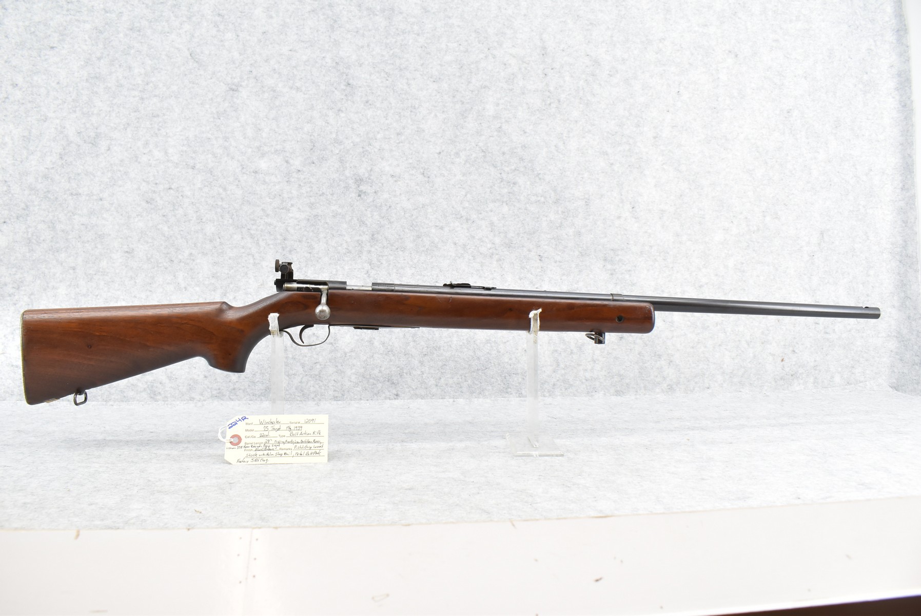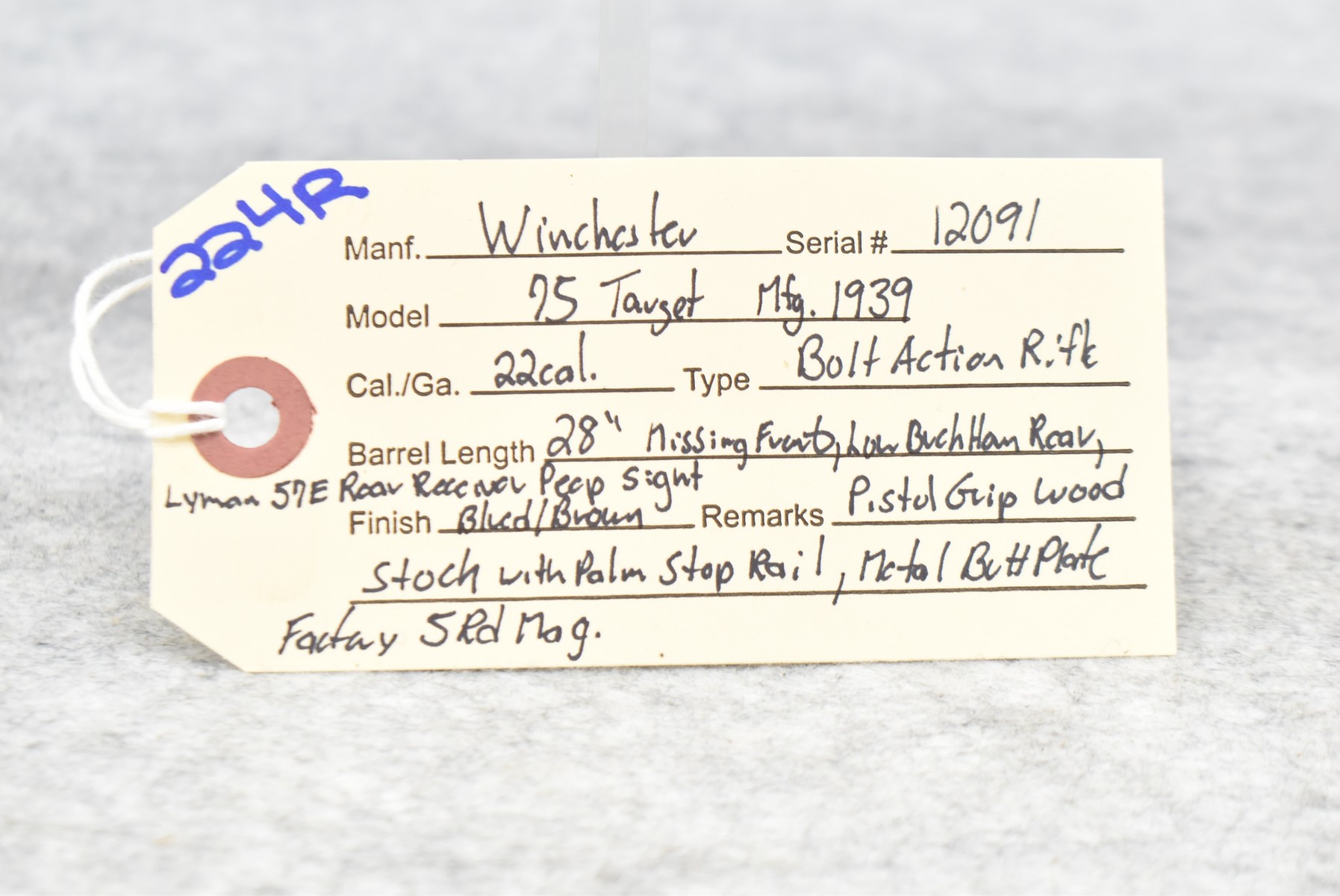224R. Winchester – Mod. 75 Target – 22 Cal. Bolt Action Rifle – w/28” Barrel w/Low Buckhorn Rear Sight and Lyman 57E Rear Receiver Peep (Missing Front Sight) – Blued/Brown Finish – w/Pistol Grip Wood Stock w/Palm Stop Rail and Metal Butt Plate – w/Factory 5-Round Magazine