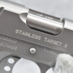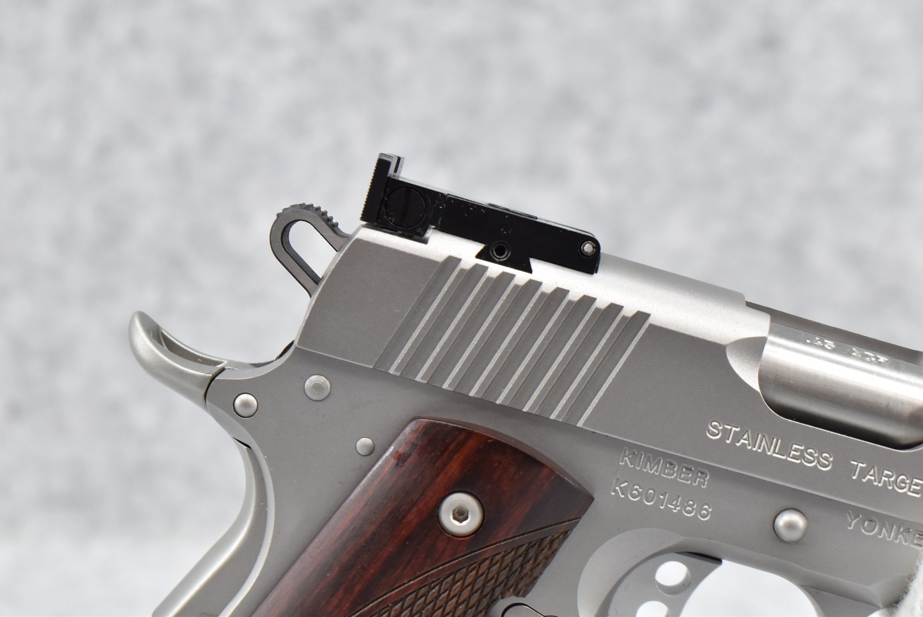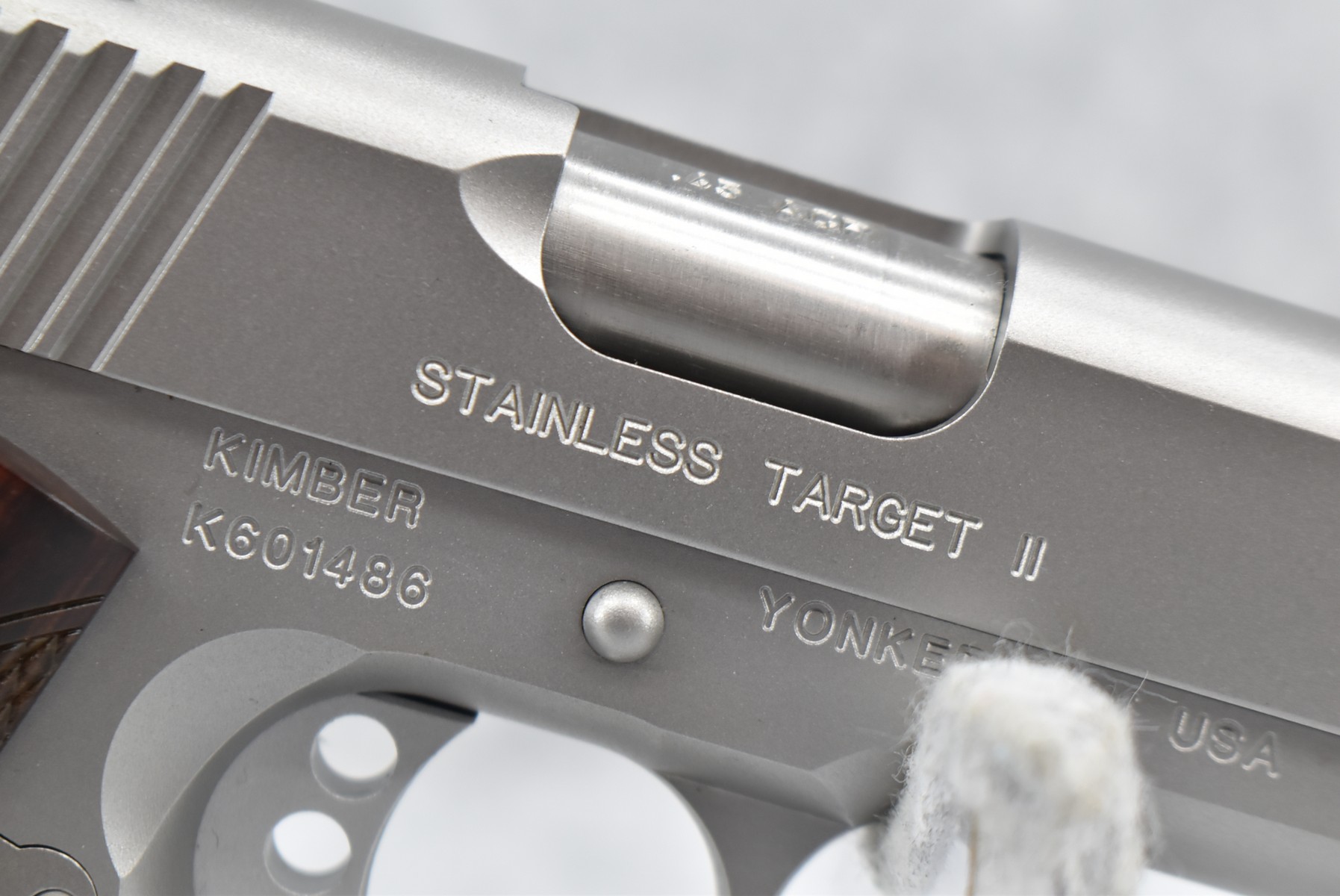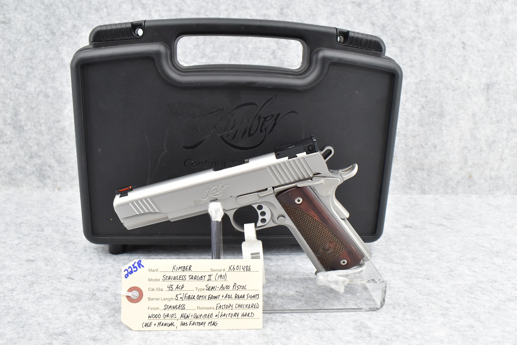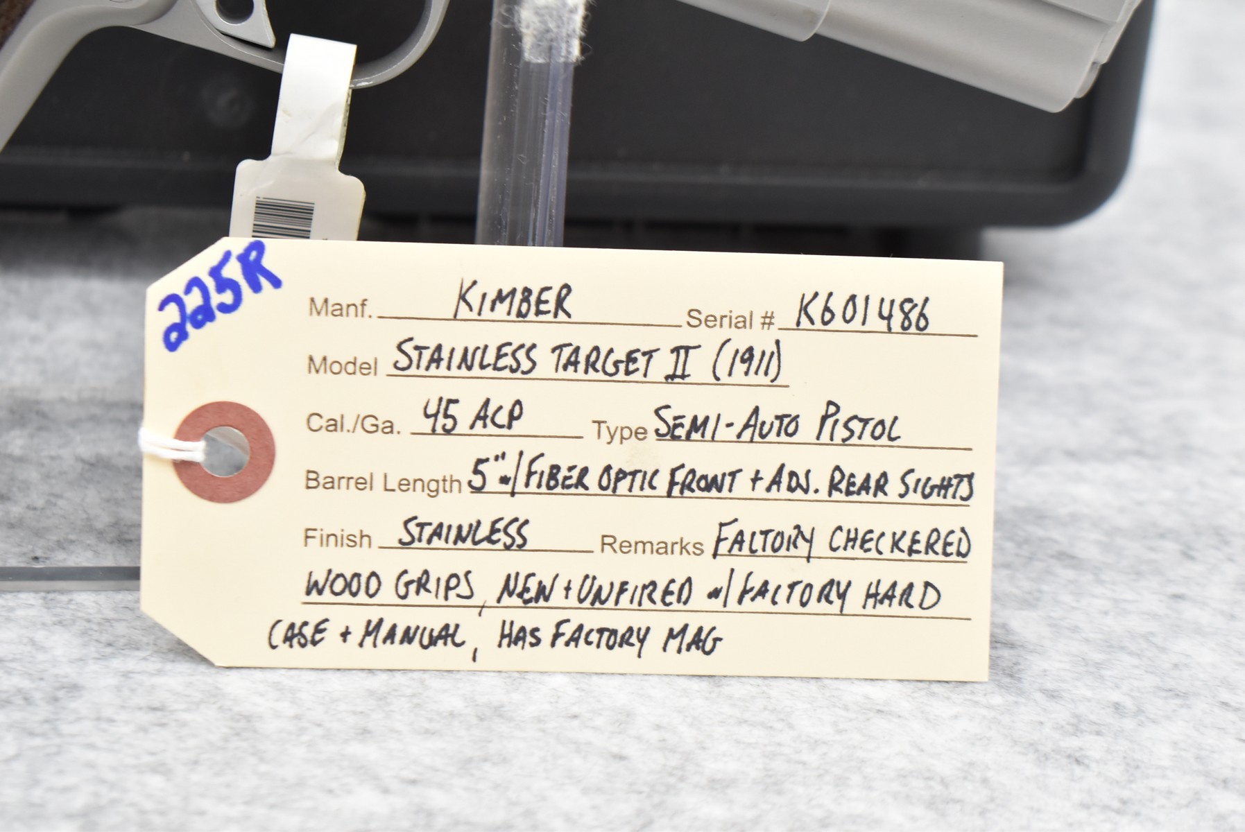 225R. Kimber – Stainless Target II (1911) – 45 ACP Cal. Semi-Auto Pistol – w/5” Barrel w/Fiber Optic Front & Adj. Rear Sights – Stainless Finish – w/Factory Checkered Wood Grips – w/Factory Mag – New & Unfired w/Factory Hard Case & Manual