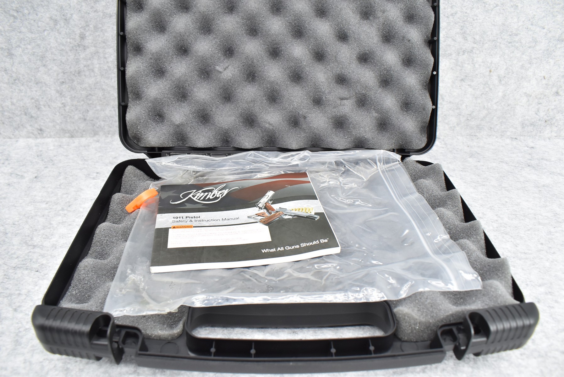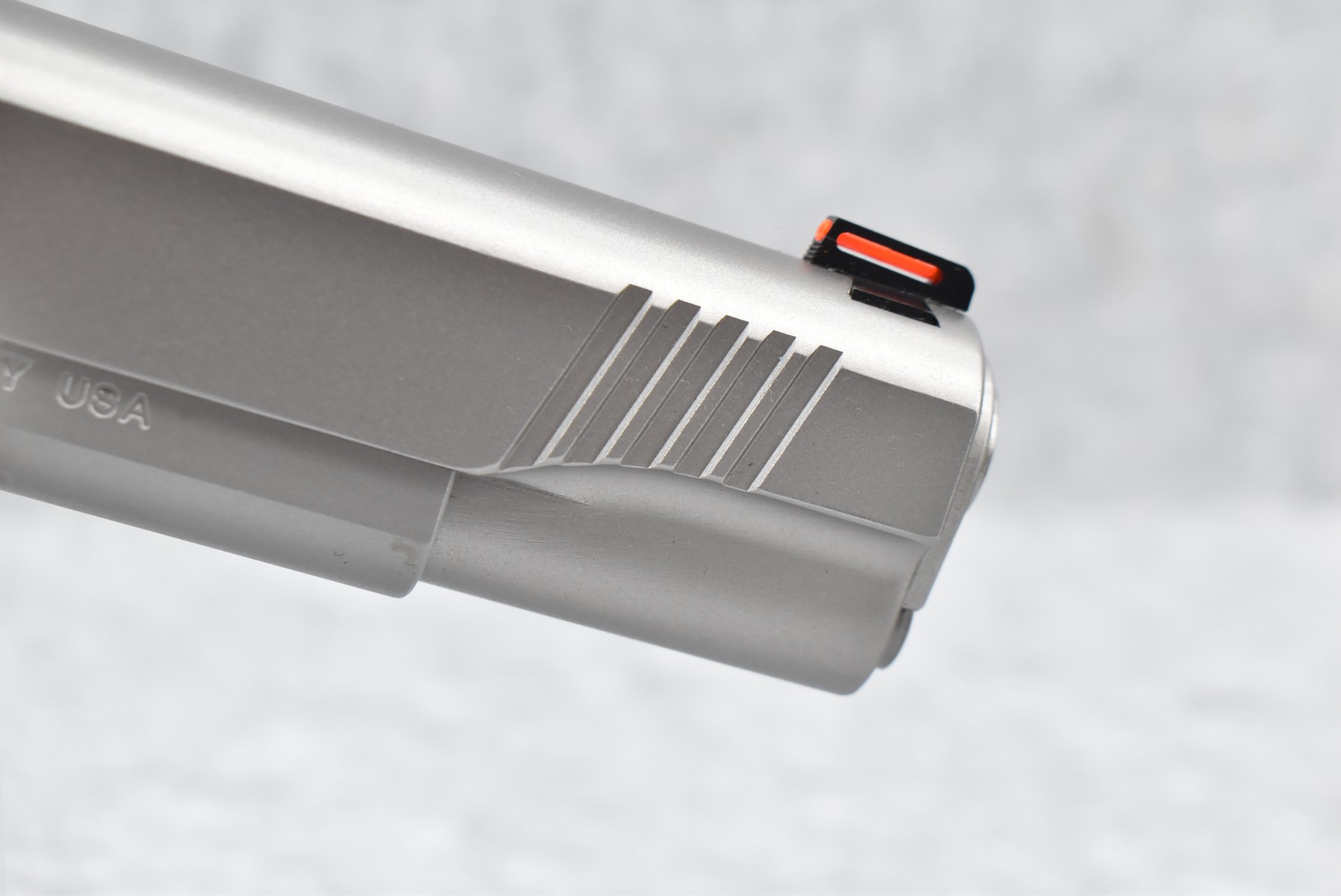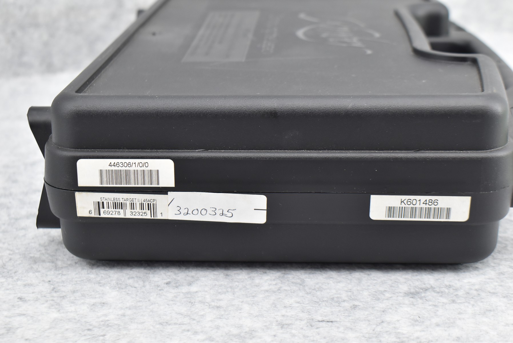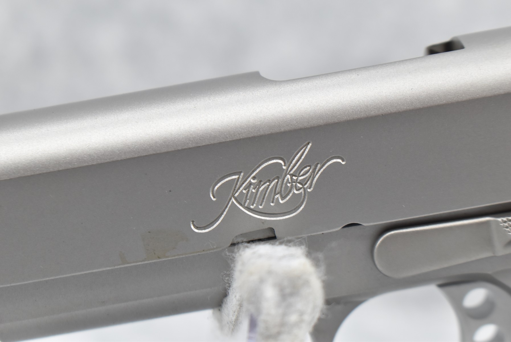 225R. Kimber – Stainless Target II (1911) – 45 ACP Cal. Semi-Auto Pistol – w/5” Barrel w/Fiber Optic Front & Adj. Rear Sights – Stainless Finish – w/Factory Checkered Wood Grips – w/Factory Mag – New & Unfired w/Factory Hard Case & Manual