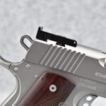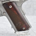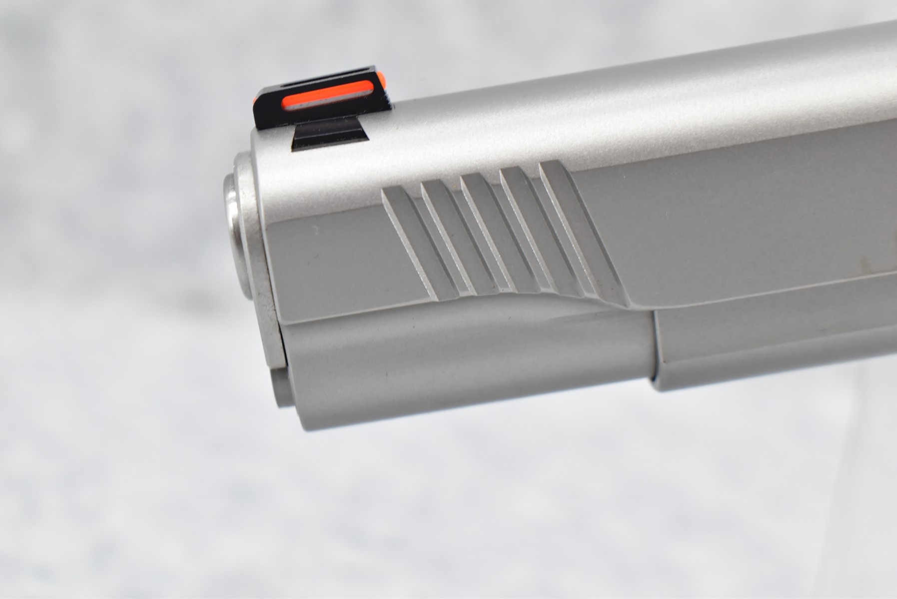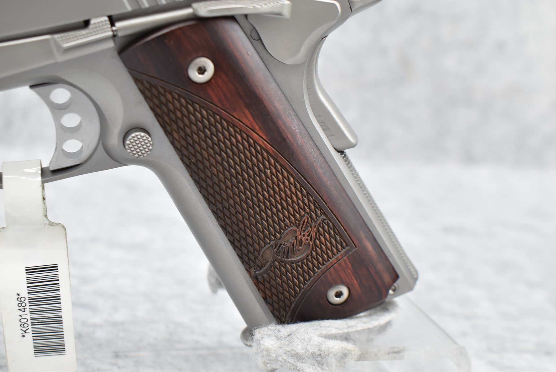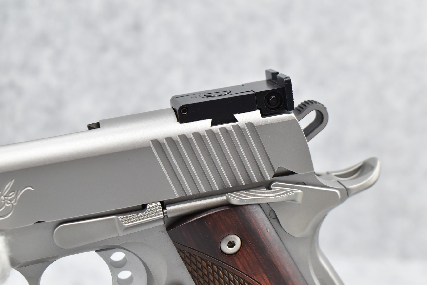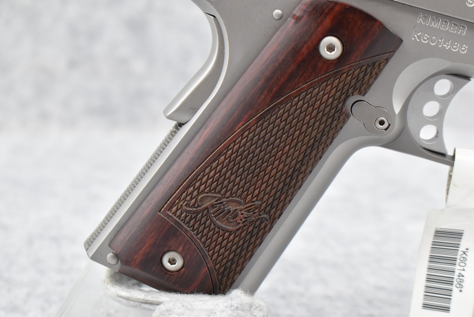 225R. Kimber – Stainless Target II (1911) – 45 ACP Cal. Semi-Auto Pistol – w/5” Barrel w/Fiber Optic Front & Adj. Rear Sights – Stainless Finish – w/Factory Checkered Wood Grips – w/Factory Mag – New & Unfired w/Factory Hard Case & Manual