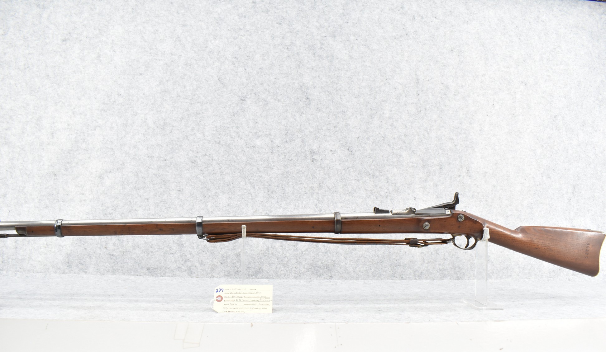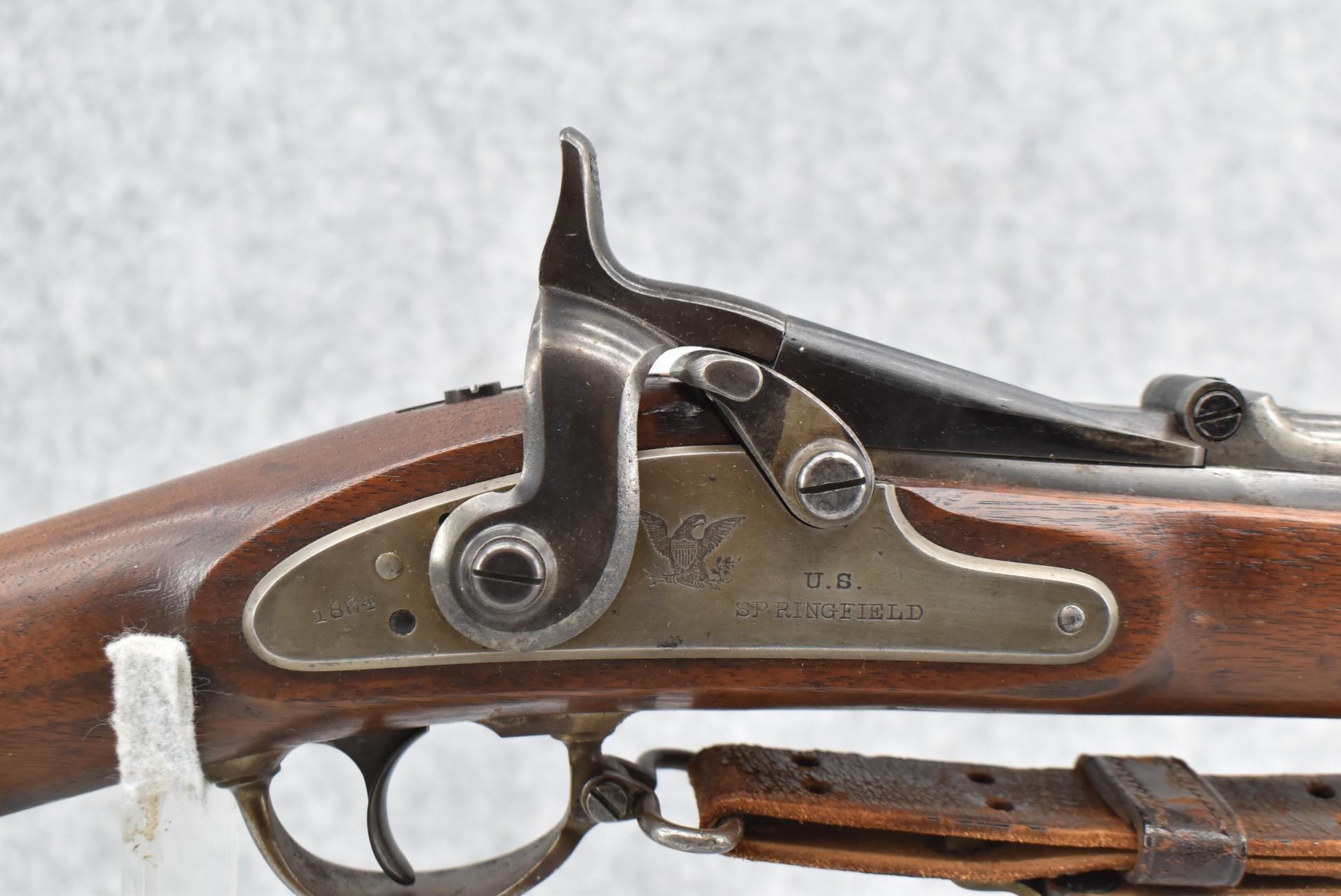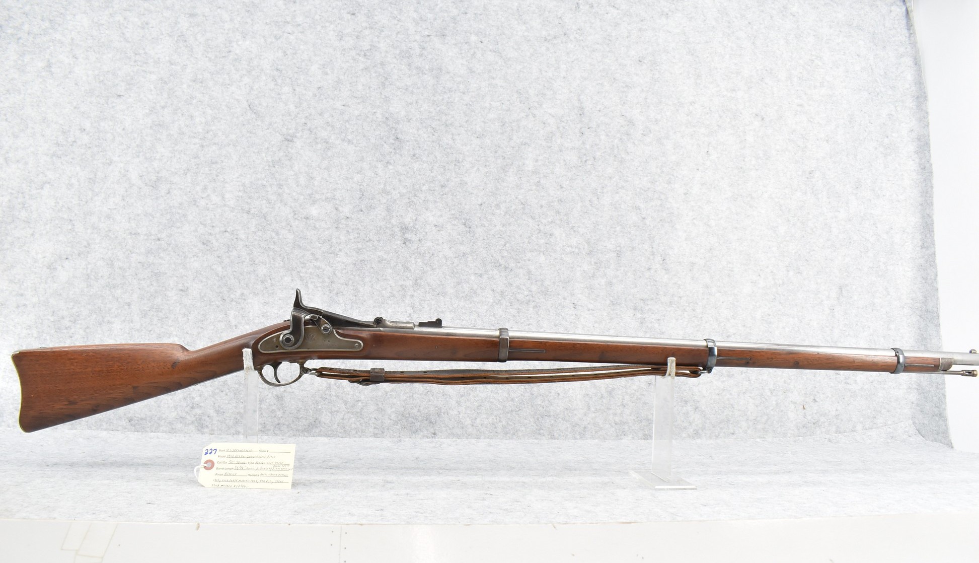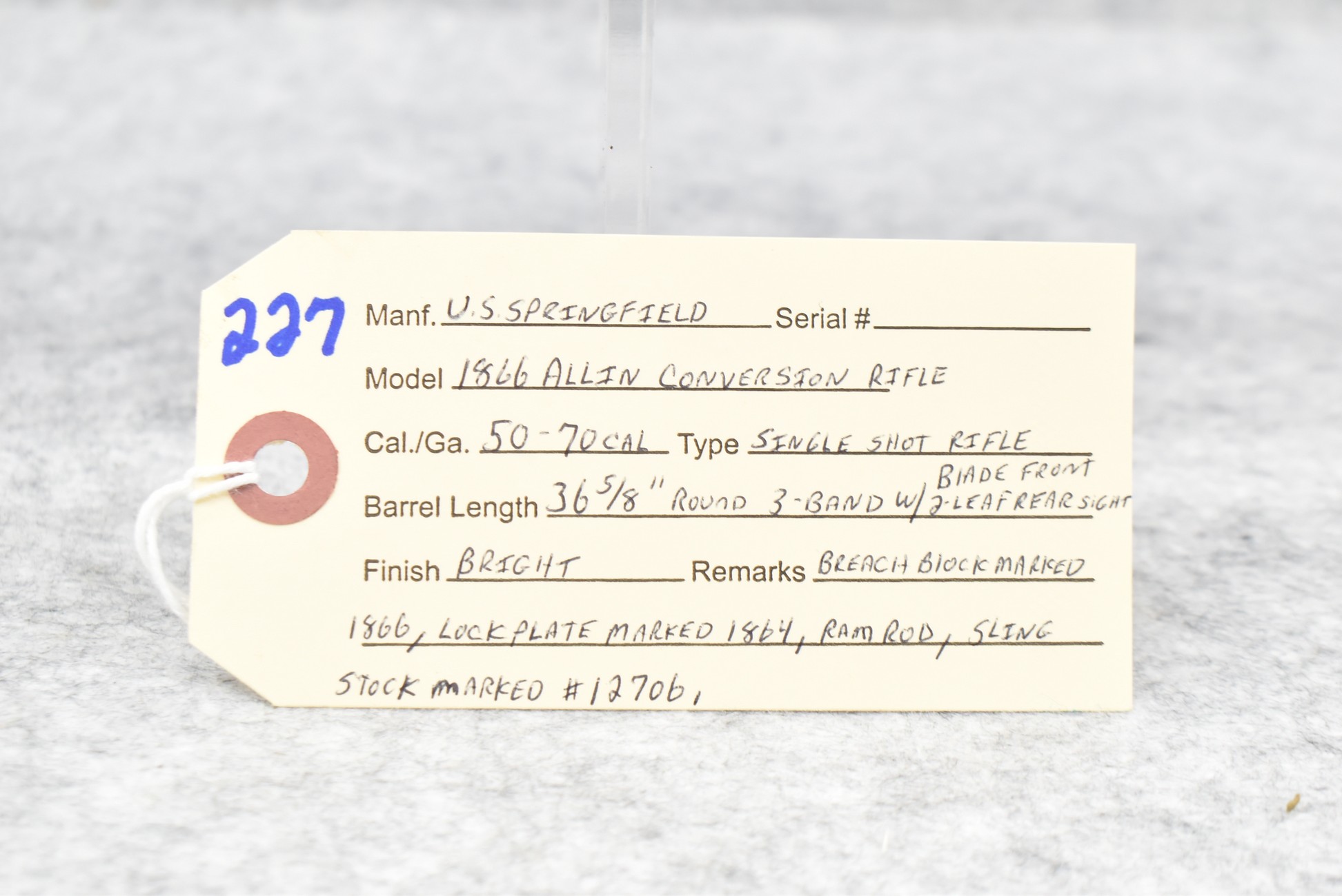 227. U.S. Springfield – Mod. 1866 Allin Conversion Rifle – 50-70 Cal. Single Shot Rifle – w/36 5/8” Round Barrel w/Blade Front & 2-Leaf Rear Sights w/3 Barrel Bands – Bright Finish – w/Wood Stock Marked #12706 – w/Sling – w/Ram Rod – Breech Block Marked 1866 – Lock Plate Dated 1864