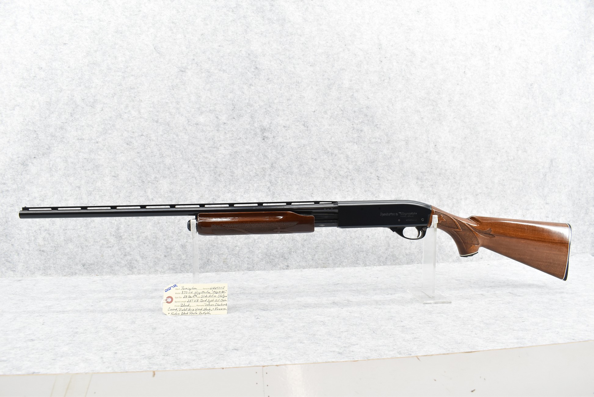 227R. Remington – Mod. 870 LW Wingmaster – 28ga. 2¾” Pump Action Shotgun – w/25” Full Choke Vent Rib Barrel w/Bead Sight – Blued Finish – w/Deluxe Checkered Capped Pistol Grip Wood Stocks w/Factory Butt Plate – Manufactured 10-85