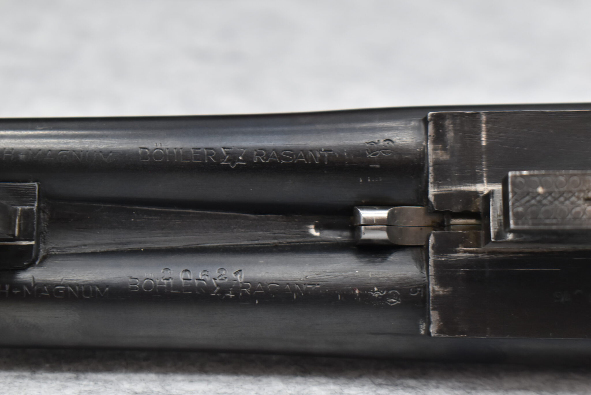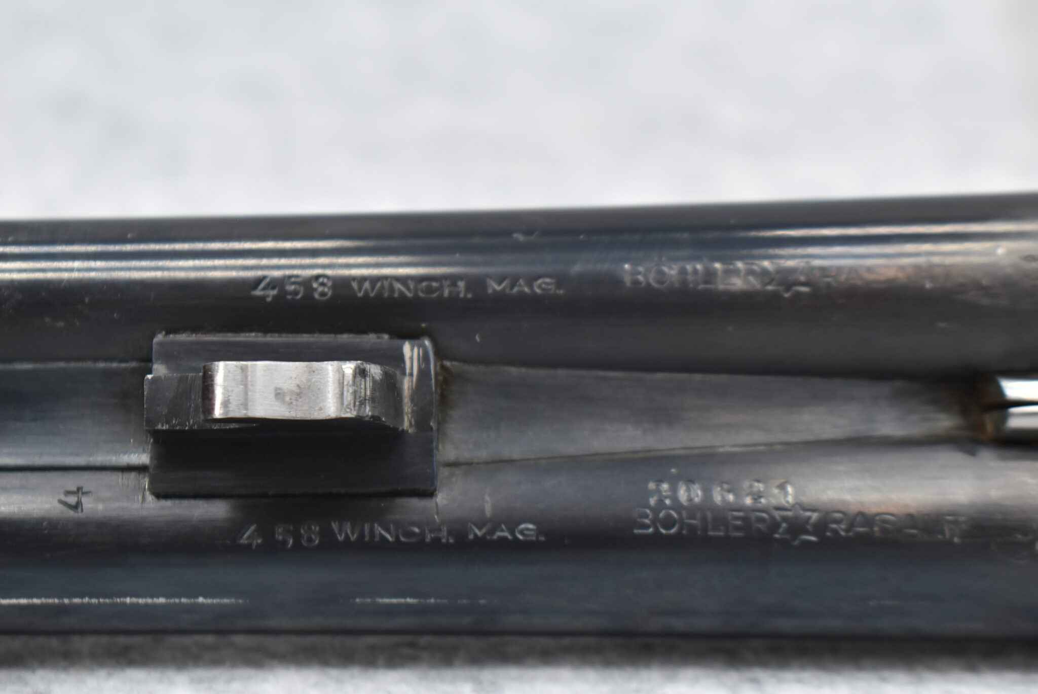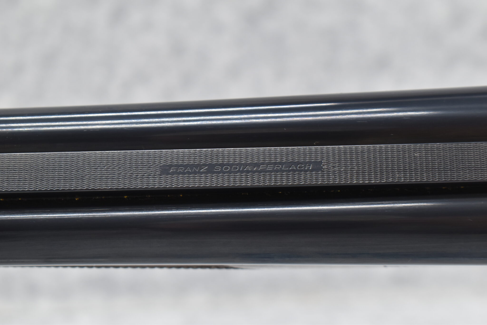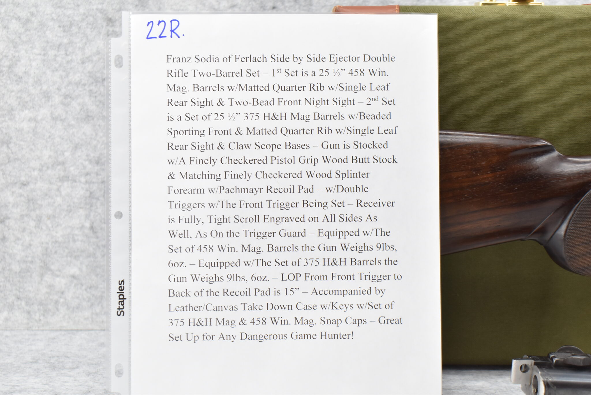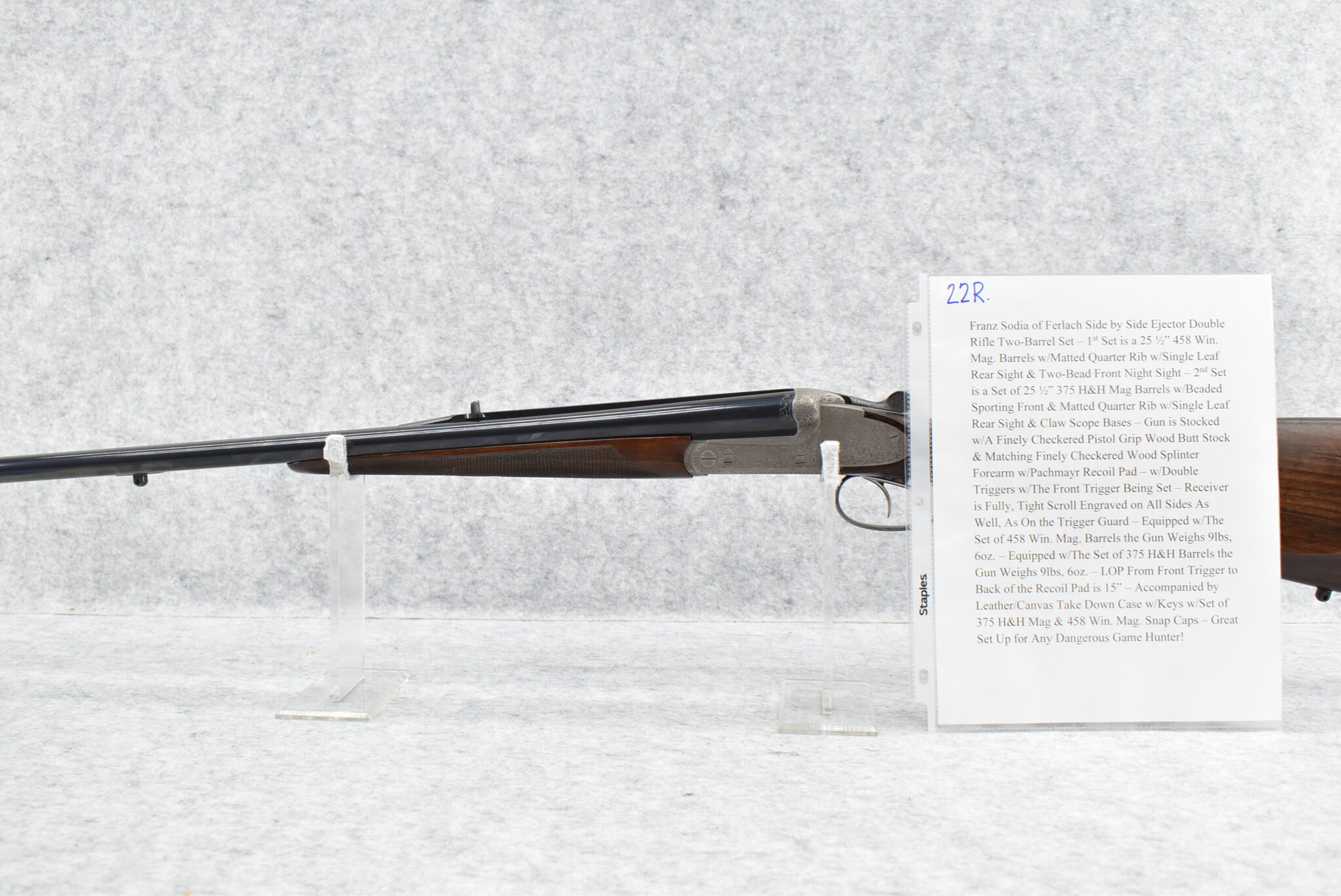 22R. Franz Sodia of Ferlach Side by Side Ejector Double Rifle Two-Barrel Set – 1st Set is a 25 ½” 458 Win. Mag. Barrels w/Matted Quarter Rib w/Single Leaf Rear Sight & Two-Bead Front Night Sight – 2nd Set is a Set of 25 ½” 375 H&H Mag Barrels w/Beaded Sporting Front & Matted Quarter Rib w/Single Leaf Rear Sight & Claw Scope Bases – Gun is Stocked w/A Finely Checkered Pistol Grip Wood Butt Stock & Matching Finely Checkered Wood Splinter Forearm w/Pachmayr Recoil Pad – w/Double Triggers w/The Front Trigger Being Set – Receiver is Fully, Tight Scroll Engraved on All Sides As Well, As On the Trigger Guard – Equipped w/The Set of 458 Win. Mag. Barrels the Gun Weighs 9lbs, 6oz. – Equipped w/The Set of 375 H&H Barrels the Gun Weighs 9lbs, 6oz. – LOP From Front Trigger to Back of the Recoil Pad is 15” – Accompanied by Leather/Canvas Take Down Case w/Keys w/Set of 375 H&H Mag & 458 Win. Mag. Snap Caps – Great Set Up for Any Dangerous Game Hunter!