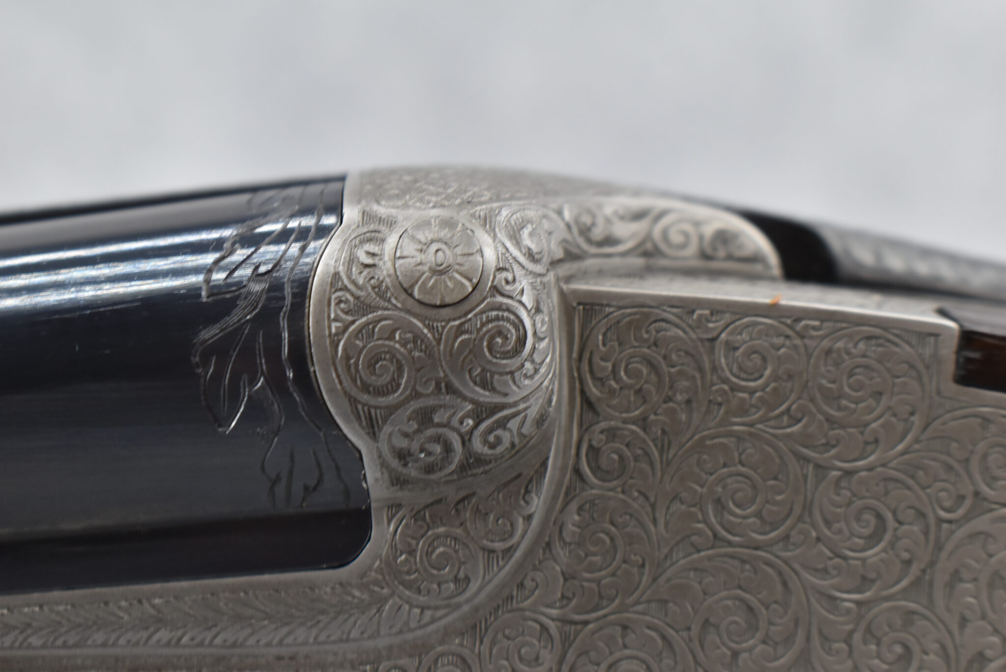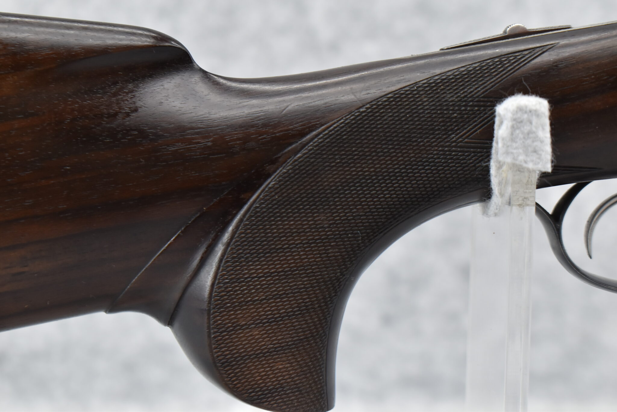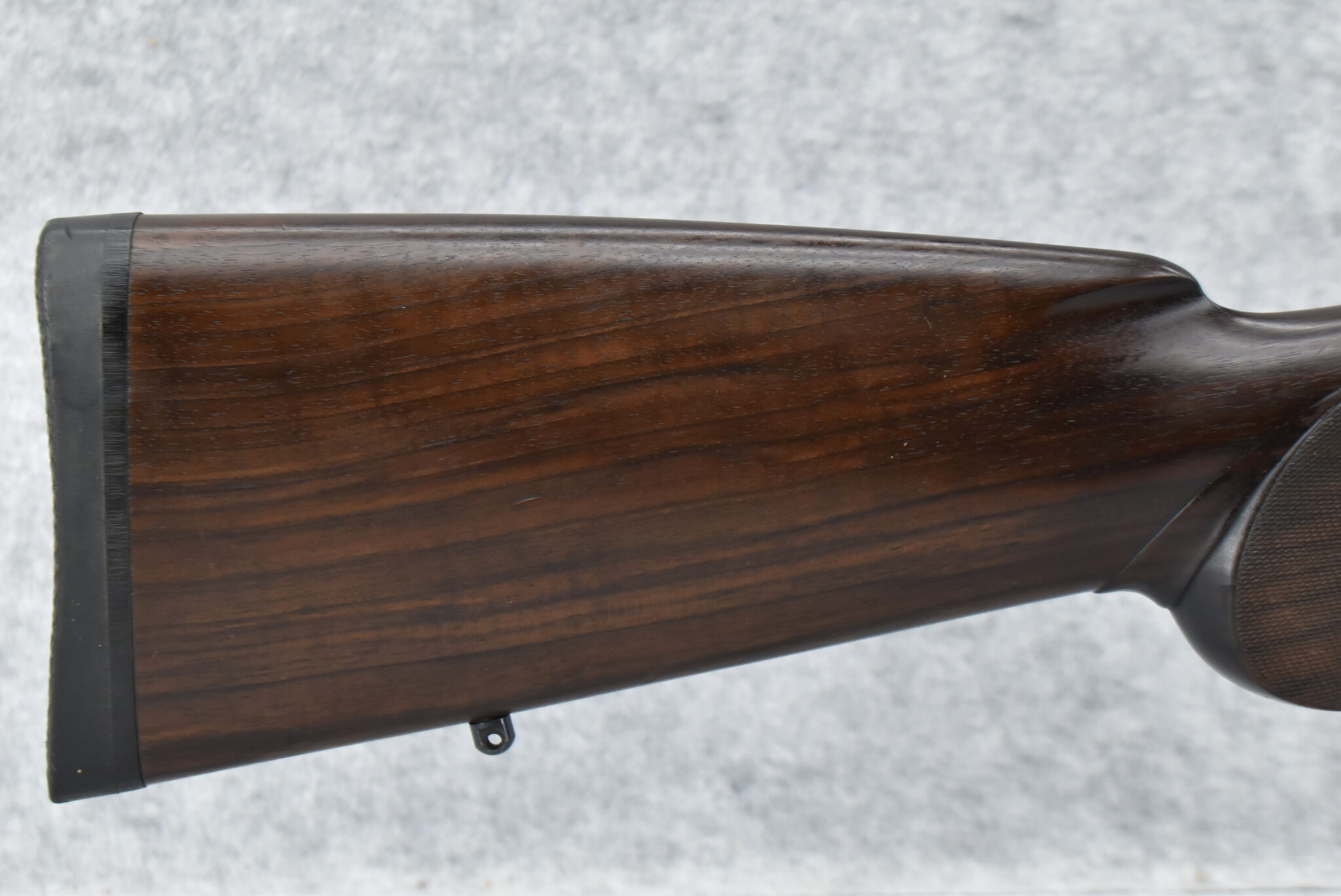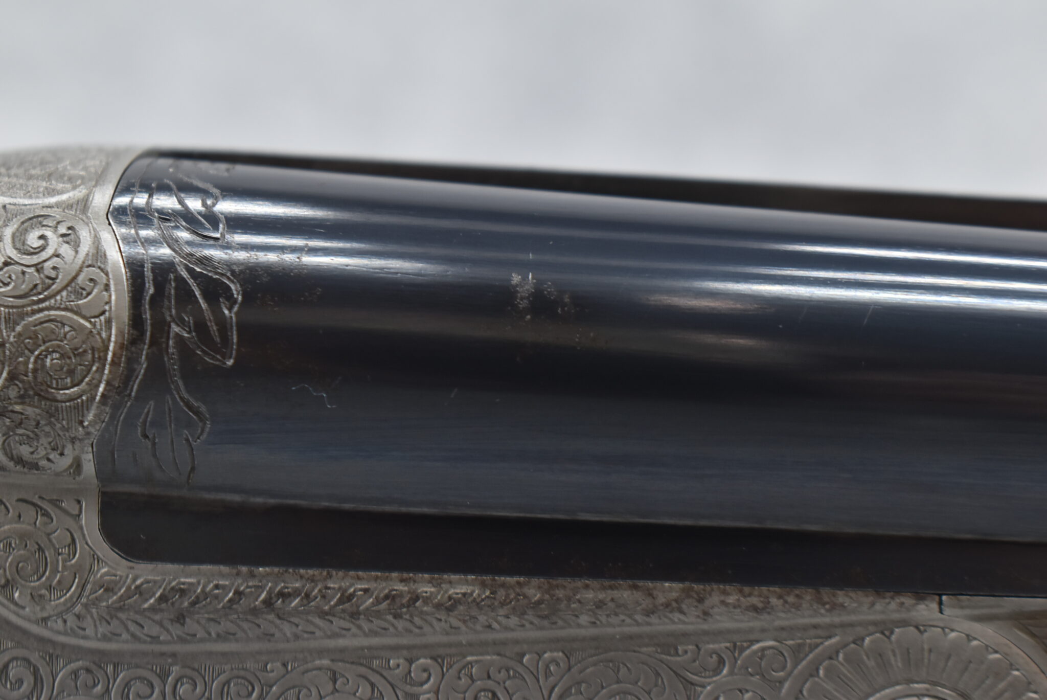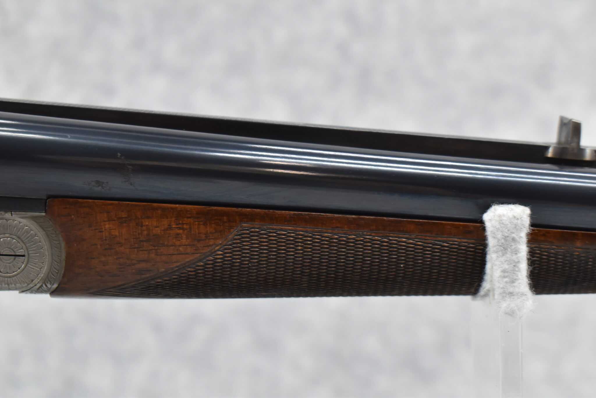 22R. Franz Sodia of Ferlach Side by Side Ejector Double Rifle Two-Barrel Set – 1st Set is a 25 ½” 458 Win. Mag. Barrels w/Matted Quarter Rib w/Single Leaf Rear Sight & Two-Bead Front Night Sight – 2nd Set is a Set of 25 ½” 375 H&H Mag Barrels w/Beaded Sporting Front & Matted Quarter Rib w/Single Leaf Rear Sight & Claw Scope Bases – Gun is Stocked w/A Finely Checkered Pistol Grip Wood Butt Stock & Matching Finely Checkered Wood Splinter Forearm w/Pachmayr Recoil Pad – w/Double Triggers w/The Front Trigger Being Set – Receiver is Fully, Tight Scroll Engraved on All Sides As Well, As On the Trigger Guard – Equipped w/The Set of 458 Win. Mag. Barrels the Gun Weighs 9lbs, 6oz. – Equipped w/The Set of 375 H&H Barrels the Gun Weighs 9lbs, 6oz. – LOP From Front Trigger to Back of the Recoil Pad is 15” – Accompanied by Leather/Canvas Take Down Case w/Keys w/Set of 375 H&H Mag & 458 Win. Mag. Snap Caps – Great Set Up for Any Dangerous Game Hunter!