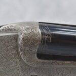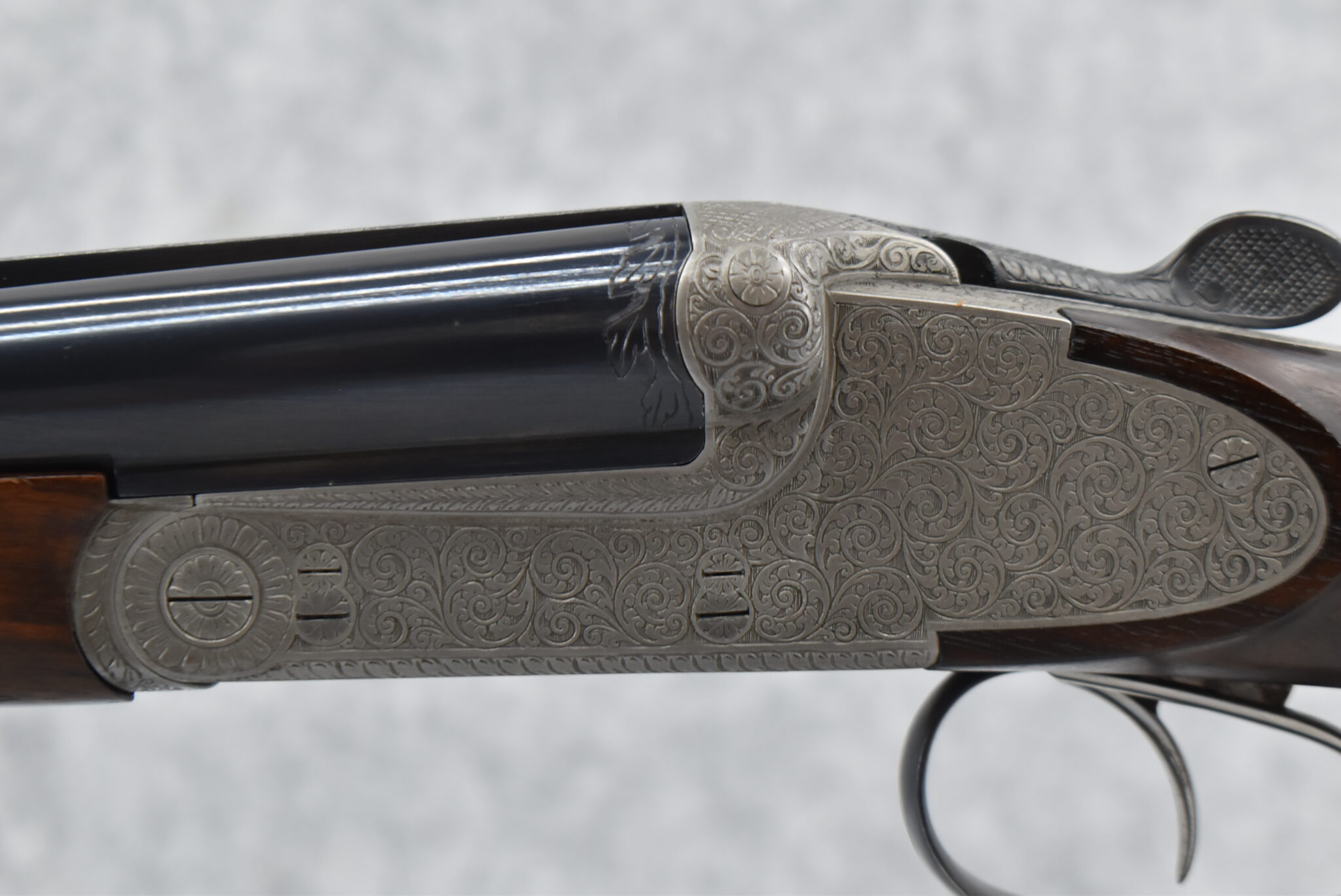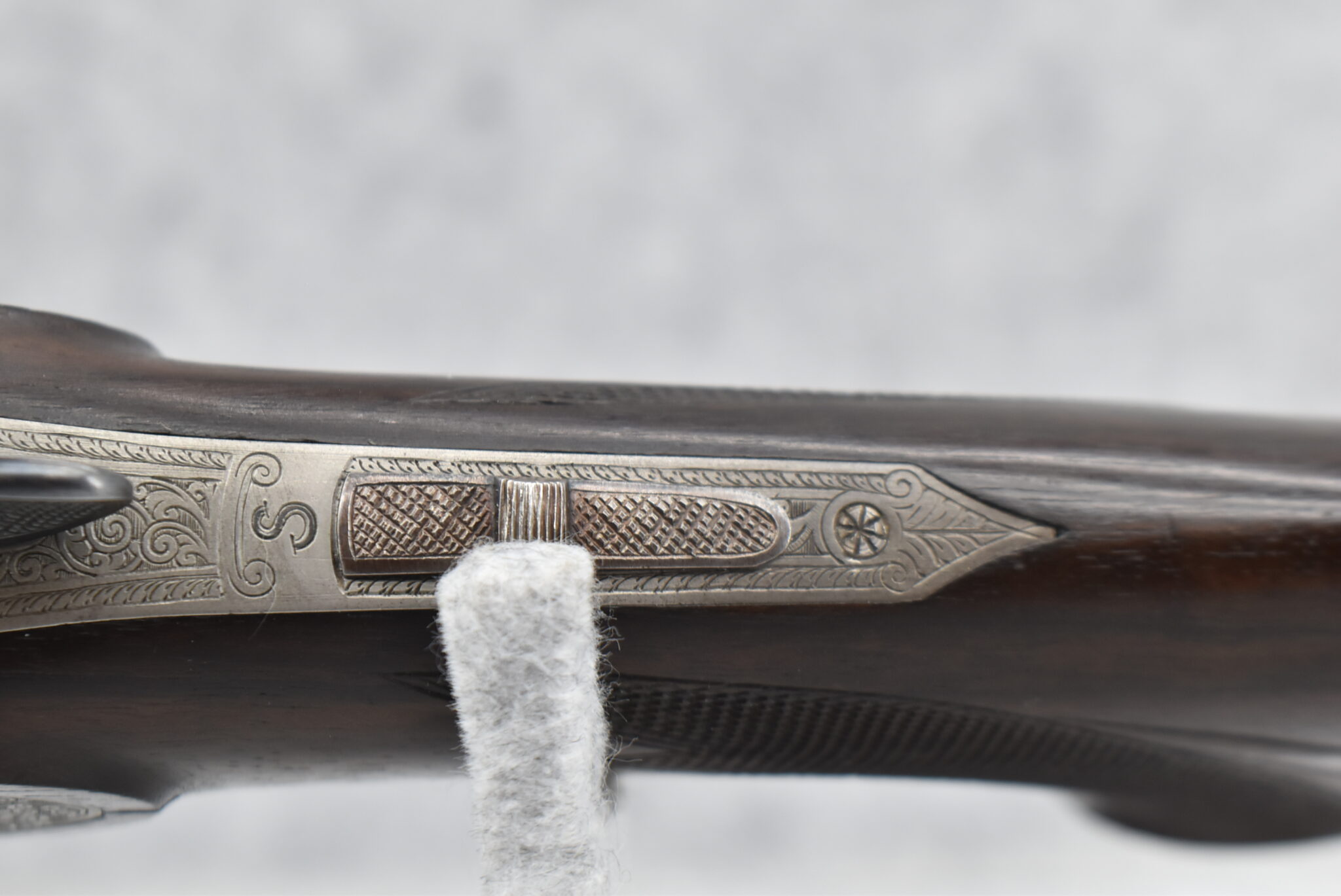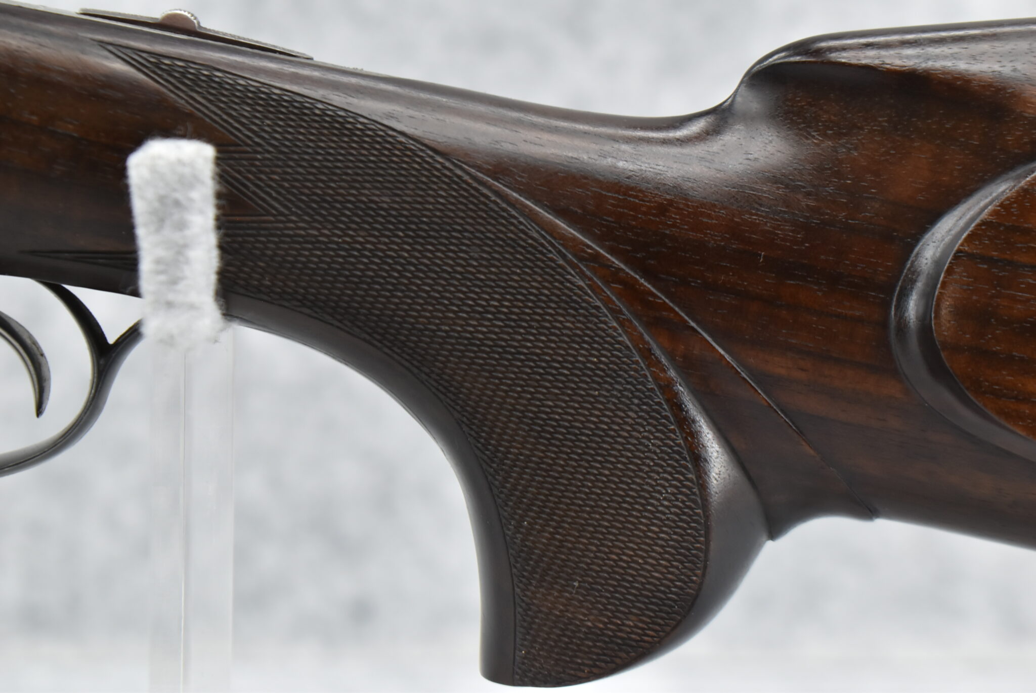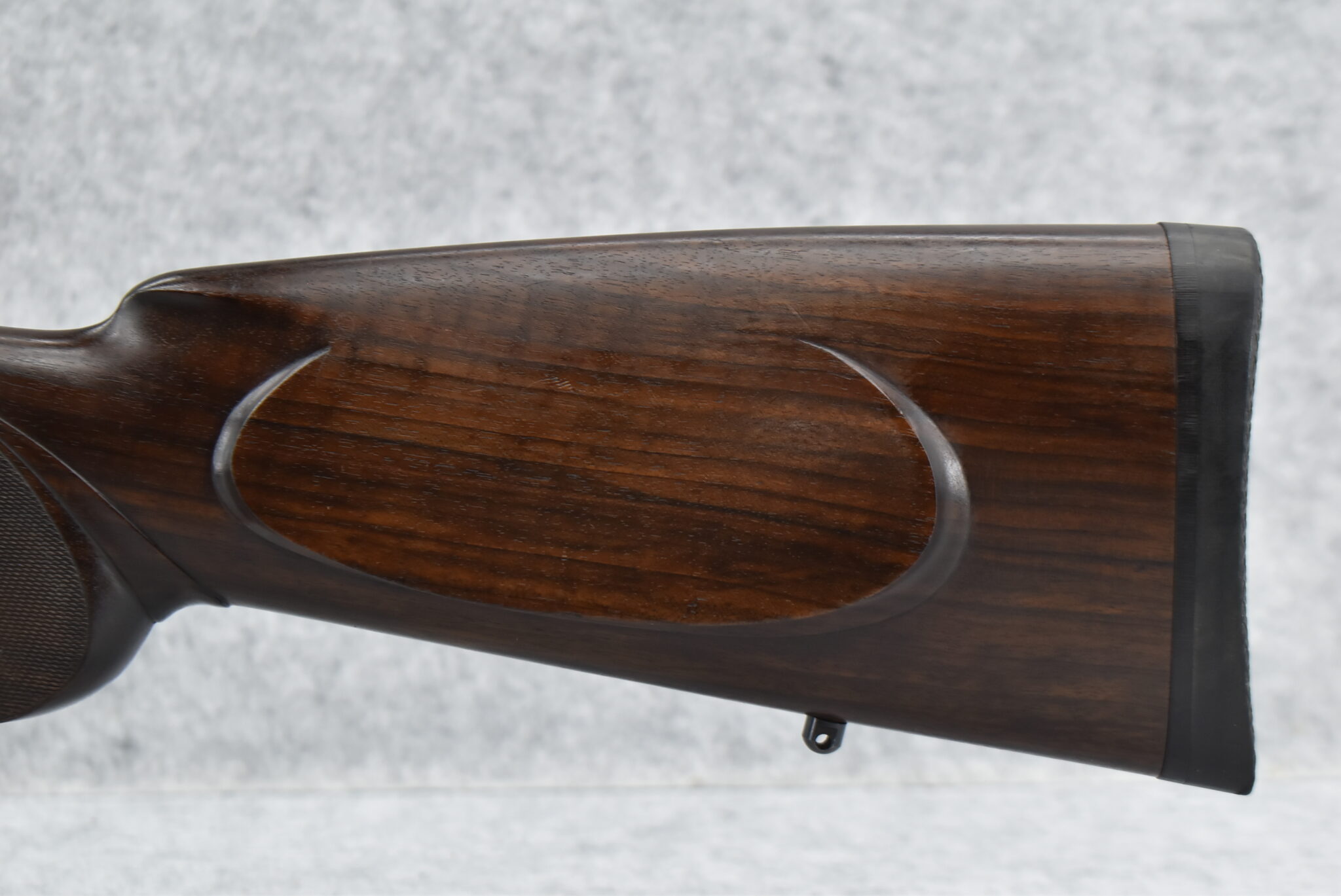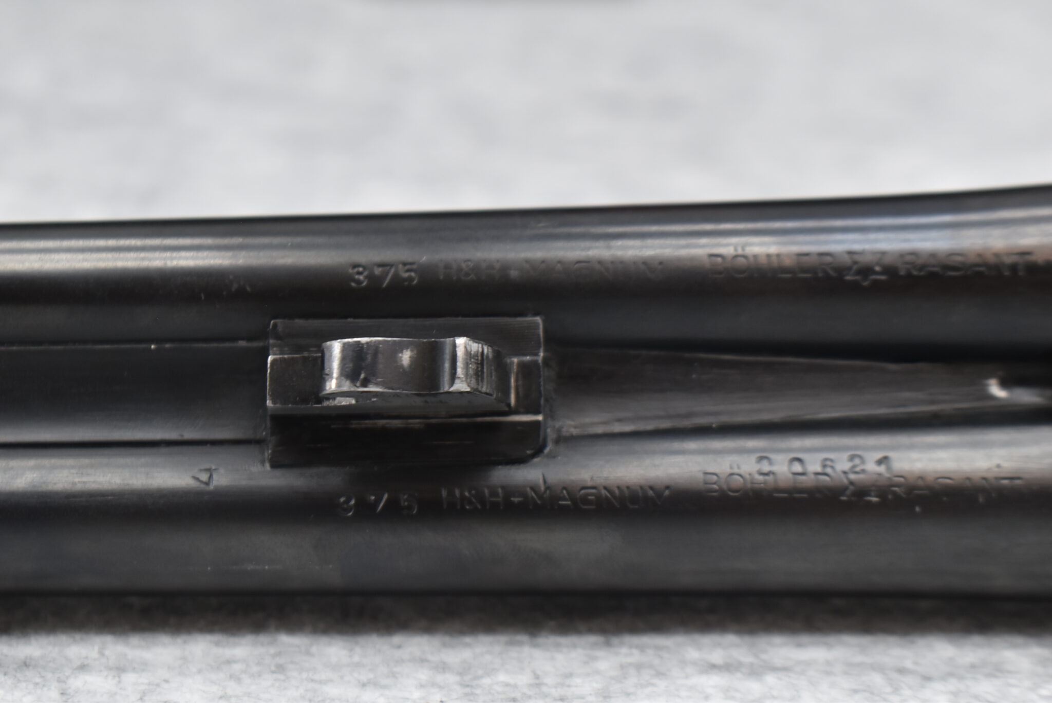 22R. Franz Sodia of Ferlach Side by Side Ejector Double Rifle Two-Barrel Set – 1st Set is a 25 ½” 458 Win. Mag. Barrels w/Matted Quarter Rib w/Single Leaf Rear Sight & Two-Bead Front Night Sight – 2nd Set is a Set of 25 ½” 375 H&H Mag Barrels w/Beaded Sporting Front & Matted Quarter Rib w/Single Leaf Rear Sight & Claw Scope Bases – Gun is Stocked w/A Finely Checkered Pistol Grip Wood Butt Stock & Matching Finely Checkered Wood Splinter Forearm w/Pachmayr Recoil Pad – w/Double Triggers w/The Front Trigger Being Set – Receiver is Fully, Tight Scroll Engraved on All Sides As Well, As On the Trigger Guard – Equipped w/The Set of 458 Win. Mag. Barrels the Gun Weighs 9lbs, 6oz. – Equipped w/The Set of 375 H&H Barrels the Gun Weighs 9lbs, 6oz. – LOP From Front Trigger to Back of the Recoil Pad is 15” – Accompanied by Leather/Canvas Take Down Case w/Keys w/Set of 375 H&H Mag & 458 Win. Mag. Snap Caps – Great Set Up for Any Dangerous Game Hunter!