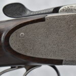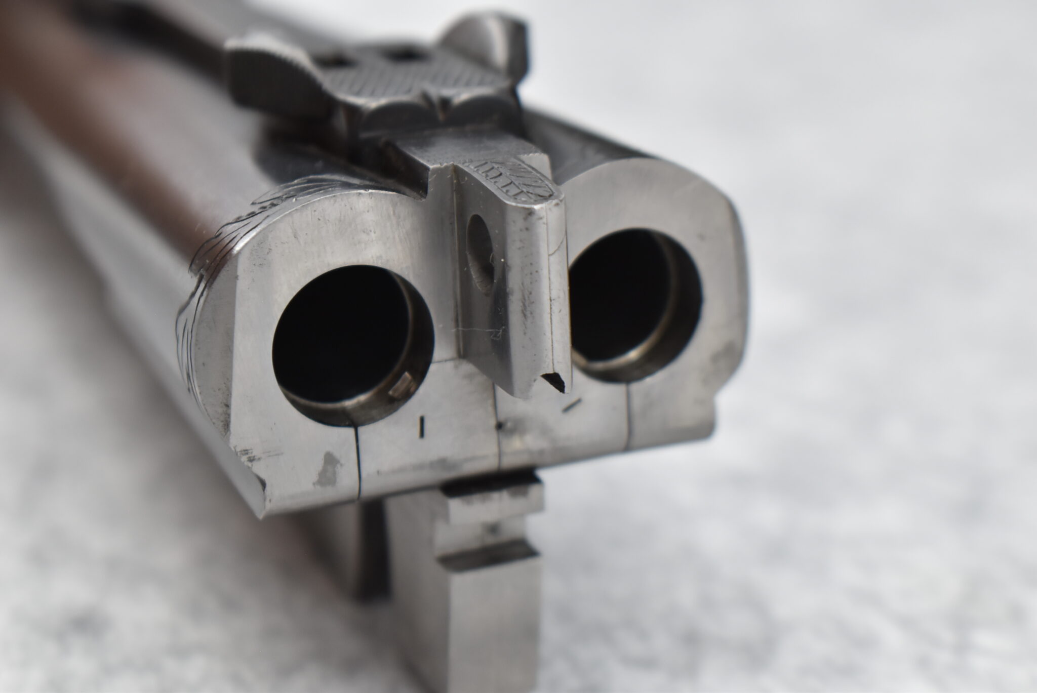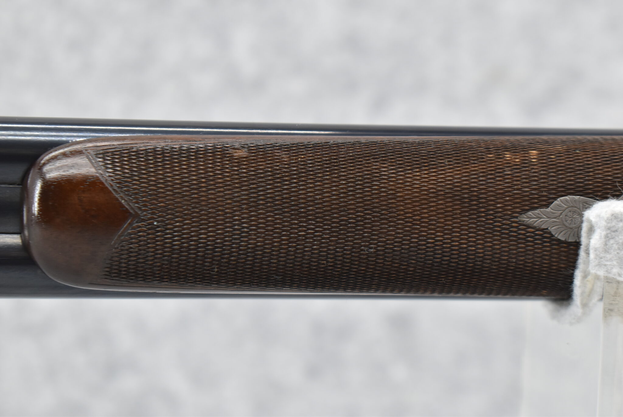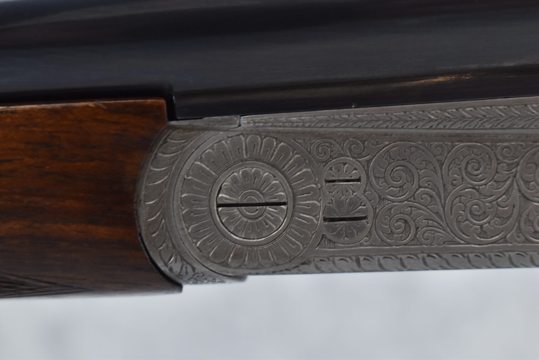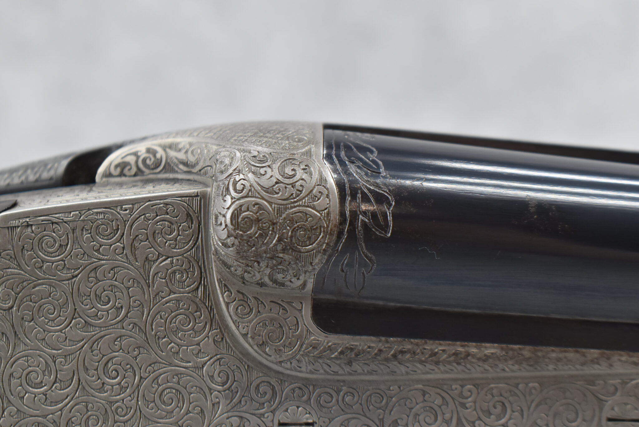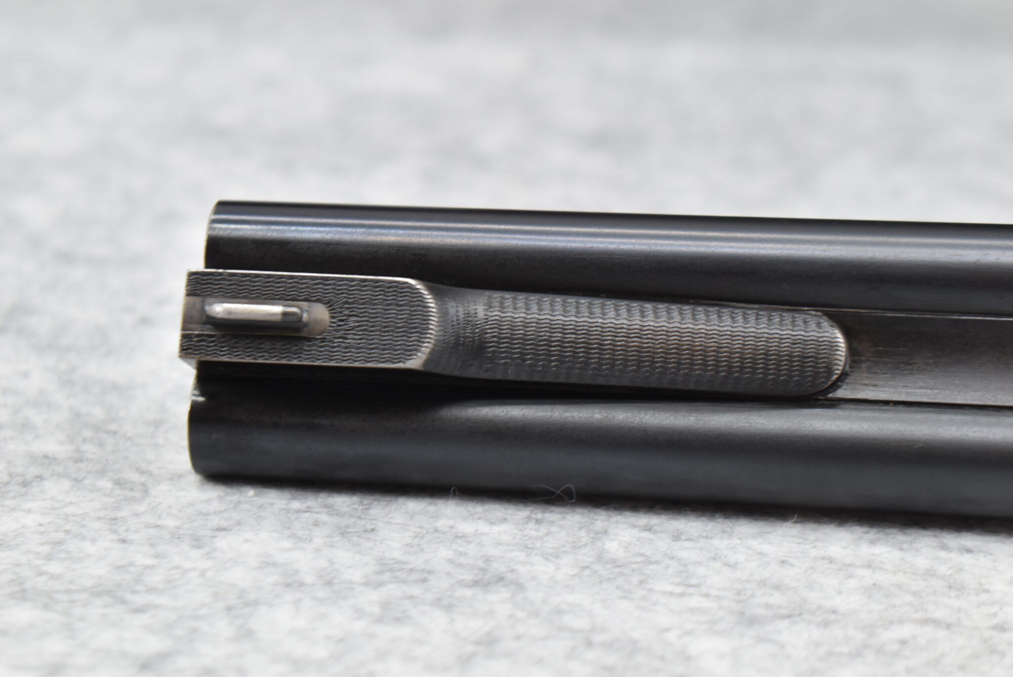 22R. Franz Sodia of Ferlach Side by Side Ejector Double Rifle Two-Barrel Set – 1st Set is a 25 ½” 458 Win. Mag. Barrels w/Matted Quarter Rib w/Single Leaf Rear Sight & Two-Bead Front Night Sight – 2nd Set is a Set of 25 ½” 375 H&H Mag Barrels w/Beaded Sporting Front & Matted Quarter Rib w/Single Leaf Rear Sight & Claw Scope Bases – Gun is Stocked w/A Finely Checkered Pistol Grip Wood Butt Stock & Matching Finely Checkered Wood Splinter Forearm w/Pachmayr Recoil Pad – w/Double Triggers w/The Front Trigger Being Set – Receiver is Fully, Tight Scroll Engraved on All Sides As Well, As On the Trigger Guard – Equipped w/The Set of 458 Win. Mag. Barrels the Gun Weighs 9lbs, 6oz. – Equipped w/The Set of 375 H&H Barrels the Gun Weighs 9lbs, 6oz. – LOP From Front Trigger to Back of the Recoil Pad is 15” – Accompanied by Leather/Canvas Take Down Case w/Keys w/Set of 375 H&H Mag & 458 Win. Mag. Snap Caps – Great Set Up for Any Dangerous Game Hunter!