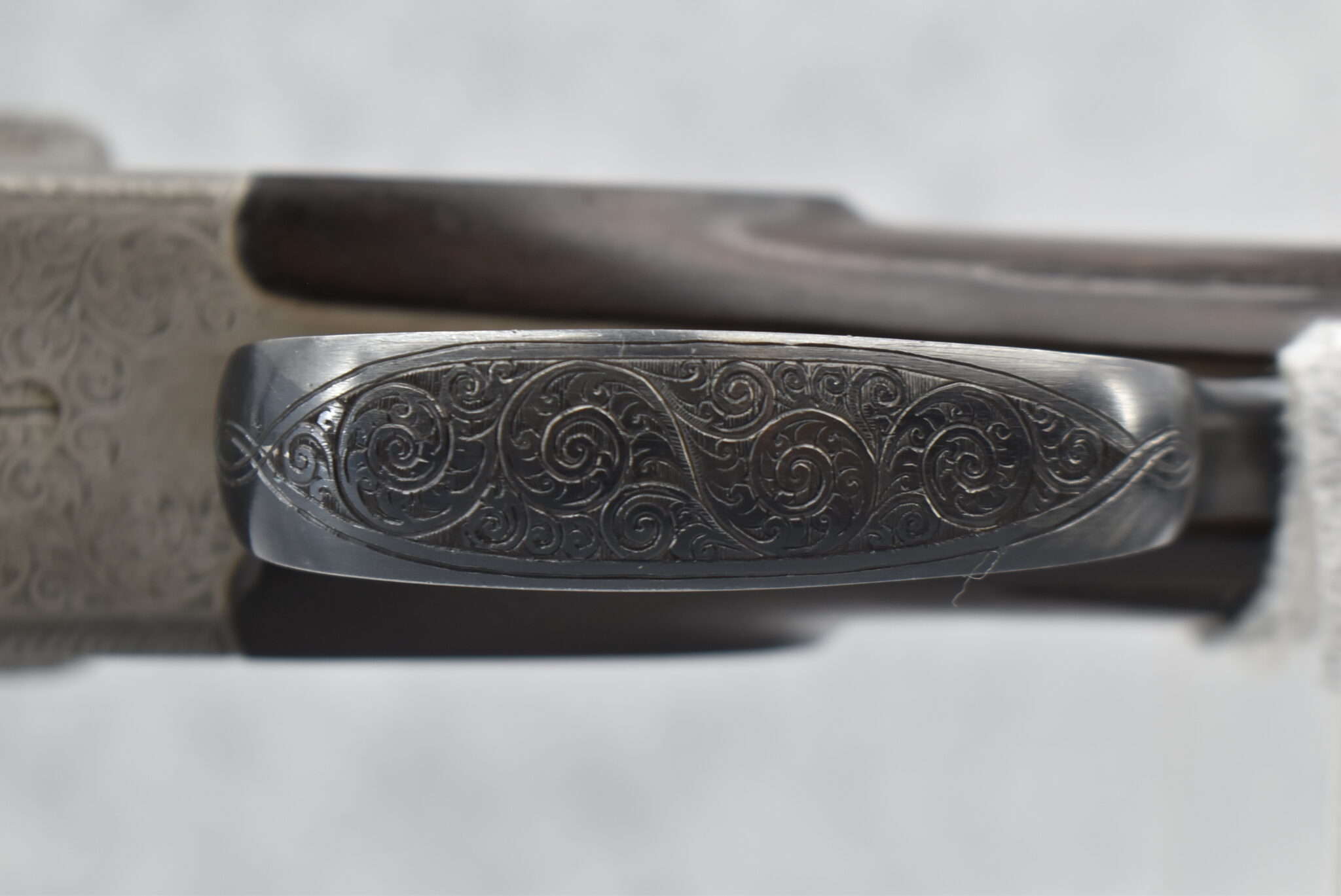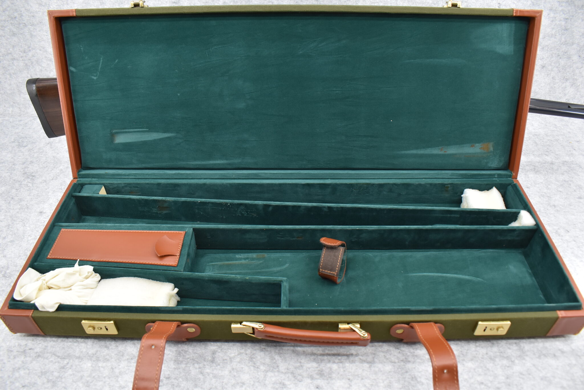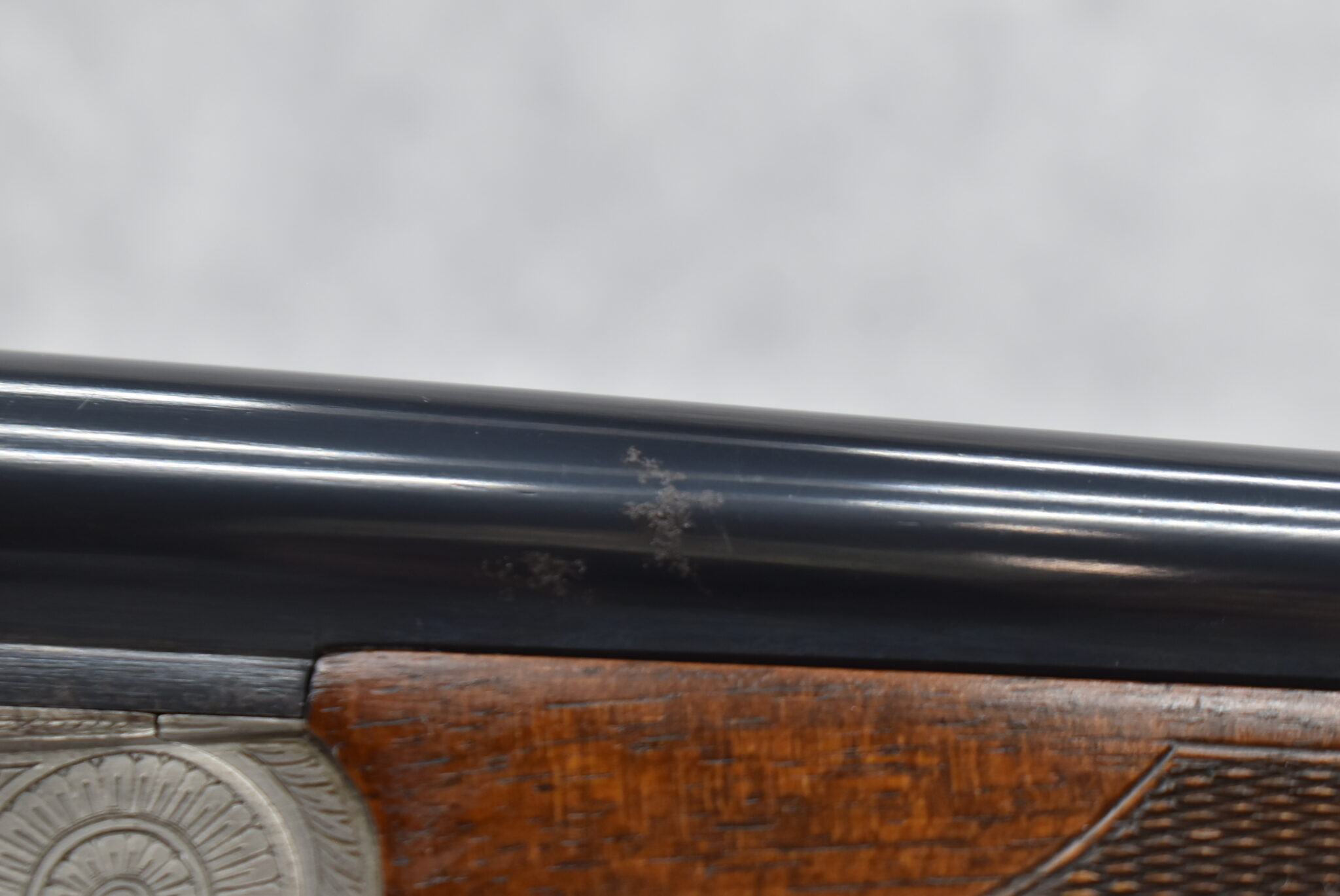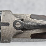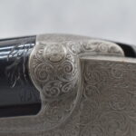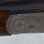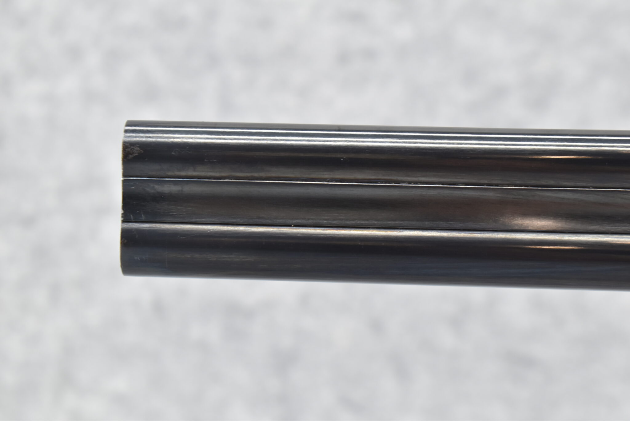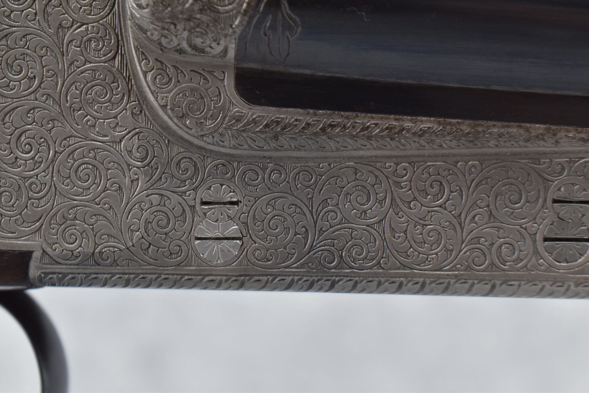 22R. Franz Sodia of Ferlach Side by Side Ejector Double Rifle Two-Barrel Set – 1st Set is a 25 ½” 458 Win. Mag. Barrels w/Matted Quarter Rib w/Single Leaf Rear Sight & Two-Bead Front Night Sight – 2nd Set is a Set of 25 ½” 375 H&H Mag Barrels w/Beaded Sporting Front & Matted Quarter Rib w/Single Leaf Rear Sight & Claw Scope Bases – Gun is Stocked w/A Finely Checkered Pistol Grip Wood Butt Stock & Matching Finely Checkered Wood Splinter Forearm w/Pachmayr Recoil Pad – w/Double Triggers w/The Front Trigger Being Set – Receiver is Fully, Tight Scroll Engraved on All Sides As Well, As On the Trigger Guard – Equipped w/The Set of 458 Win. Mag. Barrels the Gun Weighs 9lbs, 6oz. – Equipped w/The Set of 375 H&H Barrels the Gun Weighs 9lbs, 6oz. – LOP From Front Trigger to Back of the Recoil Pad is 15” – Accompanied by Leather/Canvas Take Down Case w/Keys w/Set of 375 H&H Mag & 458 Win. Mag. Snap Caps – Great Set Up for Any Dangerous Game Hunter!