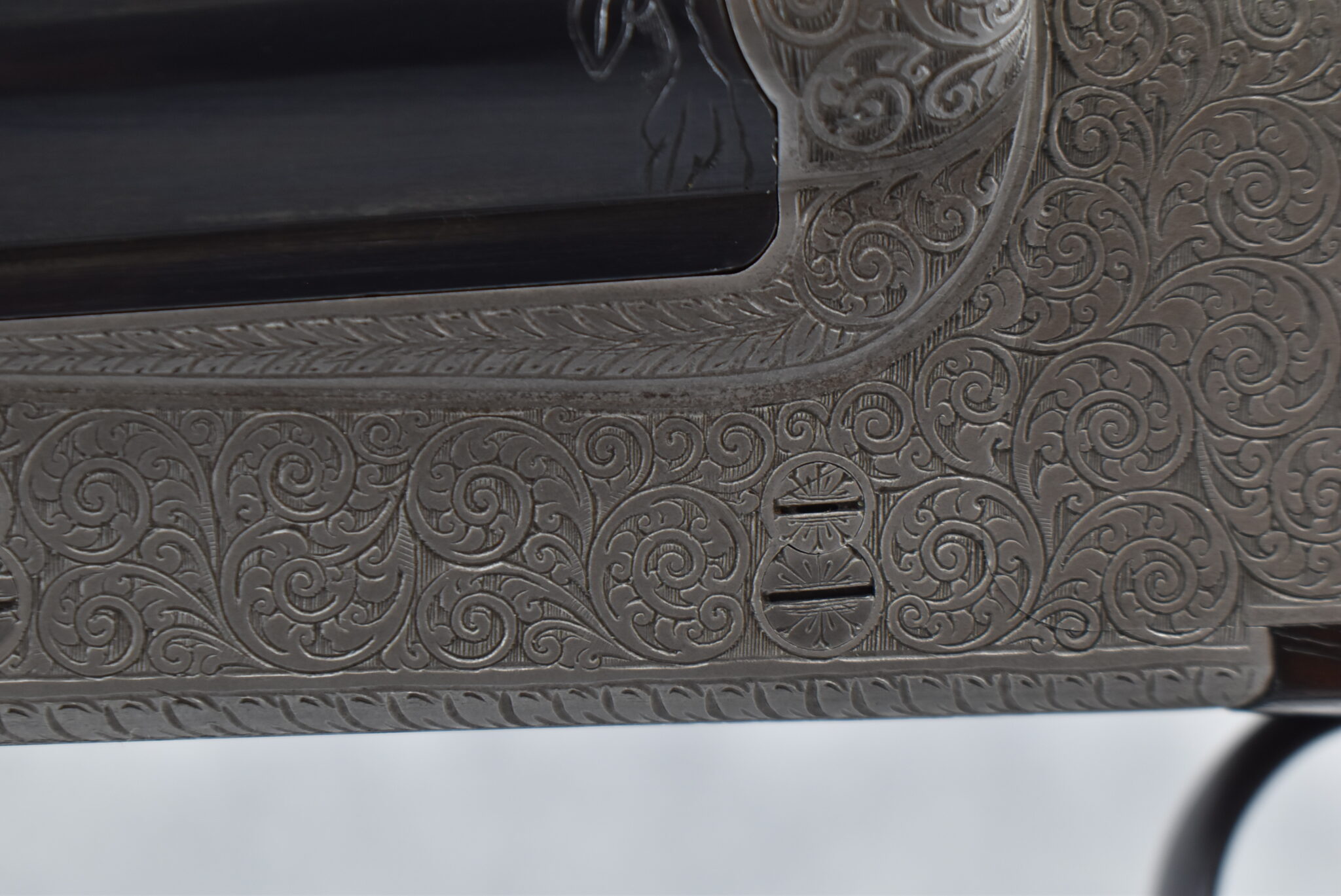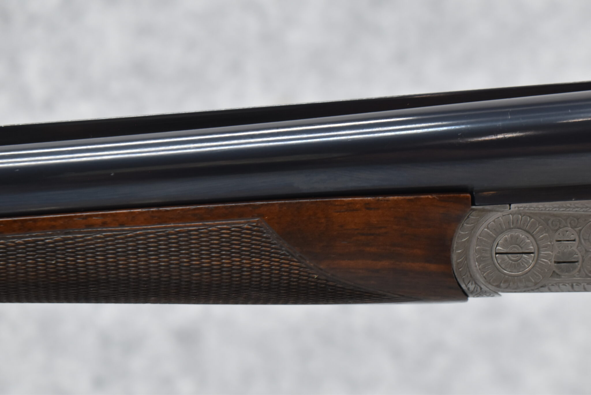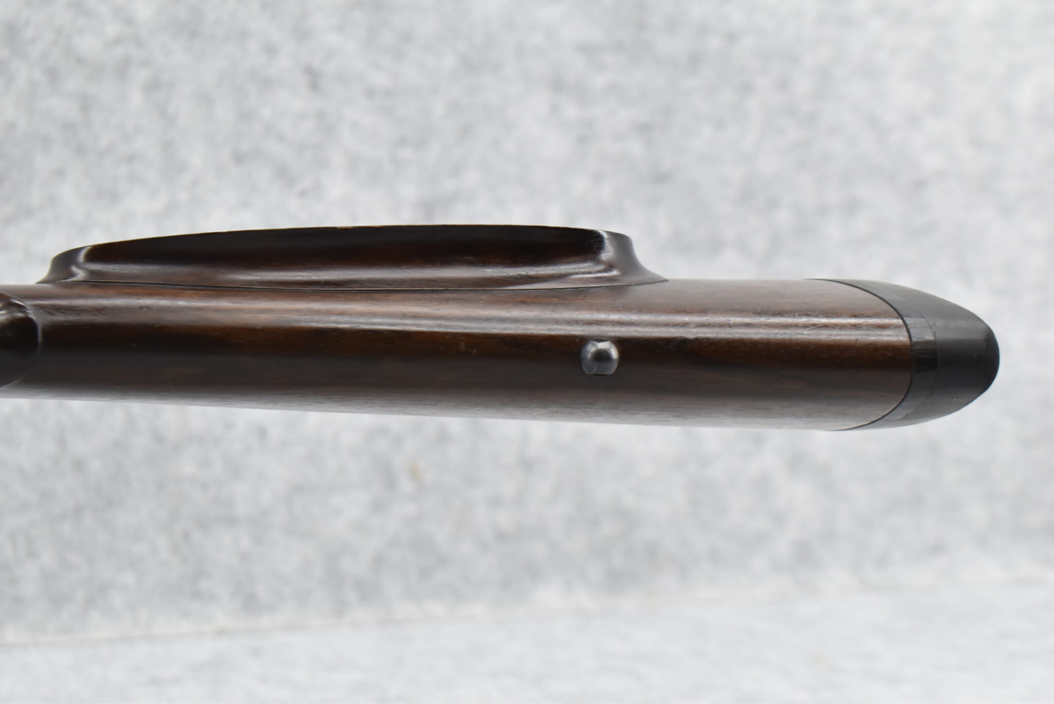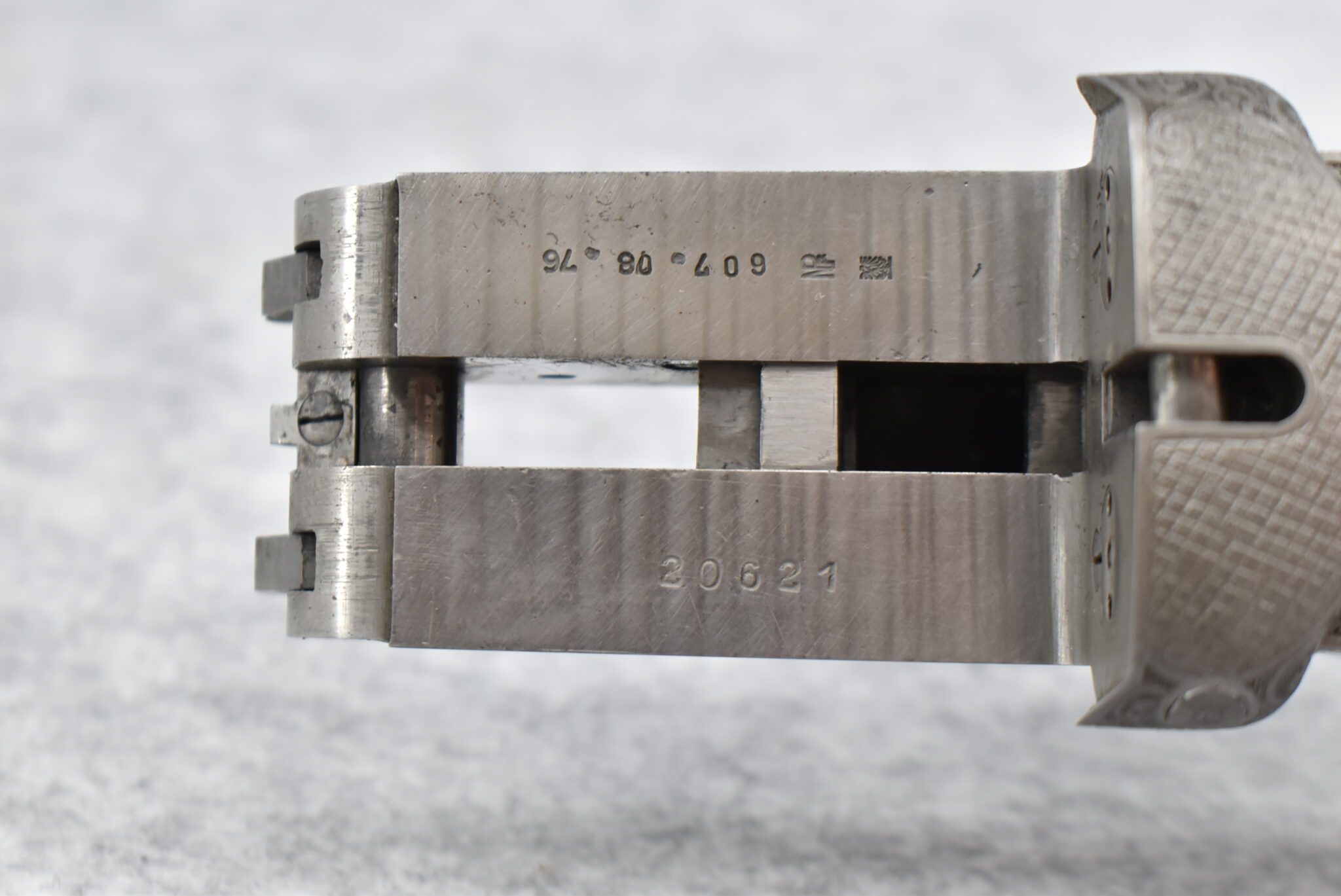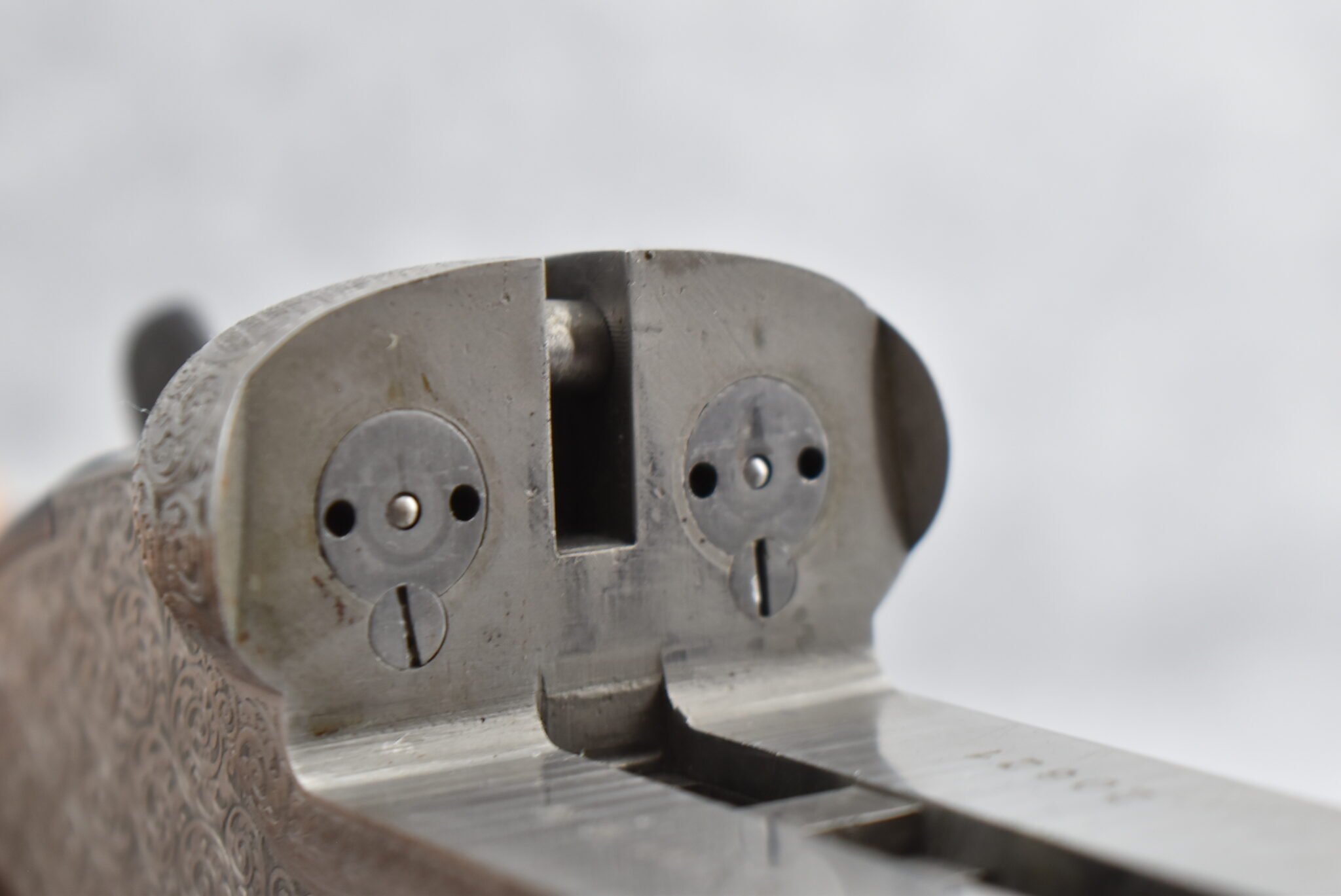 22R. Franz Sodia of Ferlach Side by Side Ejector Double Rifle Two-Barrel Set – 1st Set is a 25 ½” 458 Win. Mag. Barrels w/Matted Quarter Rib w/Single Leaf Rear Sight & Two-Bead Front Night Sight – 2nd Set is a Set of 25 ½” 375 H&H Mag Barrels w/Beaded Sporting Front & Matted Quarter Rib w/Single Leaf Rear Sight & Claw Scope Bases – Gun is Stocked w/A Finely Checkered Pistol Grip Wood Butt Stock & Matching Finely Checkered Wood Splinter Forearm w/Pachmayr Recoil Pad – w/Double Triggers w/The Front Trigger Being Set – Receiver is Fully, Tight Scroll Engraved on All Sides As Well, As On the Trigger Guard – Equipped w/The Set of 458 Win. Mag. Barrels the Gun Weighs 9lbs, 6oz. – Equipped w/The Set of 375 H&H Barrels the Gun Weighs 9lbs, 6oz. – LOP From Front Trigger to Back of the Recoil Pad is 15” – Accompanied by Leather/Canvas Take Down Case w/Keys w/Set of 375 H&H Mag & 458 Win. Mag. Snap Caps – Great Set Up for Any Dangerous Game Hunter!