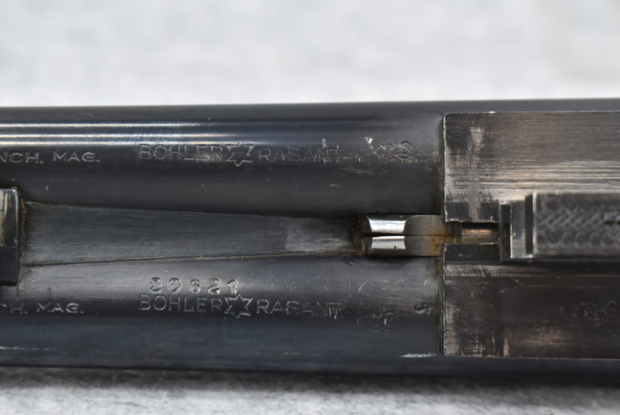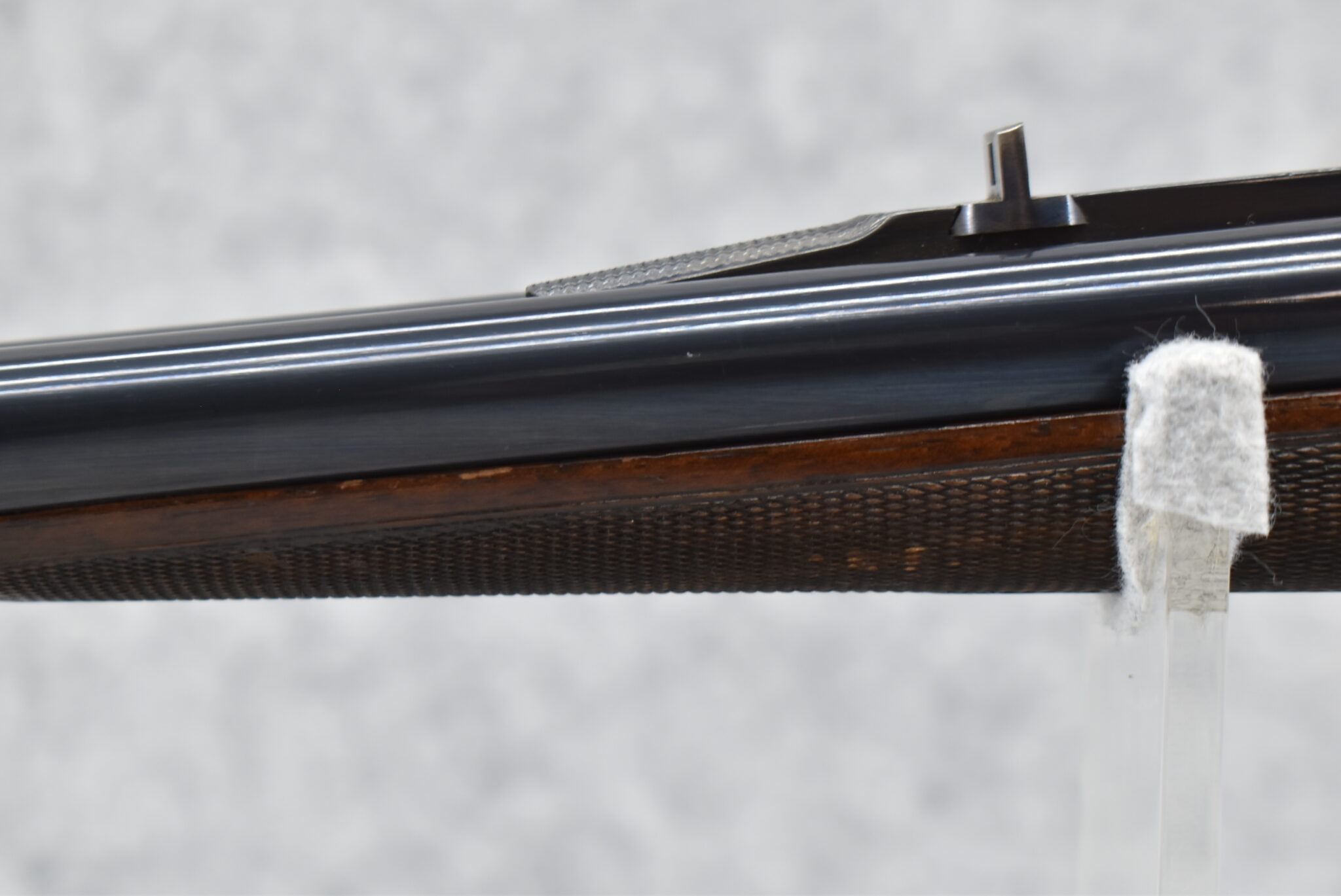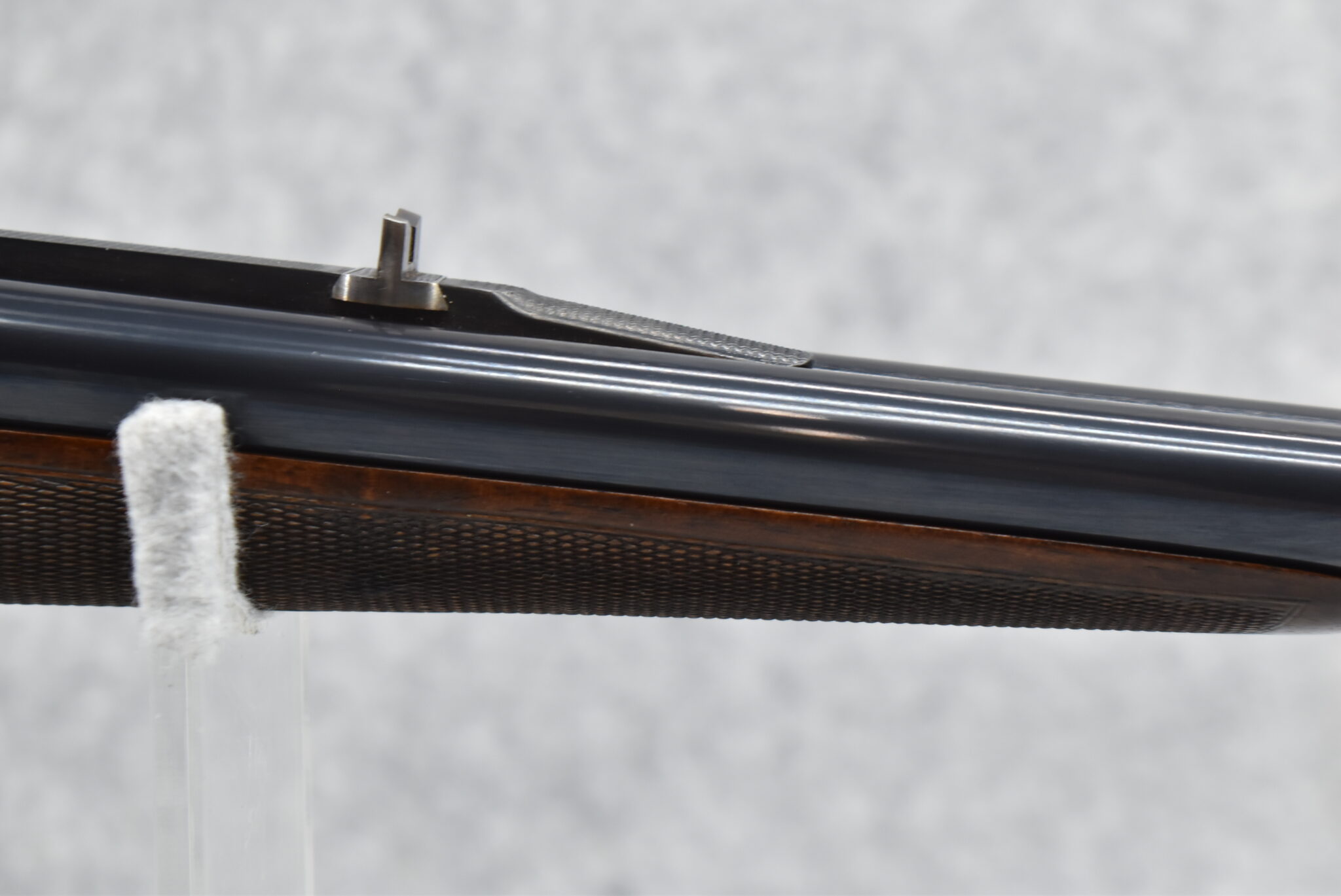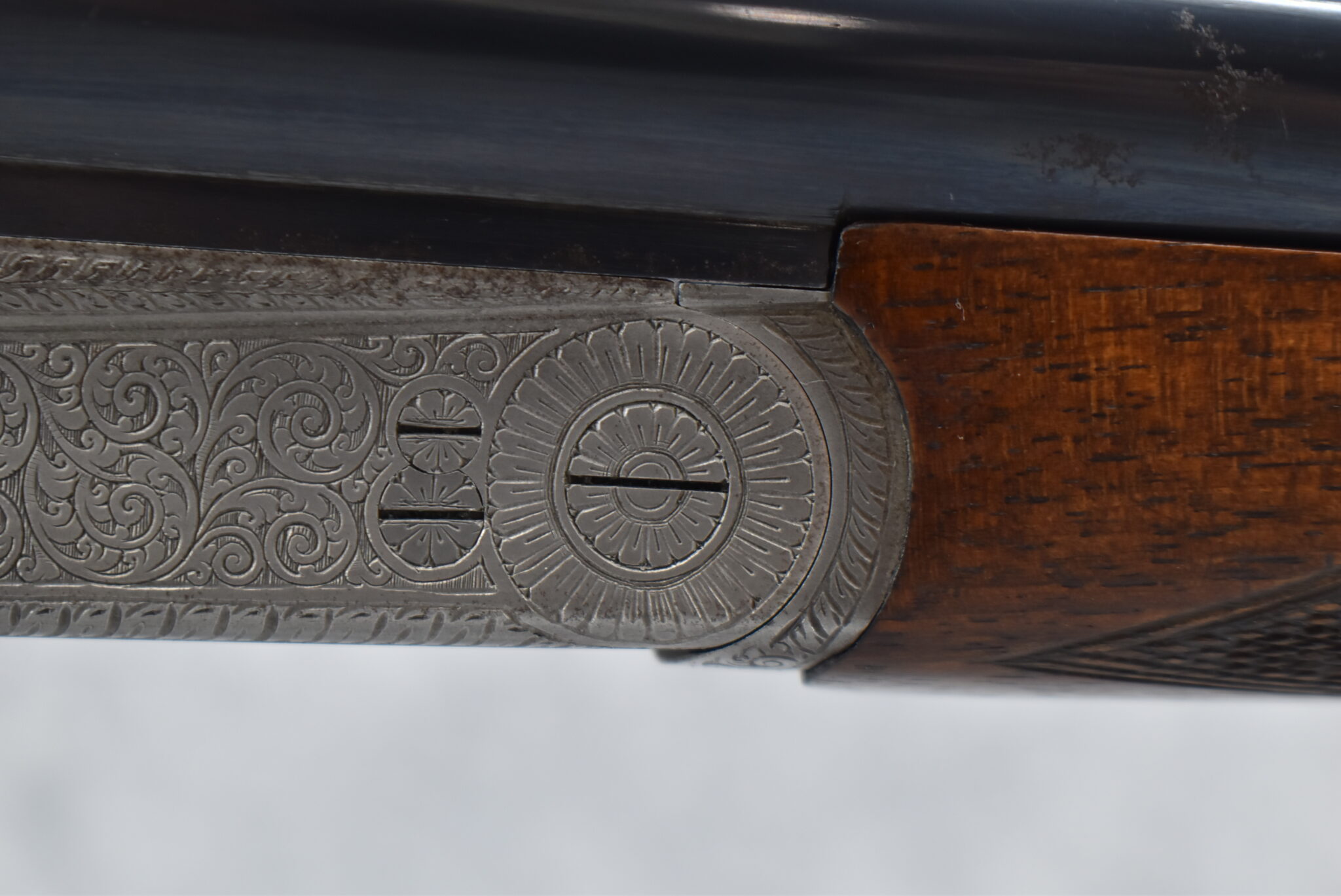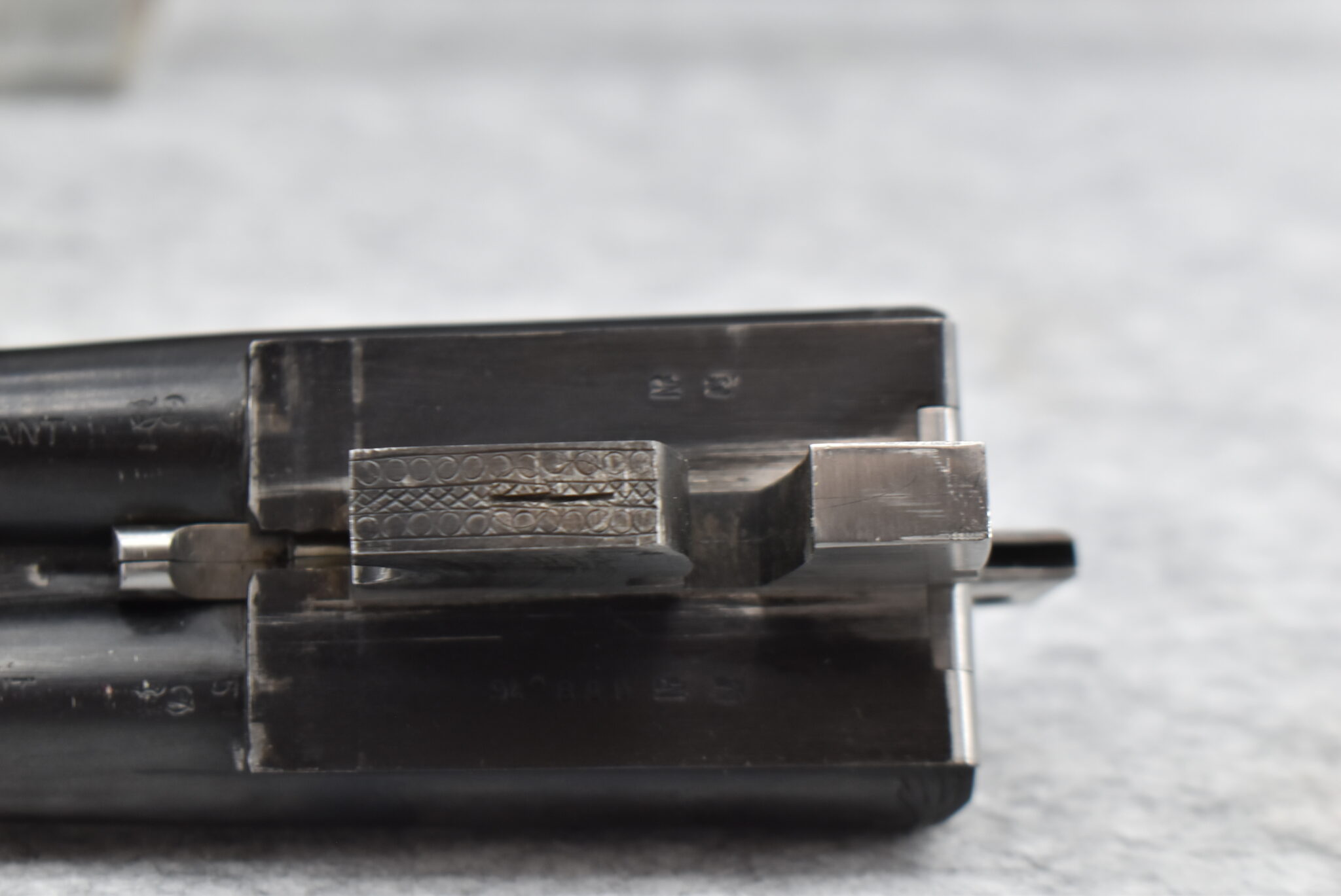 22R. Franz Sodia of Ferlach Side by Side Ejector Double Rifle Two-Barrel Set – 1st Set is a 25 ½” 458 Win. Mag. Barrels w/Matted Quarter Rib w/Single Leaf Rear Sight & Two-Bead Front Night Sight – 2nd Set is a Set of 25 ½” 375 H&H Mag Barrels w/Beaded Sporting Front & Matted Quarter Rib w/Single Leaf Rear Sight & Claw Scope Bases – Gun is Stocked w/A Finely Checkered Pistol Grip Wood Butt Stock & Matching Finely Checkered Wood Splinter Forearm w/Pachmayr Recoil Pad – w/Double Triggers w/The Front Trigger Being Set – Receiver is Fully, Tight Scroll Engraved on All Sides As Well, As On the Trigger Guard – Equipped w/The Set of 458 Win. Mag. Barrels the Gun Weighs 9lbs, 6oz. – Equipped w/The Set of 375 H&H Barrels the Gun Weighs 9lbs, 6oz. – LOP From Front Trigger to Back of the Recoil Pad is 15” – Accompanied by Leather/Canvas Take Down Case w/Keys w/Set of 375 H&H Mag & 458 Win. Mag. Snap Caps – Great Set Up for Any Dangerous Game Hunter!