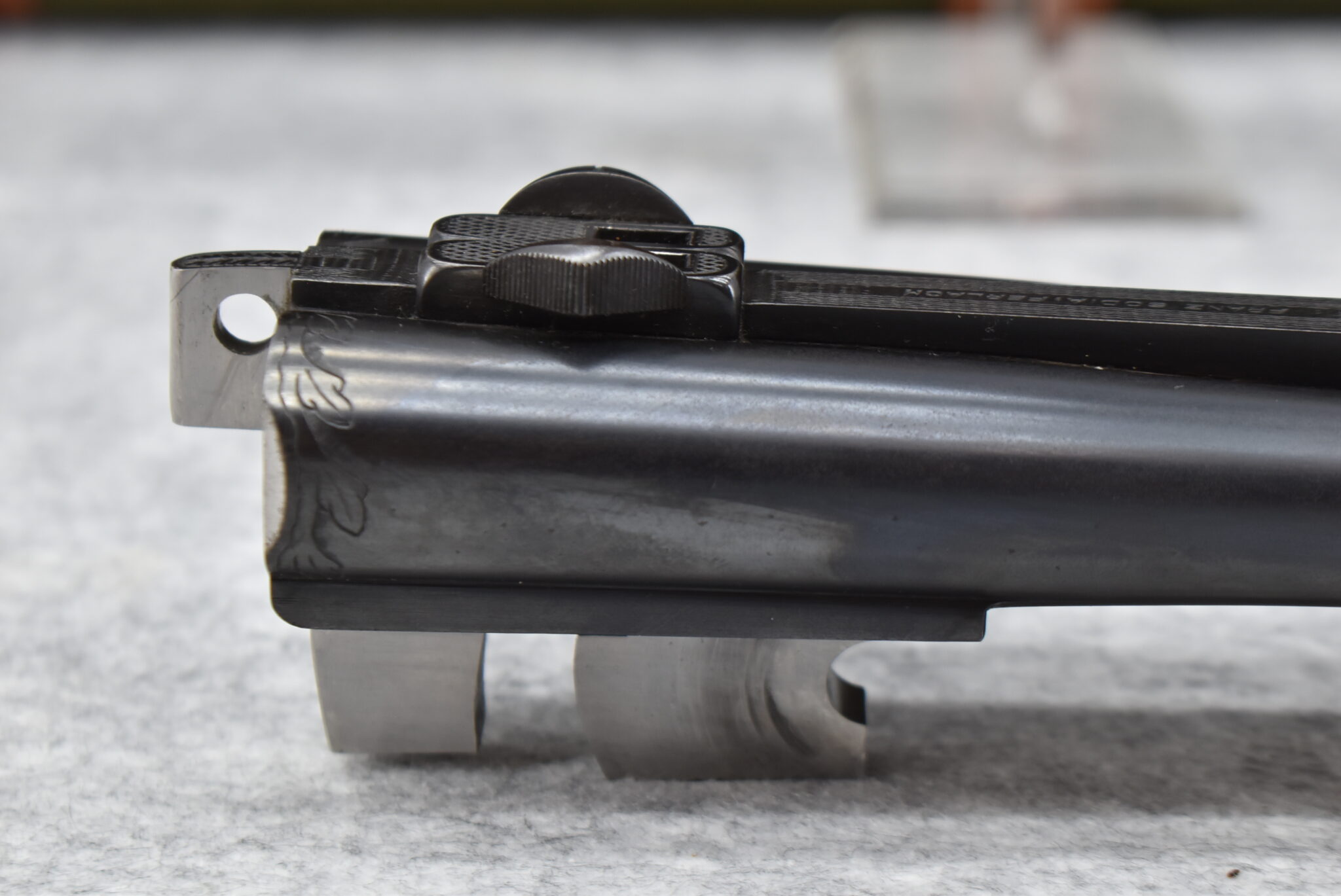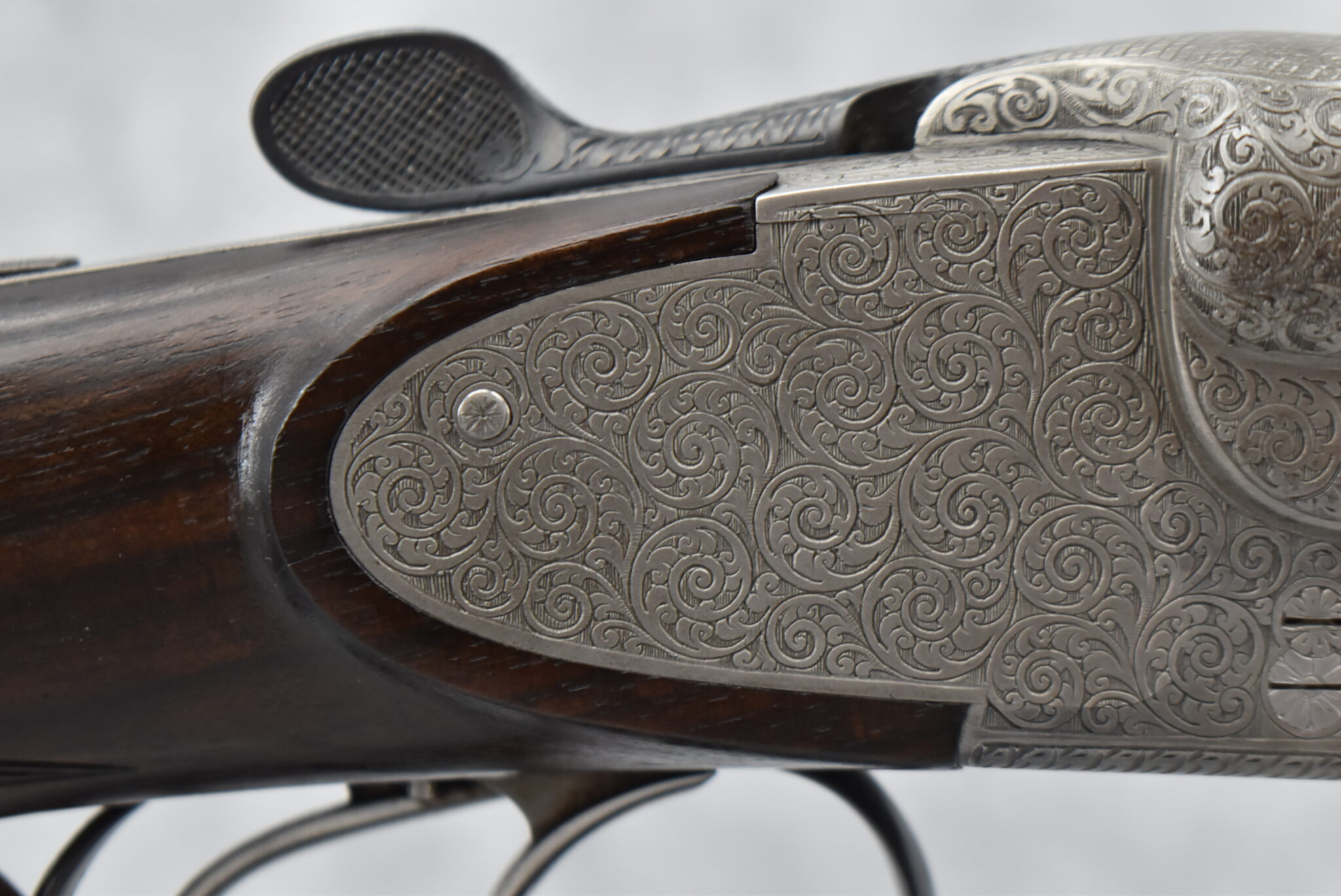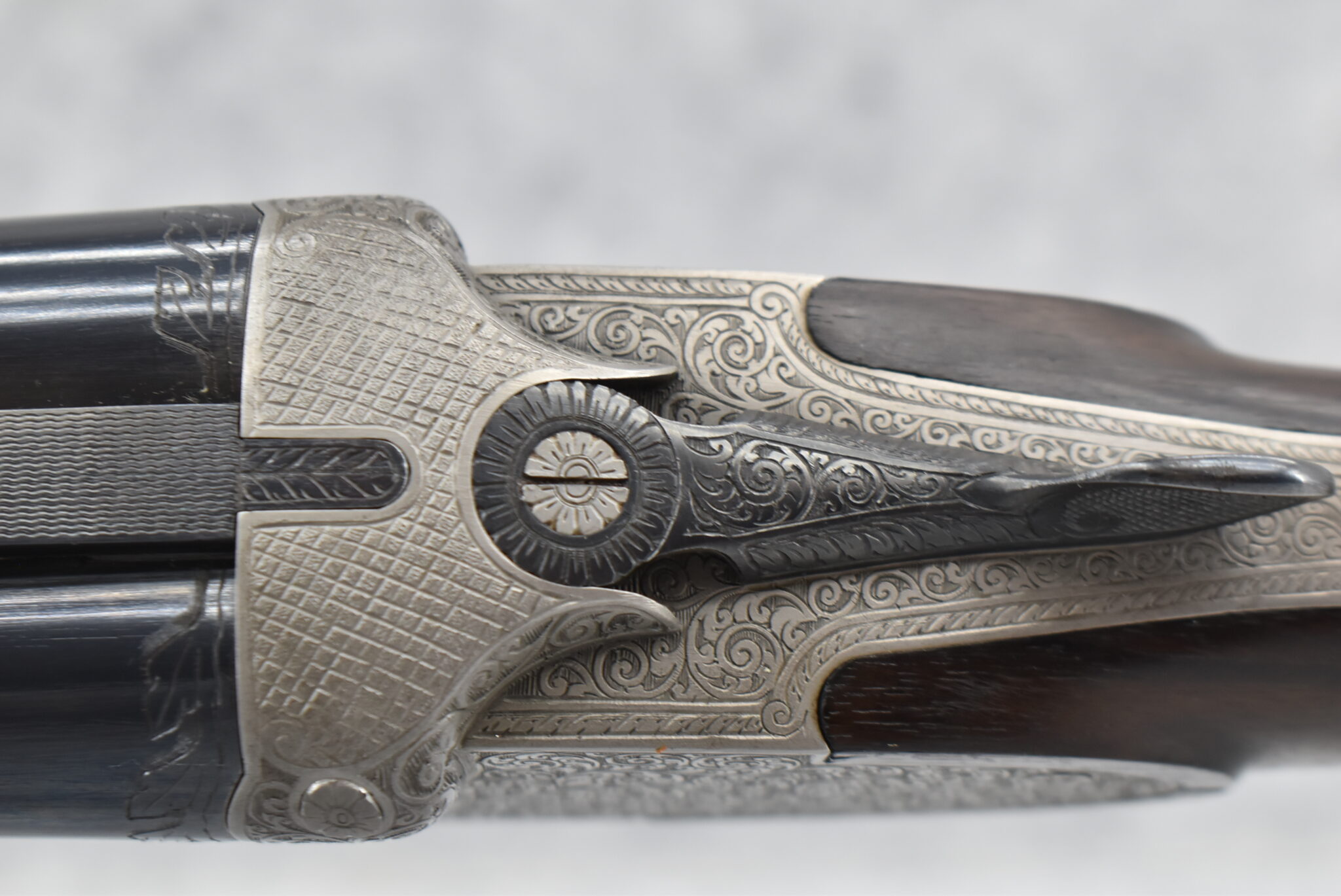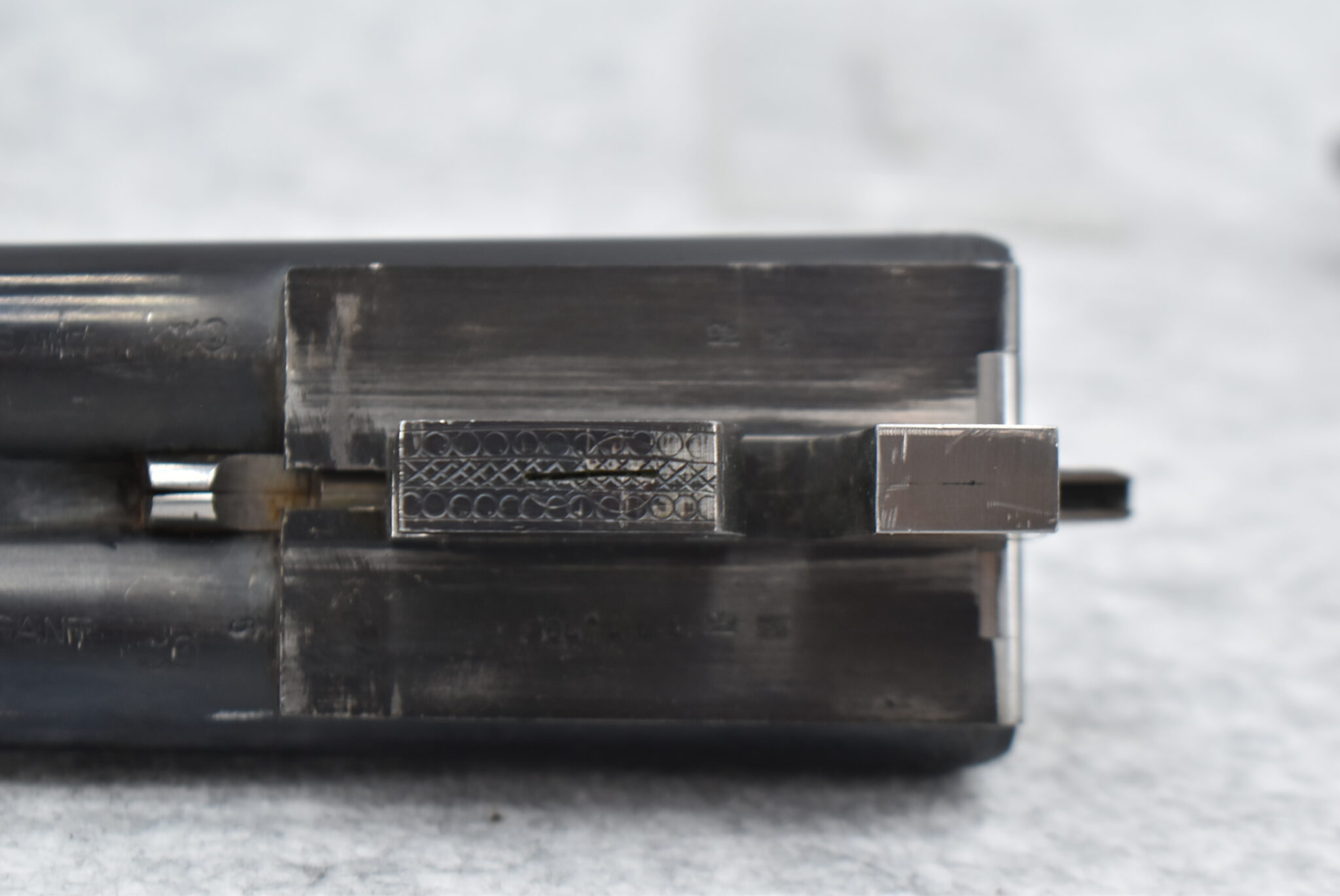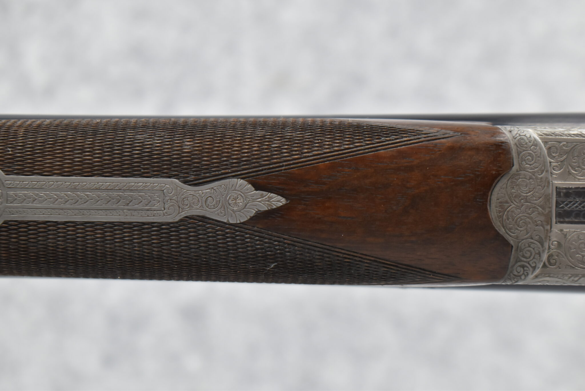 22R. Franz Sodia of Ferlach Side by Side Ejector Double Rifle Two-Barrel Set – 1st Set is a 25 ½” 458 Win. Mag. Barrels w/Matted Quarter Rib w/Single Leaf Rear Sight & Two-Bead Front Night Sight – 2nd Set is a Set of 25 ½” 375 H&H Mag Barrels w/Beaded Sporting Front & Matted Quarter Rib w/Single Leaf Rear Sight & Claw Scope Bases – Gun is Stocked w/A Finely Checkered Pistol Grip Wood Butt Stock & Matching Finely Checkered Wood Splinter Forearm w/Pachmayr Recoil Pad – w/Double Triggers w/The Front Trigger Being Set – Receiver is Fully, Tight Scroll Engraved on All Sides As Well, As On the Trigger Guard – Equipped w/The Set of 458 Win. Mag. Barrels the Gun Weighs 9lbs, 6oz. – Equipped w/The Set of 375 H&H Barrels the Gun Weighs 9lbs, 6oz. – LOP From Front Trigger to Back of the Recoil Pad is 15” – Accompanied by Leather/Canvas Take Down Case w/Keys w/Set of 375 H&H Mag & 458 Win. Mag. Snap Caps – Great Set Up for Any Dangerous Game Hunter!
