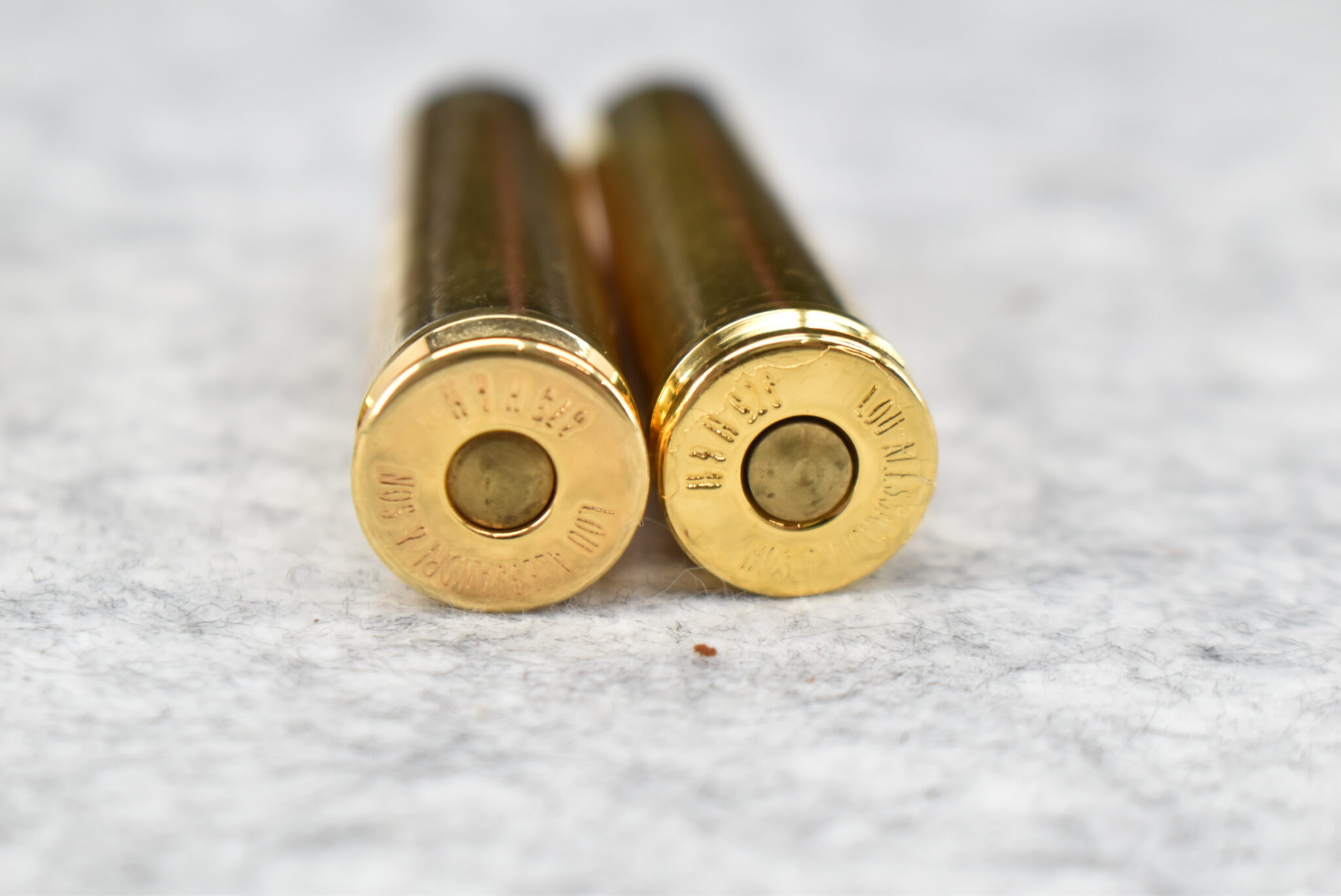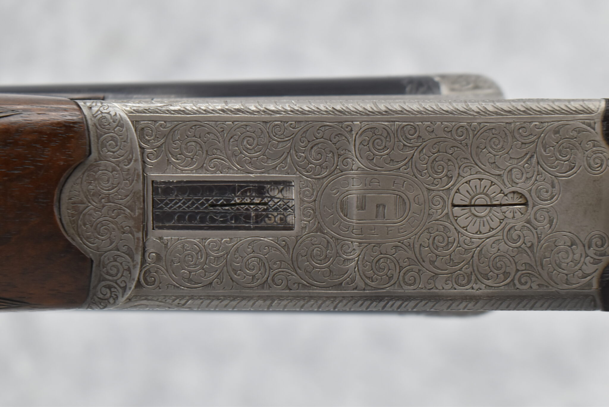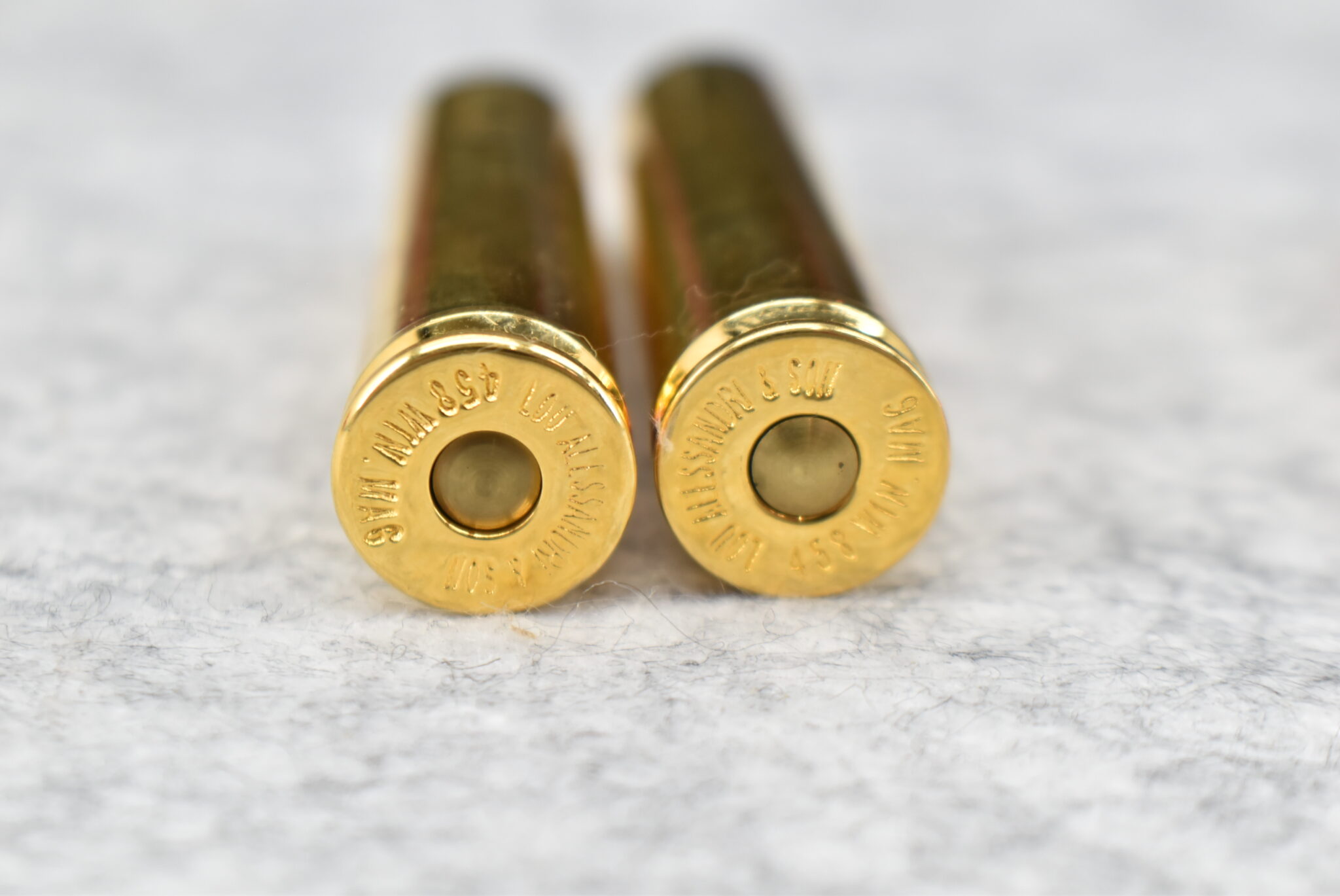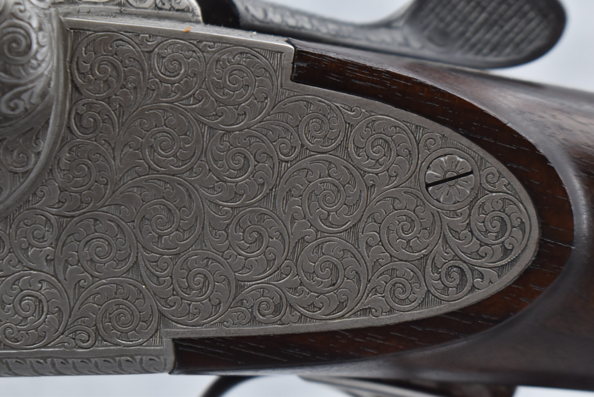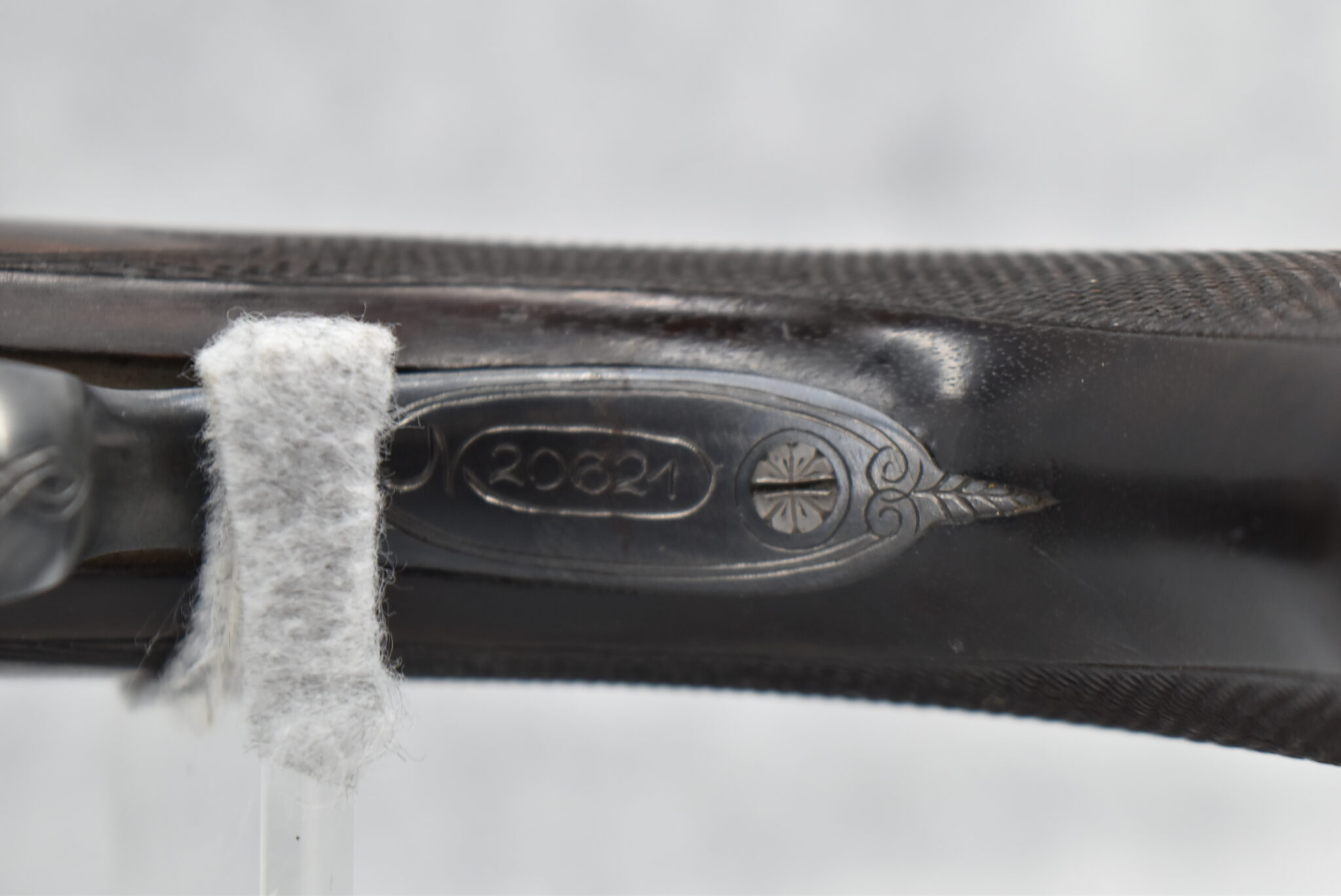 22R. Franz Sodia of Ferlach Side by Side Ejector Double Rifle Two-Barrel Set – 1st Set is a 25 ½” 458 Win. Mag. Barrels w/Matted Quarter Rib w/Single Leaf Rear Sight & Two-Bead Front Night Sight – 2nd Set is a Set of 25 ½” 375 H&H Mag Barrels w/Beaded Sporting Front & Matted Quarter Rib w/Single Leaf Rear Sight & Claw Scope Bases – Gun is Stocked w/A Finely Checkered Pistol Grip Wood Butt Stock & Matching Finely Checkered Wood Splinter Forearm w/Pachmayr Recoil Pad – w/Double Triggers w/The Front Trigger Being Set – Receiver is Fully, Tight Scroll Engraved on All Sides As Well, As On the Trigger Guard – Equipped w/The Set of 458 Win. Mag. Barrels the Gun Weighs 9lbs, 6oz. – Equipped w/The Set of 375 H&H Barrels the Gun Weighs 9lbs, 6oz. – LOP From Front Trigger to Back of the Recoil Pad is 15” – Accompanied by Leather/Canvas Take Down Case w/Keys w/Set of 375 H&H Mag & 458 Win. Mag. Snap Caps – Great Set Up for Any Dangerous Game Hunter!