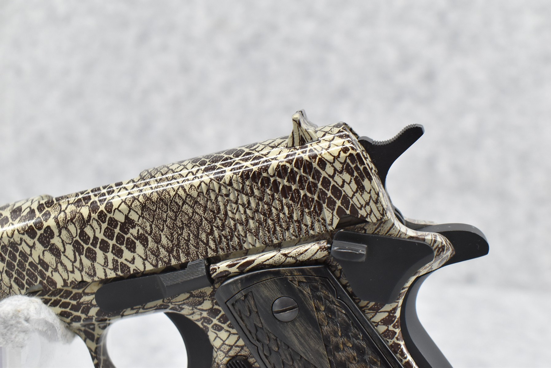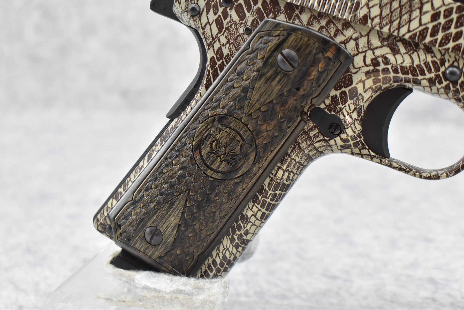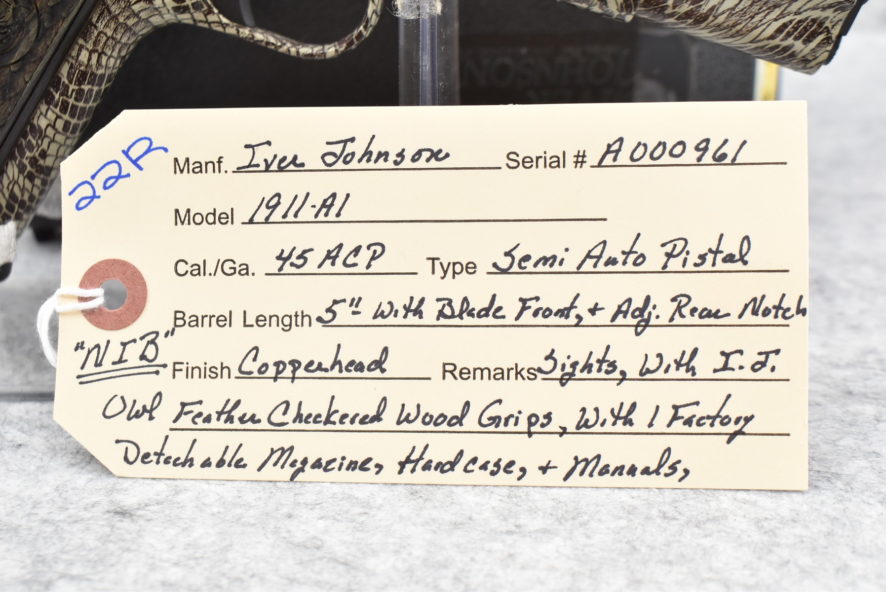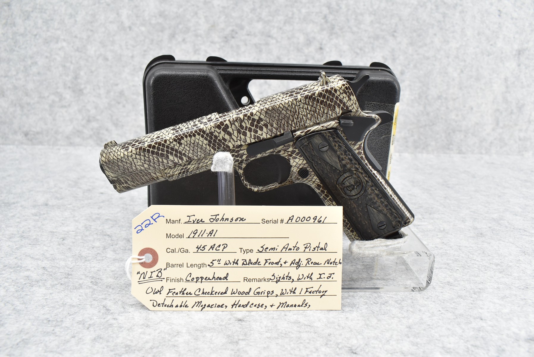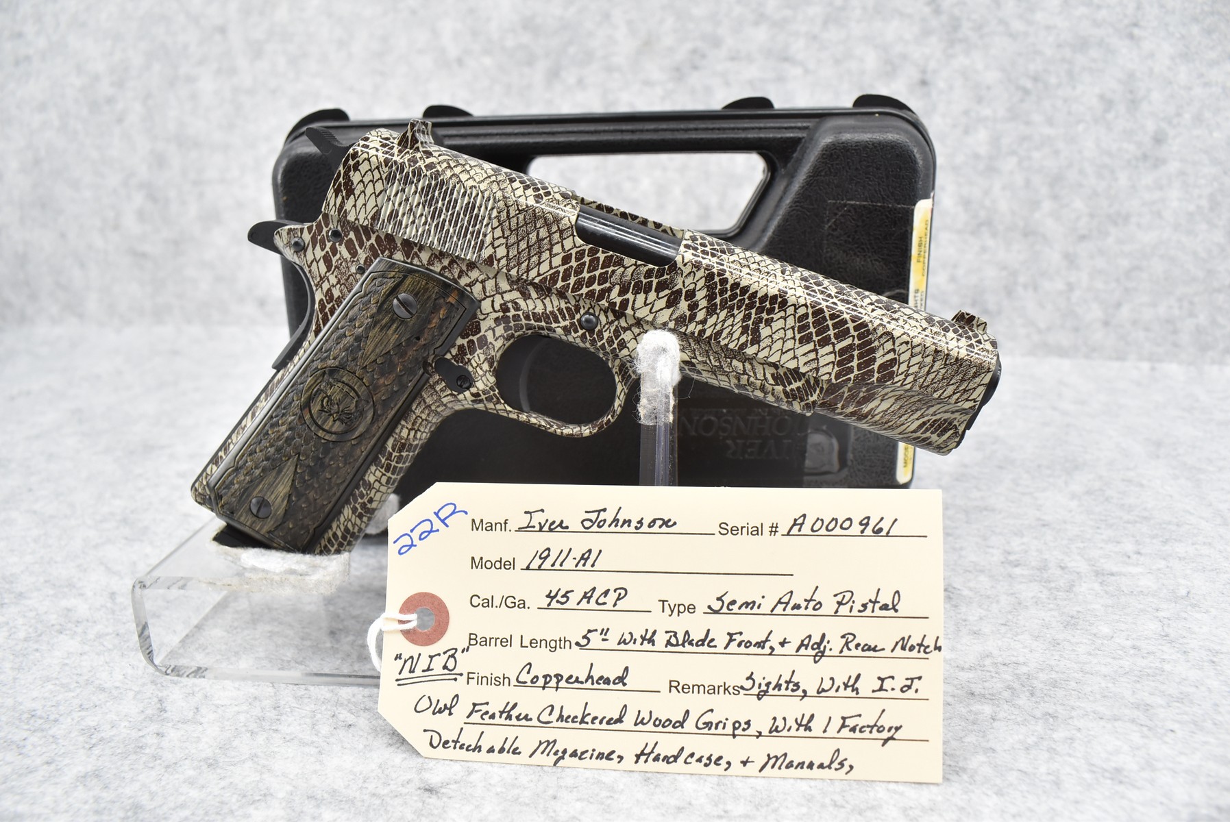 22R. Iver Johnson – Mod. 1911-A1 – 45 ACP Cal. Semi-Auto Pistol – w/5” Barrel w/Blade Front & Adj. Rear Notch Sights – Copperhead Finish – w/Iver Johnson Owl Factory Checkered Wood Grips – w/Factory Detachable Magazine – New w/Hard Case & Manuals