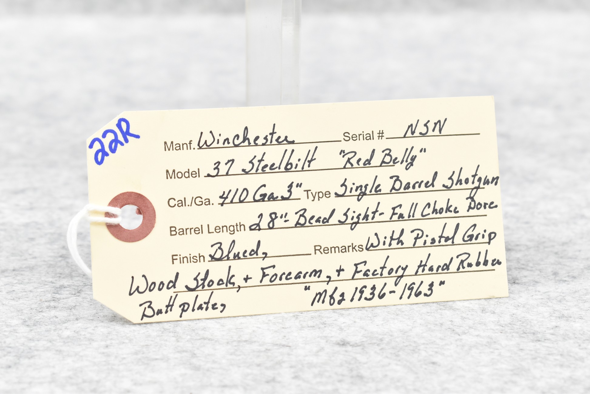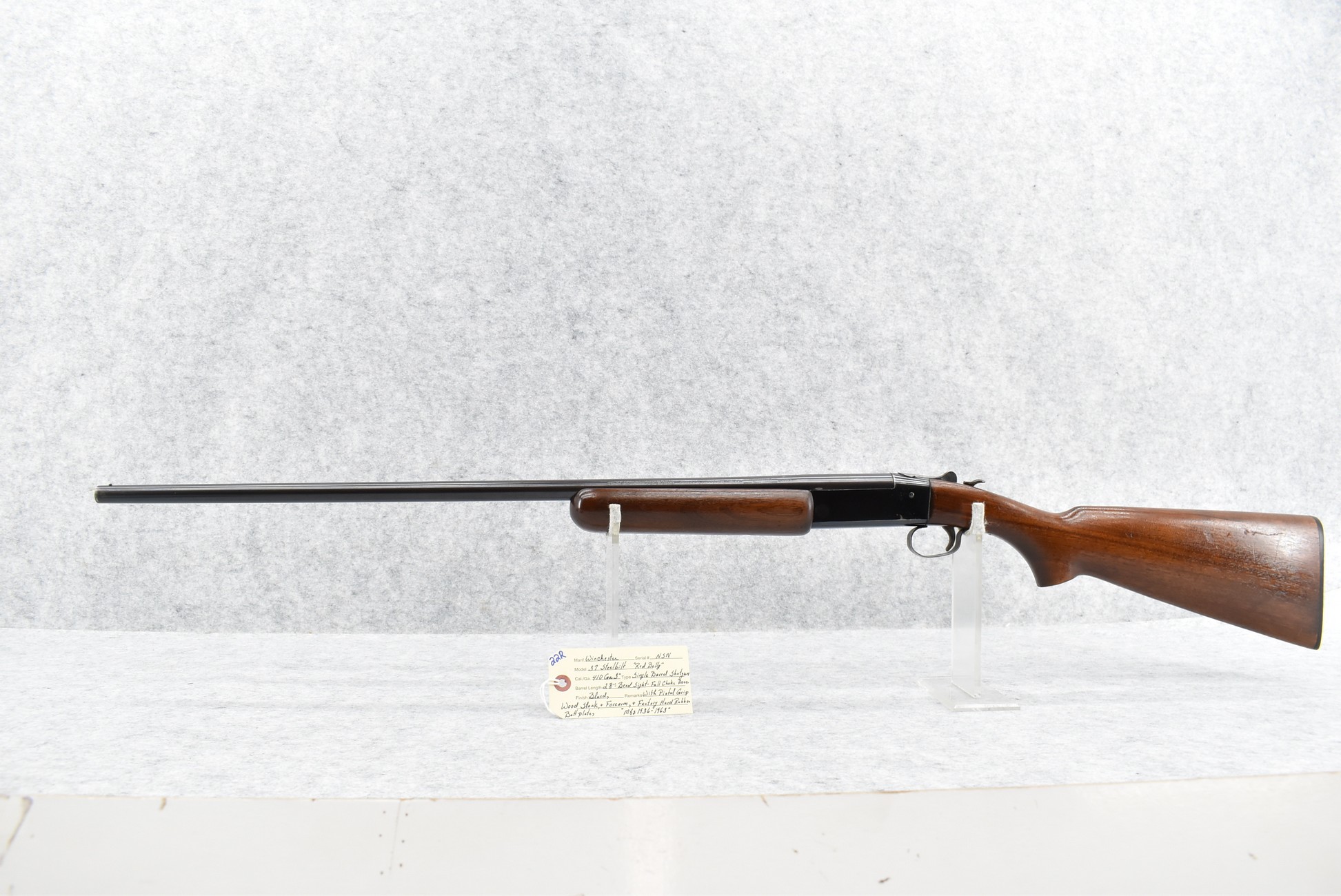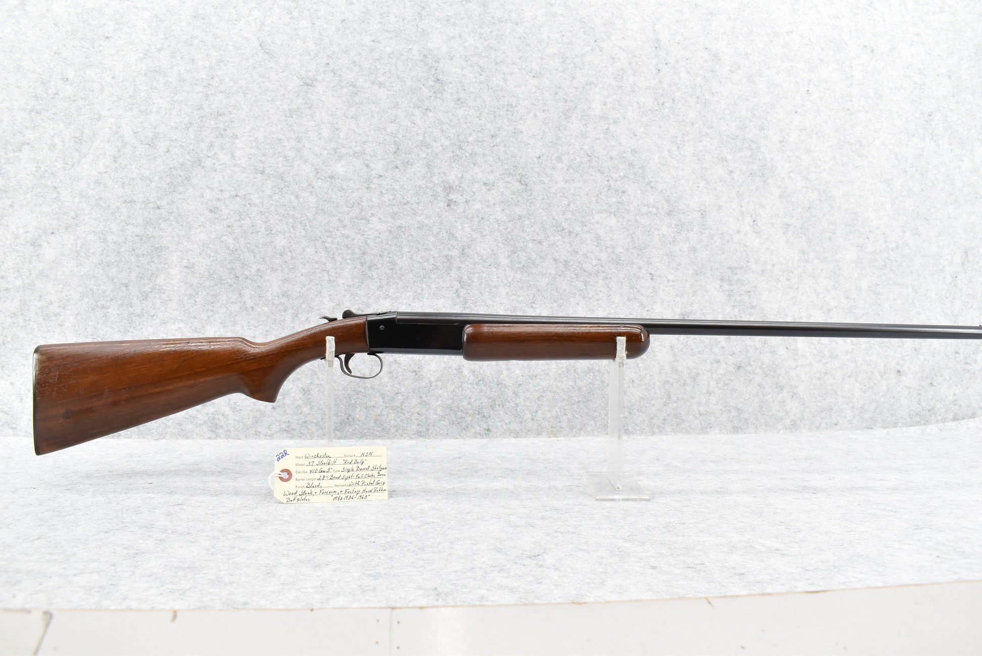 22R. Winchester – Mod. 37 Steelbilt “Red Belly” – 410ga. 3” Single Barrel Shotgun – w/28” Full Choke Barrel w/Bead Sight – Blued Finish – w/Pistol Grip Wood Stocks w/Factory Hard Rubber Butt Plate
