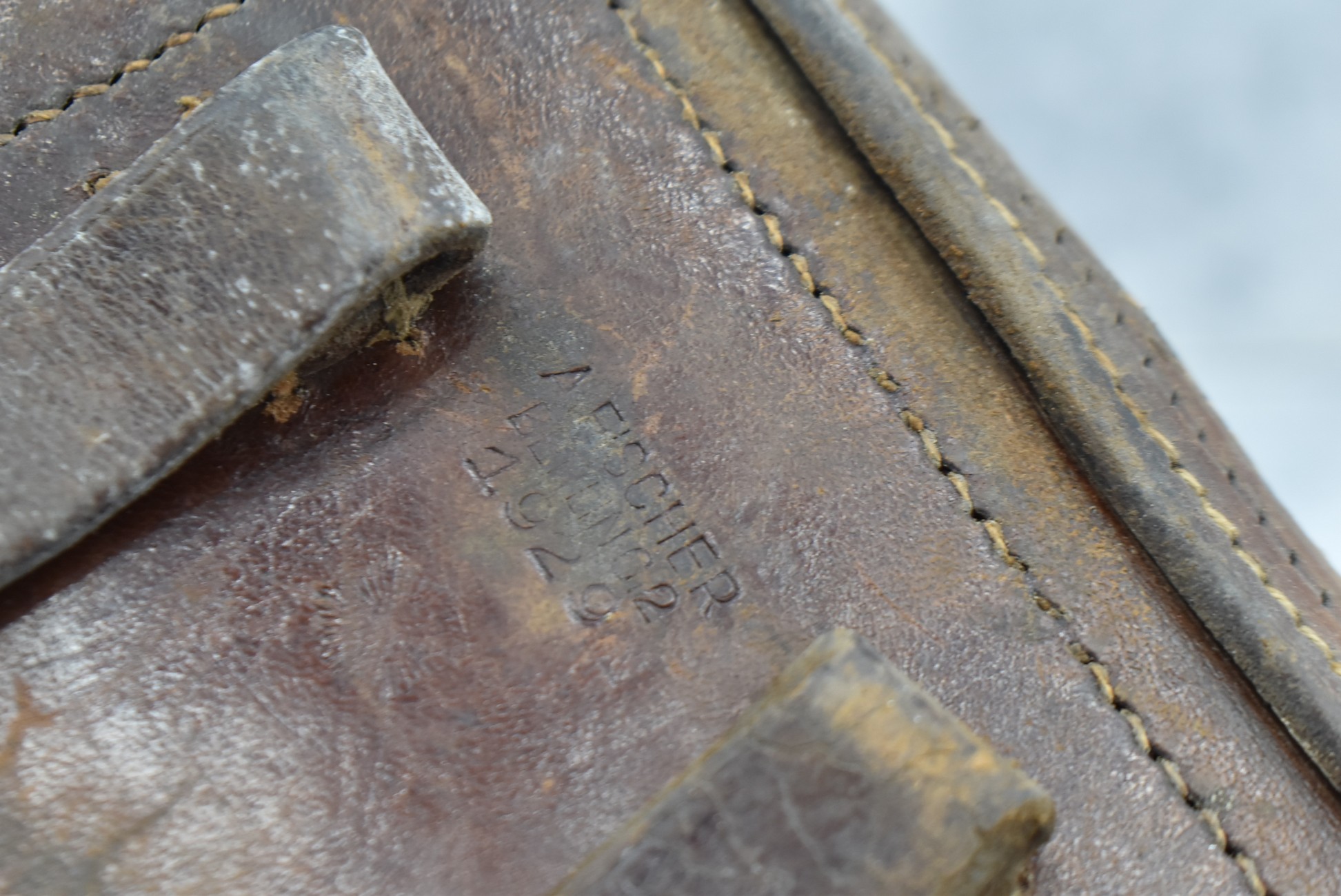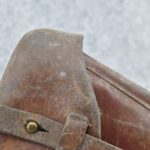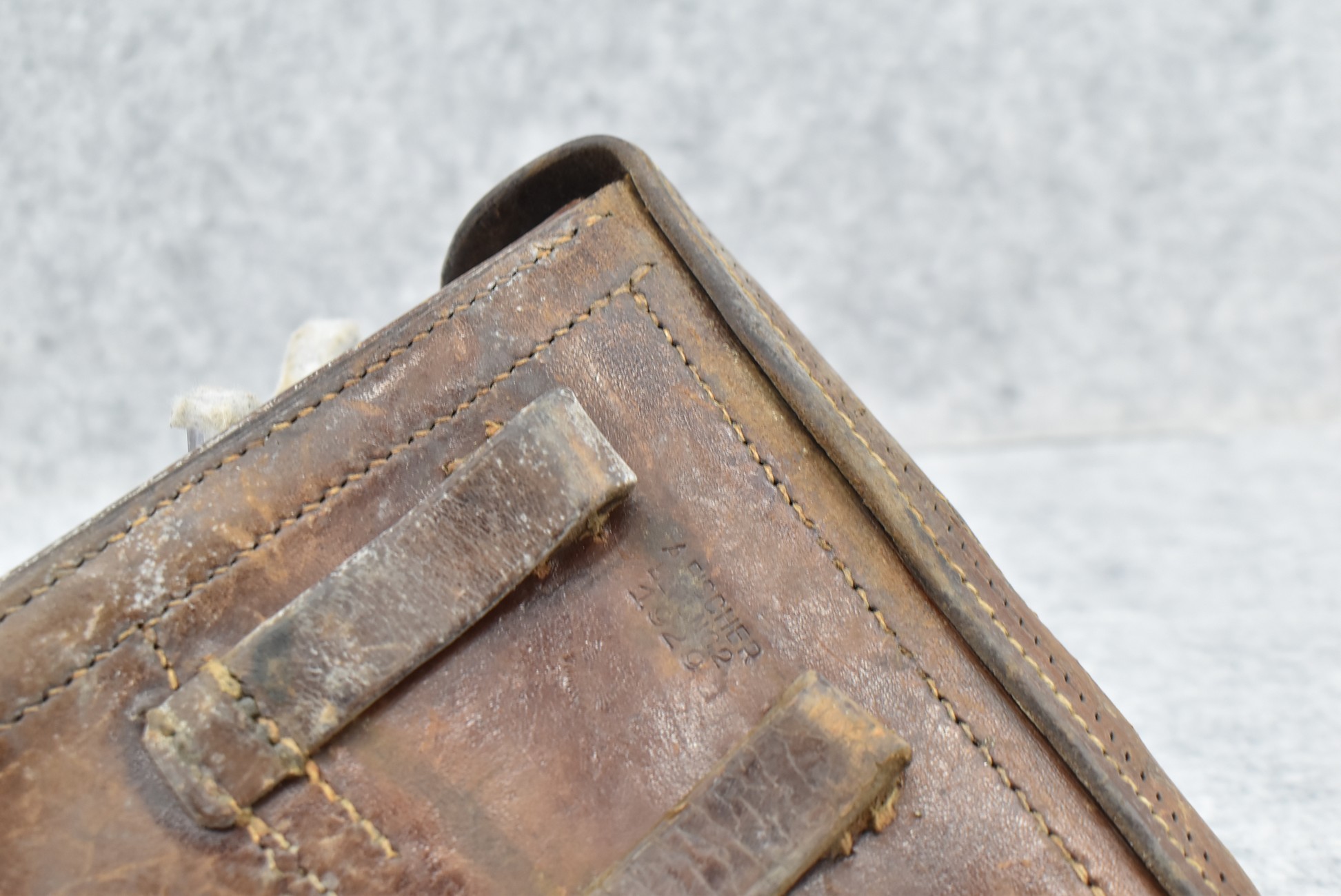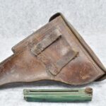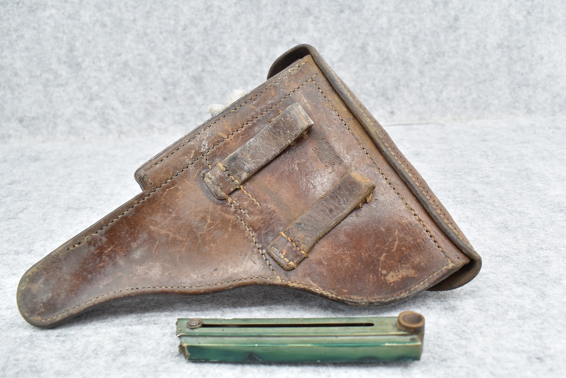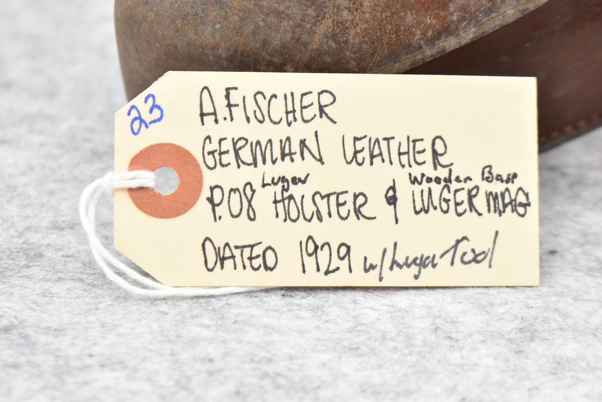 23. A. Fischer – German Leather P.08 Luger Holster & Wooden Base Luger Mag – w/Luger Tool – Dated 1929