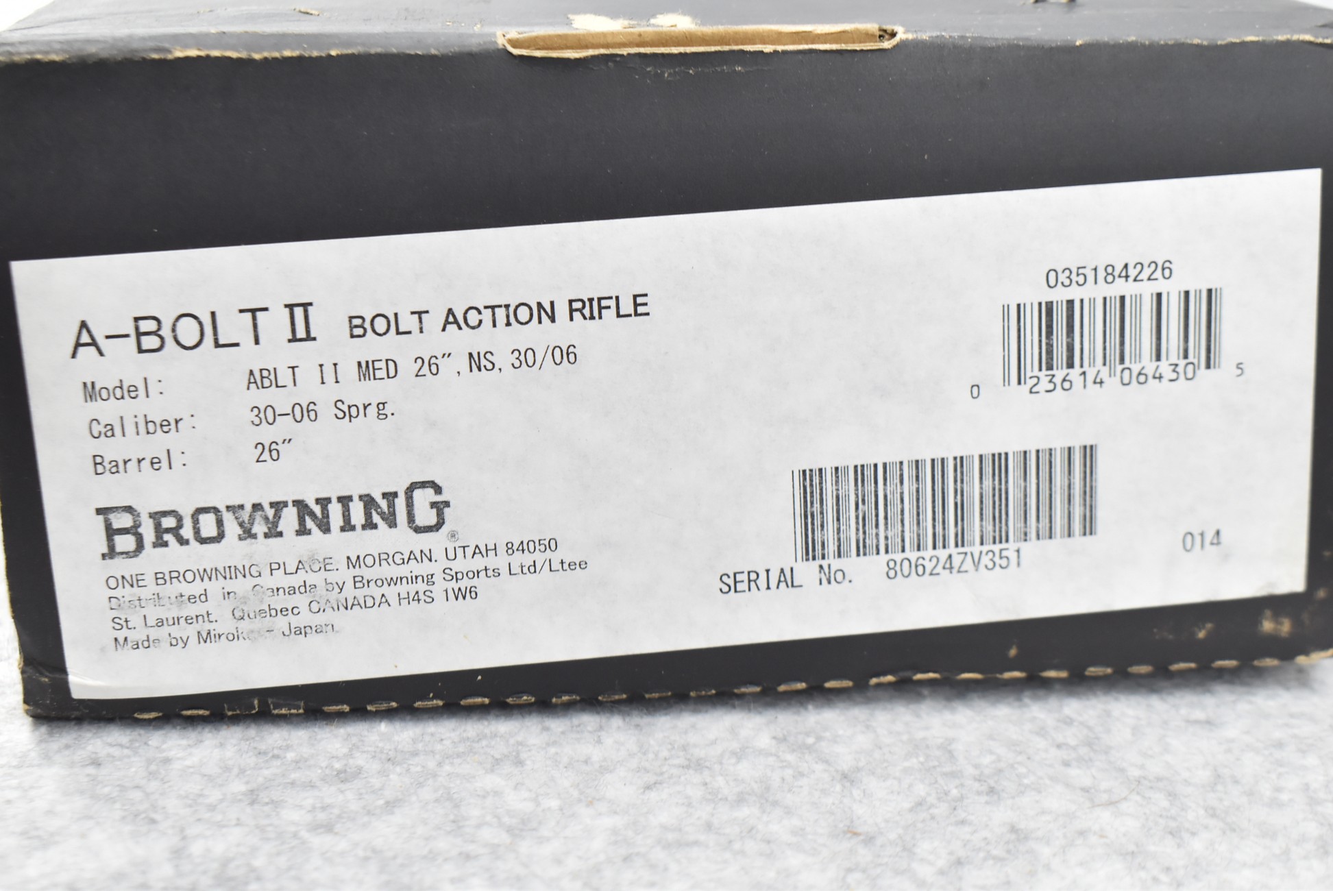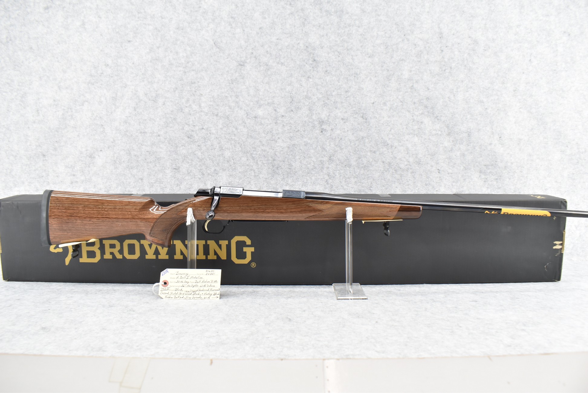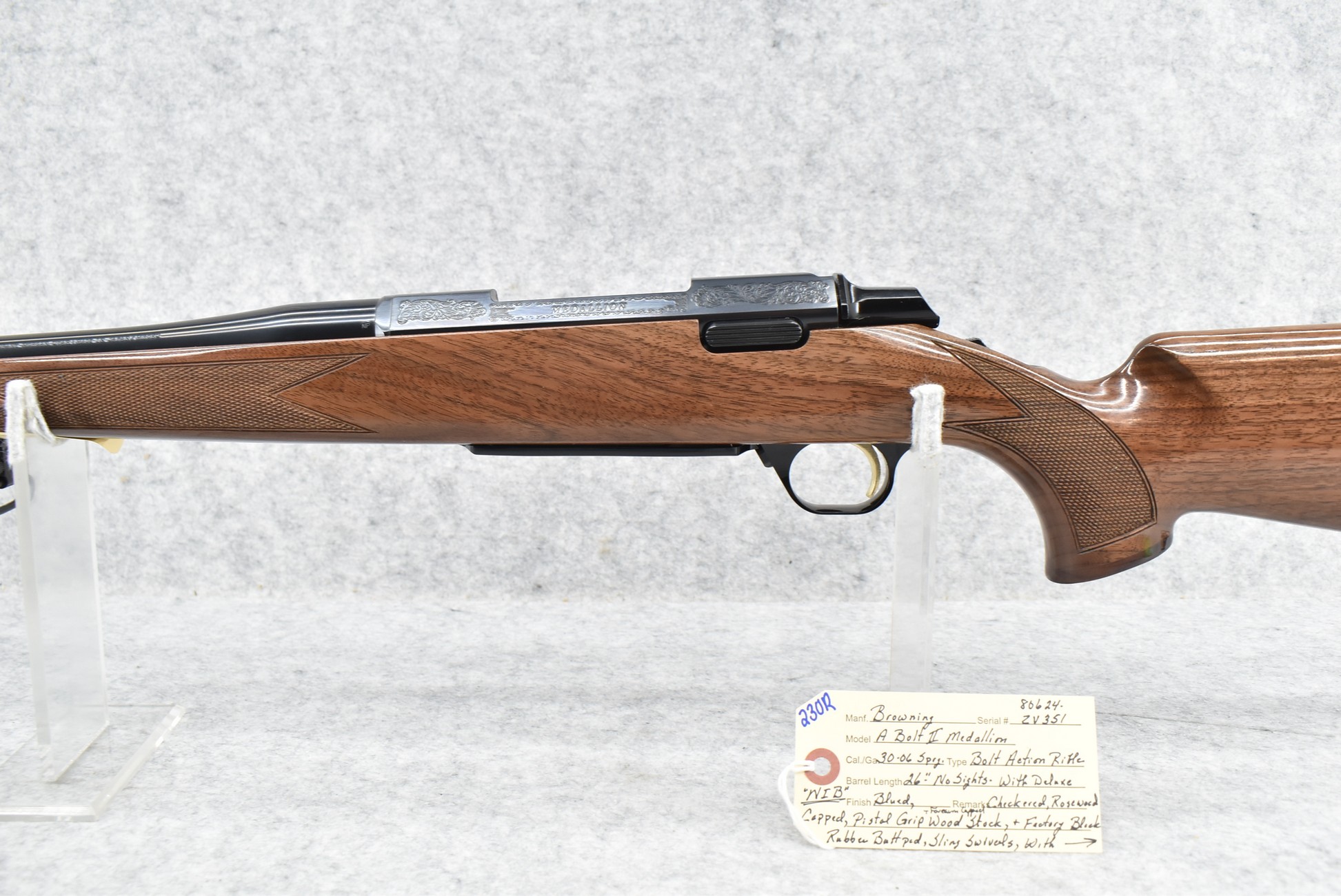 230R. Browning – Mod. A-Bolt II Medallion – 30-06 Sprg. Cal. Bolt Action Rifle – w/26” Barrel w/No Sights – Blued Finish – w/Checkered Rosewood Capped Pistol Grip & Forearm Capped Wood Stock w/Factory Butt Pad – w/Sling Swivels – New in Factory Box w/Accessories
