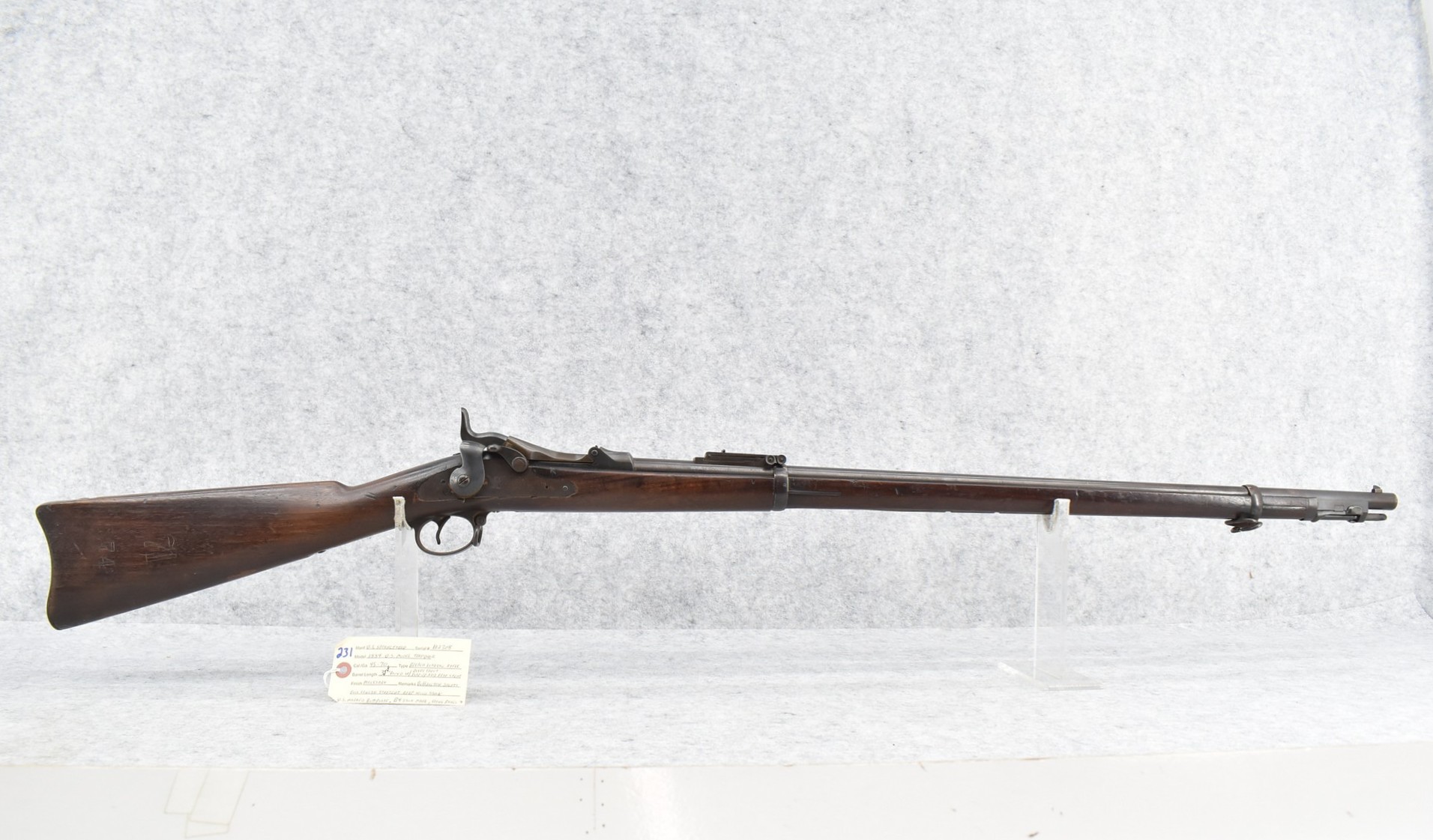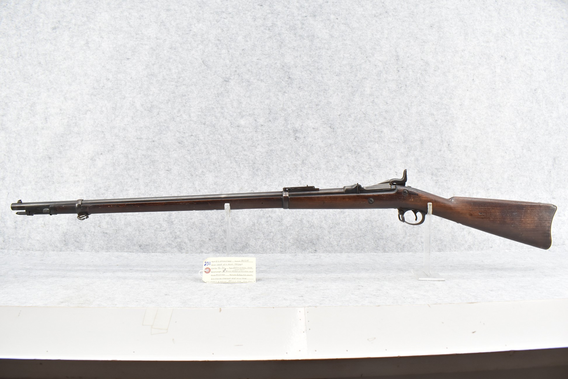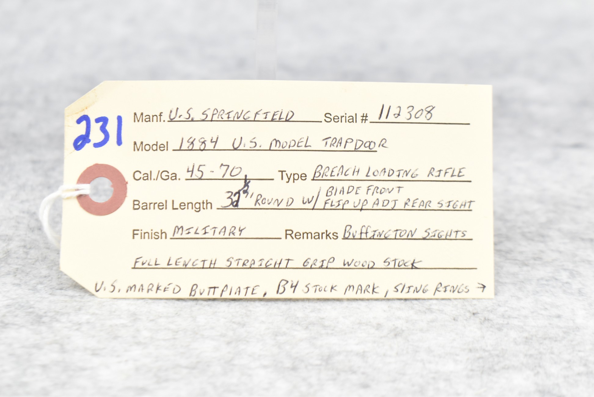 231. U.S. Springfield – U.S. Model 1884 – 45-70 Cal. Trapdoor Rifle – w/32 ½” Round Barrel w/Blade Front & Flip Up Adj. Rear Buffington Sights – Military Finish – w/Full Length Straight Grip Wood Stock w/U.S. Marked Butt Plate – w/“B4” & “71” & “74” Stock Markings & 1891 Inspector Stamp on Left Side of Stock – w/Sling Ring – w/Ram Rod Bayonet