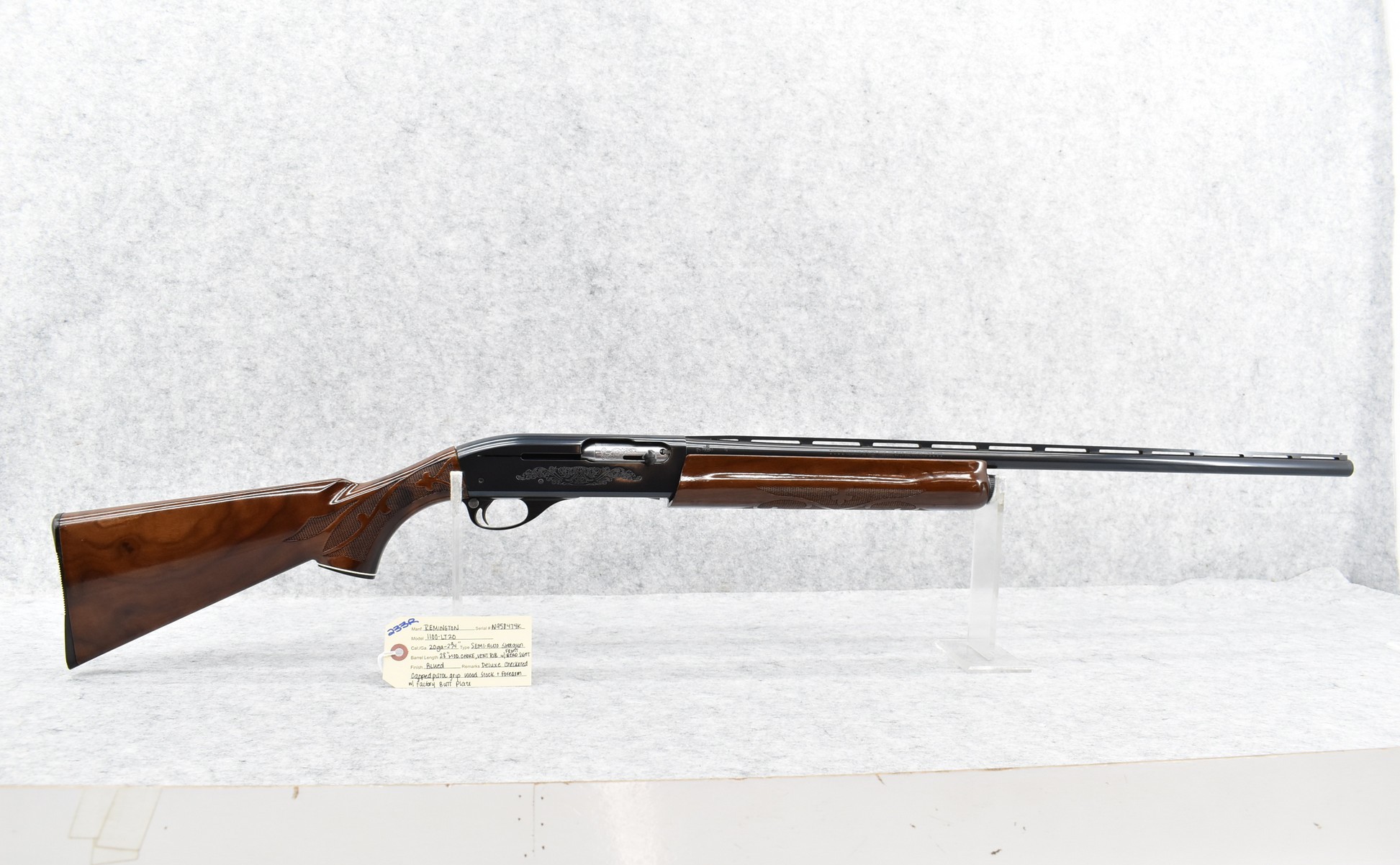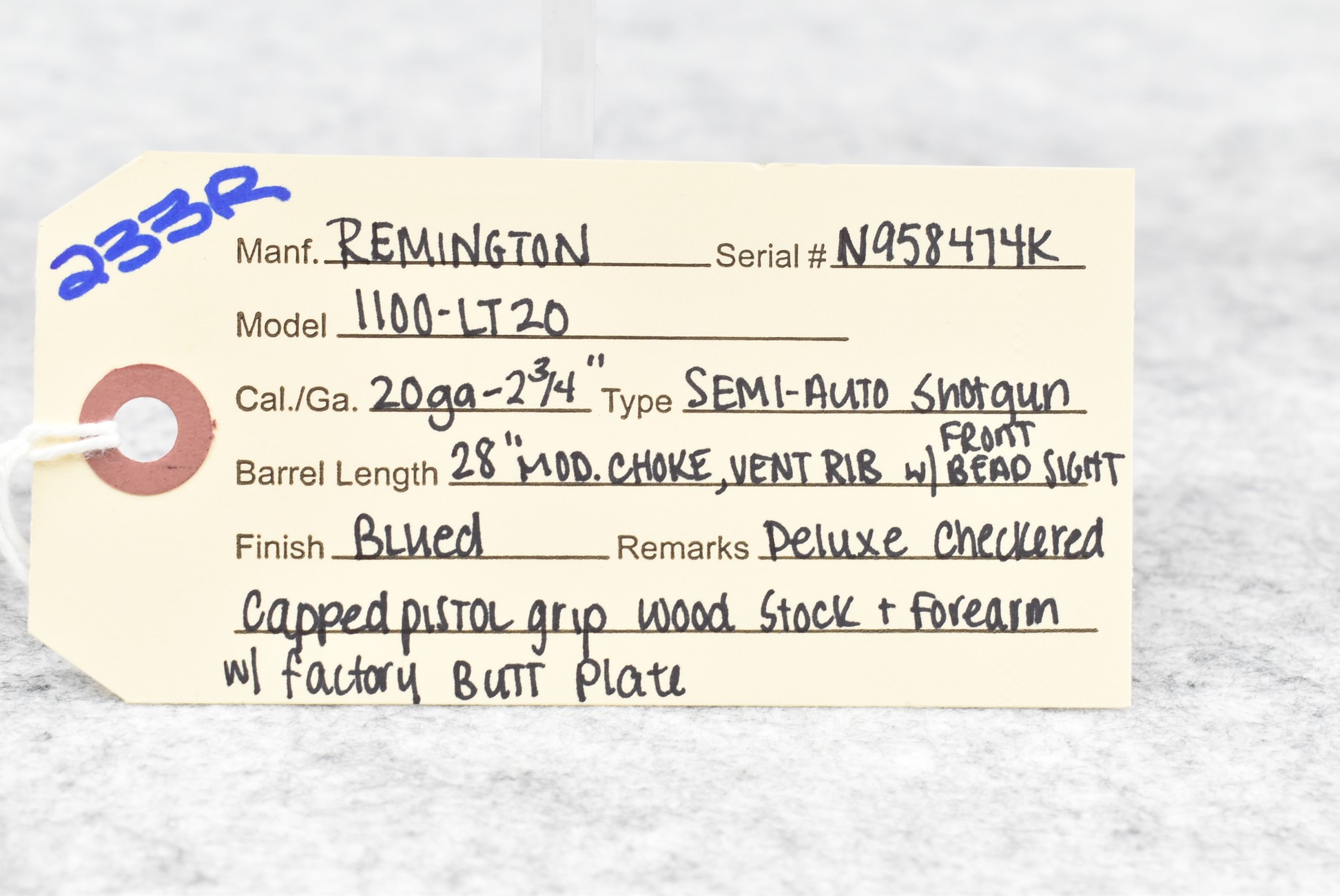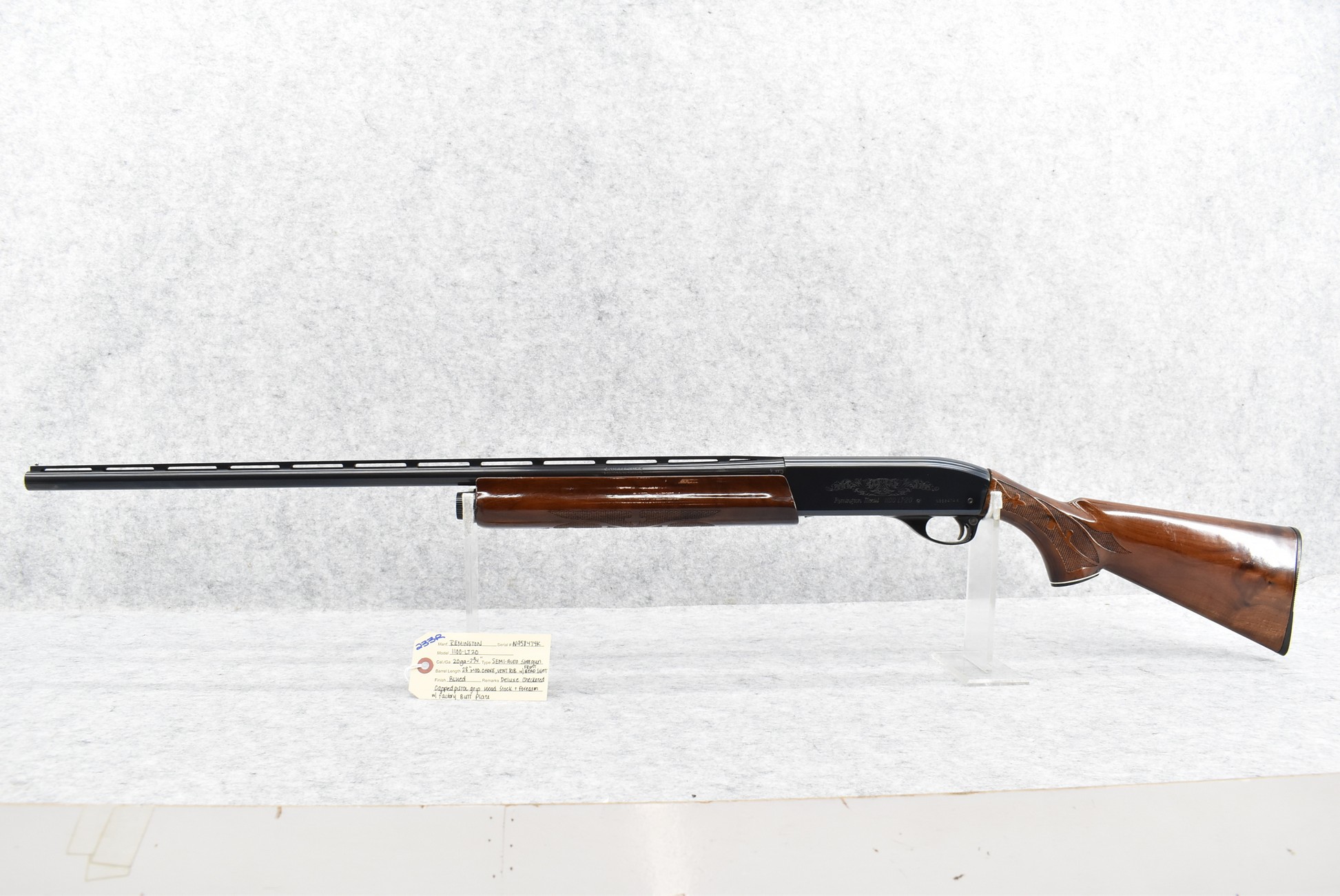 233R. Remington – Mod. 1100 LT20 – 20ga. 2¾” Semi-Auto Shotgun – w/28” Mod. Choked Vent Rib Barrel w/Front Bead Sight – Blued Finish – w/Deluxe Checkered Capped Pistol Grip Wood Stocks w/Factory Butt Plate