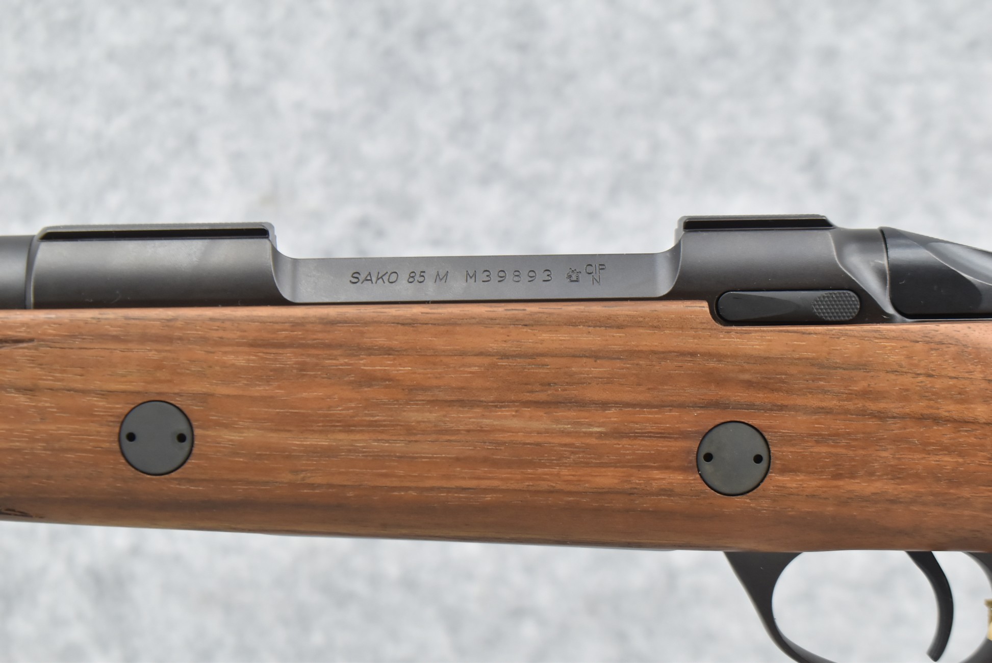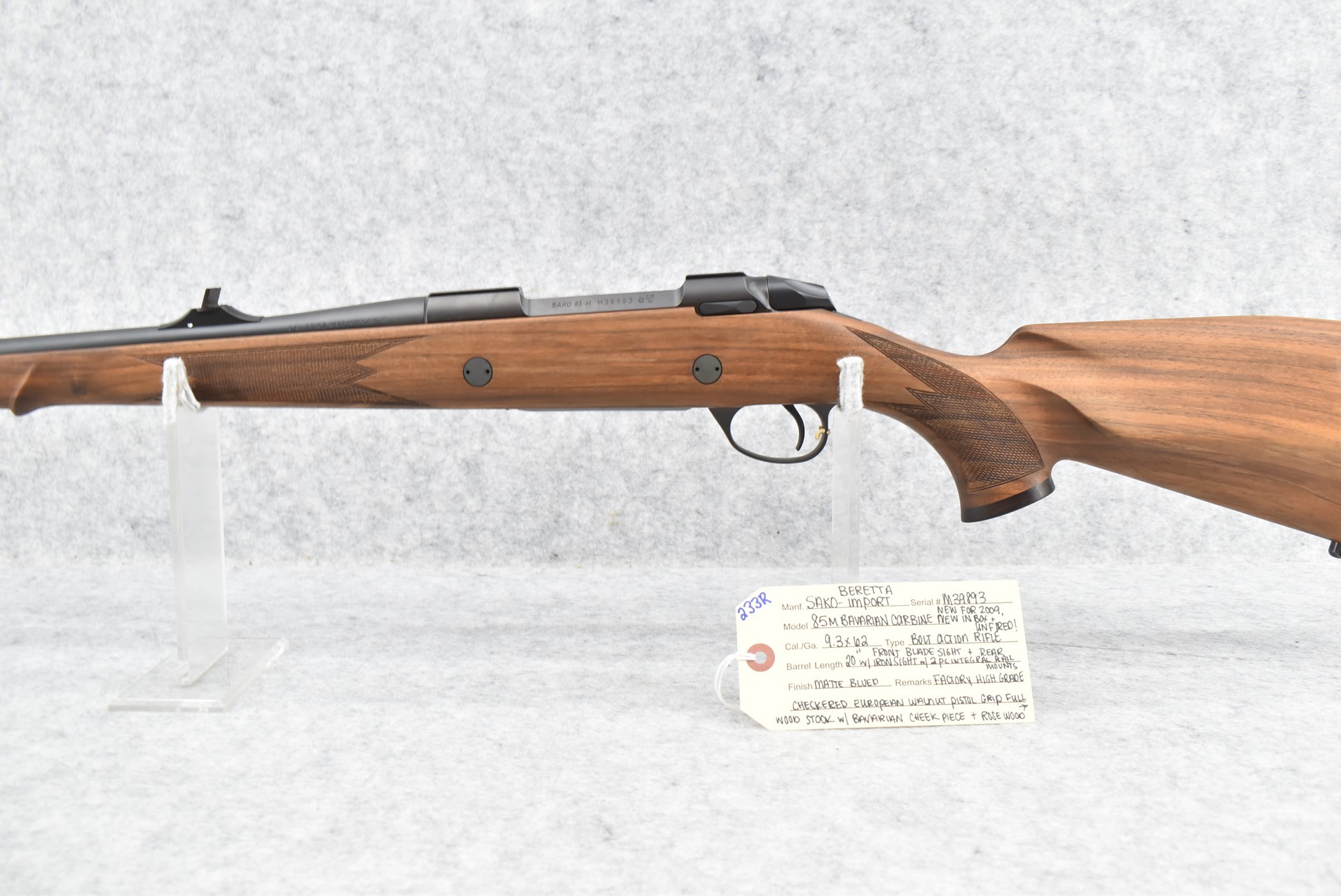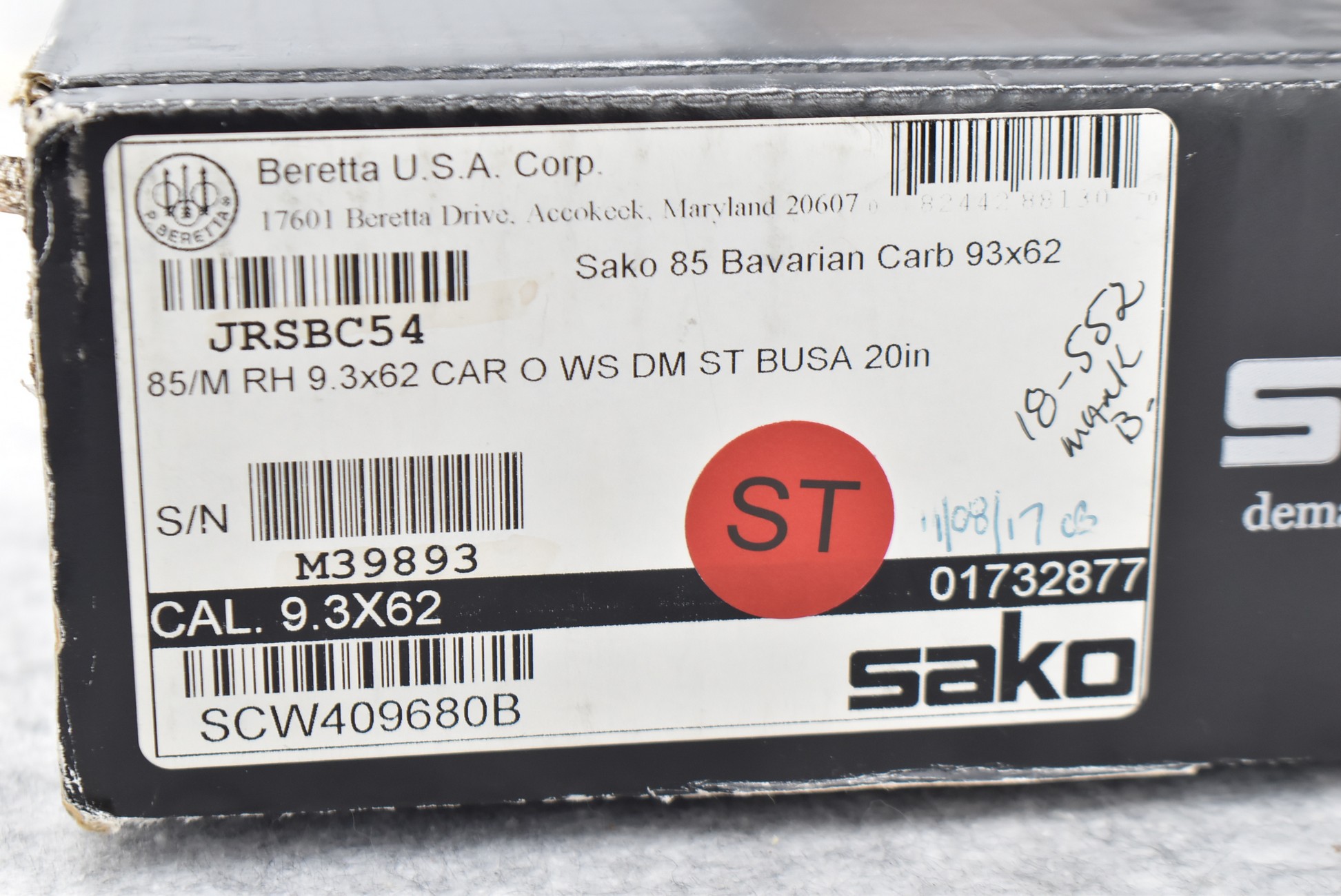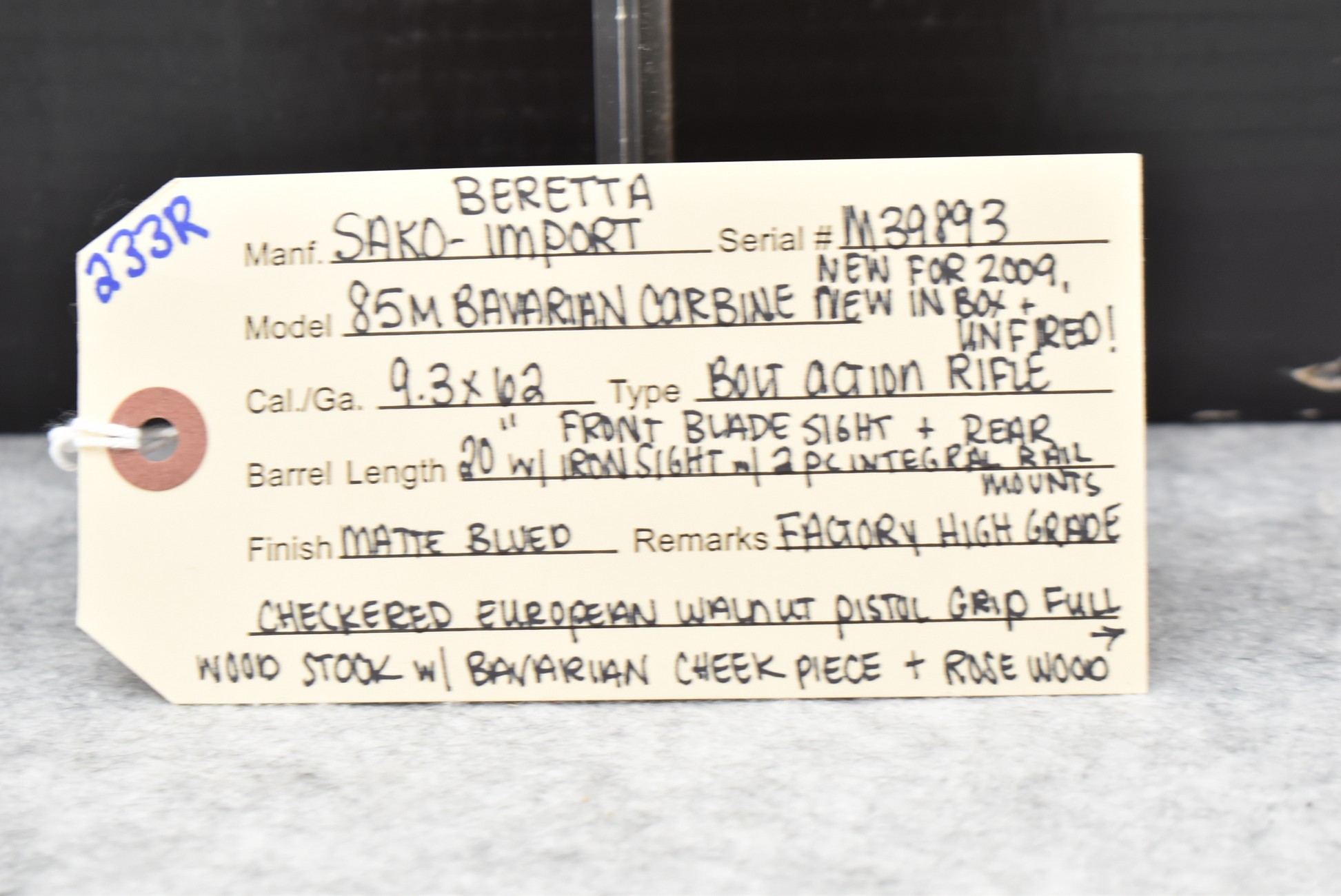 233R. Sako – Mod. 85M Bavarian Carbine New for 2009 – 9.3×62 Cal. Bolt Action Rifle – w/20” Barrel w/Blade Front and Rear Iron Sights – Matte Blued Finish – w/Factory High Grade Checkered European Walnut Pistol Grip Full Wood Mannlicher Stock w/Bavarian Cheek Piece and Rosewood Pistol Grip Cap & Forend Cap w/Sako Emblem Factory Recoil Pad – w/Detachable Magazine – w/Sling Swivels – New in Factory Box w/Manual – Excellent!
