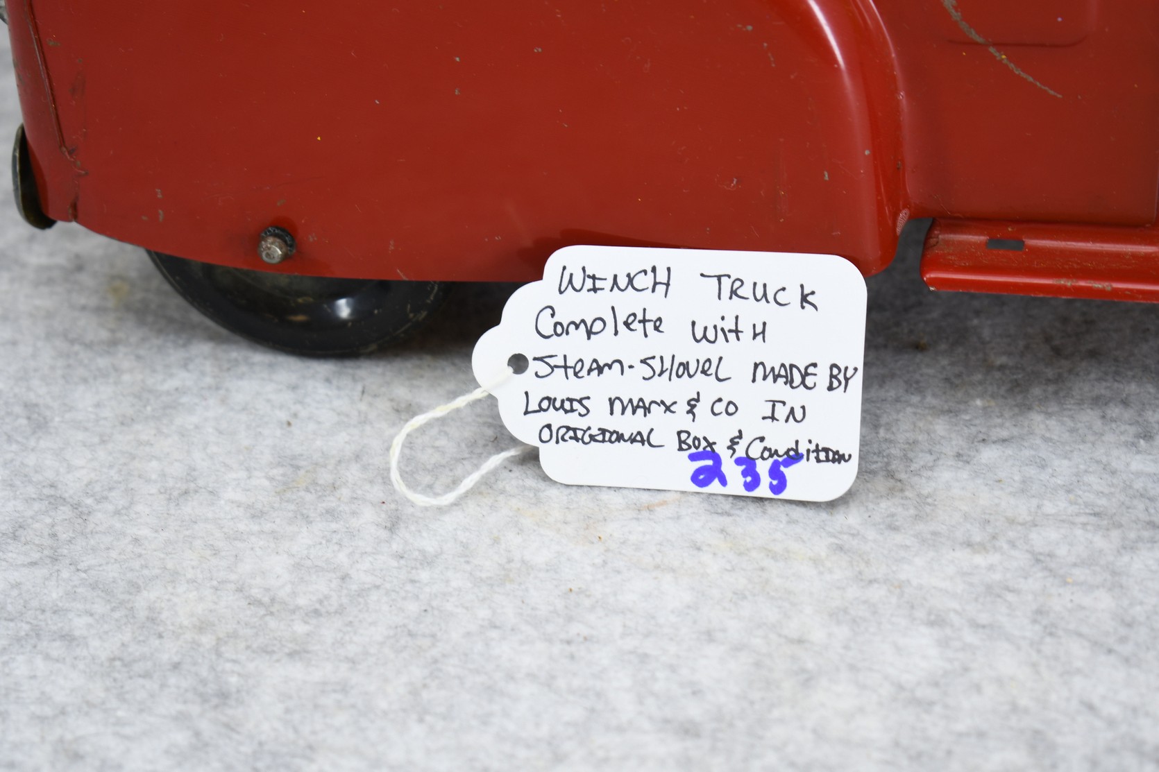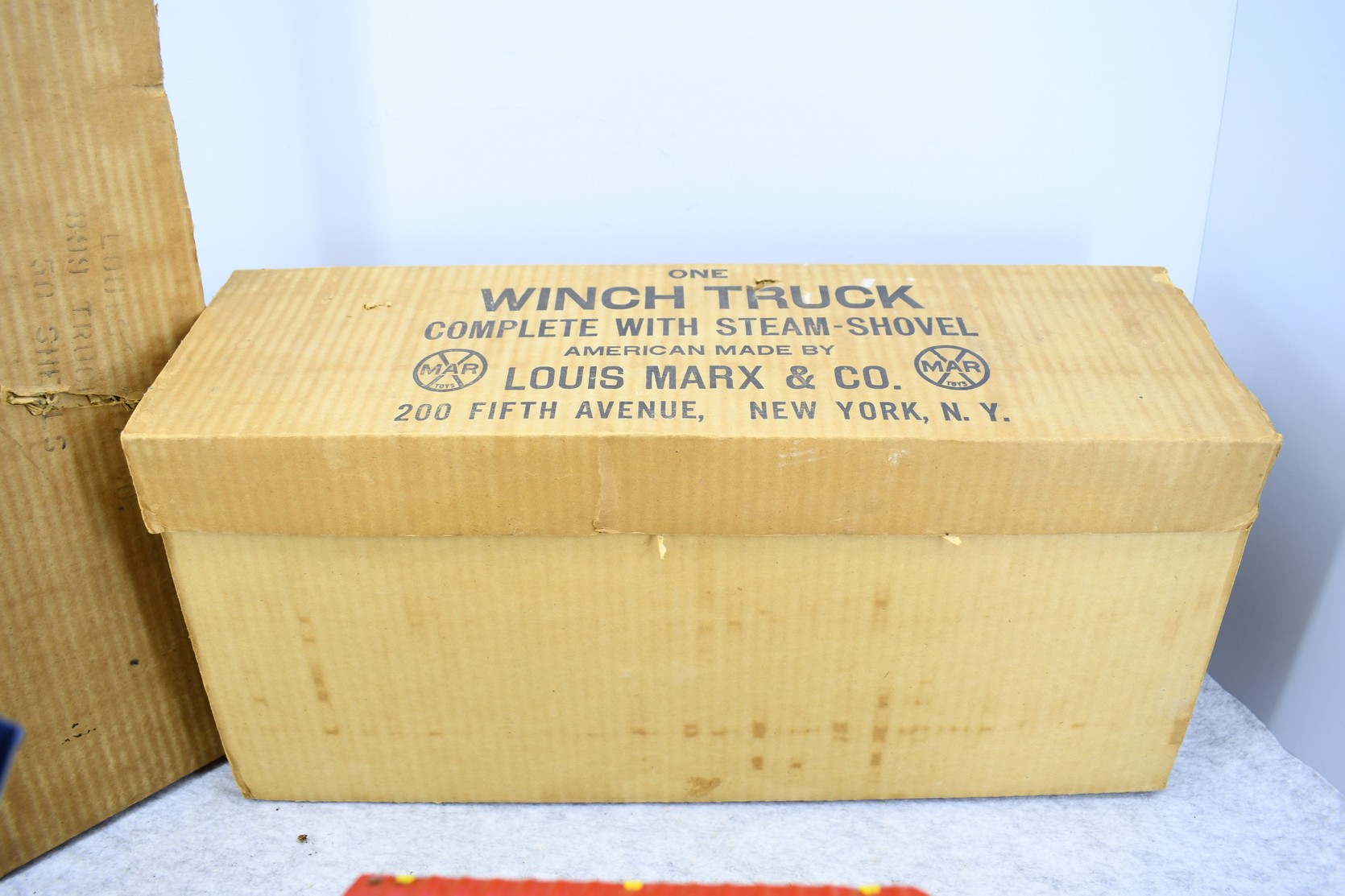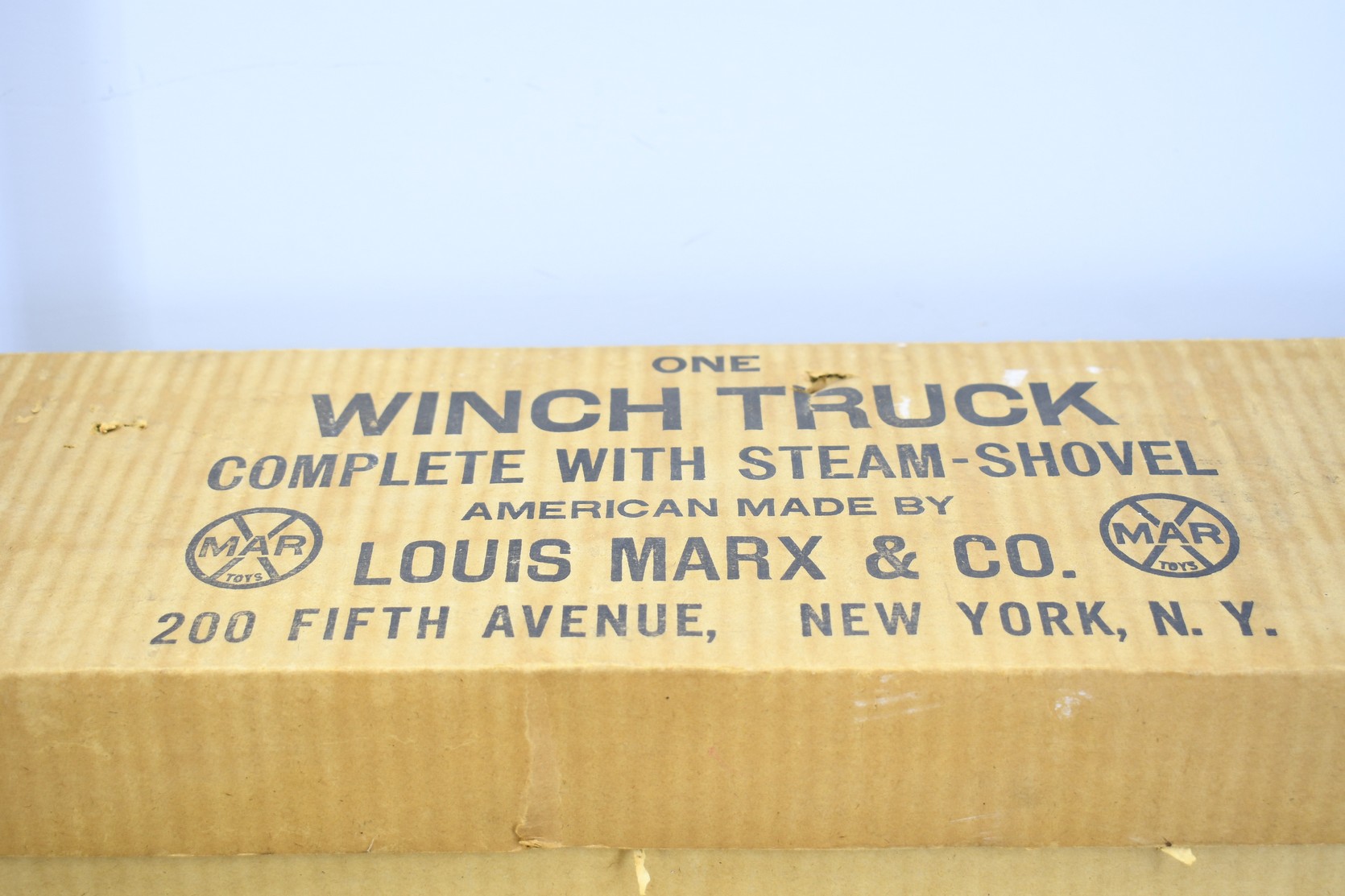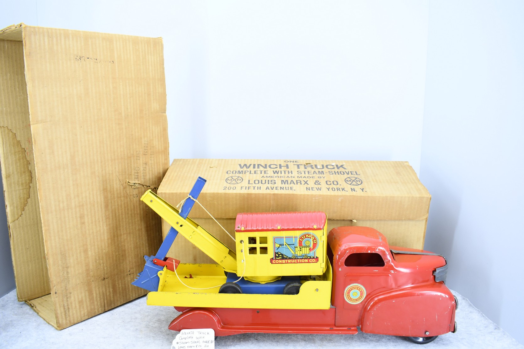235. Louis Mar-X Company Original Lumar Contractors Winch Truck – Complete w/ Lumar Construction Co. Steam Shovel – Toy is in Original Box in Excellent Condition