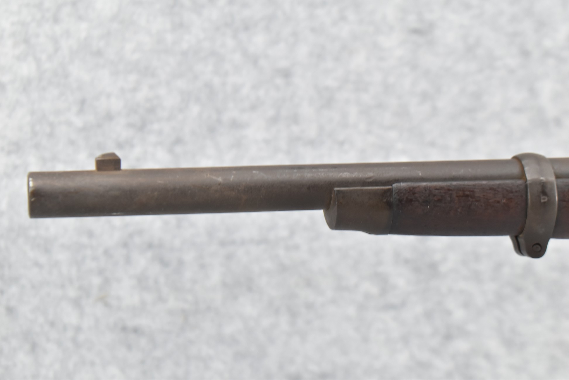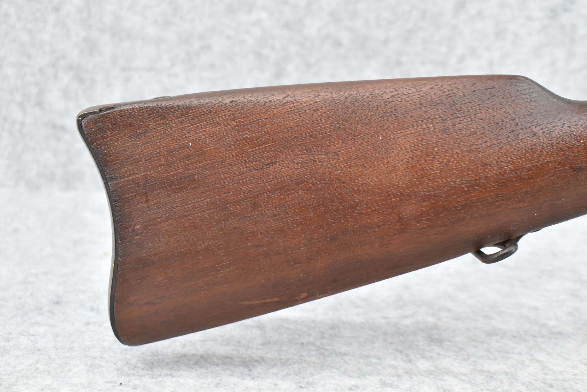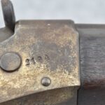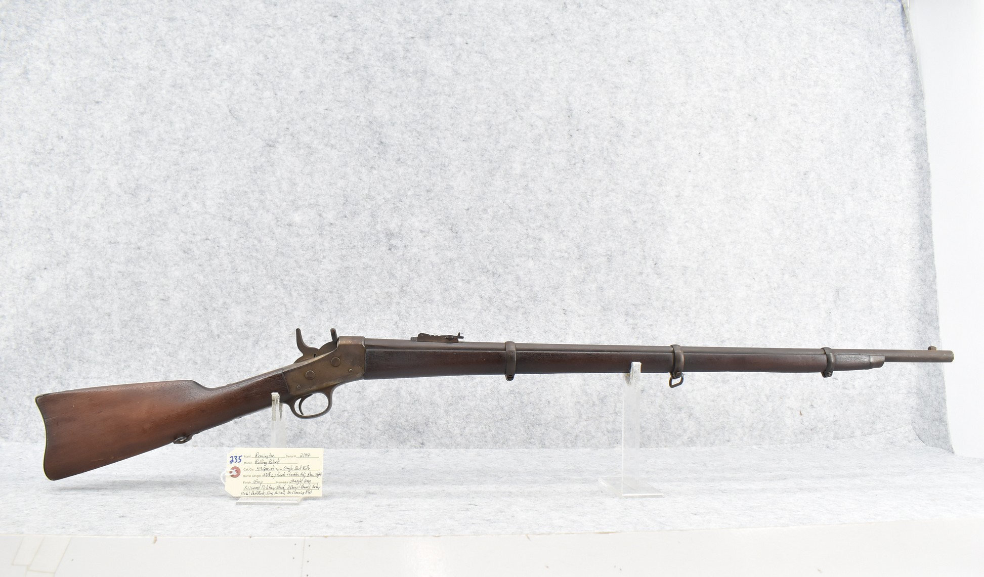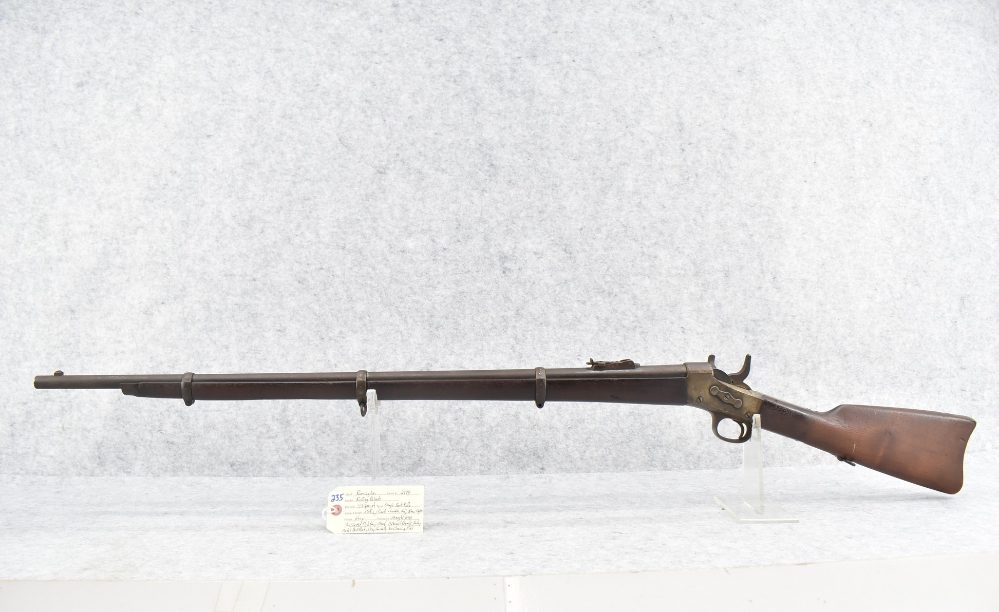235. Remington – Mod. Rolling Block – 43 Spanish Cal. Single Shot Rifle – w/35 1/8” Barrel w/Front & Ladder Adj. Rear Sights – Gray Finish – w/Straight Grip Full Wood Military Stock Held on by 3 Barrel Bands w/Factory Metal Butt Plate – w/Sling Swivels – No Cleaning Rod
