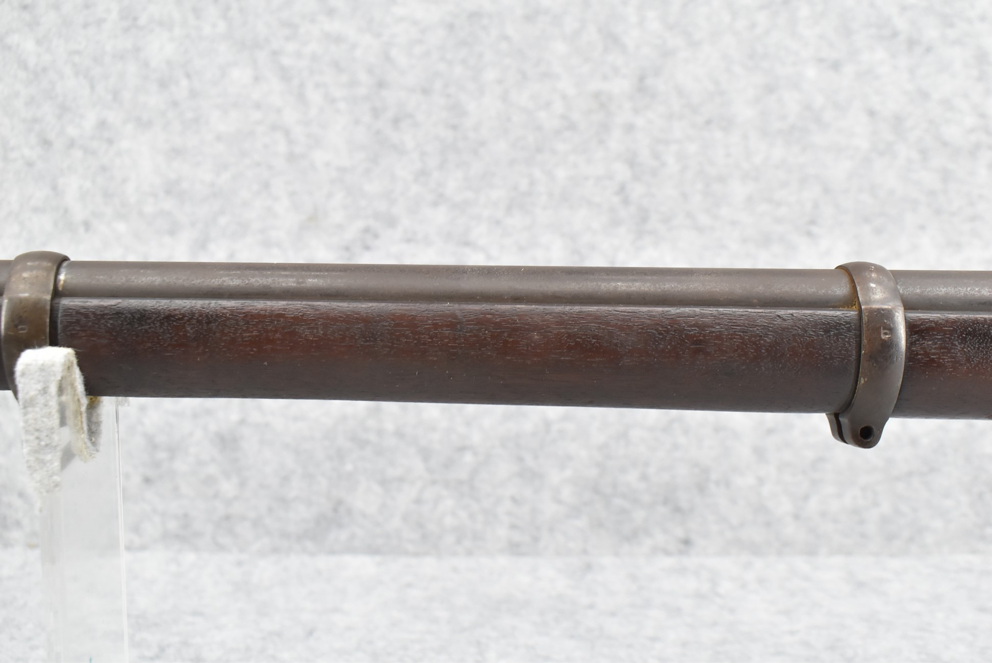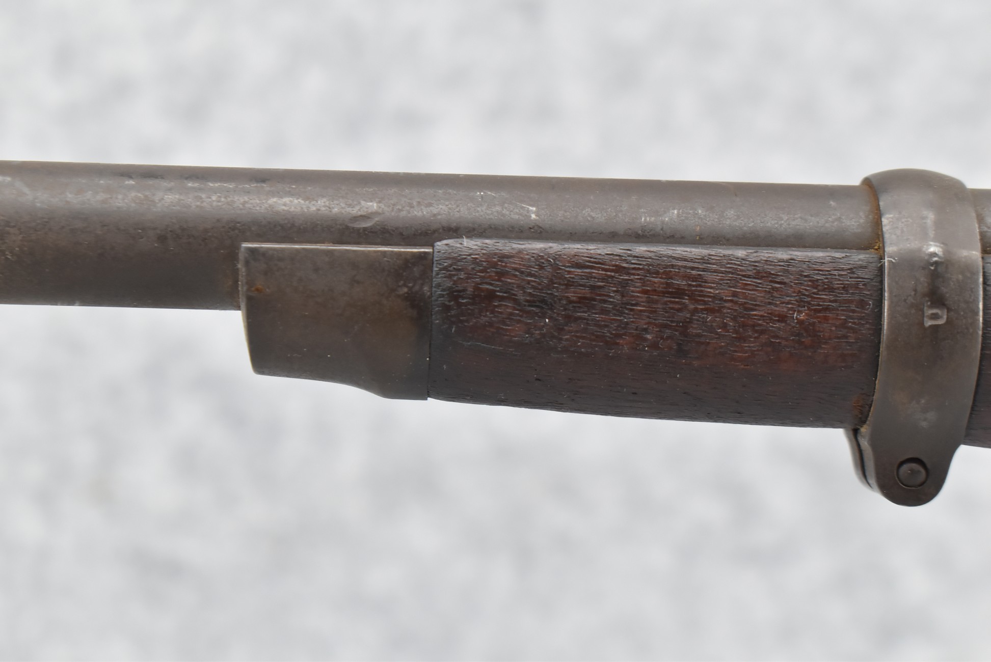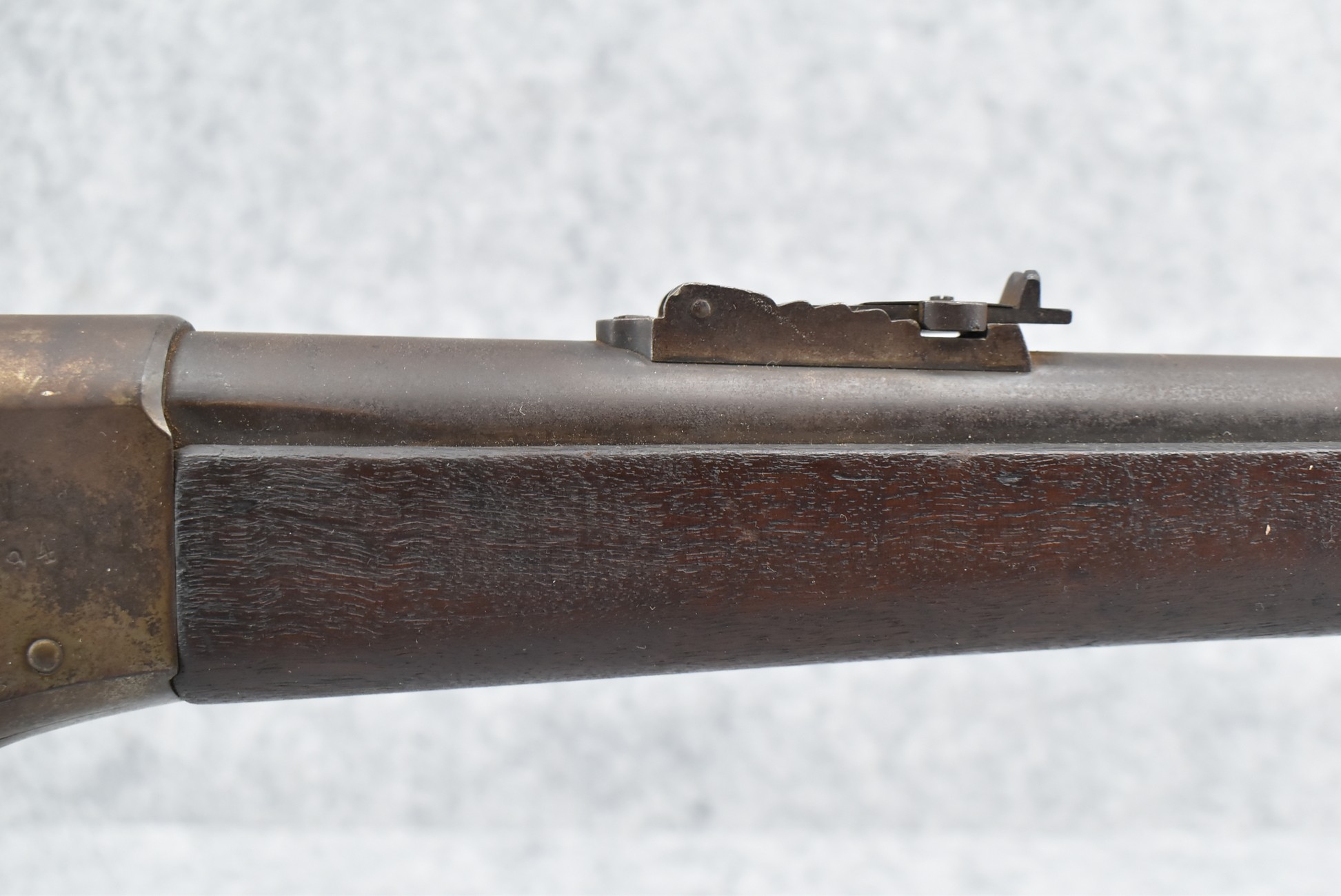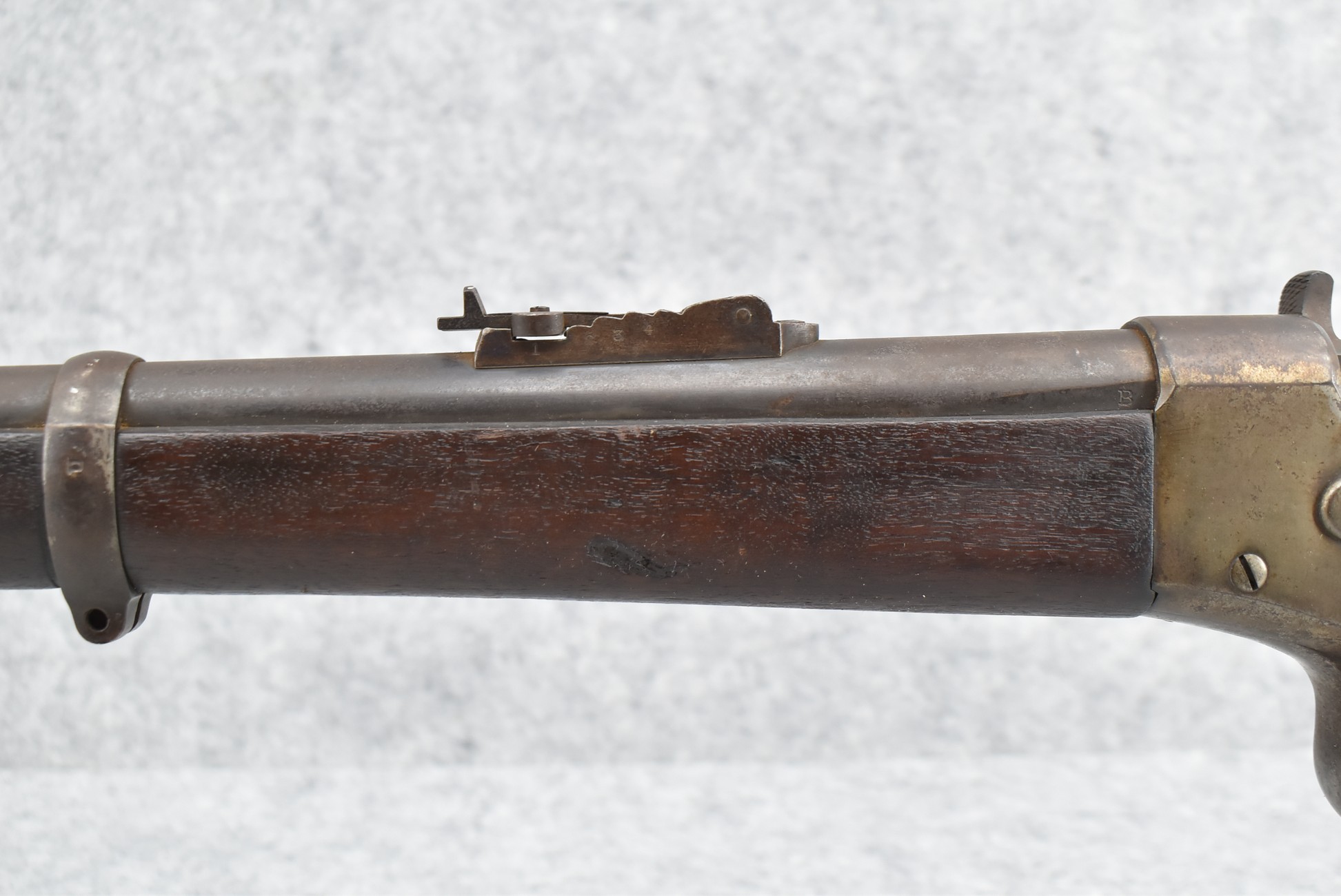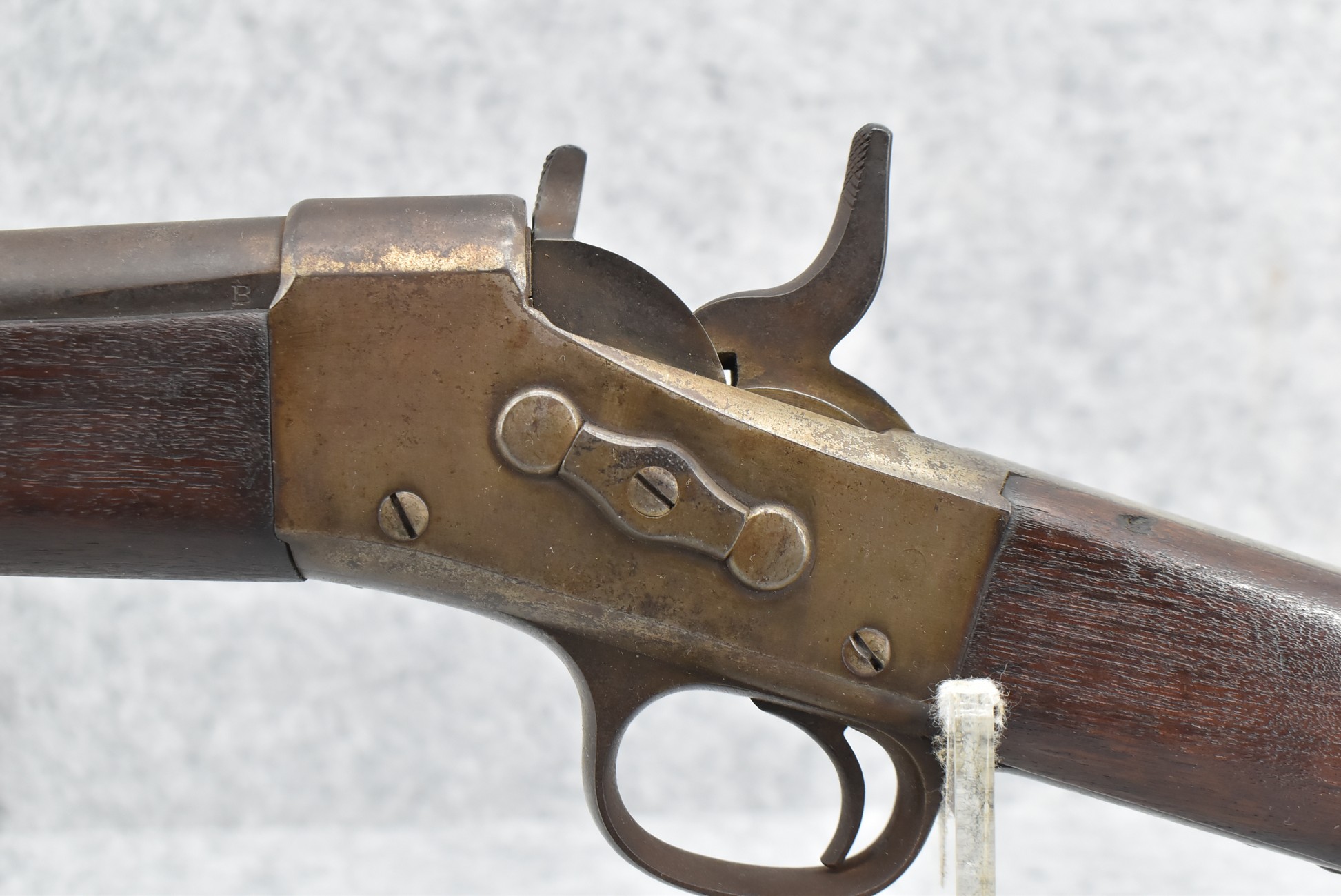 235. Remington – Mod. Rolling Block – 43 Spanish Cal. Single Shot Rifle – w/35 1/8” Barrel w/Front & Ladder Adj. Rear Sights – Gray Finish – w/Straight Grip Full Wood Military Stock Held on by 3 Barrel Bands w/Factory Metal Butt Plate – w/Sling Swivels – No Cleaning Rod