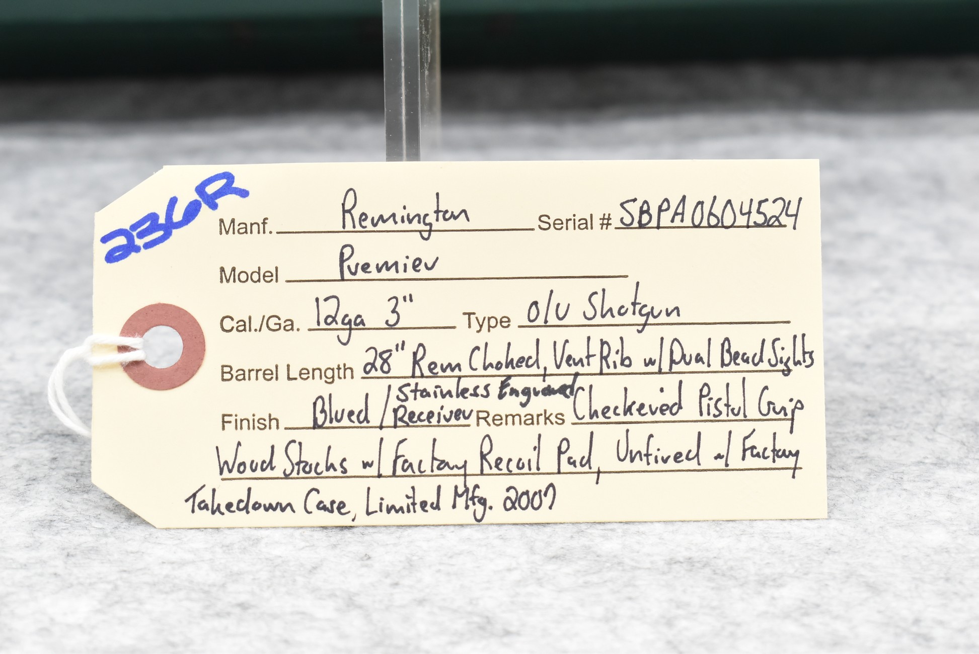 236R. Remington – Mod. Premier – 12ga. 3” Over/Under Shotgun – w/28” Rem. Choked Vent Rib Barrels w/Dual Bead Sights – Blued Finish w/Stainless Engraved Receiver – w/Checkered Pistol Grip Wood Stocks w/Factory Recoil Pad – Unfired w/Factory Takedown Case – Limited Manufacturing in 2007