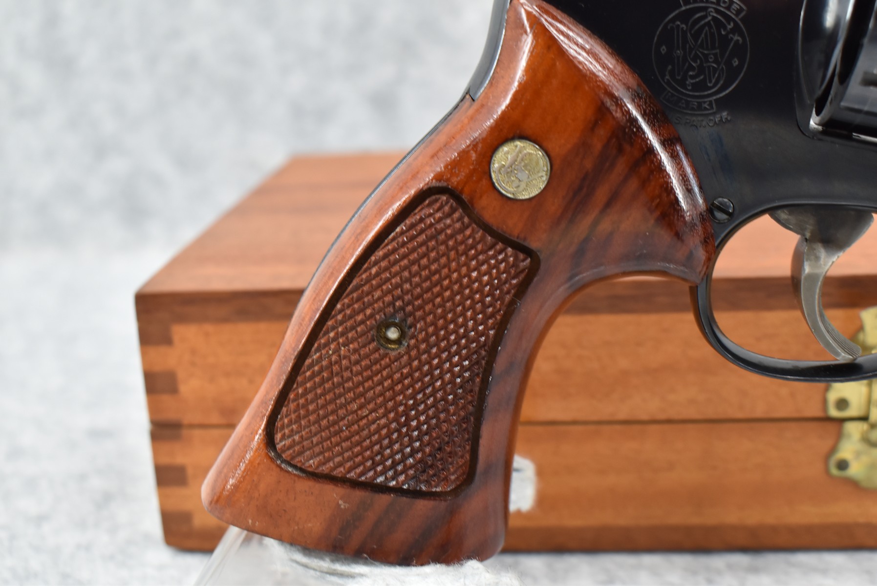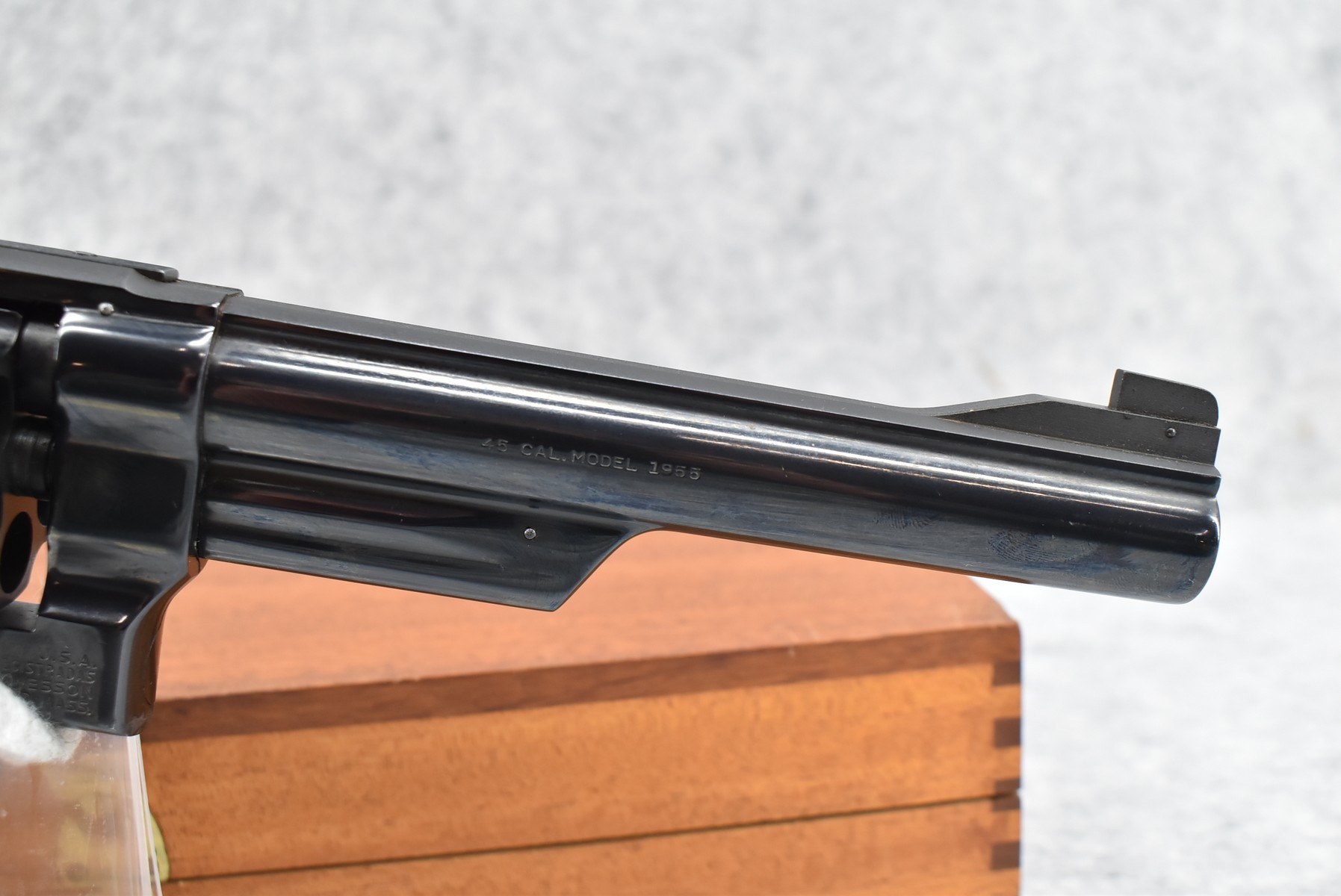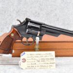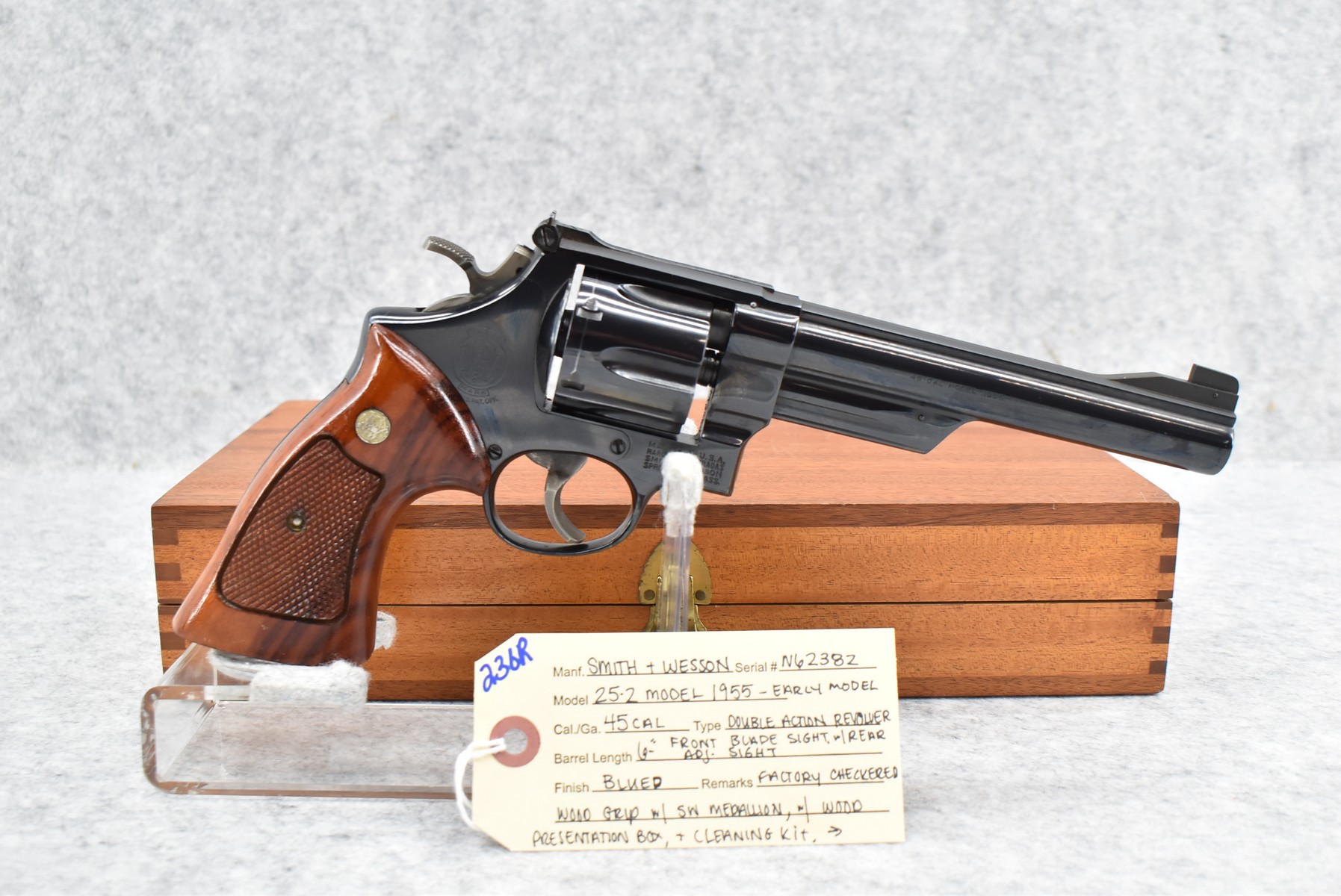 236R. Smith & Wesson – Mod. 25-2 Model 1955-Early Model – 45 ACP Cal. Double Action Revolver – w/6” Barrel w/Front Blade Sight & Rear Adj. Sight – Blued Finish – w/Factory Checkered Target Wood Grip w/S&W Medallion w/Target Trigger & Target Hammer (3T’s) – w/Wood Presentation Box & Cleaning Kit