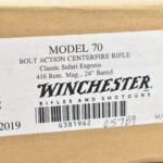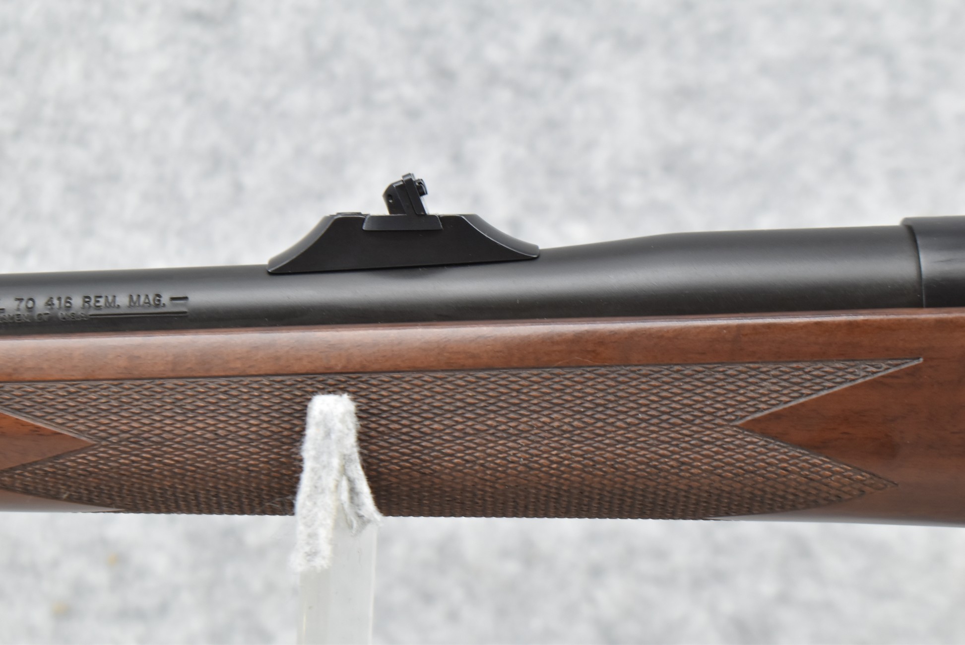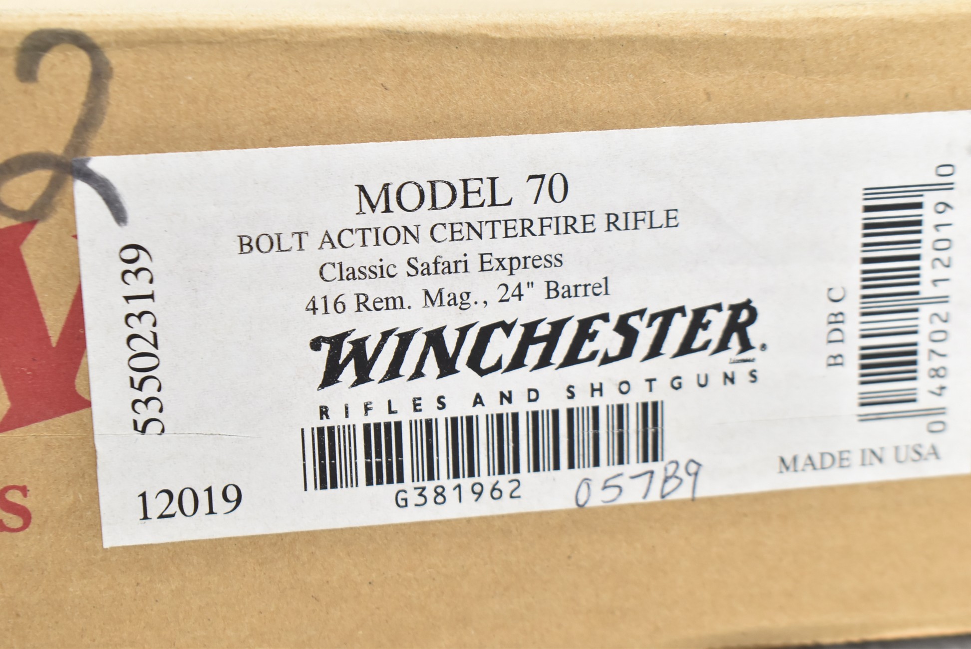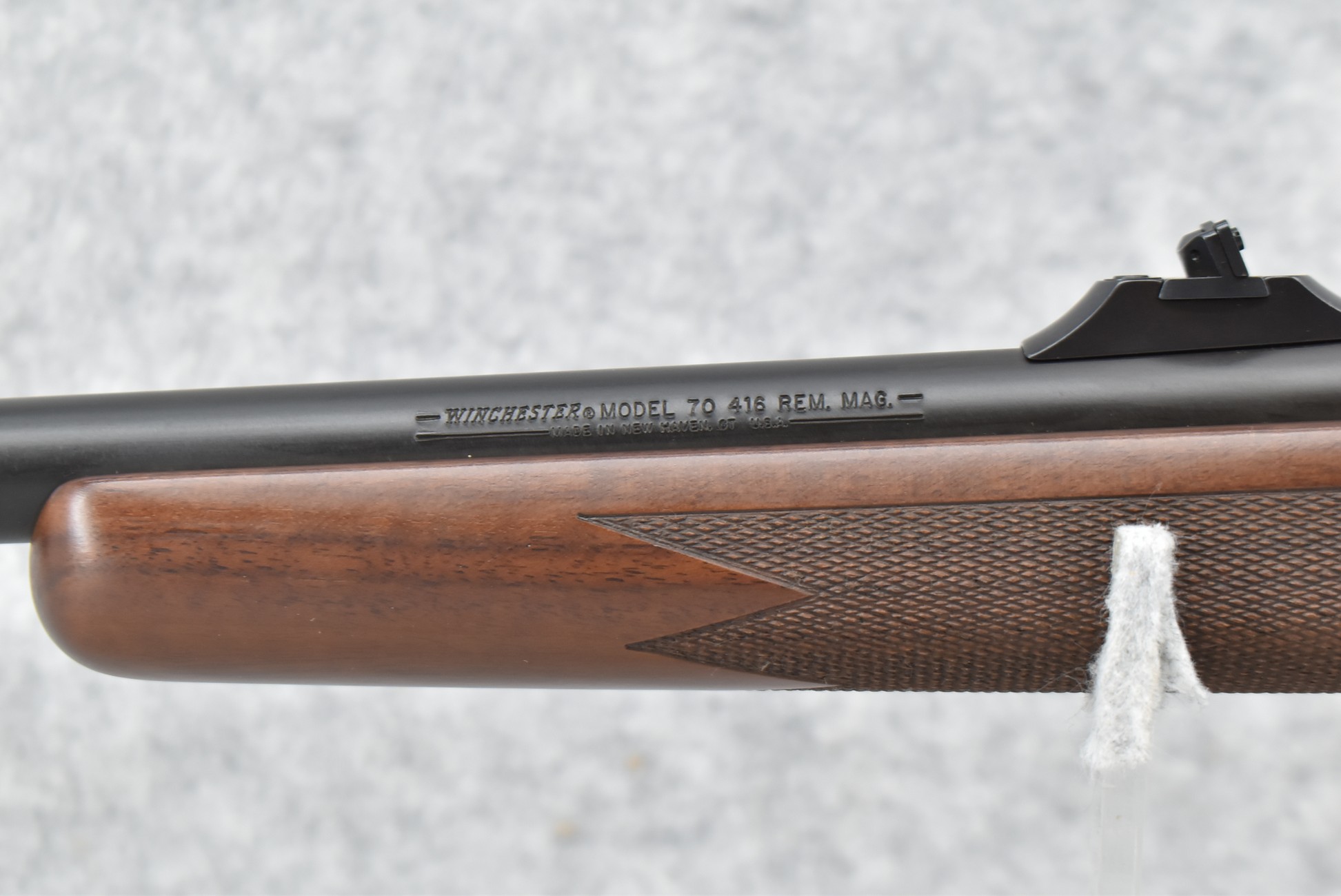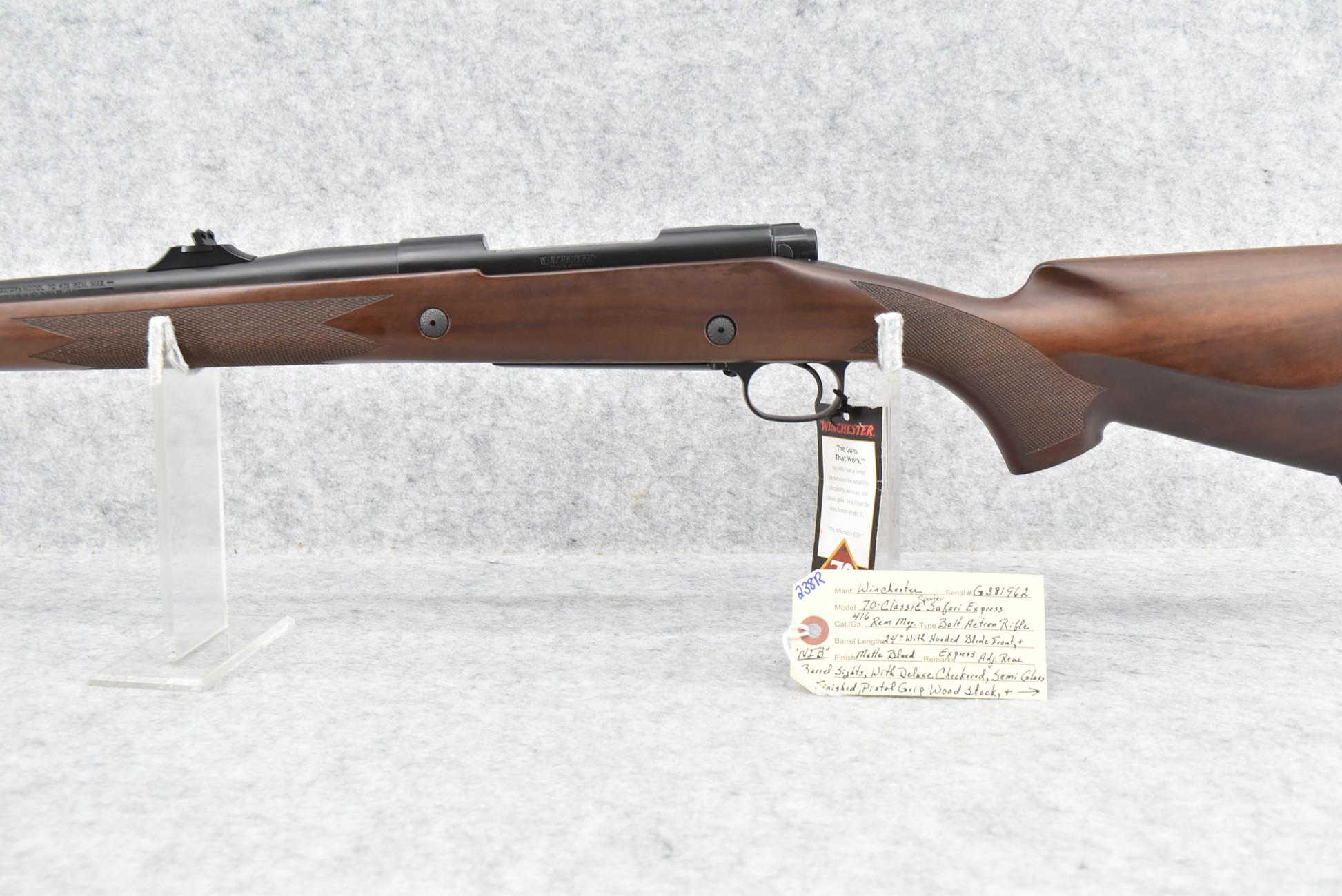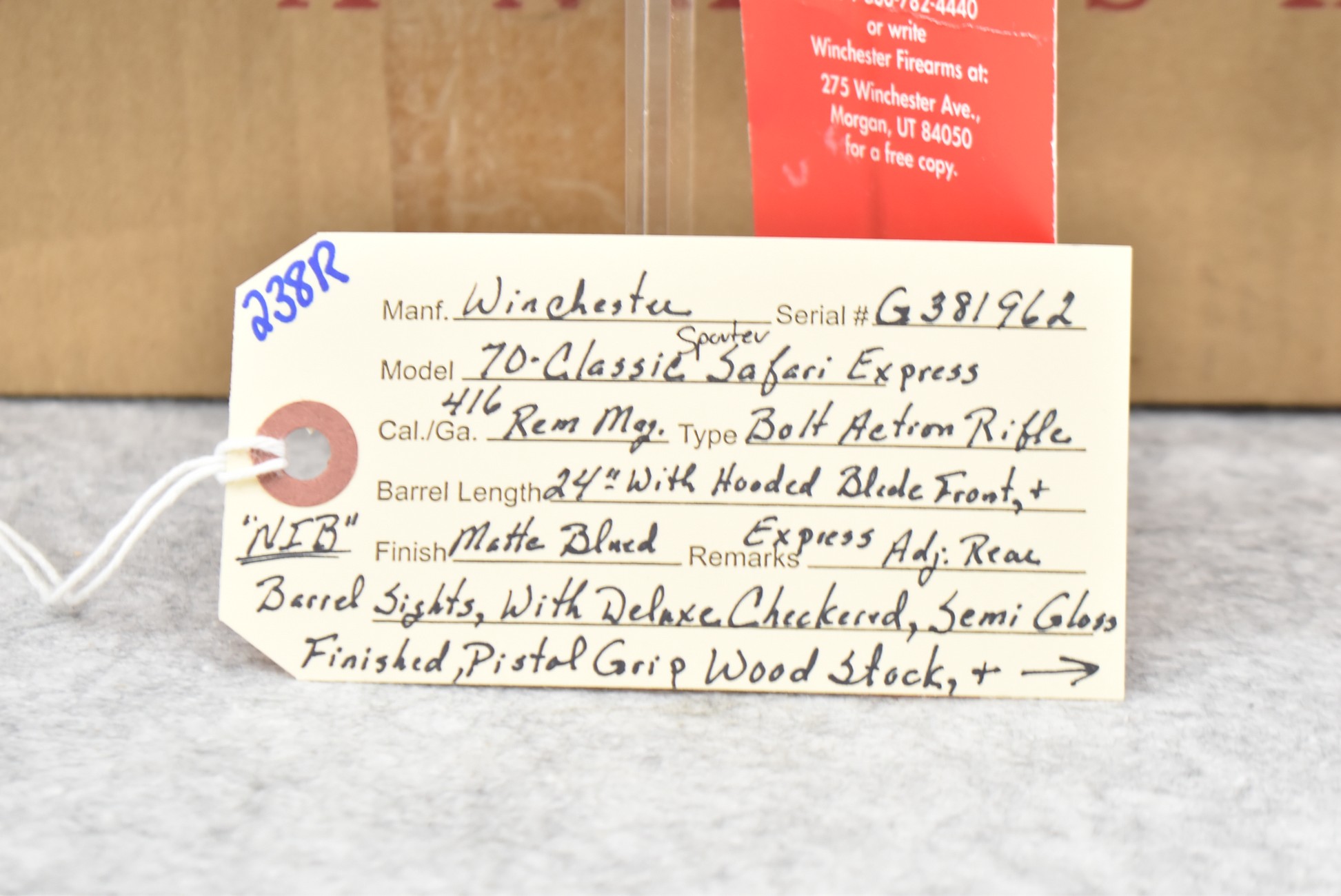 238R. Winchester – Mod. 70 Classic Sporter Safari Express – 416 Rem. Mag. Cal. Bolt Action Rifle – w/24” Barrel w/Hooded Blade Front and Express Adjustable Rear Barrel Sights – Matte Blued Finish – w/Deluxe Checkered Semi-Gloss Finished Pistol Grip Wood Stock w/Raised Cheek Rest and Factory Butt Pad – New in Factory Box w/Manual – Manufactured 1999-2006