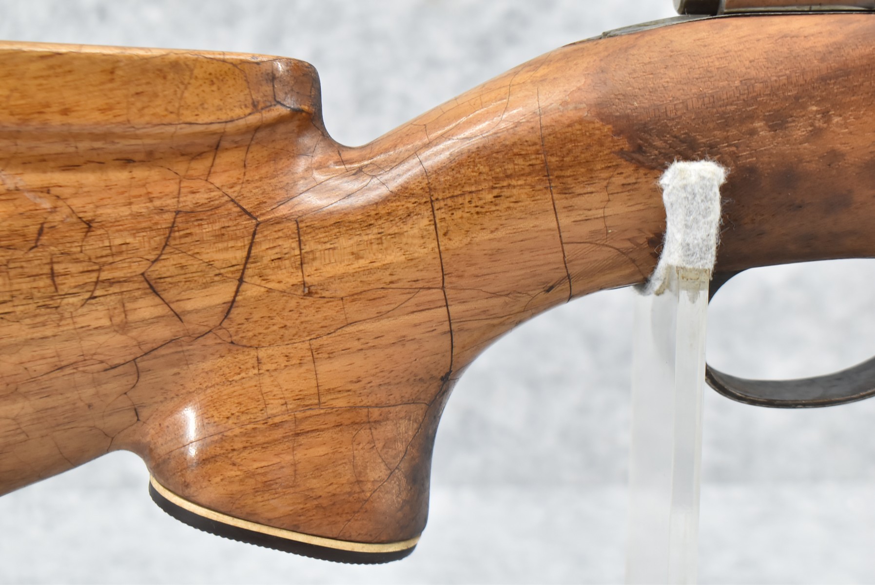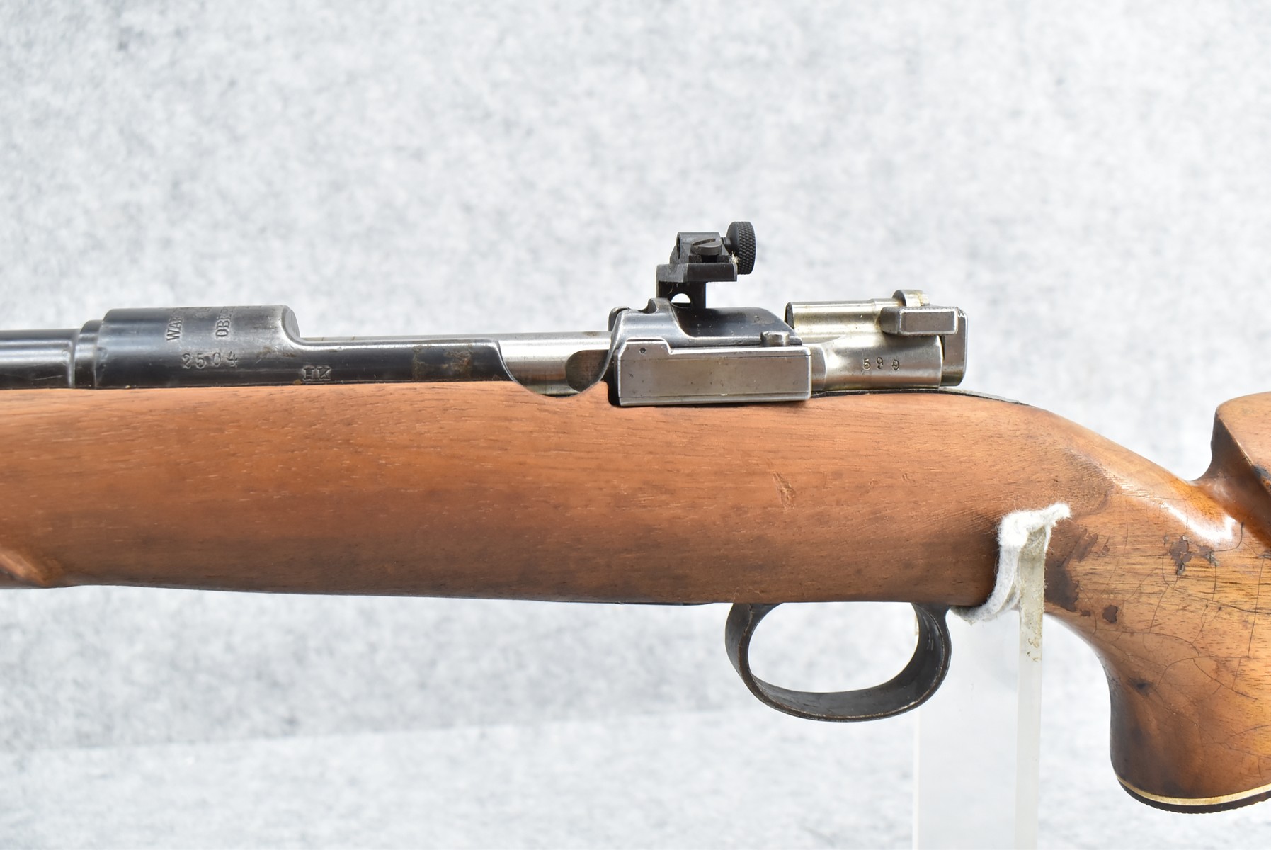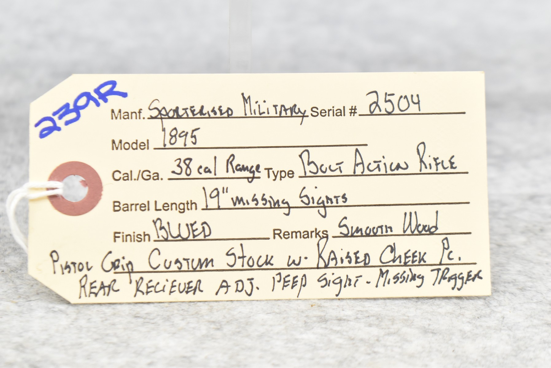 239R. Sporterized Military – Mod. 1895 – 38 Cal. Range Bolt Action Rifle – w/19” Barrel (Missing Sights) – Blued Finish – w/Custom Smooth Wood Pistol Grip Custom Stock w/Raised Cheek Piece – w/Rear Receiver Adj. Peep Sight – Note: Missing Trigger