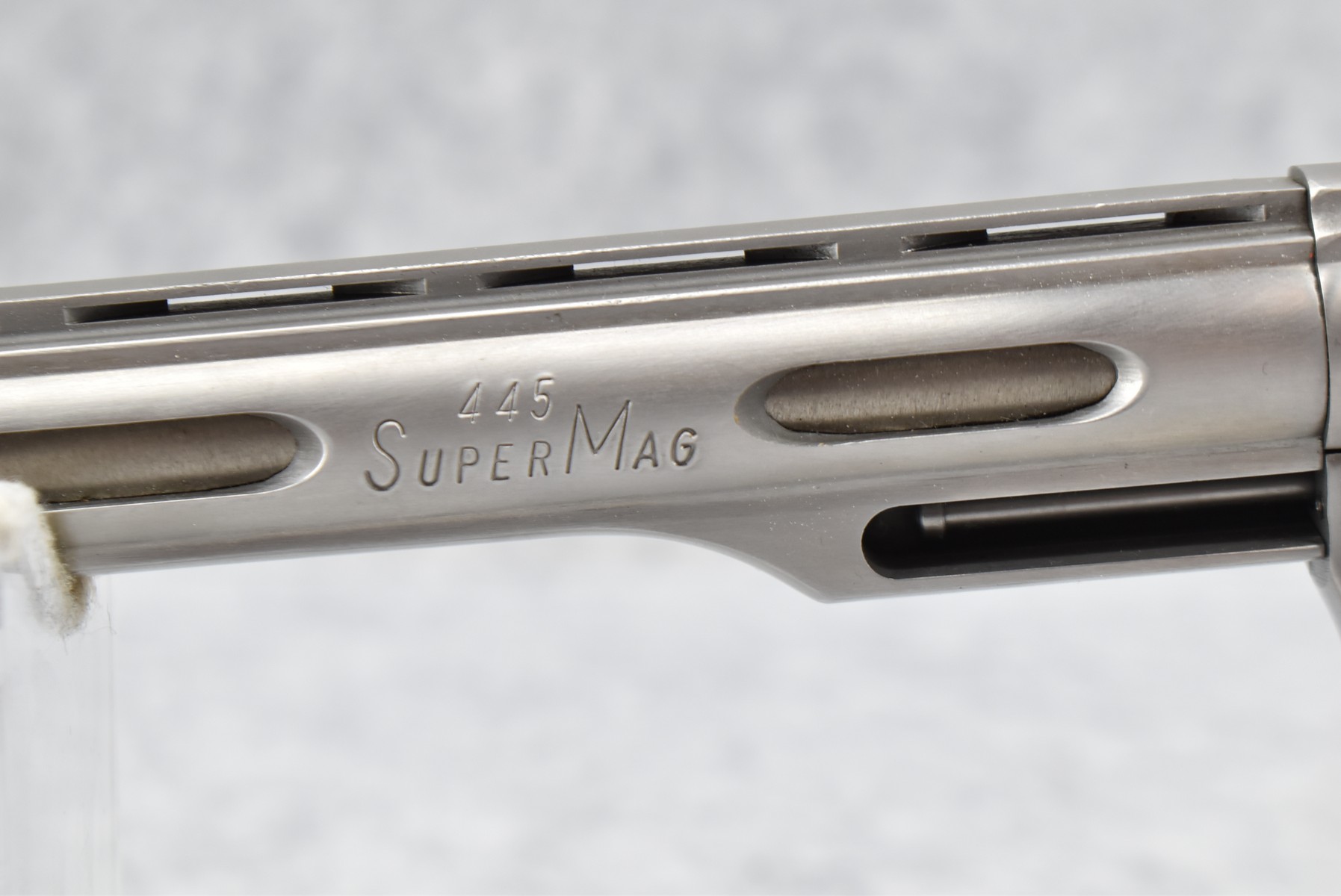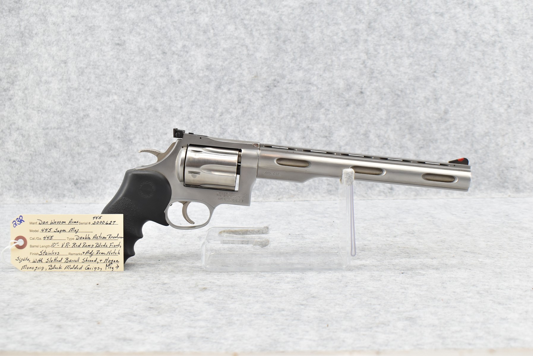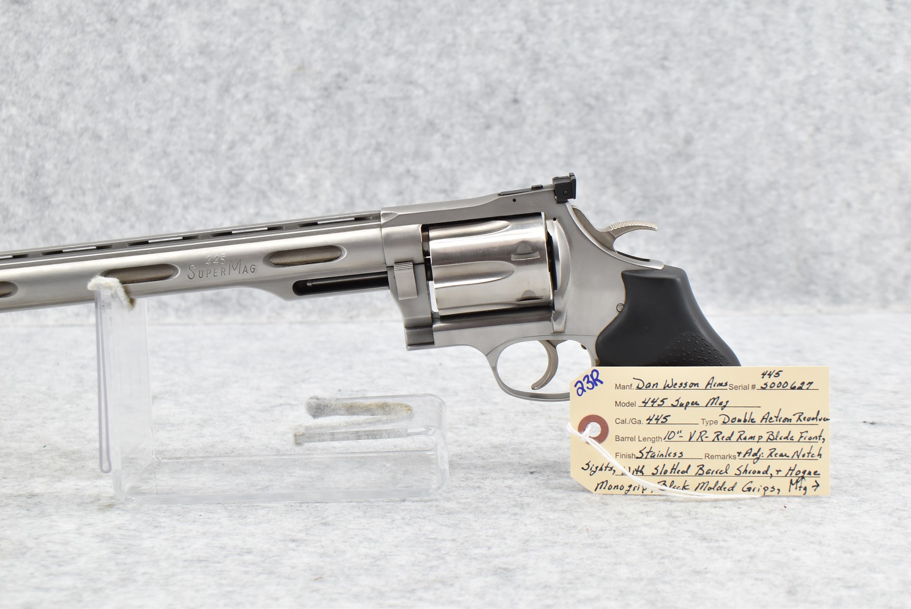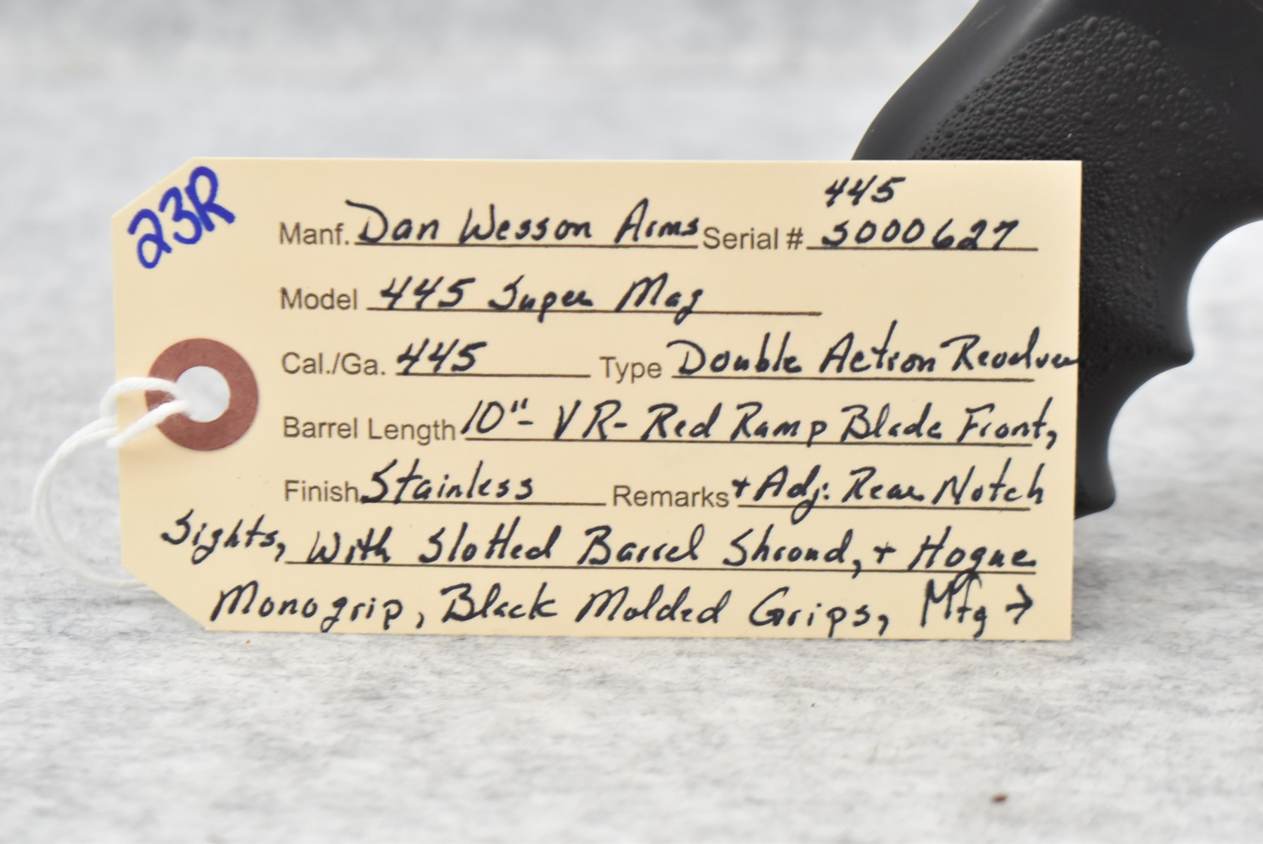 23R. Dan Wesson Arms – Mod. 445 Super Mag – 445 Super Mag. Cal. Double Action Revolver – w/10” Vent Rib Barrel w/Red Ramp Blade Front and Adjustable Rear Notch Sights – Stainless Finish – w/Hogue Monogrip Black Molded Grips – w/Slotted Barrel Shroud – Manufactured Between 1994 and 1995 Only