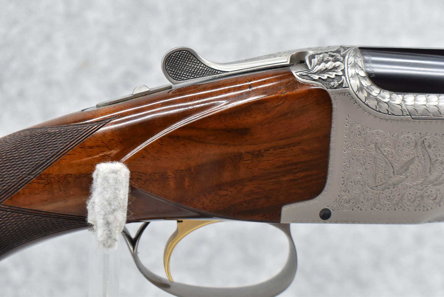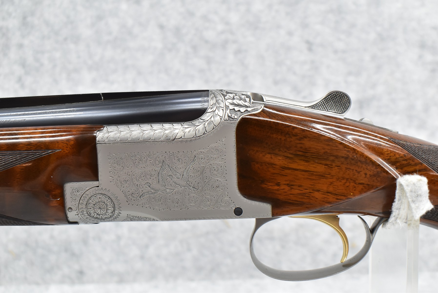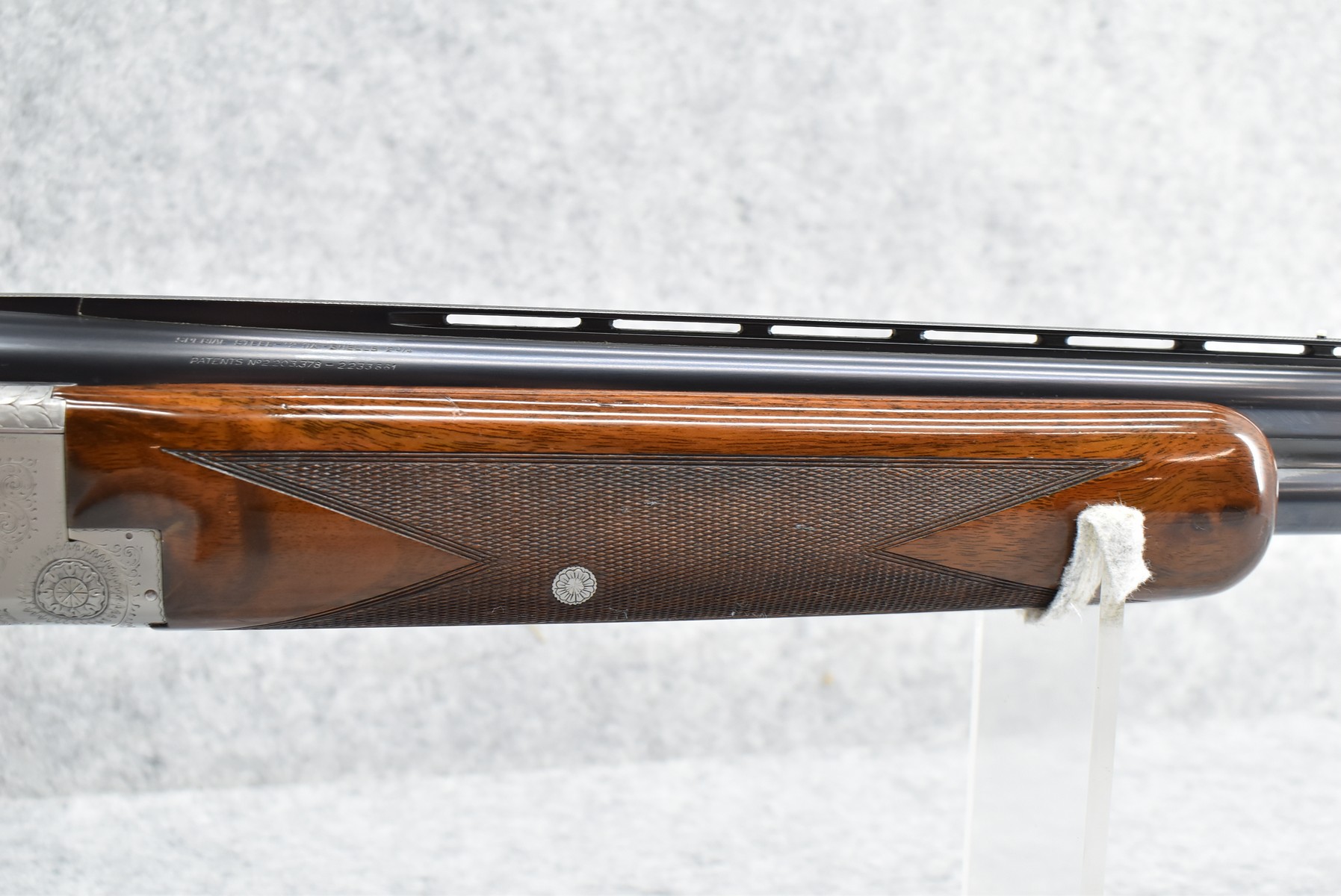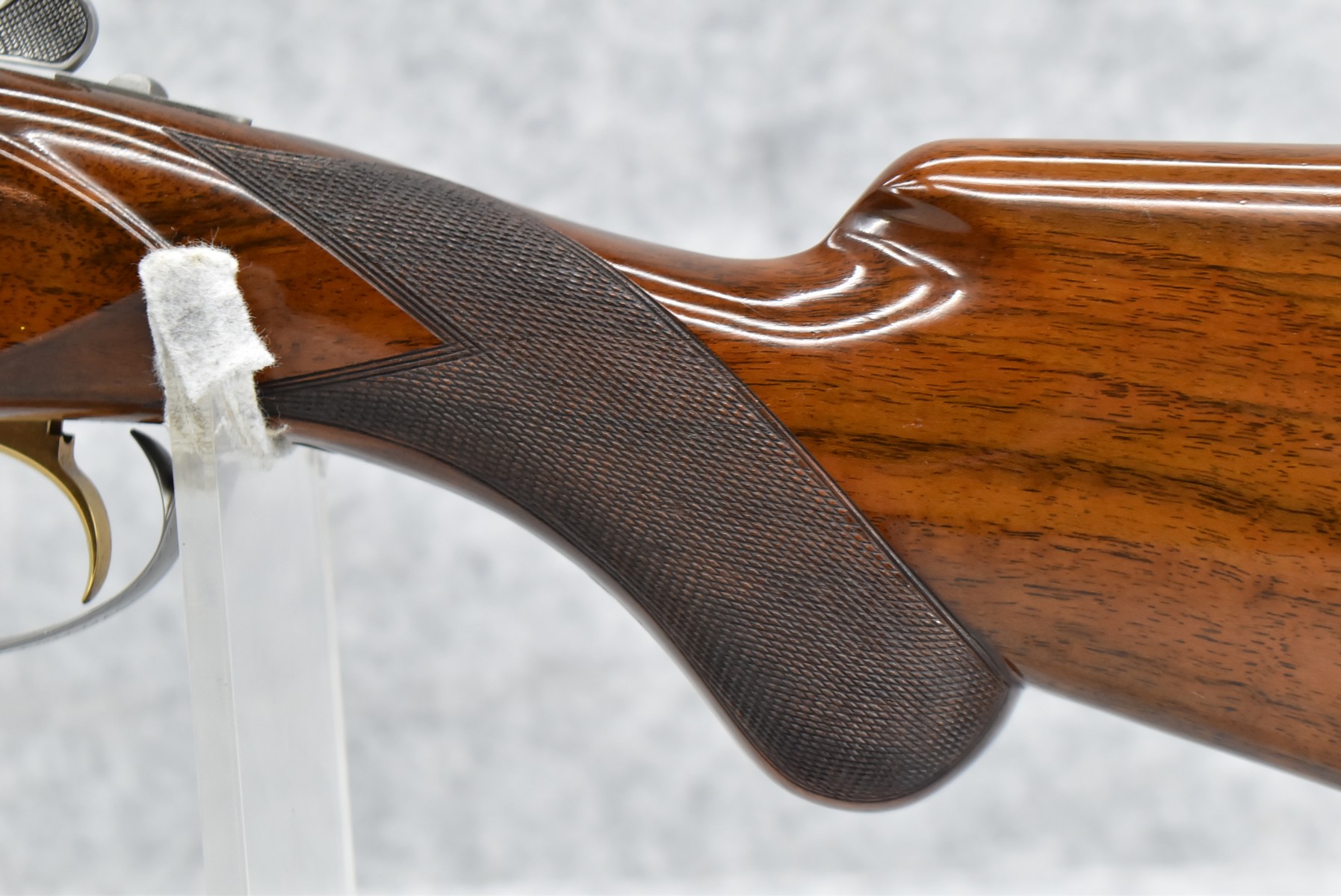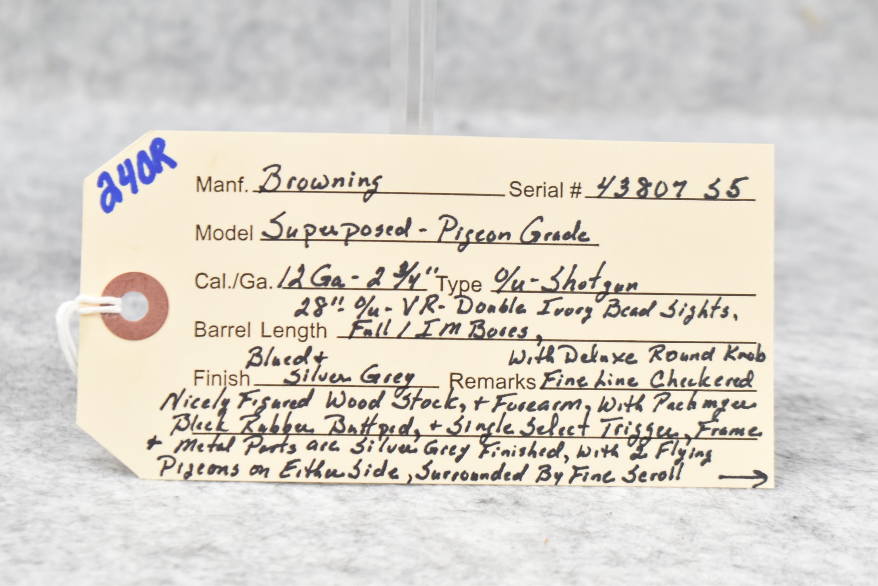 240R. Browning – Mod. Superposed Pigeon Grade – 12ga. 2 ¾” Over-Under Shotgun – w/28” Full/IM Choked, Vent-Rib Barrels w/Double Ivory Bead Sights – Blued & Silver Gray Receiver Finish – Frame & Metal Parts Are Silver Gray Finished & Engraved w/2 Flying Pigeons on Either Side, Surrounded by Fine Scroll Engraving on Boths Sides, Bottom, Tangs, Trigger Guard & Forearm Latch – w/Deluxe Round Knob Fine Line Checkered Nicely Figured Wood Stocks w/Pachmayr Butt Pad – w/Single Select Trigger