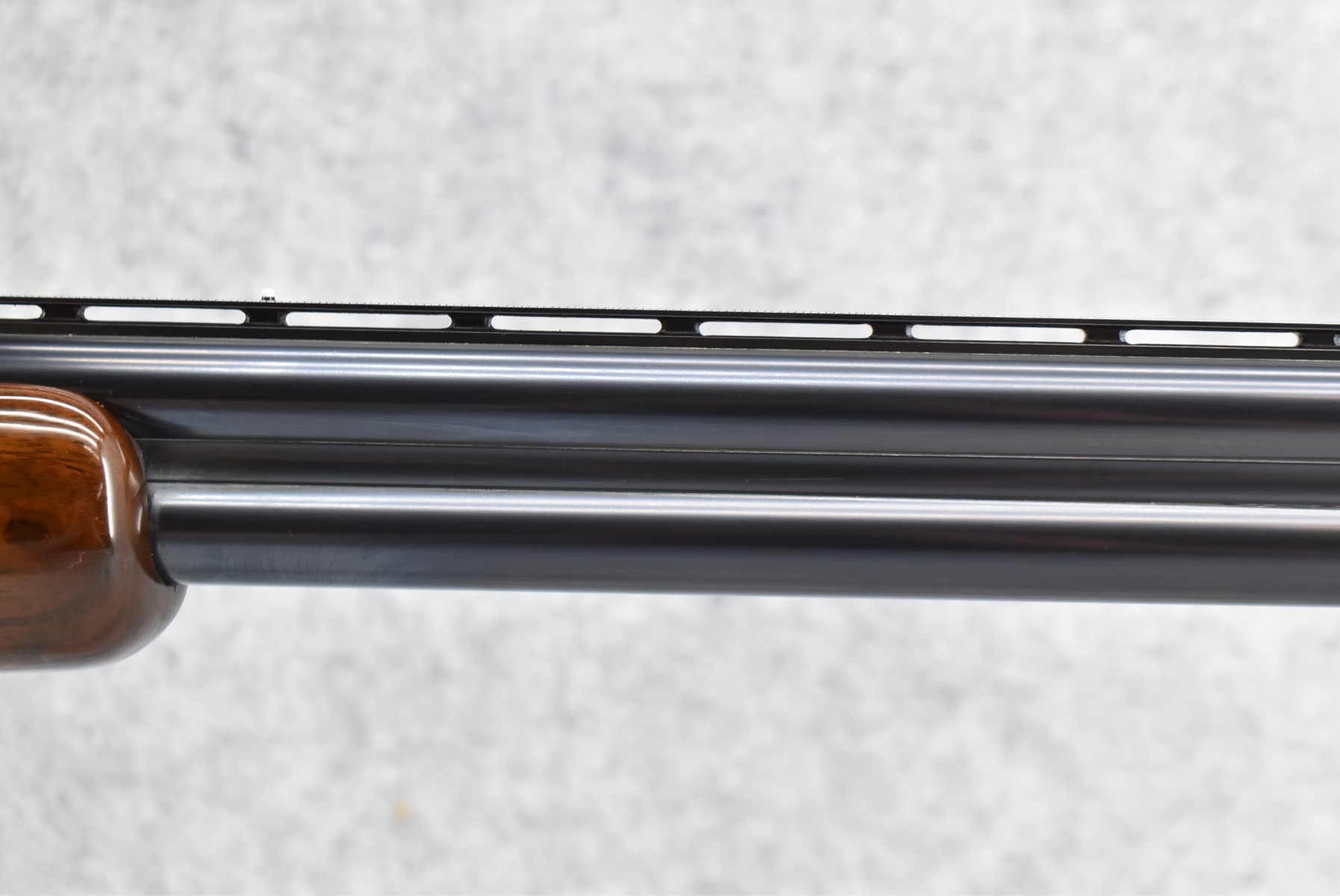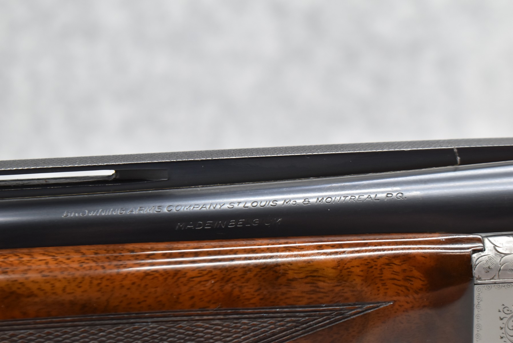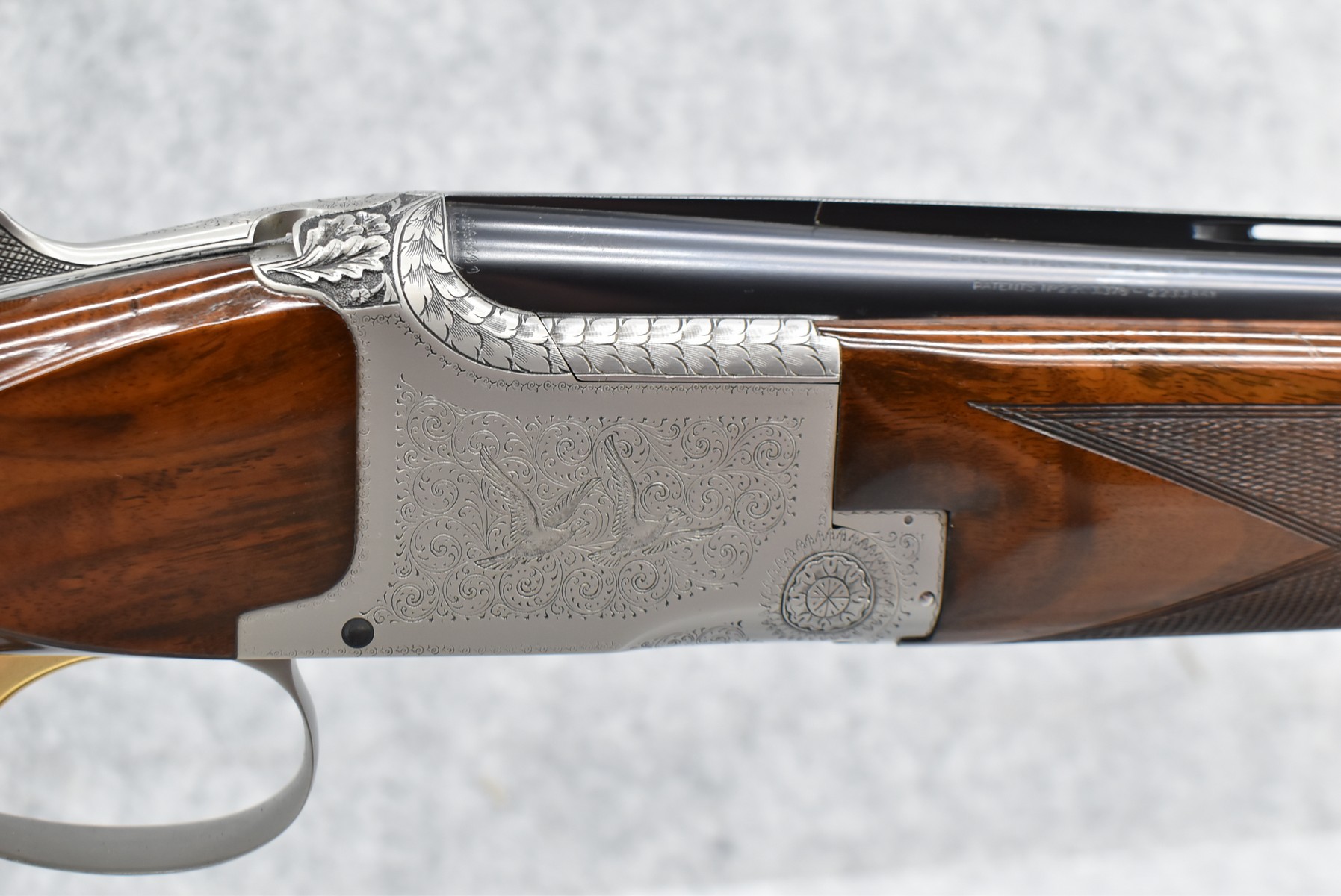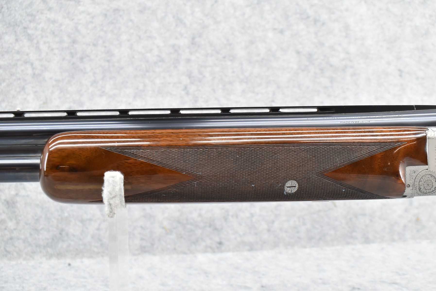 240R. Browning – Mod. Superposed Pigeon Grade – 12ga. 2 ¾” Over-Under Shotgun – w/28” Full/IM Choked, Vent-Rib Barrels w/Double Ivory Bead Sights – Blued & Silver Gray Receiver Finish – Frame & Metal Parts Are Silver Gray Finished & Engraved w/2 Flying Pigeons on Either Side, Surrounded by Fine Scroll Engraving on Boths Sides, Bottom, Tangs, Trigger Guard & Forearm Latch – w/Deluxe Round Knob Fine Line Checkered Nicely Figured Wood Stocks w/Pachmayr Butt Pad – w/Single Select Trigger