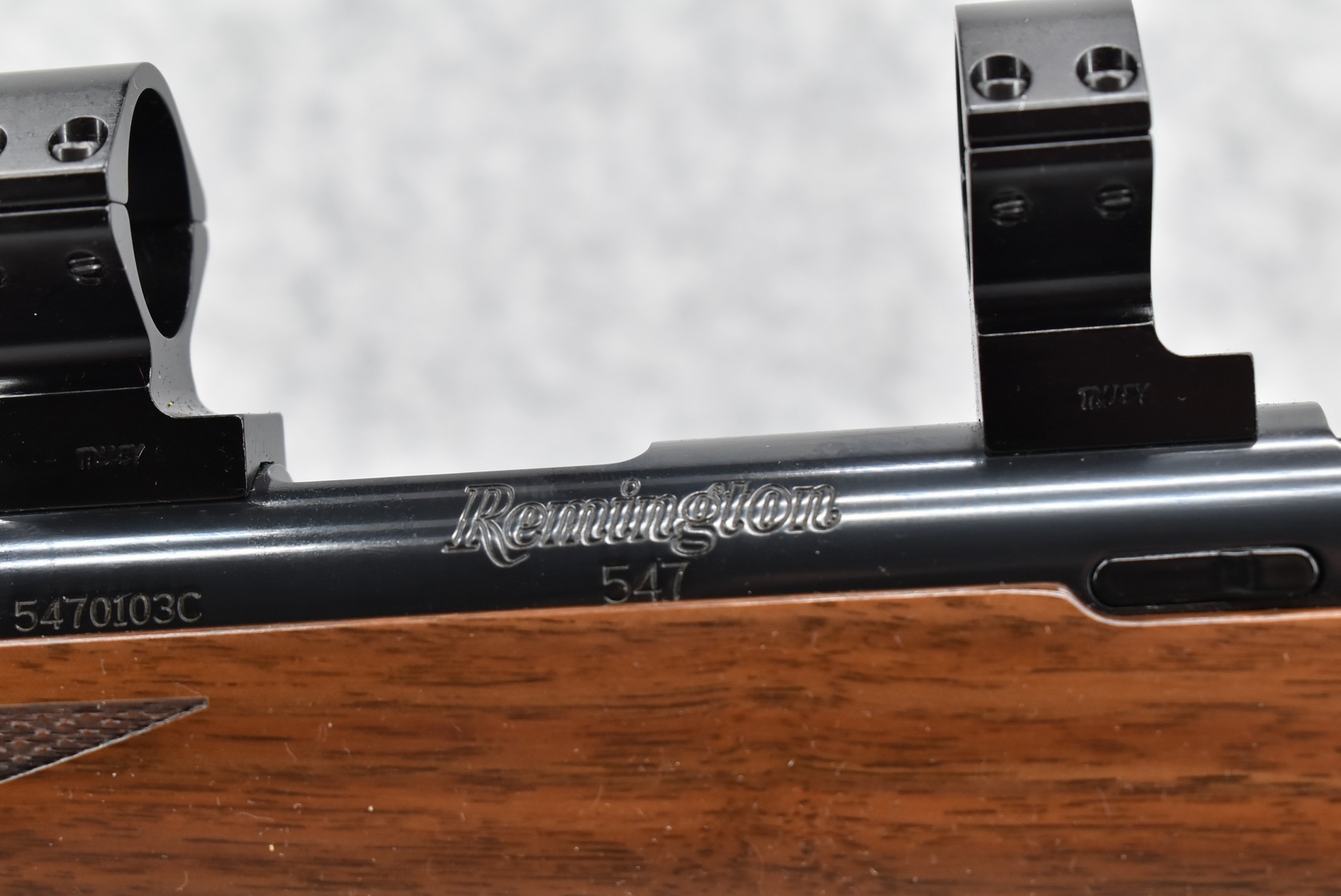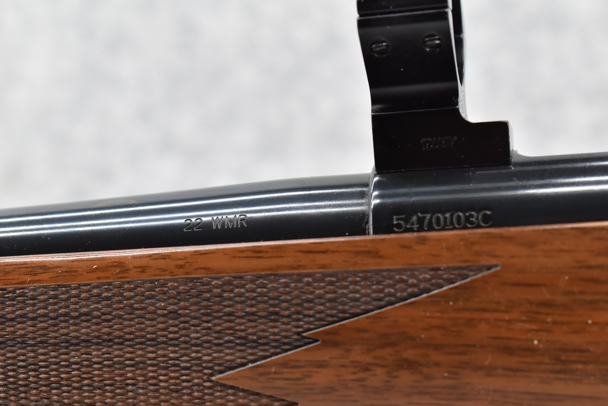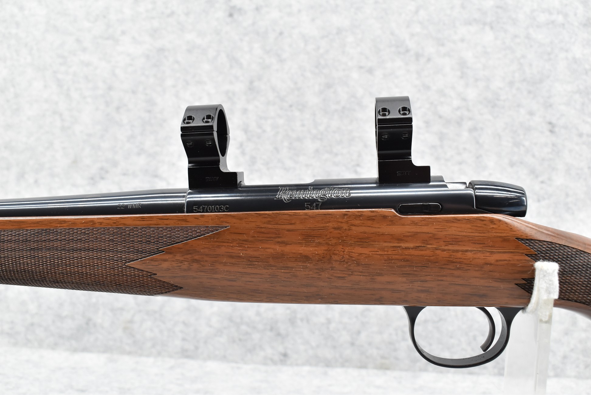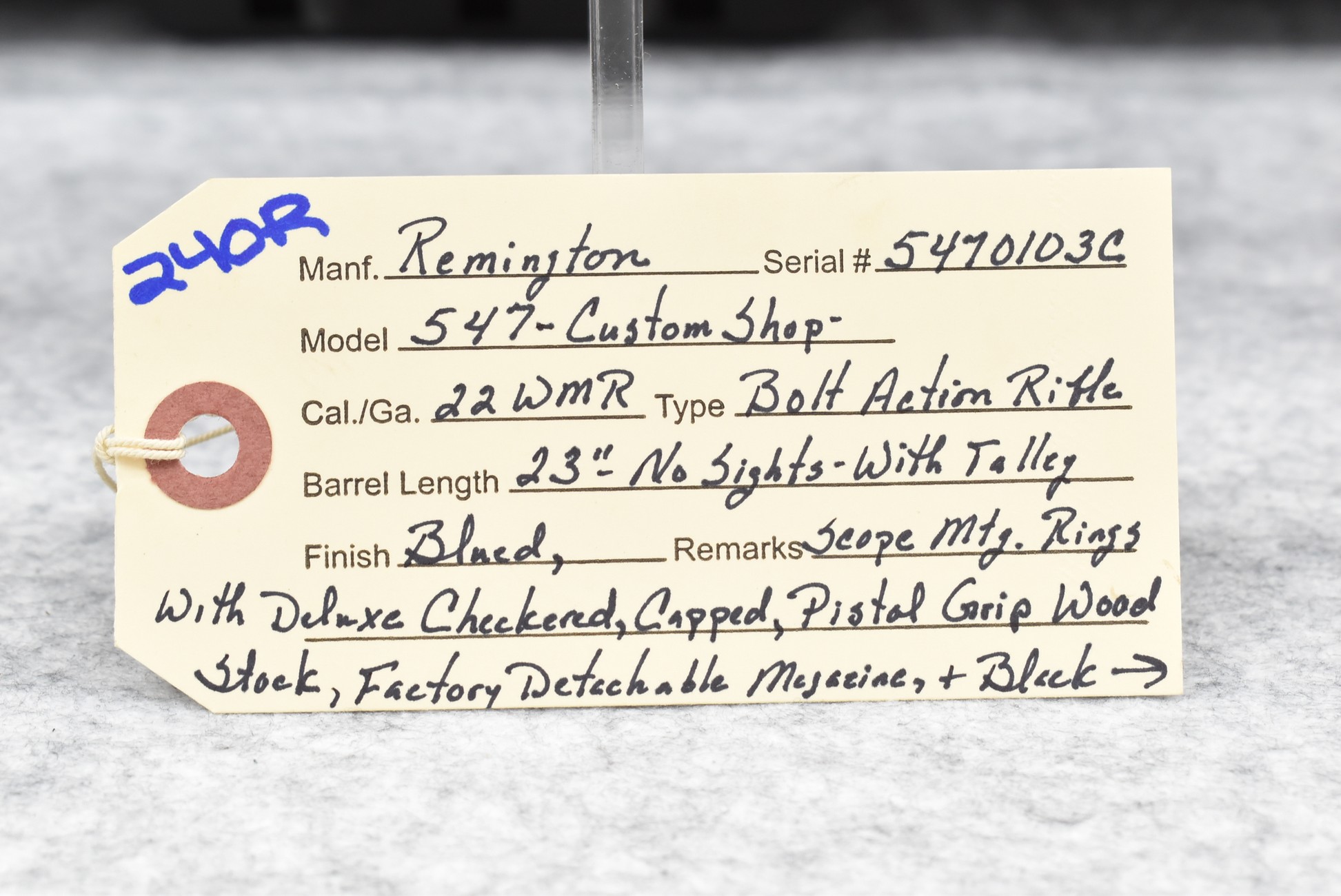 240R. Remington – Mod. 547 Custom Shop – 22 WMR Cal. Bolt Action Rifle – w/23” Barrel – Blued Finish – w/Deluxe Checkered Capped Pistol Grip Wood Stock w/Butt Pad – w/Factory Detachable Magazine – w/Talley Scope Mounting Rings – w/Factory Remington Custom Shop SKB Hard Case