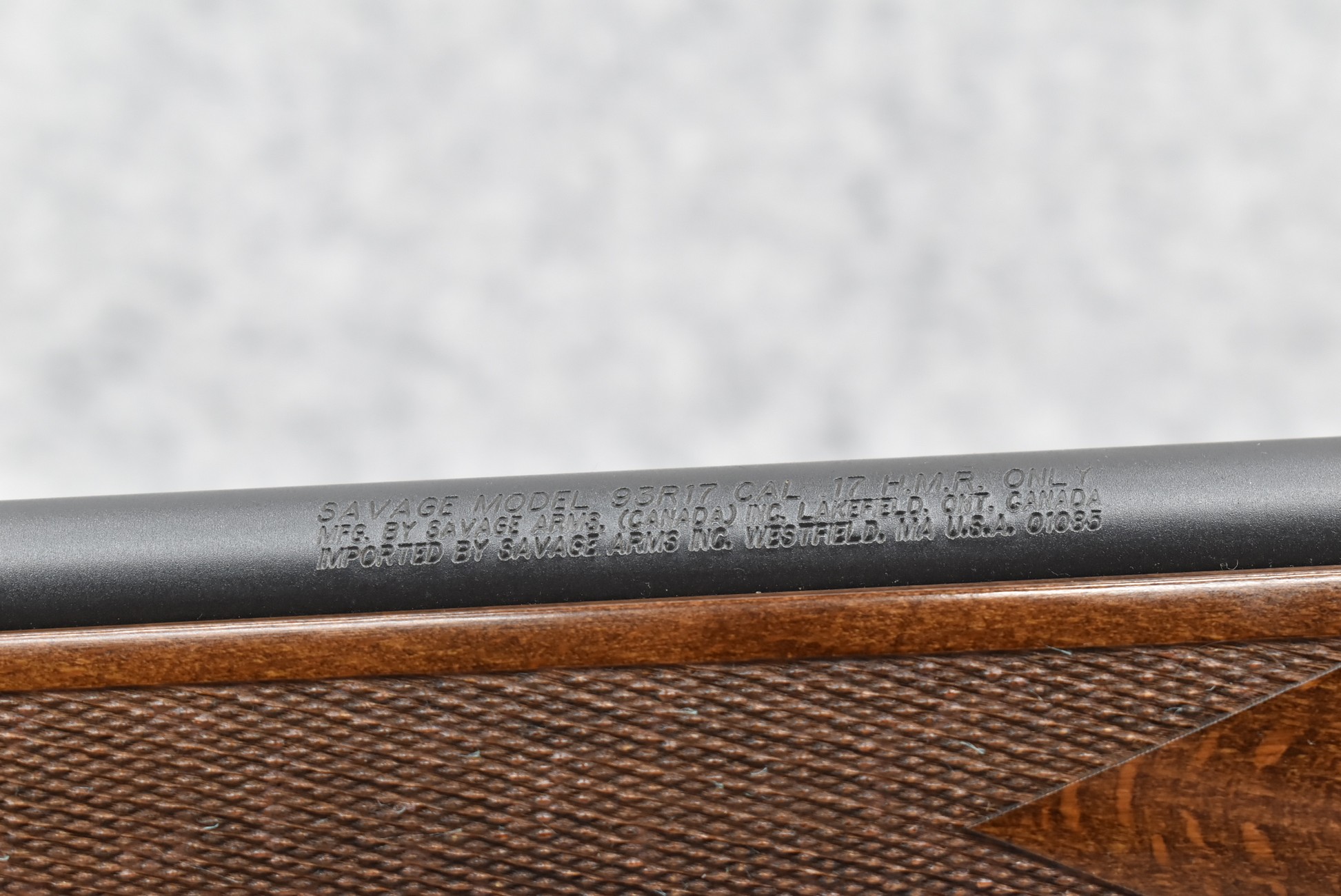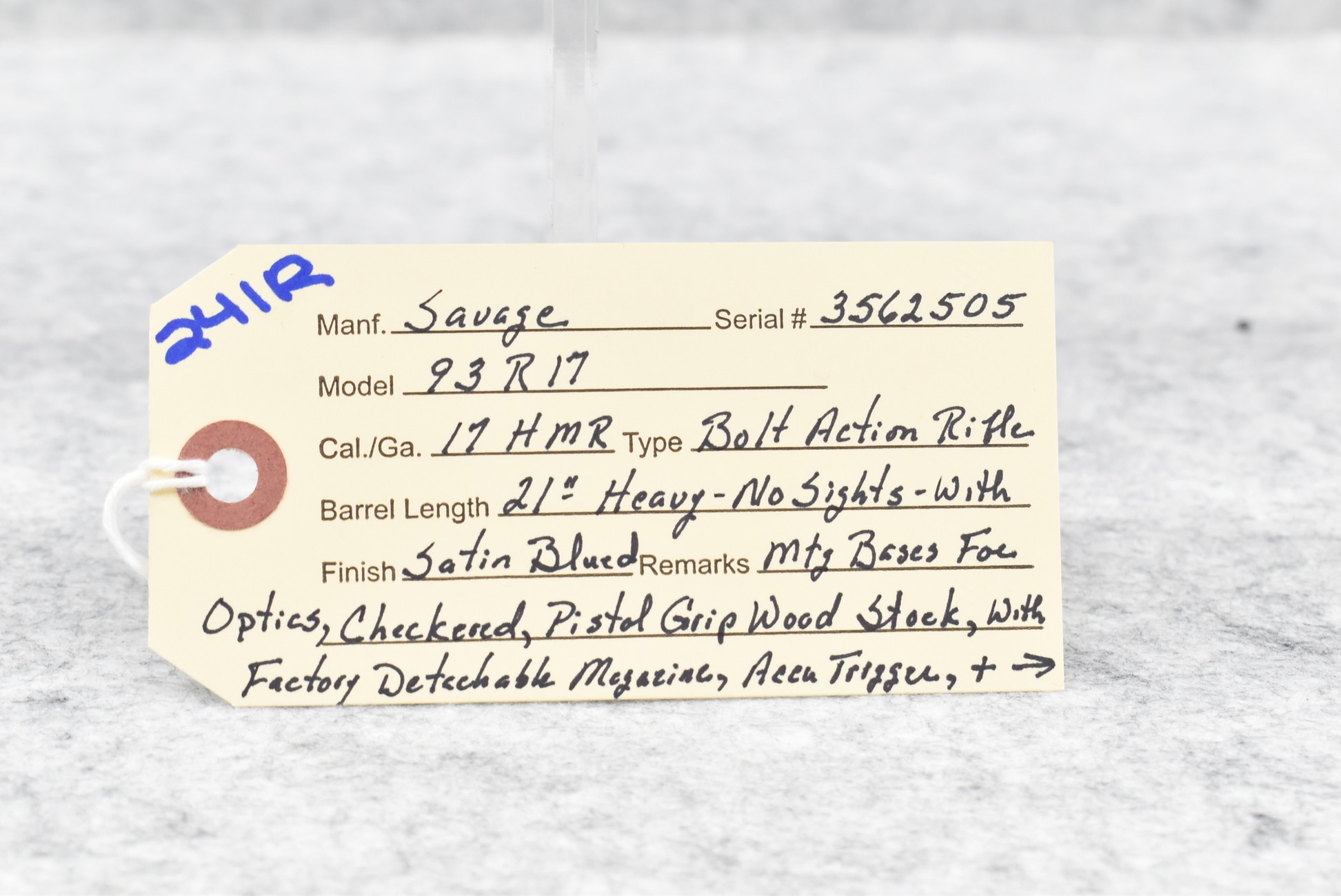 241R. Savage – Mod. 93 R17 – 17 HMR Cal. Bolt Action Rifle – w/21” Heavy Barrel – Satin Blued Finish – w/Checkered Pistol Grip Wood Stock w/Factory Butt Plate – w/Factory Detachable Magazine – w/Accu Trigger – w/Mounting Bases for Optics