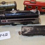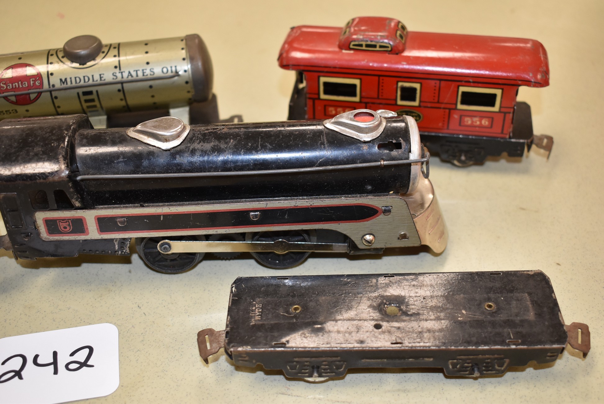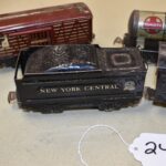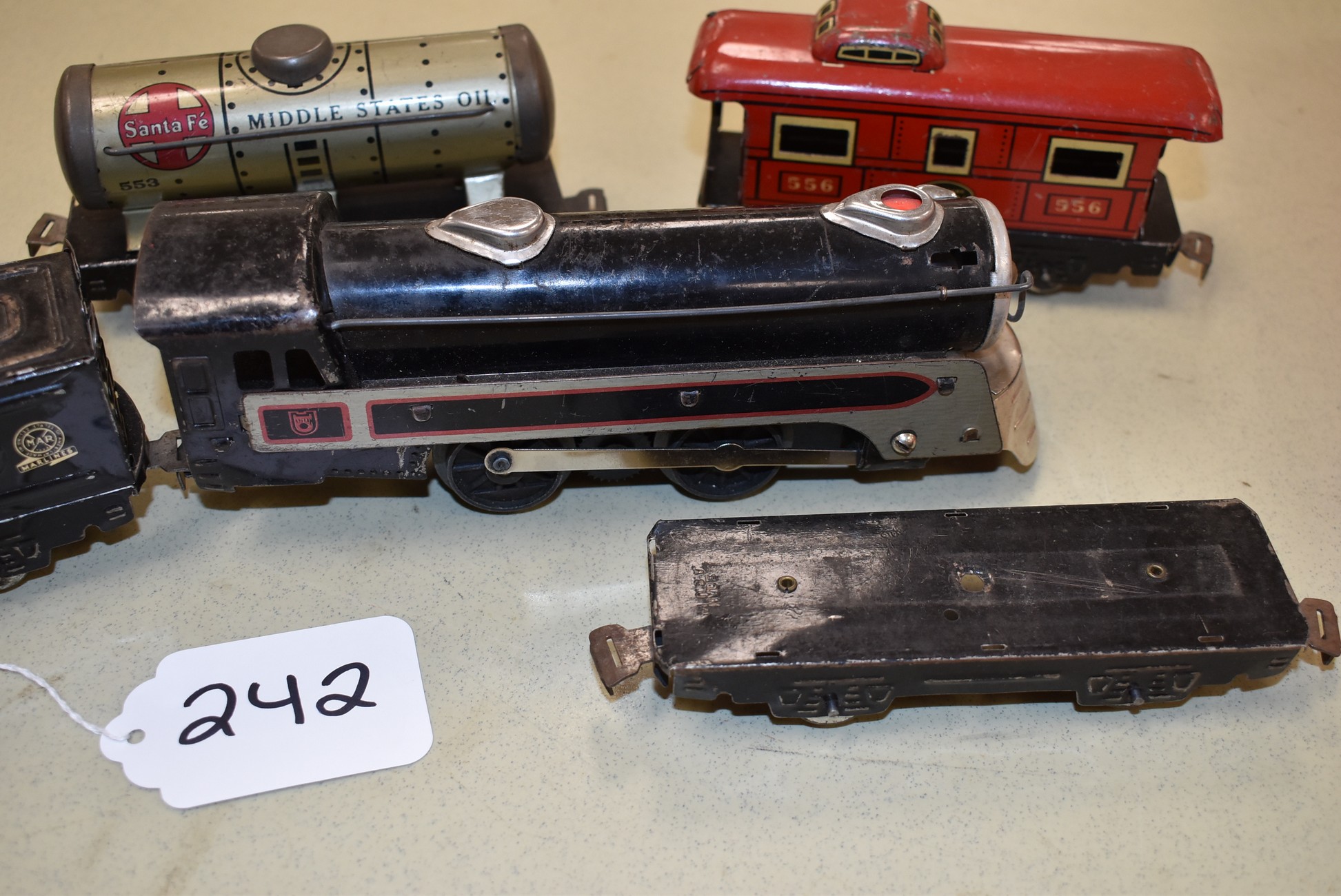 242. Marx Train Set – Including New York Central Engine and Tender, Car 553 Santa Fe Oil, Car 59 Union Pacific Cattle Car, Flat Car, and 556 NYC Caboose – No Boxes
