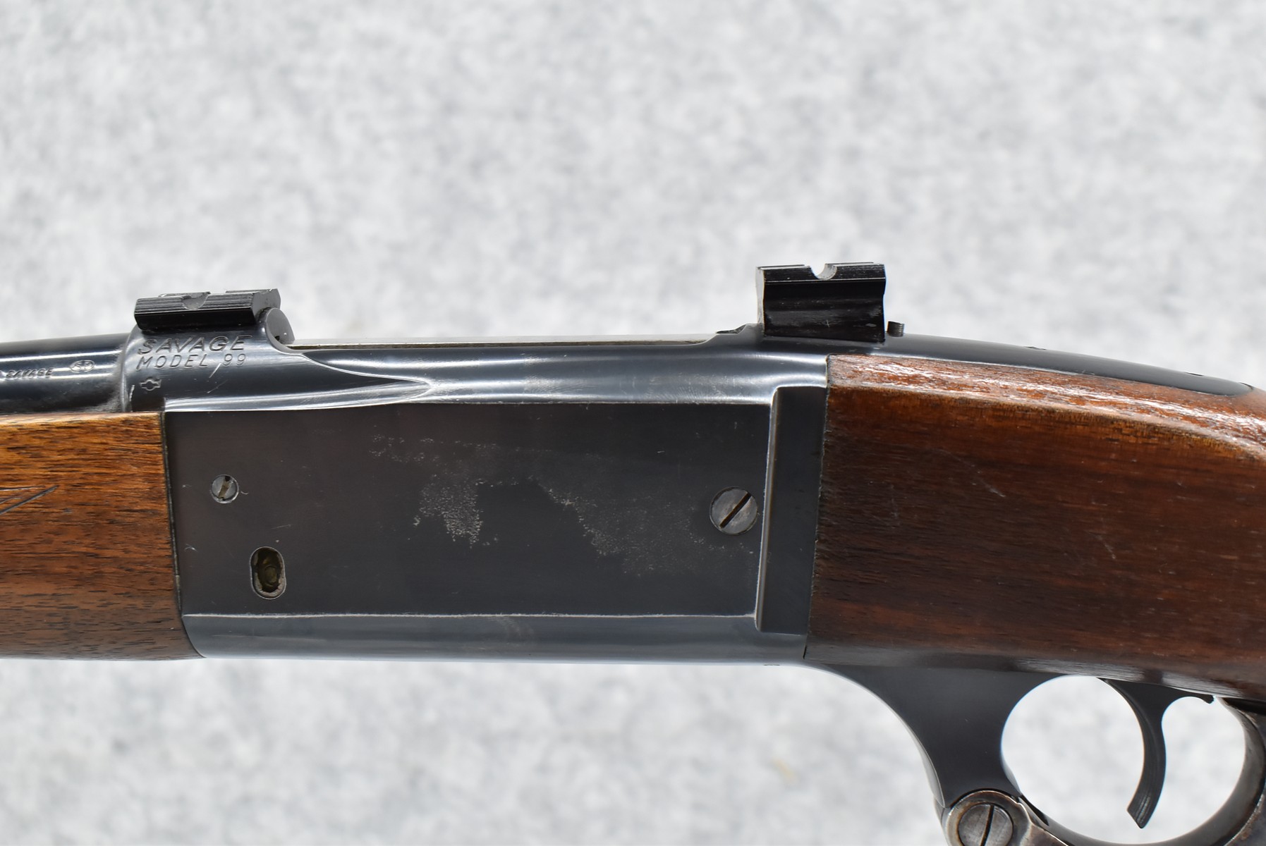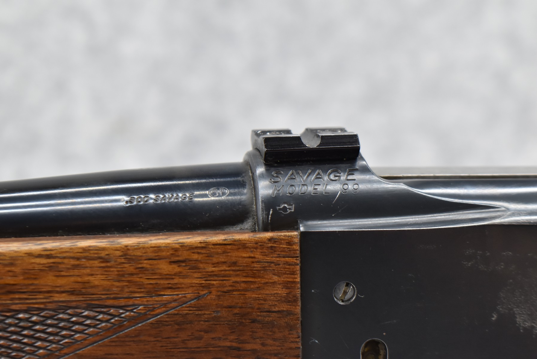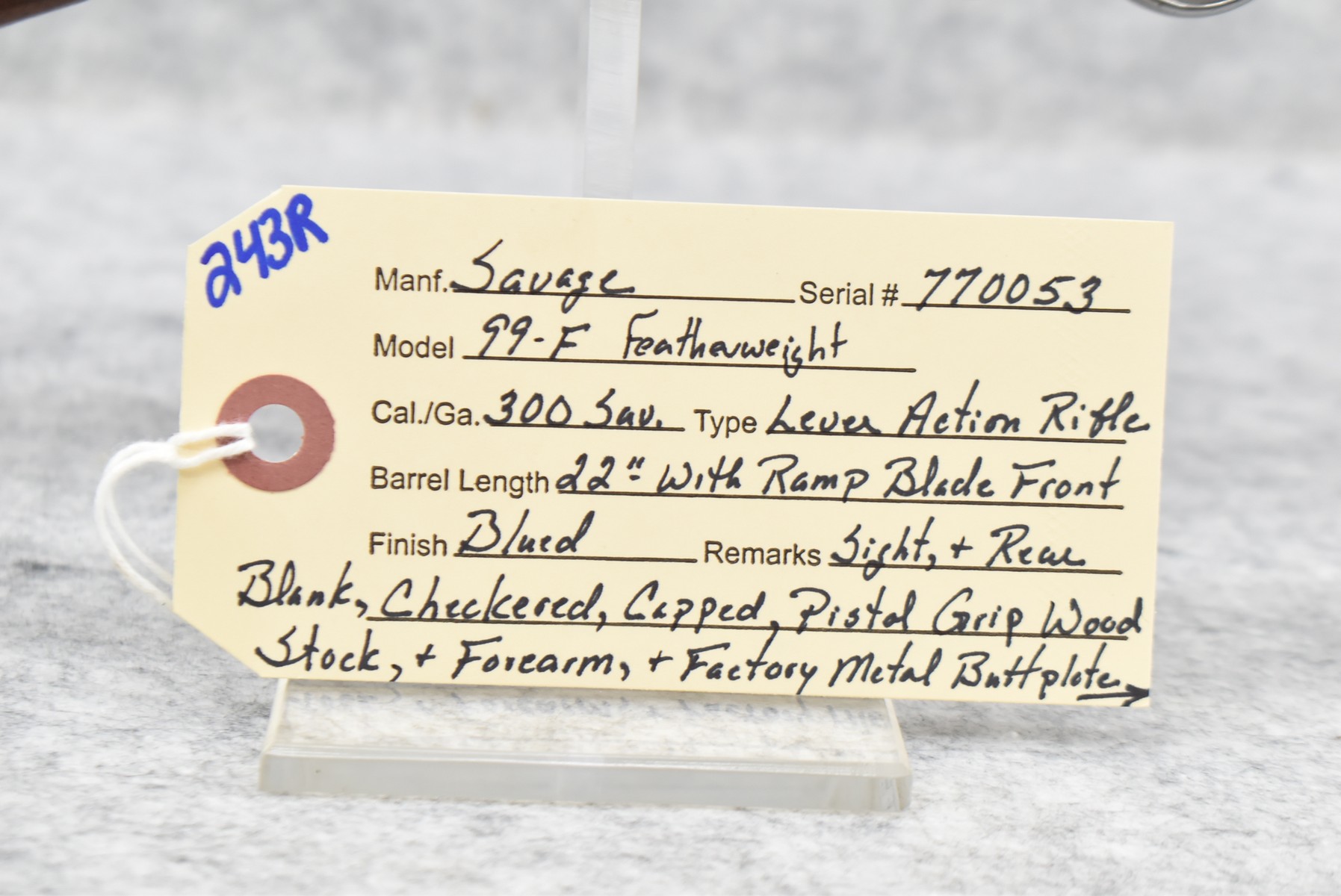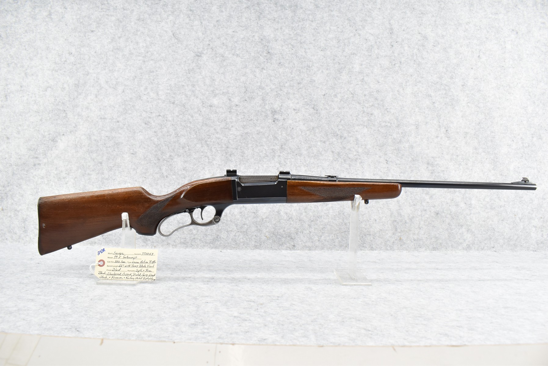 243R.     Savage – Mod. 99-F Featherweight – 300 Sav. Cal. Lever Action Rifle – w/22” Barrel w/Ramp Blade Front Sight & Rear Dovetail Blank – Blued Finish – w/Checkered Capped Pistol Grip Wood Stocks w/Factory Metal Butt Plate – w/2pc. Mounting Bases